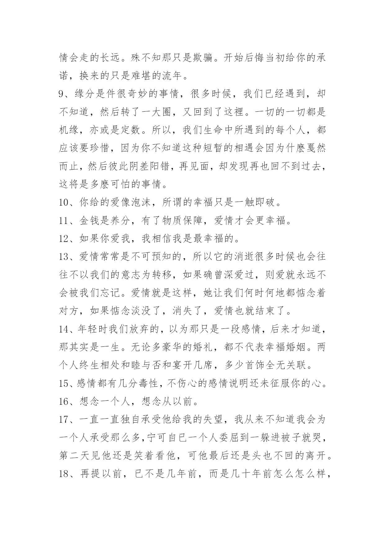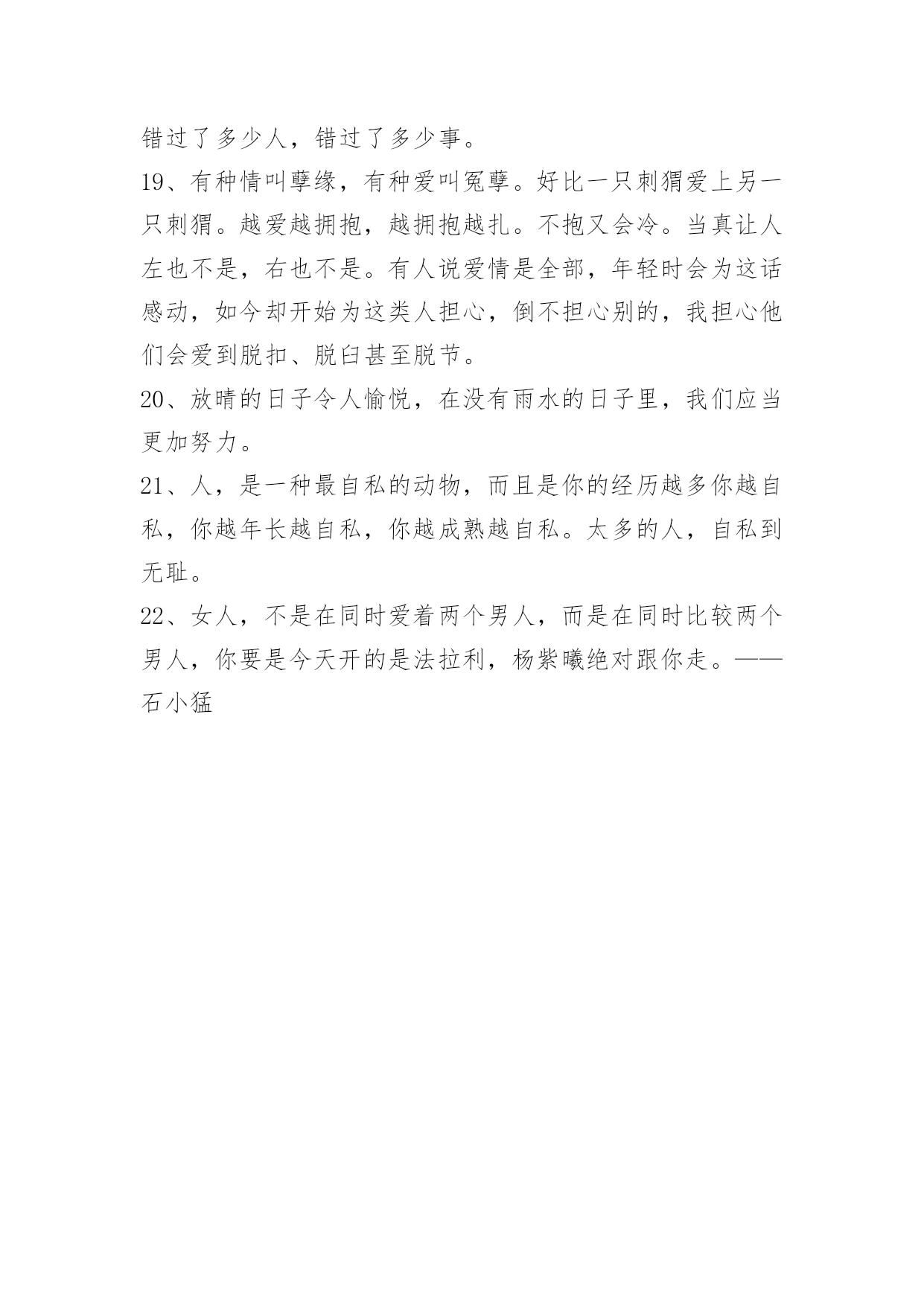 感人爱情语录22条【实用】感人爱情语录22条那是一种孤独的眼神,因为找不到这世界温暖的出口而孤单。以下是小编为大家收集的感人爱情语录22条,欢迎大家前来欣赏。1、很久很久以后、你是否一如既往的温柔。2、愿得一人心,白首不相离。希望结识善良,有爱心,不花心的男仕。3、没有爱情人不还是一样活。4、有一种默契叫做心照不宣;有一种感觉叫做妙不可言;有一种福祉叫做有你相伴;有一种思念叫做望眼欲穿。5、你从来不知道你眼神里有一种力量,让我看见你就想抱紧你。6、爱情原是锦上添花的事,男女互相为对方倾倒,糊里糊涂那么一刻两刻时分,便视为爱情,等到看清楚之后,不外是那么一回事,双方可以容忍的,便相处下来,不能够的,便立刻分开。7、几年后,和我结婚的人希望是你,渴望是你,必须是你,也只能是你。8、分隔两地,却从没后悔和你在一起,我不期待情侣间的.激情,只期盼浅浅的关怀,当初选择和你在一起,就已下定决心爱你一生,给你最好听的诺言,只是希望你坚信我们爱情会走的长远。殊不知那只是欺骗。开始后悔当初给你的承诺,换来的只是难堪的流年。9、缘分是件很奇妙的事情,很多时候,我们已经遇到,却不知道,然后转了一大圈,又回到了这裡。一切的一切都是机缘,亦或是定数。所以,我们生命中所遇到的每个人,都应该要珍惜,因为你不知道这种短暂的相遇会因为什麽戛然而止,然后彼此阴差阳错,再见面,却发现再也回不到过去,这将是多麽可怕的事情。10、你给的爱像泡沫,所谓的幸福只是一触即破。11、金钱是养分,有了物质保障,爱情才会更幸福。12、如果你爱我,我相信我是最幸福的。13、爱情常常是不可预知的,所以它的消逝很多时候也会往往不以我们的意志为转移,如果确曾深爱过,则爱就永远不会被我们忘记。爱情就是这样,她让我们何时何地都惦念着对方,如果惦念淡没了,消失了,爱情也就结束了。14、年轻时我们放弃的,以为那只是一段感情,后来才知道,那其实是一生。无论多豪华的婚礼,都不代表幸福婚姻。两个人终生相处和睦与否和宴开几席,多少首饰全无关联。15、感情都有几分毒性,不伤心的感情说明还未征服你的心。16、想念一个人,想念从以前。17、一直一直独自承受他给我的失望,我从来不知道我会为一个人承受那么多,宁可自已一个人委屈到一躲进被子就哭,第二天见他还是笑着看他,可他最后还是头也不回的离开。18、再提以前,已不是几年前,而是几十年前怎么怎么样,错过了多少人,错过了多少事。19、有种情叫孽缘,有种爱叫冤孽。好比一只刺猬爱上另一只刺猬。越爱越拥抱,越拥抱越扎。不抱又会冷。当真让人左也不是,右也不是。有人说爱情是全部,年轻时会为这话感动,如今却开始为这类人担心,倒不担心别的,我担心他们会爱到脱扣、脱臼甚至脱节。20、放晴的日子令人愉悦,在没有雨水的日子里,我们应当更加努力。21、人,是一种最自私的动物,而且是你的经历越多你越自私,你越年长越自私,你越成熟越自私。太多的人,自私到无耻。22、女人,不是在同时爱着两个男人,而是在同时比较两个男人,你要是今天开的是法拉利,杨紫曦绝对跟你走。——石小猛
