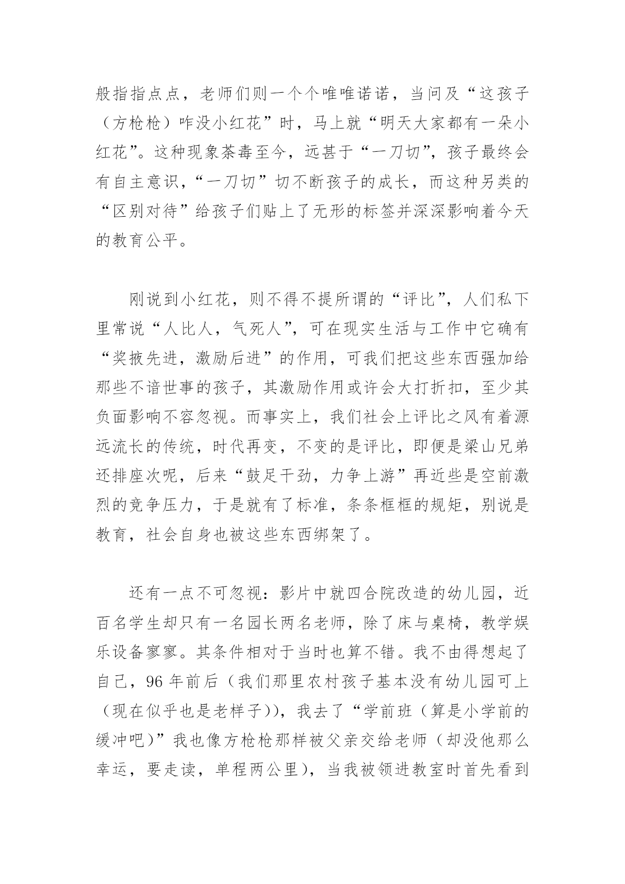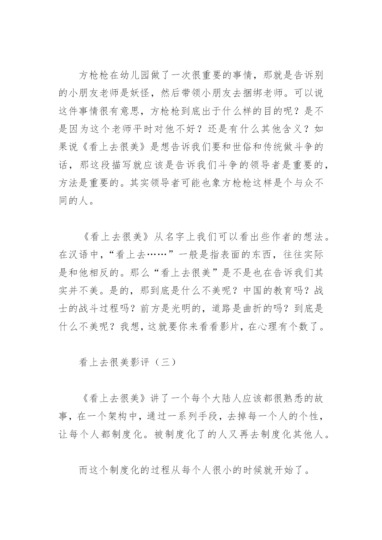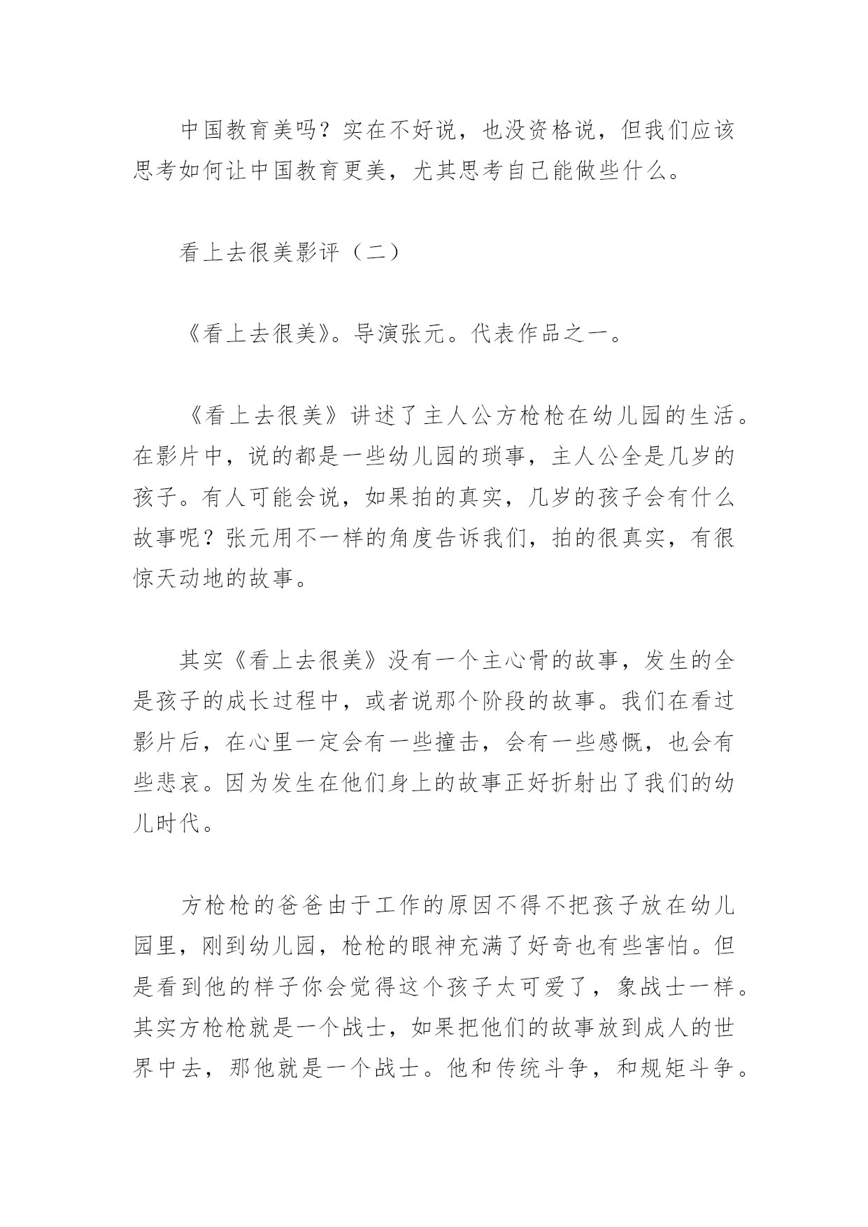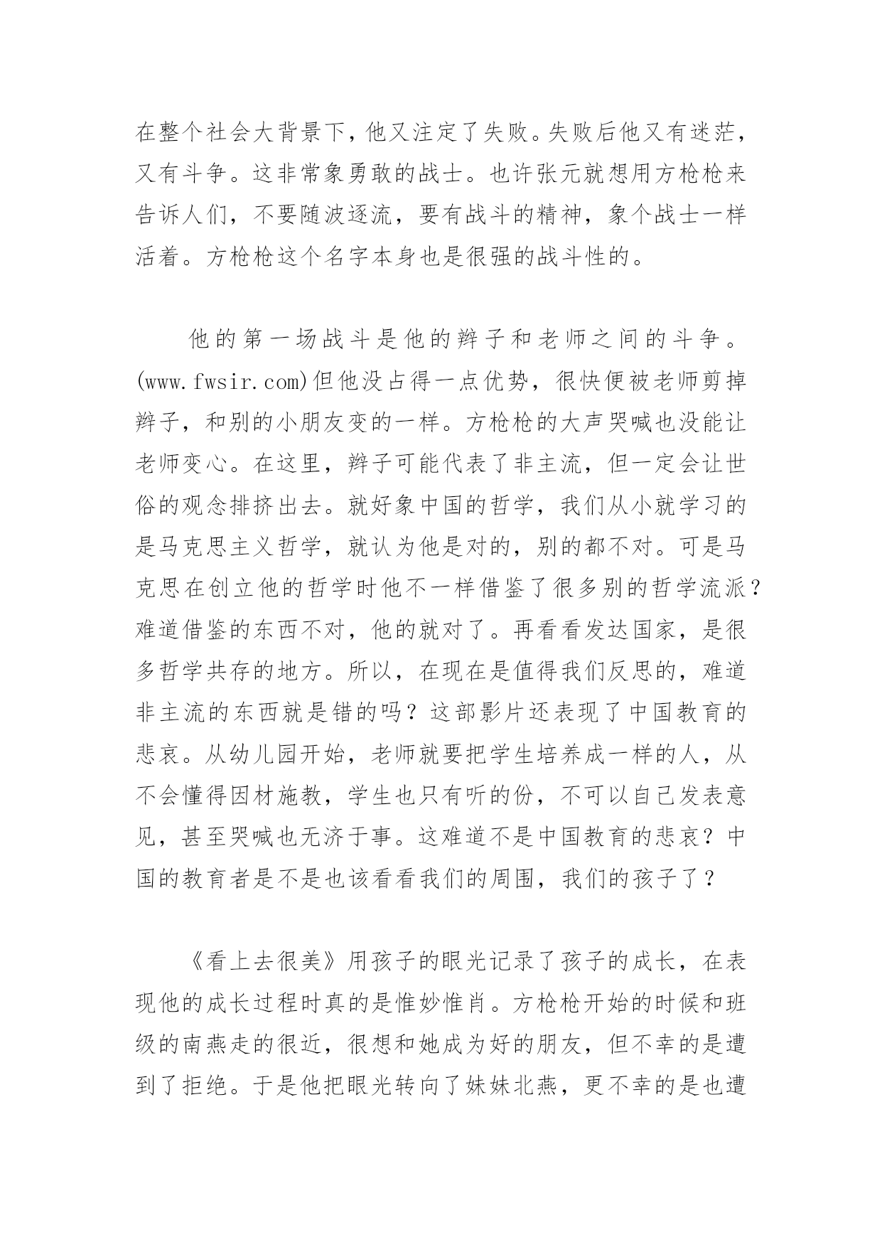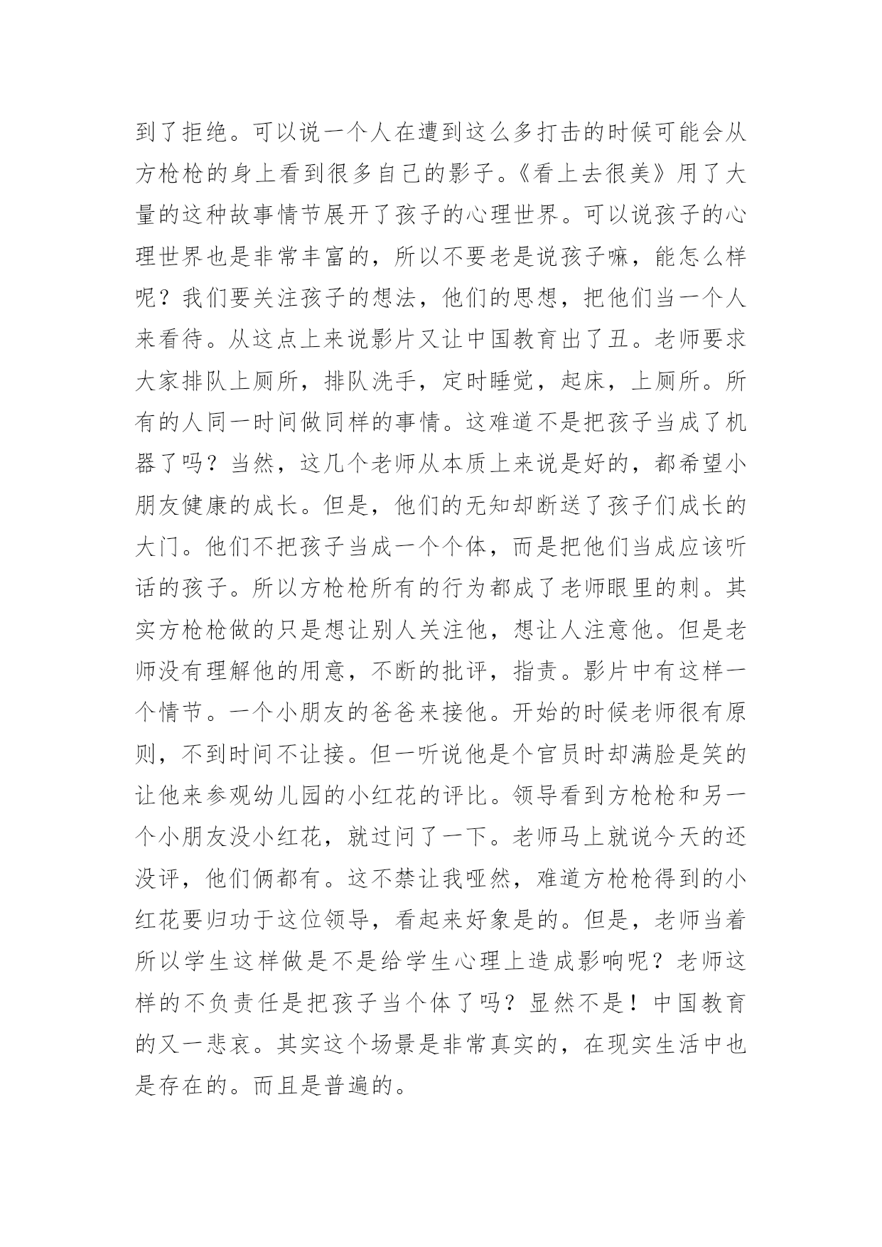 看上去很美影评看上去很美影评看上去很美影评(一)《看上去很美》:一个叫方枪枪的男孩被父亲送进幼儿园,从天真活变得狡黠孤僻,最终,“逃”出幼儿园,在锣鼓喧天里呆呆地望着戴着大红花兴高采烈的从身边走过的人群。幼儿园对他或许已成为回忆,而对于他的教育生涯这仅仅是个开端……中国教育美吗?电影之后看到这个问题时,人们的第一反应就是:中国教育“一刀切”不讲个性、扼杀儿童天性…….但我更愿意先从社会视角去看中国教育。首先就说个性,影片的背景应该是改革初期,此前社会过于突出集体,强调一致已是不争的事实,讲求个性恰恰是当时社会所难以接受的,放在这个大框架下,“一刀切”与“个性”不是首要问题。就当时乃至今天在大多数学校,教师管理着庞大的班级,面对的是大多数学生,不准一刀切,必须因材施教,那么教师的工作与负担何时是个尽头。如果真一刀切也就算了,可美其名“一碗水端平”促进教育公平。可影片中一位很有派头的家长到校看望孩子时,像领导视察般指指点点,老师们则一个个唯唯诺诺,当问及“这孩子(方枪枪)咋没小红花”时,马上就“明天大家都有一朵小红花”。这种现象荼毒至今,远甚于“一刀切”,孩子最终会有自主意识,“一刀切”切不断孩子的成长,而这种另类的“区别对待”给孩子们贴上了无形的标签并深深影响着今天的教育公平。刚说到小红花,则不得不提所谓的“评比”,人们私下里常说“人比人,气死人”,可在现实生活与工作中它确有“奖掖先进,激励后进”的作用,可我们把这些东西强加给那些不谙世事的孩子,其激励作用或许会大打折扣,至少其负面影响不容忽视。而事实上,我们社会上评比之风有着源远流长的传统,时代再变,不变的是评比,即便是梁山兄弟还排座次呢,后来“鼓足干劲,力争上游”再近些是空前激烈的竞争压力,于是就有了标准,条条框框的规矩,别说是教育,社会自身也被这些东西绑架了。还有一点不可忽视:影片中就四合院改造的幼儿园,近百名学生却只有一名园长两名老师,除了床与桌椅,教学娱乐设备寥寥。其条件相对于当时也算不错。我不由得想起了自己,96年前后(我们那里农村孩子基本没有幼儿园可上(现在似乎也是老样子)),我去了“学前班(算是小学前的缓冲吧)”我也像方枪枪那样被父亲交给老师(却没他那么幸运,要走读,单程两公里),当我被领进教室时首先看到的是一根才支起的木柱(后来才知道是防止下雨房屋倒塌),一群小朋友正高兴地跺着脚和老师一起把地上新铺的泥土踩实…….总有人不厌其烦地强调“少年儿童是祖国的花朵”,党和国家高度重视教育,可当我们经济上创造举世瞩目的奇迹时,教育支出占GDP比重百分之四的许诺却始终是一张空头支票。老百姓自己说“再穷不能穷教育”,当他们勒紧裤腰带把孩子送进学校是时,孩子们受的教育,是不是让那些“高度重视”的听起来很美的人心里很美?你百般无奈,可大势如此。我们可以用新的教育理念指点教育批评社会,可社会确实现实的。如果我们脱离社会环境妄论教育,是不是有点站着说话不腰疼?所以,从社会视角,不好说也说不出中国教育美不美。当然,我们不能苛责社会,社会毕竟是人的社会,人的要素不可忽视。先说说我们的教师。人们一再批评中国教育手把手、一刀切、规矩、灌输…….但谁也不能否认中国教育更利于大多数人快速高效地掌握一些基本知识与技能,能过为学生打下较好的基础。正如:九尺之台起于累土,千里之行始于足下,没有那一筐土,没有学会走,就如巧妇难为无米之炊,又谈何筑九尺台,行万里路?就像影片里老师教孩子们洗手穿衣服教他们基本礼貌给人道歉,我们是不是也要他们去搞什么诱导和因材施教呢?问题在于我们对前者太过拘泥了:吃多少饭、穿什么衣服、什么时候上厕所之类的事情都要统一,似乎有些吹毛求疵。而后者所关心的如何因材施教诱导培养学生创新思维实践能力,不同阶段侧重有所不同,至少需要学生先有一定的自主意识才有意义,早期教育是磨刀阶段,应侧重基础,过于强调诱导启发,学生获得的知识是相当有限的,而用更多的时间打基础则磨刀不误砍柴工。因而不管人们怎么批评,中国孩子的早期教育总体上是相对可取的。在特定的教育体制下,改变教育模式及的可能性不大,作为教师个人因素的教育手段与教育态度确实可以改变的。老师们有他的一套奖惩措施:小红花,但我们应该注意的是孩子们每犯一个“错误”就会被扣掉一朵小红花,就是说做好该做的就会获得所有小红花,到后来做作业、考试总习惯打叉,没有错就是满分就是优秀,成了我们的一种思维方式。我们所谓的激励不是正面的即不是“扬善”而是反面的“惩恶”,似乎很符合中国人“不求有功,但求无过”的心理。好比某些地方政府不谋民生与发展而不惜花大力气“维稳”,“别给我添乱子就好”,其“产品”放到社会上就多“良民”而少“良材”,就好像我们的教育培育不出希特勒也产生不了爱因斯坦。老师又想出了很多办法“逼”其就范:拿着大剪刀、扮妖怪“吓唬”,“威胁”扣小