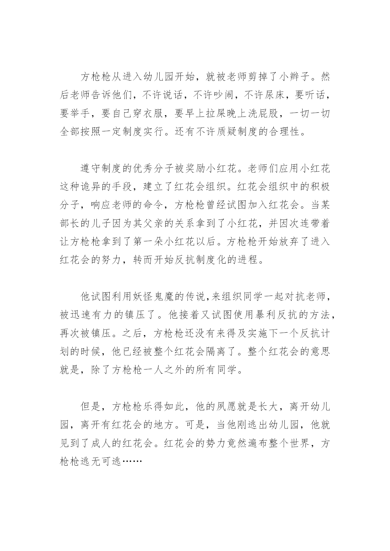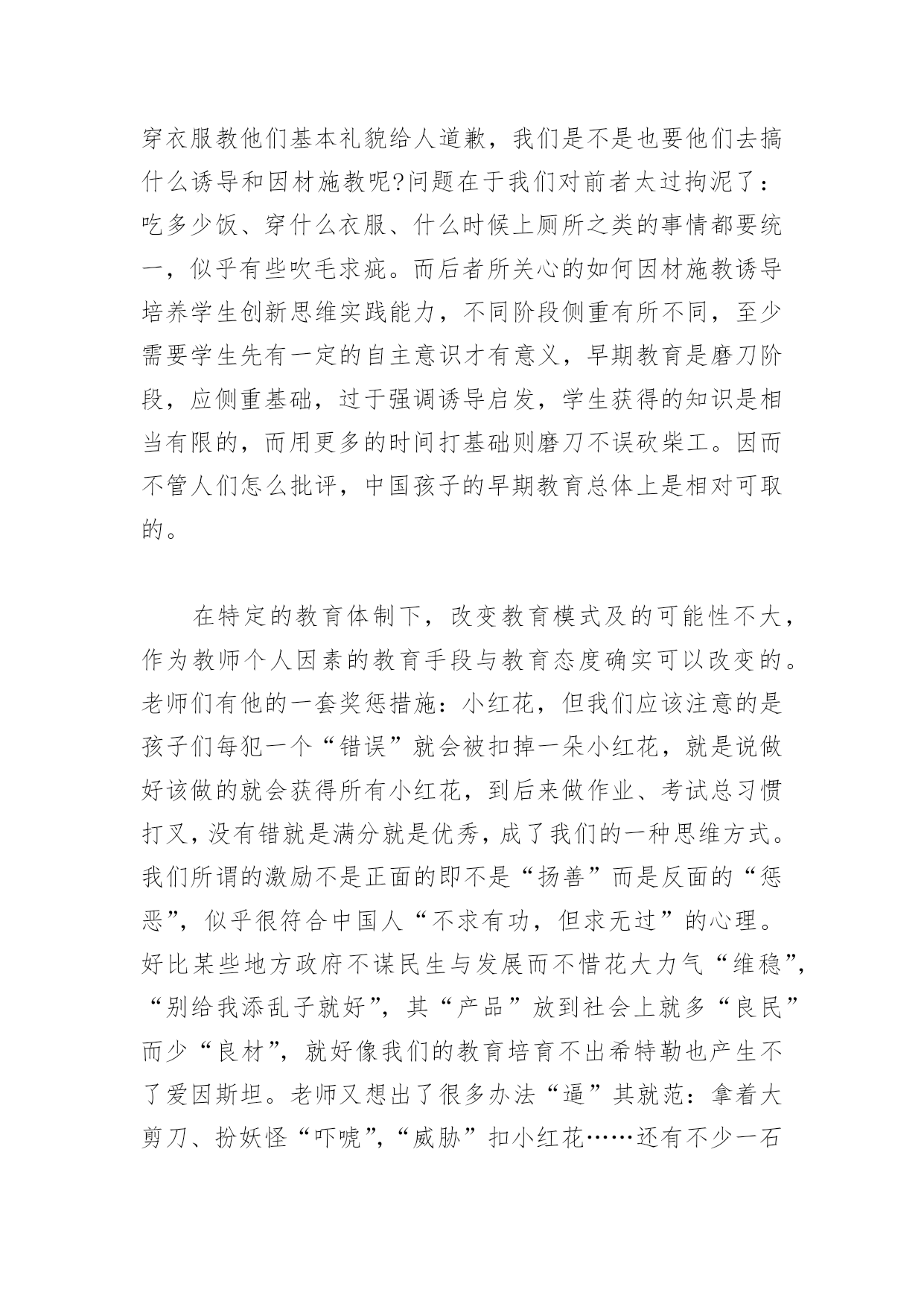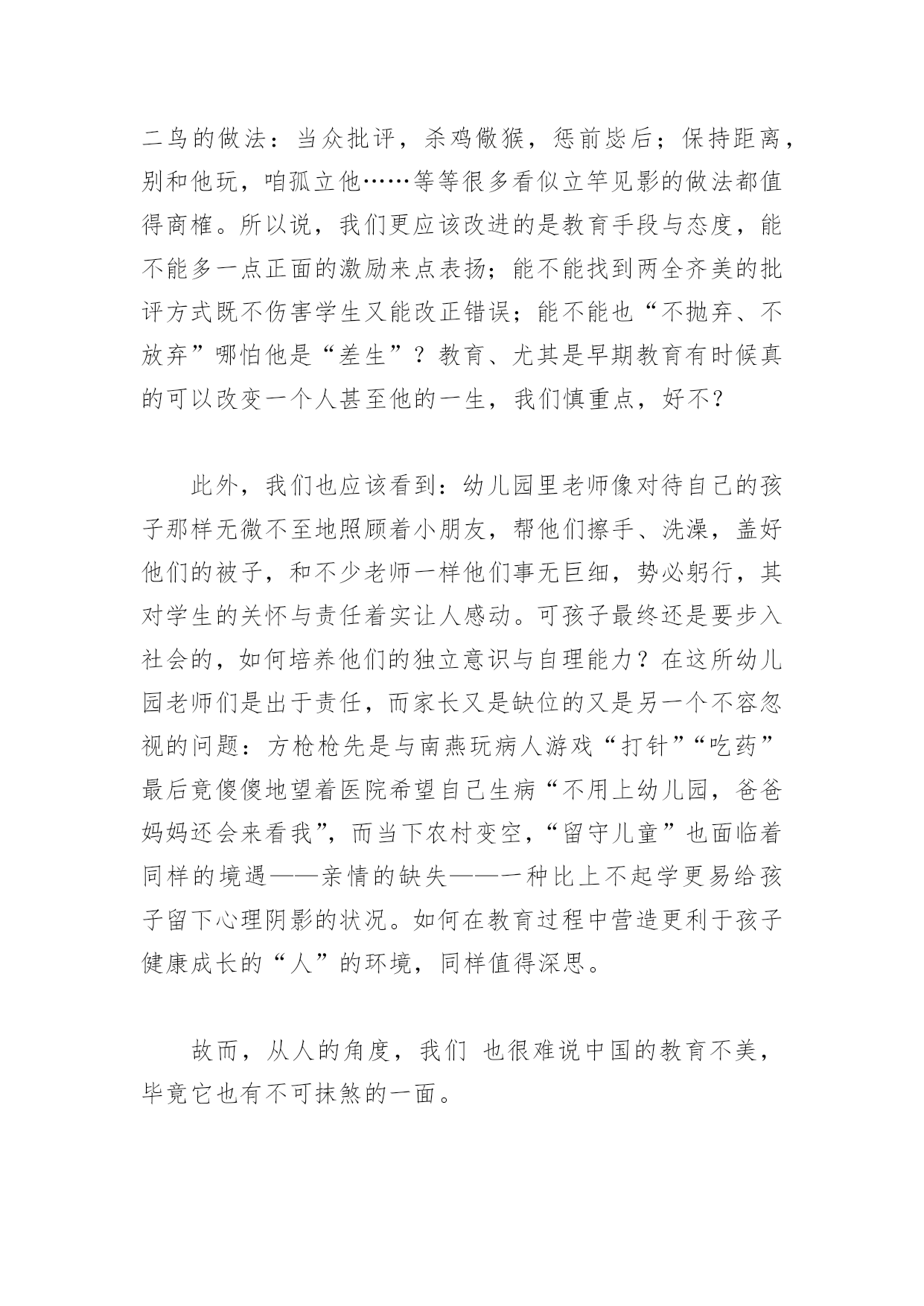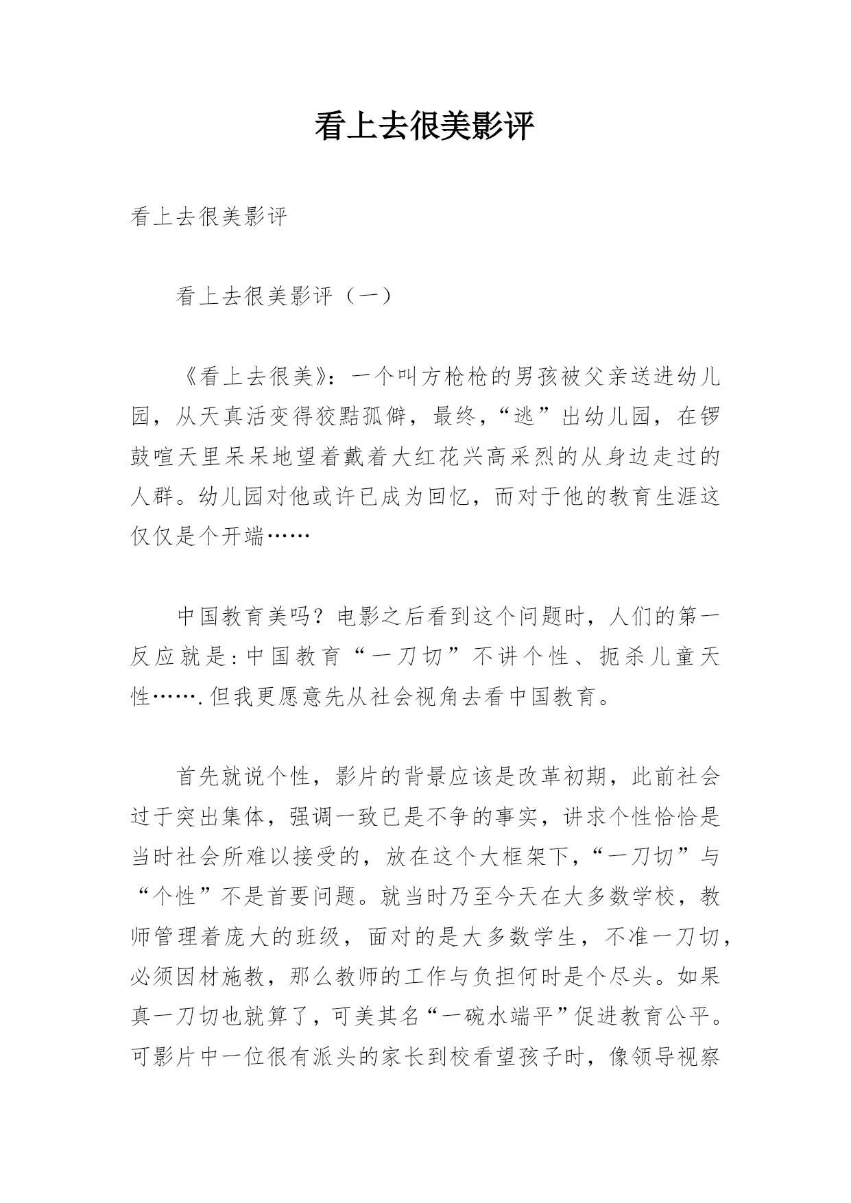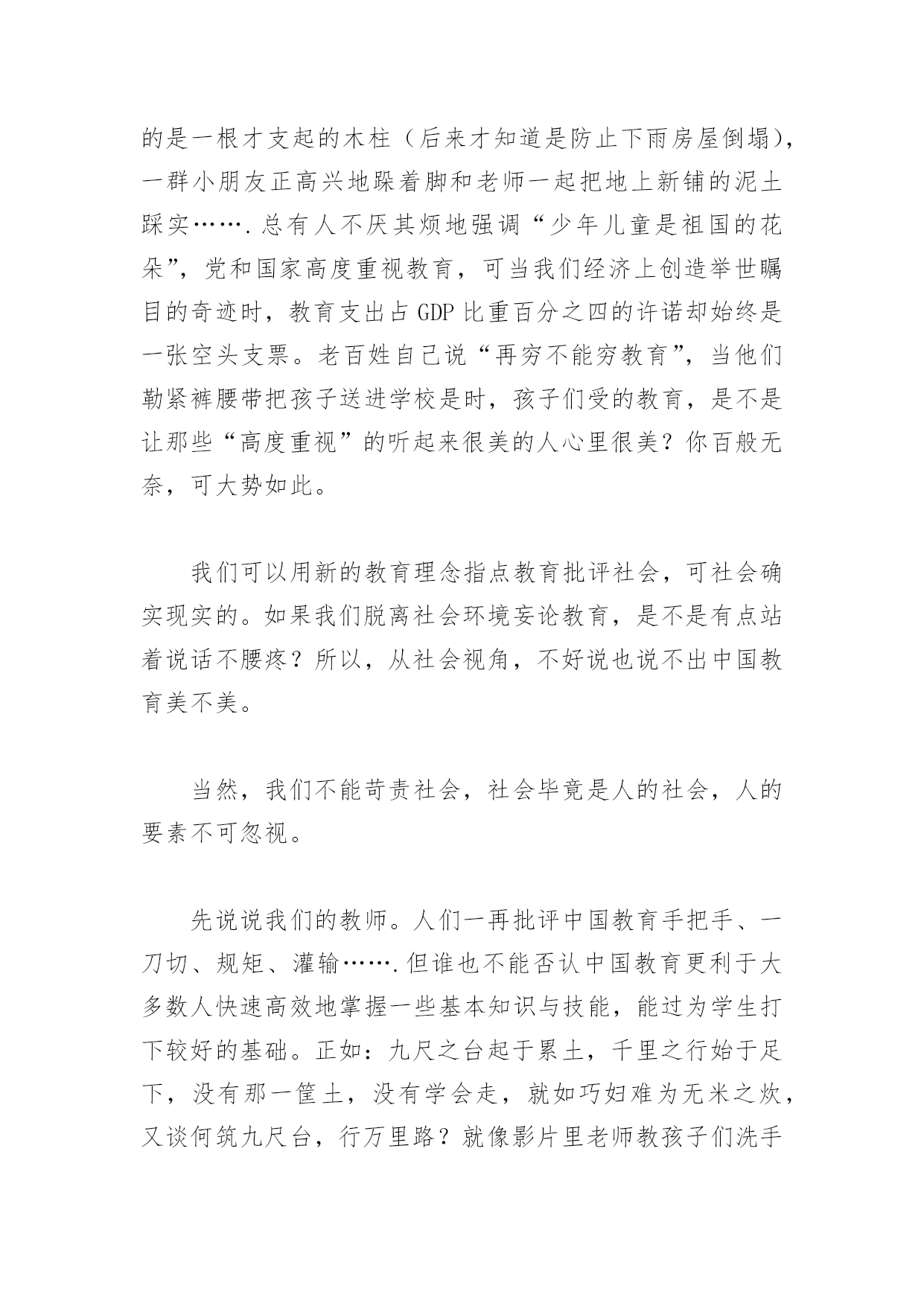 看上去很美影评看上去很美影评看上去很美影评(一)《看上去很美》:一个叫方枪枪的男孩被父亲送进幼儿园,从天真活变得狡黠孤僻,最终,“逃”出幼儿园,在锣鼓喧天里呆呆地望着戴着大红花兴高采烈的从身边走过的人群。幼儿园对他或许已成为回忆,而对于他的教育生涯这仅仅是个开端……中国教育美吗?电影之后看到这个问题时,人们的第一反应就是:中国教育“一刀切”不讲个性、扼杀儿童天性…….但我更愿意先从社会视角去看中国教育。首先就说个性,影片的背景应该是改革初期,此前社会过于突出集体,强调一致已是不争的事实,讲求个性恰恰是当时社会所难以接受的,放在这个大框架下,“一刀切”与“个性”不是首要问题。就当时乃至今天在大多数学校,教师管理着庞大的班级,面对的是大多数学生,不准一刀切,必须因材施教,那么教师的工作与负担何时是个尽头。如果真一刀切也就算了,可美其名“一碗水端平”促进教育公平。可影片中一位很有派头的家长到校看望孩子时,像领导视察般指指点点,老师们则一个个唯唯诺诺,当问及“这孩子(方枪枪)咋没小红花”时,马上就“明天大家都有一朵小红花”。这种现象荼毒至今,远甚于“一刀切”,孩子最终会有自主意识,“一刀切”切不断孩子的成长,而这种另类的“区别对待”给孩子们贴上了无形的标签并深深影响着今天的教育公平。刚说到小红花,则不得不提所谓的“评比”,人们私下里常说“人比人,气死人”,可在现实生活与工作中它确有“奖掖先进,激励后进”的作用,可我们把这些东西强加给那些不谙世事的孩子,其激励作用或许会大打折扣,至少其负面影响不容忽视。而事实上,我们社会上评比之风有着源远流长的传统,时代再变,不变的是评比,即便是梁山兄弟还排座次呢,后来“鼓足干劲,力争上游”再近些是空前激烈的竞争压力,于是就有了标准,条条框框的规矩,别说是教育,社会自身也被这些东西绑架了。还有一点不可忽视:影片中就四合院改造的幼儿园,近百名学生却只有一名园长两名老师,除了床与桌椅,教学娱乐设备寥寥。其条件相对于当时也算不错。我不由得想起了自己,96年前后(我们那里农村孩子基本没有幼儿园可上(现在似乎也是老样子)),我去了“学前班(算是小学前的缓冲吧)”我也像方枪枪那样被父亲交给老师(却没他那么幸运,要走读,单程两公里),当我被领进教室时首先看到的是一根才支起的木柱(后来才知道是防止下雨房屋倒塌),一群小朋友正高兴地跺着脚和老师一起把地上新铺的泥土踩实…….总有人不厌其烦地强调“少年儿童是祖国的花朵”,党和国家高度重视教育,可当我们经济上创造举世瞩目的奇迹时,教育支出占GDP比重百分之四的许诺却始终是一张空头支票。老百姓自己说“再穷不能穷教育”,当他们勒紧裤腰带把孩子送进学校是时,孩子们受的教育,是不是让那些“高度重视”的听起来很美的人心里很美?你百般无奈,可大势如此。我们可以用新的教育理念指点教育批评社会,可社会确实现实的。如果我们脱离社会环境妄论教育,是不是有点站着说话不腰疼?所以,从社会视角,不好说也说不出中国教育美不美。当然,我们不能苛责社会,社会毕竟是人的社会,人的要素不可忽视。先说说我们的教师。人们一再批评中国教育手把手、一刀切、规矩、灌输…….但谁也不能否认中国教育更利于大多数人快速高效地掌握一些基本知识与技能,能过为学生打下较好的基础。正如:九尺之台起于累土,千里之行始于足下,没有那一筐土,没有学会走,就如巧妇难为无米之炊,又谈何筑九尺台,行万里路?就像影片里老师教孩子们洗手穿衣服教他们基本礼貌给人道歉,我们是不是也要他们去搞什么诱导和因材施教呢?问题在于我们对前者太过拘泥了:吃多少饭、穿什么衣服、什么时候上厕所之类的事情都要统一,似乎有些吹毛求疵。而后者所关心的如何因材施教诱导培养学生创新思维实践能力,不同阶段侧重有所不同,至少需要学生先有一定的自主意识才有意义,早期教育是磨刀阶段,应侧重基础,过于强调诱导启发,学生获得的知识是相当有限的,而用更多的时间打基础则磨刀不误砍柴工。因而不管人们怎么批评,中国孩子的早期教育总体上是相对可取的。在特定的教育体制下,改变教育模式及的可能性不大,作为教师个人因素的教育手段与教育态度确实可以改变的。老师们有他的一套奖惩措施:小红花,但我们应该注意的是孩子们每犯一个“错误”就会被扣掉一朵小红花,就是说做好该做的就会获得所有小红花,到后来做作业、考试总习惯打叉,没有错就是满分就是优秀,成了我们的一种思维方式。我们所谓的激励不是正面的即不是“扬善”而是反面的“惩恶”,似乎很符合中国人“不求有功,但求无过”的心理。好比某些地方政府不谋民生与发展而不惜花大力气“维稳”,“别给我添乱子就好”,其“产品”放到社会上就多“良民”而少“良材”,就好像我们的教育培育不出希特勒也产生不了爱因斯坦。老师又想出了很多办法“逼”其就范:拿着大剪刀、扮妖怪“吓唬”,“威胁”扣小