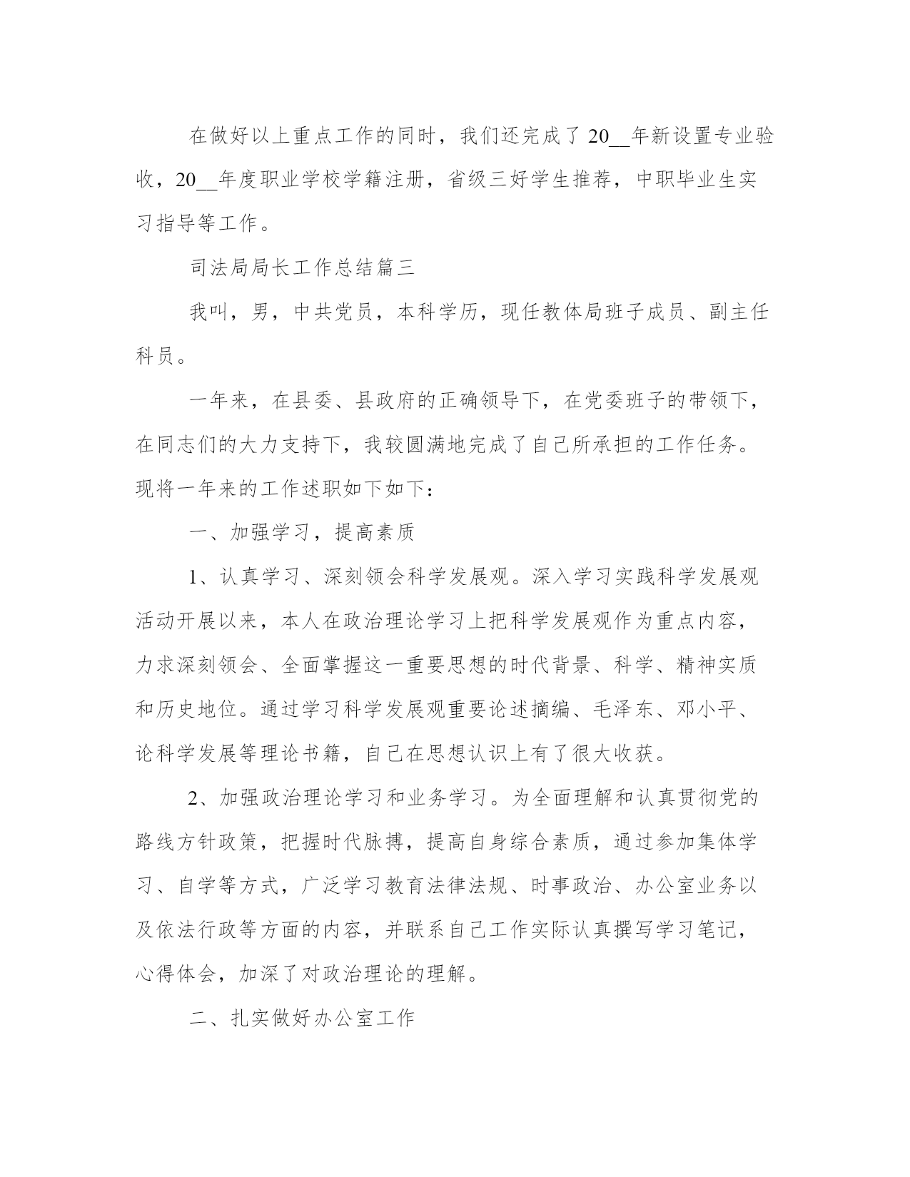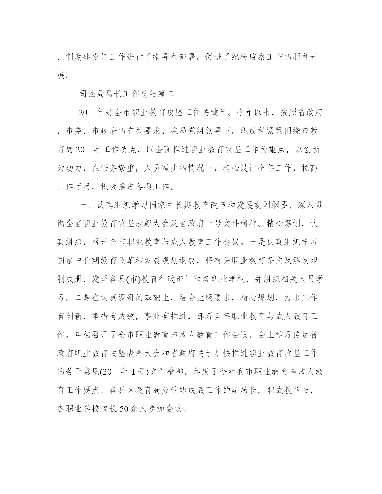 司法局局长工作总结(12篇)总结是把一定阶段内的有关情况分析分析,做出有指导性的经验方法以及结论的书面材料,它可以使我们更有效率,不妨坐下来好好写写总结吧。优秀的总结都具备一些什么特点呢?又该怎么写呢?以下是小编为大家收集的总结范文,仅供参考,大家一起来看看吧。司法局局长工作总结篇一(一)坚持把党风廉政建设与日常工作捆在一起抓,认真落实党风廉政建设责任制。首先,我始终坚持“党委统一领导、党政齐抓共管、纪委组织协调、部门各负其责、依靠群众支持和参与”的原则,把党风廉政建设列入整体工作范围,与业务工作紧密结合,一起部署、一起落实、一起检查、一起考核,认真抓好局系统责任制工作的落实。与下属单位党政一把手签订20__度党风廉政建设责任目标,并做到年中有检查,年末有考核。全年召开了六次专题会议,听取工作汇报,总结经验,分析问题,分析和解决责任制工作中遇到的有关全局的重大问题,推动了工作顺利开展。其次,坚持以强化领导为重点,以落实责任追究制度为关键,要求班子成员和局属单位的领导特别是一把手要严于律己,廉洁从政,要求每个单位都要制定和明确领导班子及成员党风廉政建设岗位职责,并抓好落实。年初,依据20__年度考核结果,对局属各单位党风廉政责任制工作实施了奖优罚劣,对客运管理处、雨污水管网建设项目部等单位及相关人员进行了责任追究,与责任人进行了诫勉谈话,责令其写出书面检查,进一步增强了各单位抓好党风廉政建设的责任感和紧迫感。(二)健全教育监督和管理机制,认真履行监督职责。按照市委、市政府关于加强全市廉政文化建设的实施意见和市纪委关于开展党风党纪集中教育活动的要求,指导制订了廉政文化进机关工作实施方案,组织开展了党风党纪教育月活动,利用正反两方面的典型,教育引导党员干部不越思想道德这条防护线、不碰规章制度这条警戒线、不触法律法规这条高压线,筑牢拒腐防变的思想防线。在履行岗位职责过程中,我经常通过廉政教育、督导检查和个别谈话等形式,增强党员领导干部的廉洁自律意识。在重要敏感时期,告诫下属要过好廉洁关,提醒他们要廉洁过年、清廉过节。在局属单位领导干部变动时,及时与新调整的领导干部进行任前廉政谈话,提出严格遵守领导干部廉洁自律规定的要求,打好“预防针”,勉励他们做勤政廉政的模范。发挥好“立刻办”服务热线和市政监管队伍的作用,组织人员不定期地进行明查暗访,主动发现和解决存在的问题。启动了干部离任审计工作,继续深入开展商业贿赂专项治理活动。加大了对局招标监督管理规定的落实力度,进一步规范了工程招标、物资设备采购工作。(三)狠抓作风建设,树立勤政为民的良好形象。市政公用事业与群众的生产生活密切相关,也关系到党和政府的形象,抓好行业作风建设、做好服务保障是我们义不容辞的责任。我在深入调研的基础上,对工作中的薄弱环节进行了认真思考,在加强干部职工队伍作风建设方面提出了一些新的措施和办法,为提升整体工作水平奠定了基础。突出实践特色,切实把学习实践科学发展观活动落实到市政公用行业的各项工作当中,开展了“文明执法年”和“对照职能,贴近民生、努力为群众办实事办好事”主题实践活动,让市民足不出户,就感受到市政公用行业的服务真情。结合行风评议中市民的意见和建议,开展了“两转两提”主题教育活动和解放思想大讨论活动,一批群众反映的热点难点问题得到了解决,干部职工的思想作风和工作作风明显转变。“立刻办”服务热线全年受理各类电话56.4万个,为市民解决了大量的实际问题,较好地发挥了政风行风建设的窗口作用。(四)加强队伍建设,大力支持纪检监察部门依法履行职责。我能够及时听取纪检监察部门有关工作和重大案情的汇报,提出指导性意见,领导、组织并支持纪检监察部门依法履行职责。理解、关心纪检监察干部,及时解决纪检监察工作中遇到的问题,鼓励他们“做党的忠诚卫士、当群众的贴心人”,为深入推进党风廉政建设和反腐败斗争提供组织保证。大力支持纪检监察干部采取在职自学、参加培训班、开展课题调研等形式,提高自身素质和工作水平。重点对开展了节日教育、治理商业贿赂、清理投资入股煤矿、调查处理信访举报、制度建设等工作进行了指导和部署,促进了纪检监察工作的顺利开展。司法局局长工作总结篇二20__年是全市职业教育攻坚工作关键年。今年以来,按照省政府,市委、市政府的有关要求,在局党组领导下,职成科紧紧围绕市教育局20__年工作要点,以全面推进职业教育攻坚工作为重点,以创新为动力,在任务繁重,人员减少的情况下,精心设计全年工作,拉高工作标尺,积极推进各项工作。一、认真组织学习国家中长期教育改革和发展规划纲要,深入贯彻全省职业教育攻坚表彰大会及省政府一号文件精神。精心筹划,认真组织,召开全市职业教育与成人教育工作会议。一是认真组织学习国家中长期教育改革和发展规划纲要,将有关职业教育条文及解读印制
