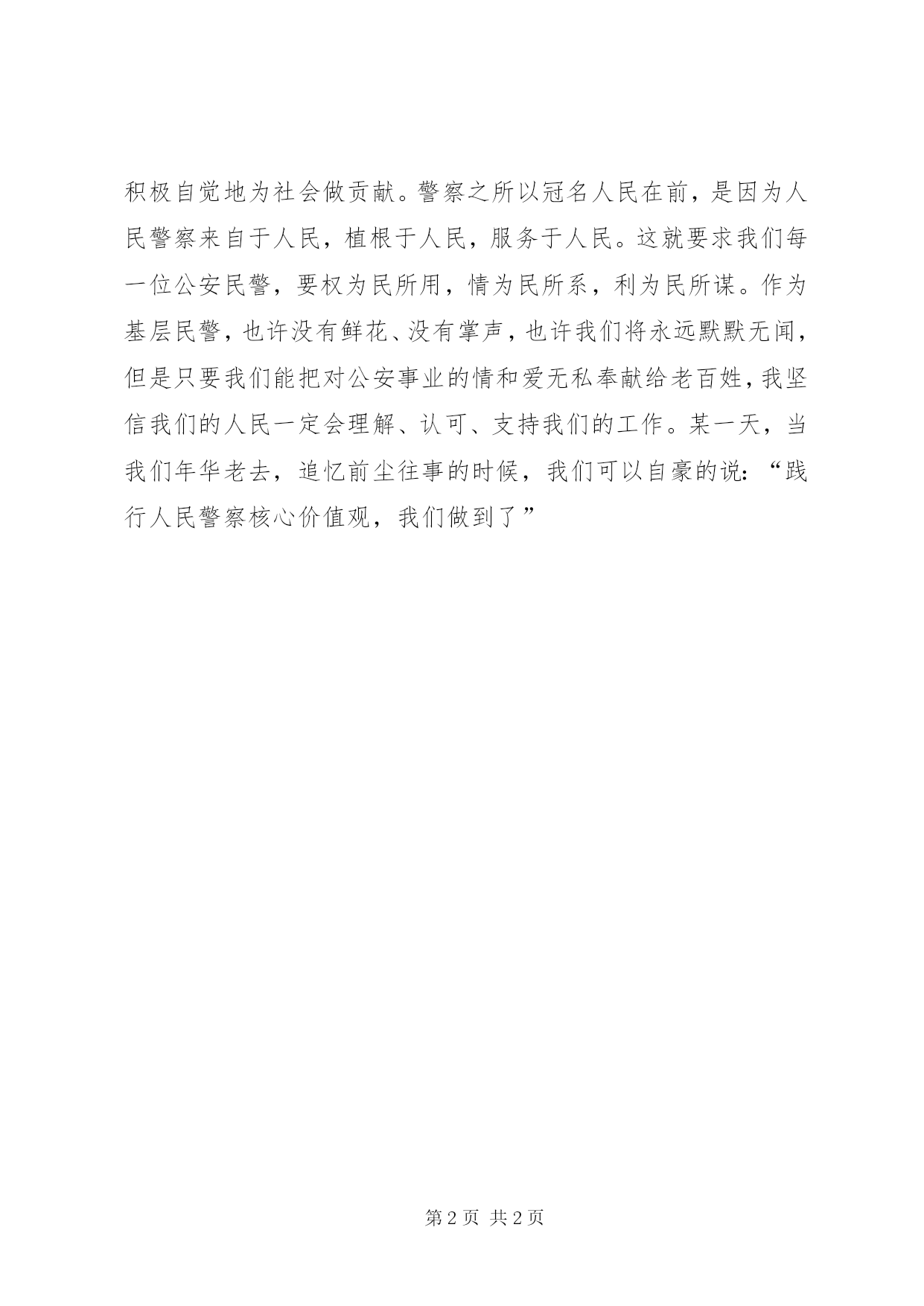 第PAGE\*Arabic\*MERGEFORMAT2页共NUMPAGES\*MERGEFORMAT2页政法干警核心价值观演讲稿年轻的我和许多怀揣梦想的人一样,从踏入警校的那一刻起,对人民警察这个神圣的职业充满着执着和向往。幸运的是毕业后我加入了这个光荣的集体,我穿上了威武庄严的警服。我的人生又开始了一段新的征程,作为一名参加工作不久的新民警,树立一个怎样的人生观,价值观对于我今后的工作和生活具有十分重要的意义。作为一名人民警察,必须要清醒地认识自身的这个角色定位。在现阶段全国开展深入学习实践科学发展观活动的潮流中,人民警察应该以积极的作为,深入践行人民警察核心价值观,争当人民的忠诚卫士,体现鲜明的时代特色和职业特点。“忠诚”,忠诚是我们的建警之本、立警之魂。“忠诚”的要义在于人民警察政治本色的体现。那就是忠诚于党、忠诚于祖国、忠诚于人民、忠诚于法律。“为民”,就是为人民服务,始终把人民放在心中最高位置,切实做到执法为民,这是政法干警的宗旨理念。为人民服务是我党的根本宗旨,更是“人民警察核心价值观”的核心体现,是我们所有工作的基本点,我们的职责就是为人民的生命财产安全保驾护航。“公正”,我们的队伍是一支执法队伍,肩负着依据国家法律打击和预防各种违法犯罪行为,保障公民权利,维护社会秩序的重任。我们在值勤、工作过程中,代表的是国家形象。执法公正尤为重要。“廉洁”,就是清正廉明、无私奉献,这是公安民警的基本操守。只有廉洁才能克己奉公、服务社会,积极自觉地为社会做贡献。警察之所以冠名人民在前,是因为人民警察来自于人民,植根于人民,服务于人民。这就要求我们每一位公安民警,要权为民所用,情为民所系,利为民所谋。作为基层民警,也许没有鲜花、没有掌声,也许我们将永远默默无闻,但是只要我们能把对公安事业的情和爱无私奉献给老百姓,我坚信我们的人民一定会理解、认可、支持我们的工作。某一天,当我们年华老去,追忆前尘往事的时候,我们可以自豪的说:“践行人民警察核心价值观,我们做到了”