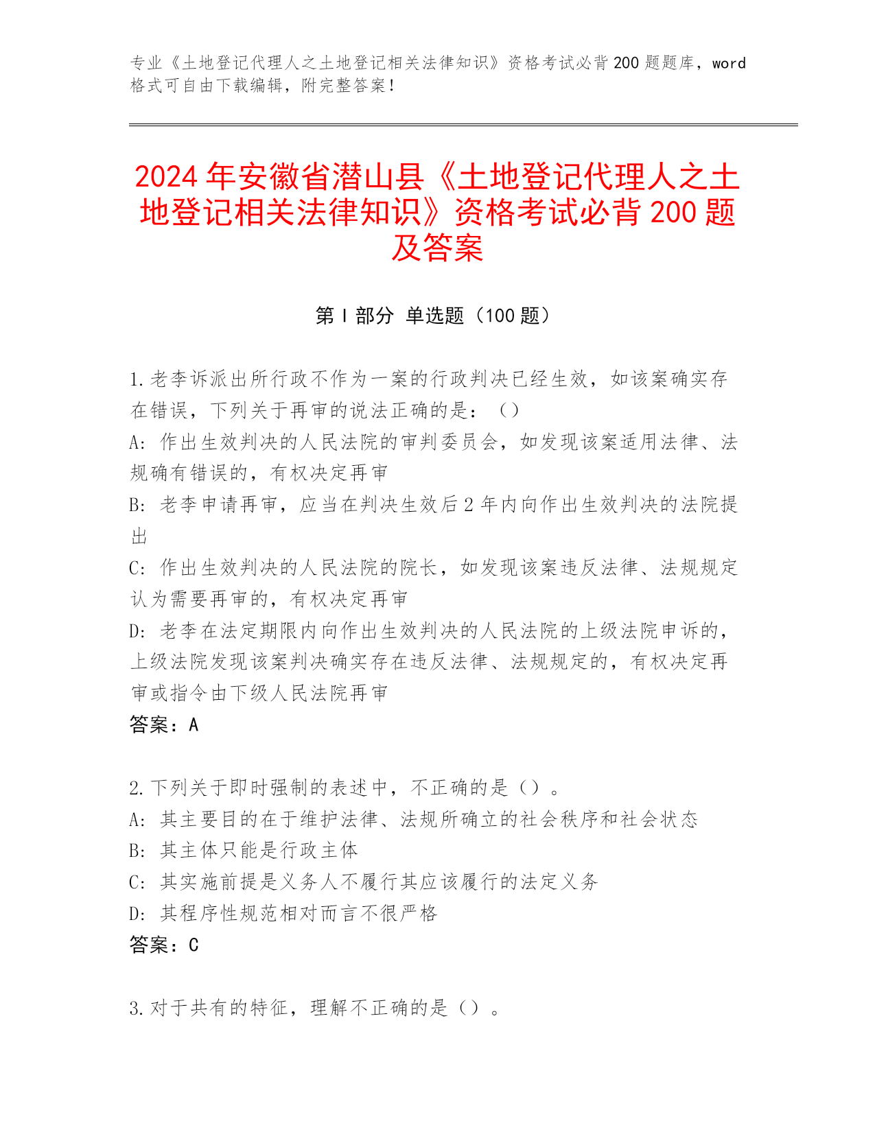 2024年安徽省潜山县《土地登记代理人之土地登记相关法律知识》资格考试必背200题及答案