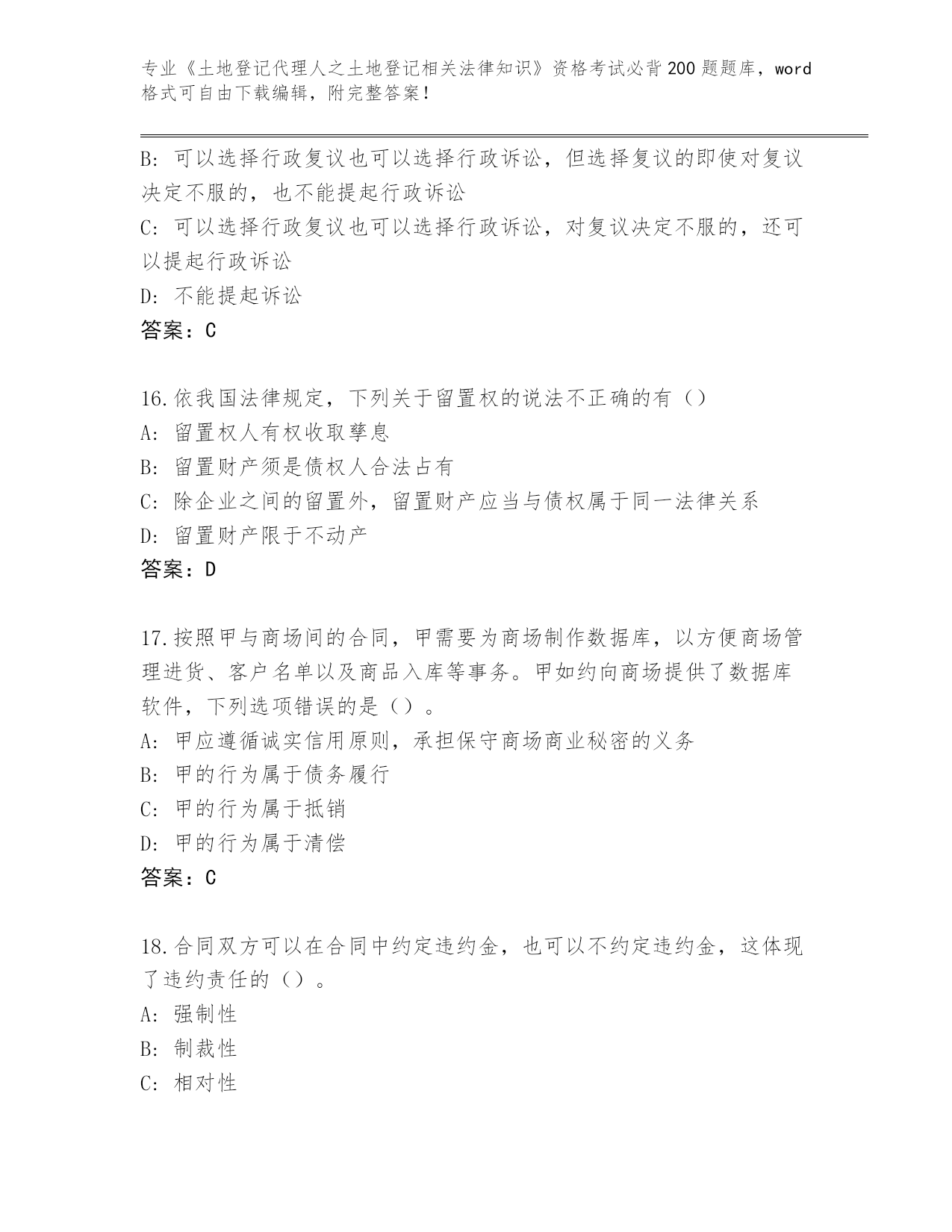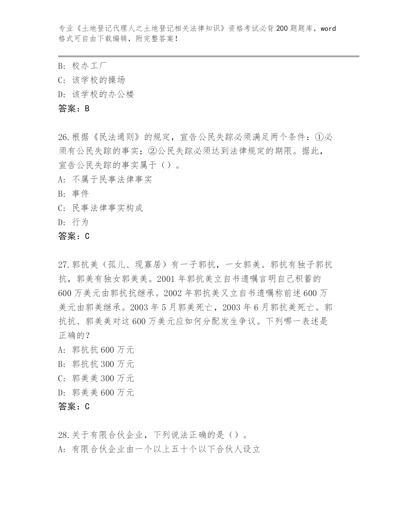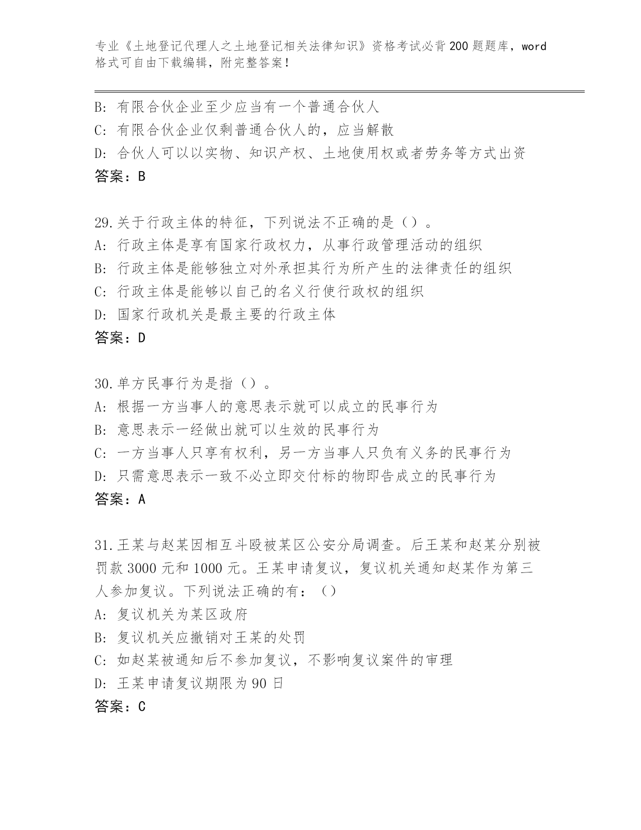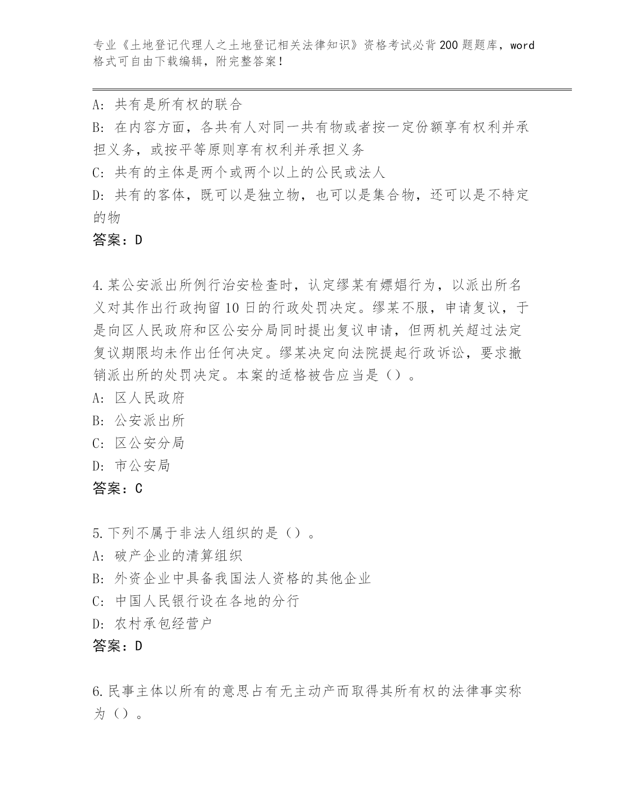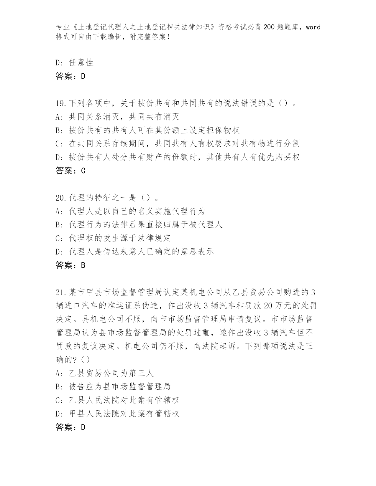 陕西省商州区2024年《土地登记代理人之土地登记相关法律知识》考试必背200题题库及答案(真题汇编)