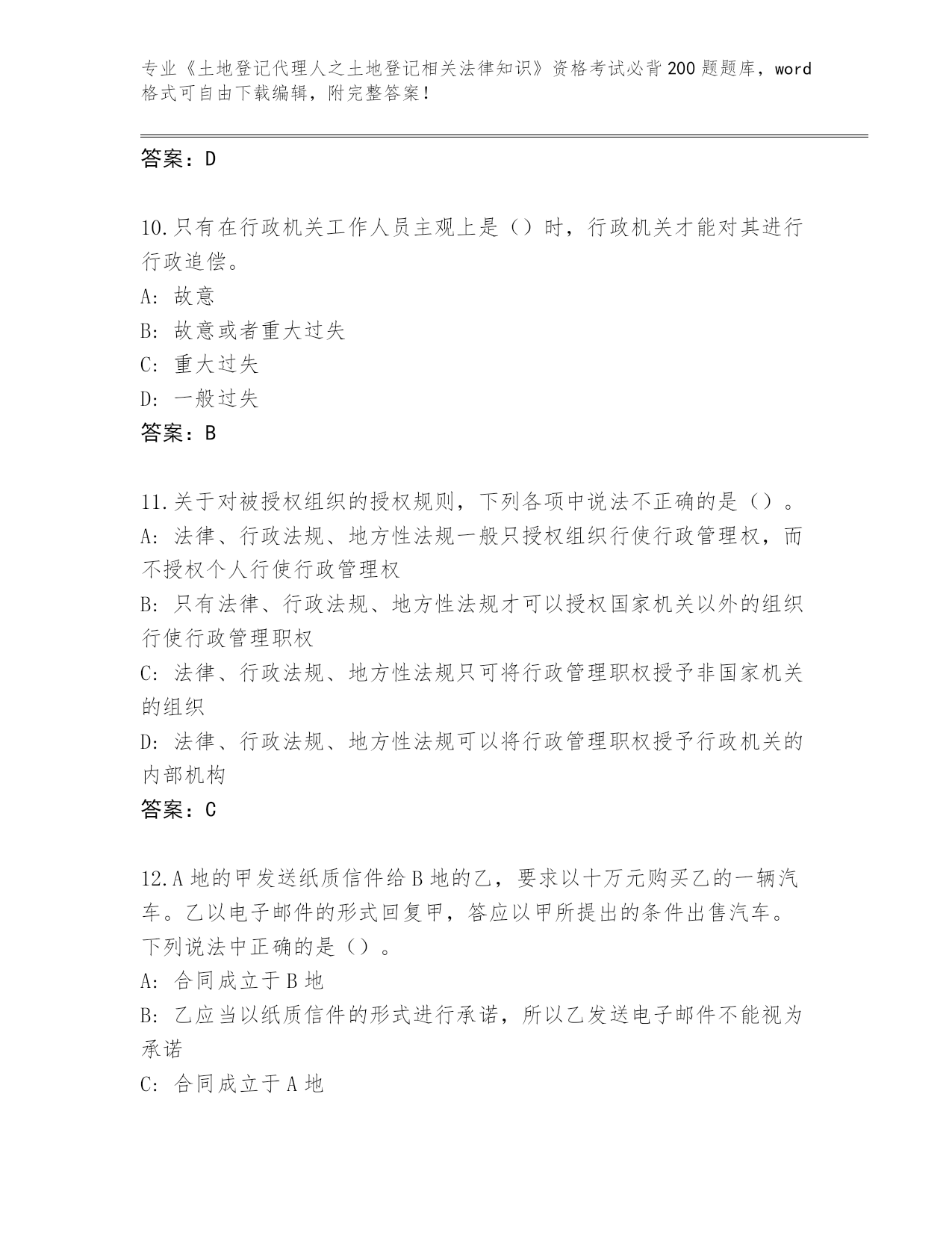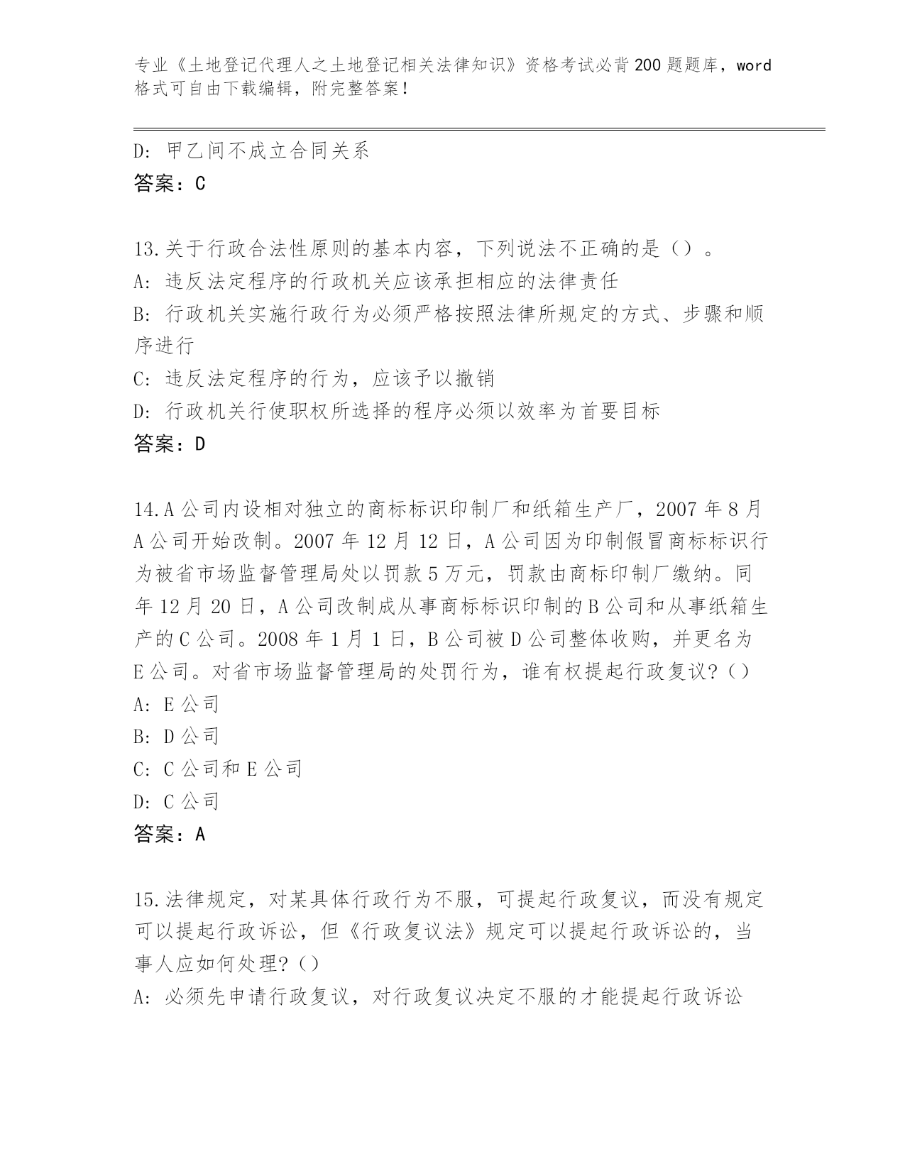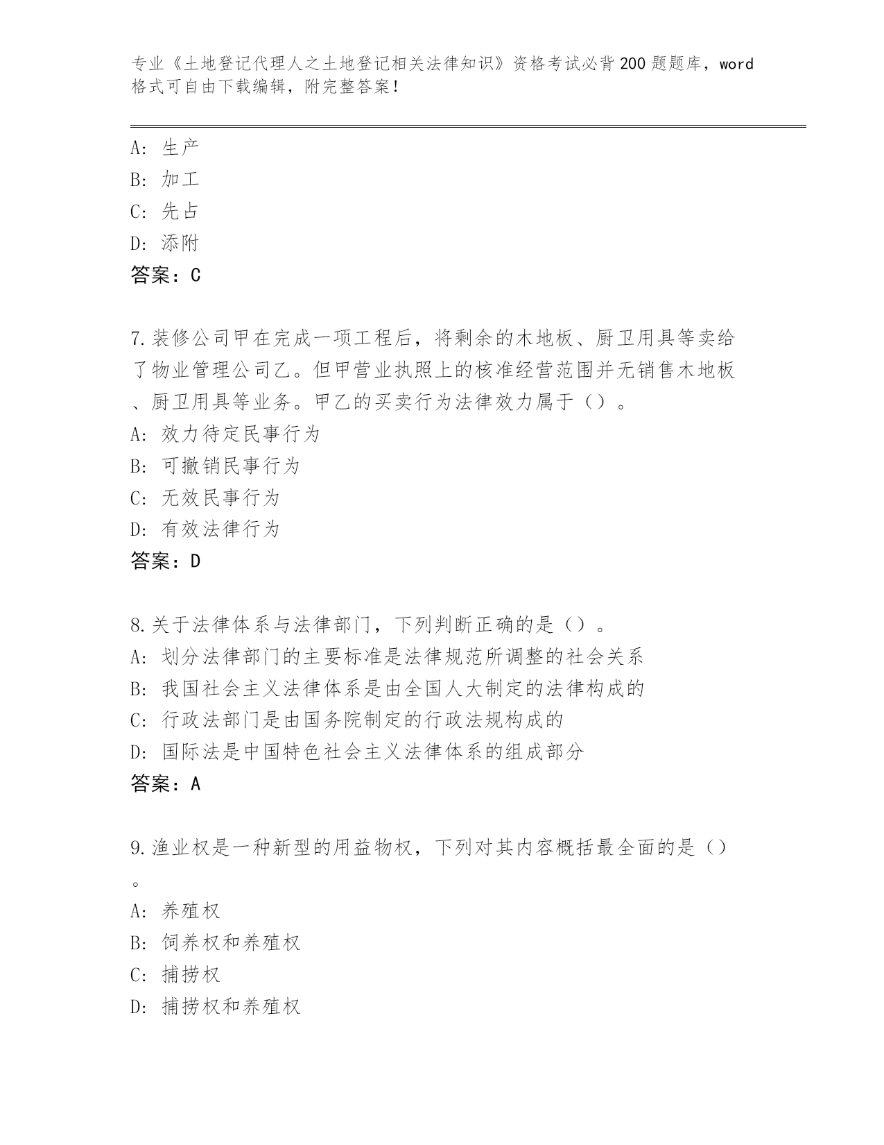 2024黑龙江省泰来县《土地登记代理人之土地登记相关法律知识》资格考试必刷200题真题(网校专用)