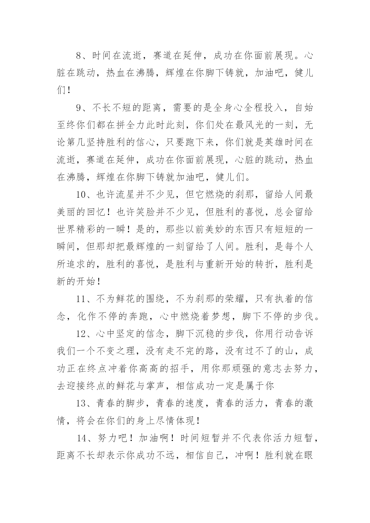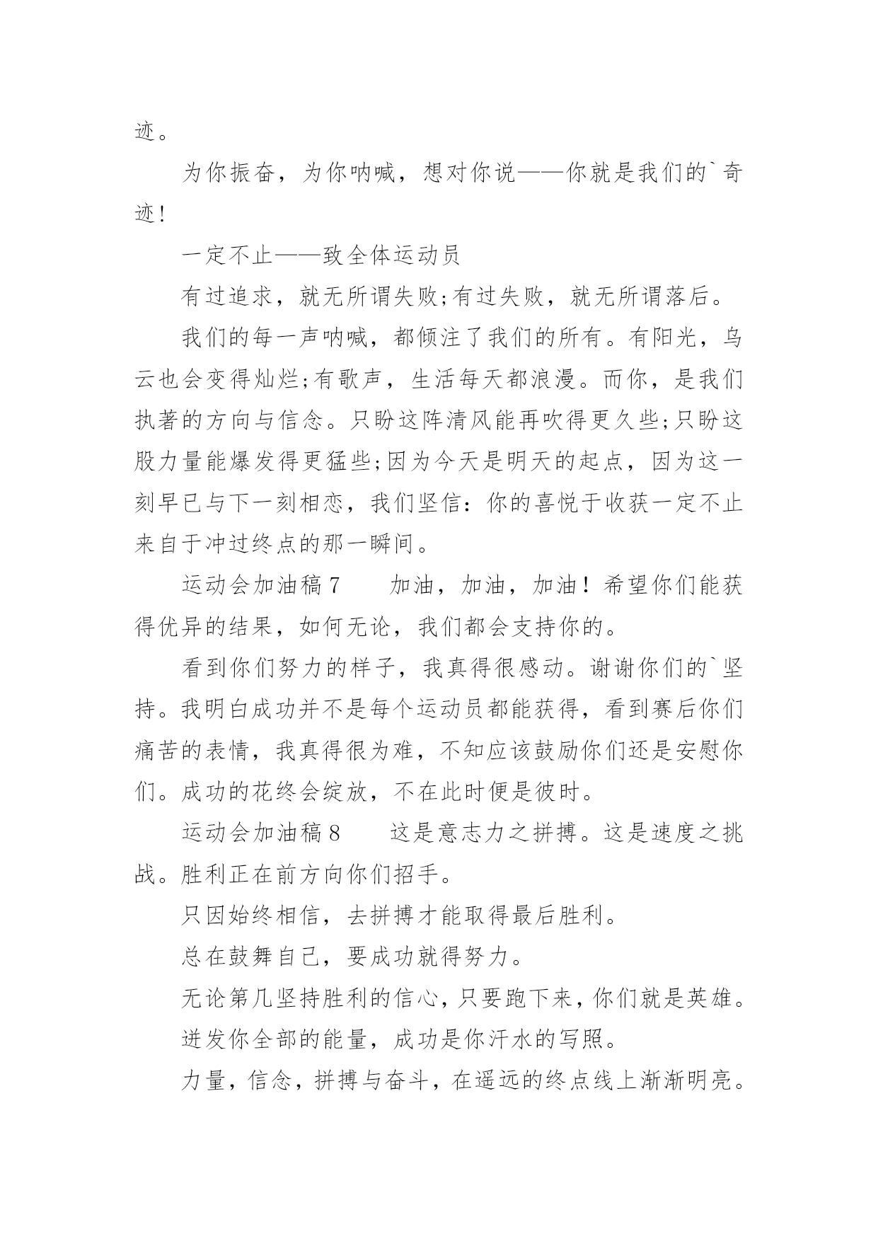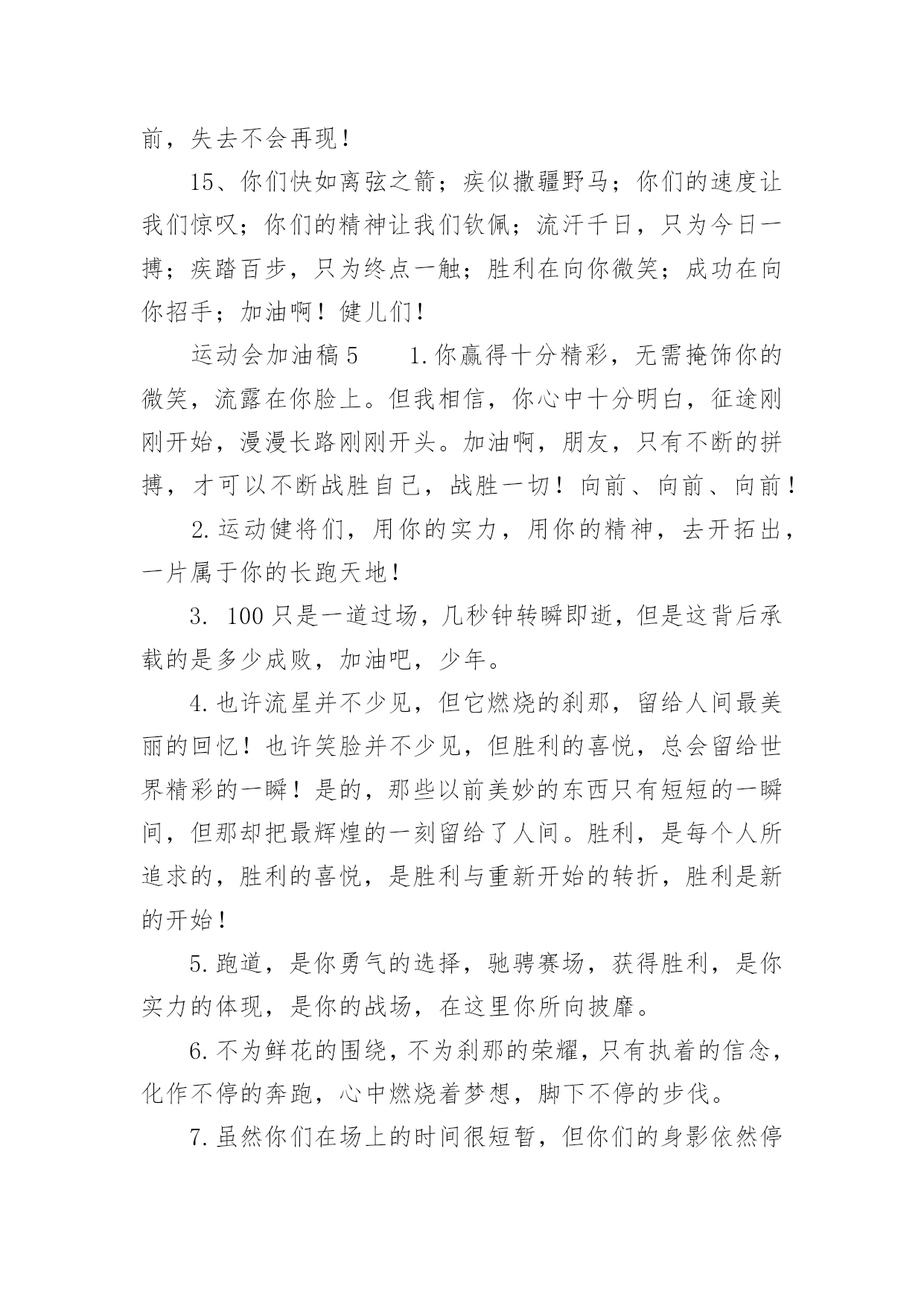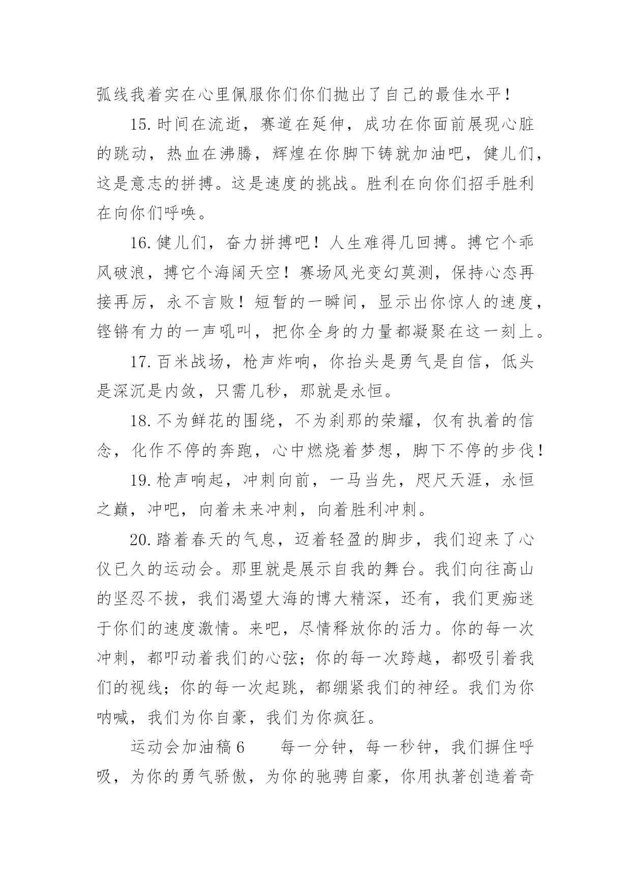 运动会加油稿运动会加油稿【大全15篇】在我们平凡的日常里,我们都跟加油稿有着直接或间接的联系,加油稿可以起到活跃气氛的作用。那么问题来了,到底应如何写好一份加油稿呢?下面是小编整理的运动会加油稿,欢迎阅读与收藏。运动会加油稿1我们不喜欢无云的天空,我们不喜欢无泪的人生,因为,云朵也是一道风景,眼泪也是一种晶莹,不要总是遗憾,生命的美丽,常常在于过程,不要总是哀叹,一点点挫折,只会让人,越战越勇。今日的你们英姿飒爽,今日的你们一马当先。不要放下,不要气馁。相信自己,你是最棒的!你永远都是我们心中的'体育健儿!加油!时值秋暮冬初,虽然已过了金秋十月,然而初冬依然暖阳高照,校运动会在这样风和日丽的天气里如期举行了。运动会加油稿21.尊敬的班长大人,我们八班同学都希望在赛场上也能看见你的神威,我们都知道,八的班长是一个文武双全的奇女子,在学习上,你是我们的榜样,也曾为班级获得过许多荣誉。在这次运动会上,我们坚信你能为班级再添一次荣誉!加油!2.也许流星并不少见,但它燃烧的刹那,留给人间最美丽的回忆!也许笑脸并不少见,但胜利的喜悦,总会留给世界精彩的一瞬!是的,那些曾经美妙的东西只有短短的一瞬间,但那却把最辉煌的一刻留给了人间。胜利,是每个人所追求的,胜利的喜悦,是胜利与重新开始的转折,胜利是新的开始!3.不为鲜花的围绕,不为刹那的荣耀,只有执着的`信念,化作不停的奔跑,心中燃烧着梦想,脚下不停的步伐,你用行动述说着过程的重要,没有无尽的终点,没有无法攀登的险峰,希望载着终点在向你微笑,拼搏吧!经历是一种精彩,迸发你全部的能量,成功是你汗水的写照。4.虽然你们在场上的时间很短暂,但你们的身影依然停留在人们的脑海里,因为你们是赛场上最可爱的人,不为掌声的注释,不为刻意的征服,不为失败的痛苦,只有辛勤的汗水化作成功的脚步。5.心中坚定的信念,脚下沉稳的步伐,你用行动告诉我们一个不变之理,没有走不完的路,没有过不了的山,成功正在终点冲着你高高的招手,用你那顽强的意志去努力,去迎接终点的鲜花与掌声,相信成功一定是属于你。6.踏着春天的气息,迈着轻盈的脚步,我们迎来了心仪已久的运动会。这里就是展示自我的舞台。我们向往高山的坚忍不拔,我们渴望大海的博大精深,还有,我们更痴迷于你们的速度激情。来吧,尽情释放你的活力。你的每一次冲刺,都叩动着我们的心弦;你的每一次跨越,都吸引着我们的视线;你的每一次起跳,都绷紧我们的神经。我们为你呐喊,我们为你自豪,我们为你疯狂。7.青春的脚步,青春的速度,青春的活力,青春的激情,将会在你们的身上尽情体现。迎接自我,挑战自我,战胜自我!我们相信你们一定能行,加油吧,运动员!终点就在眼前!8.有多少次挥汗如雨,伤痛曾添满记忆,只因为始终相信,去拼搏才能胜利。总在鼓舞自己,要成功就得努力。热血在赛场沸腾,巨人在赛场升起。相信自己,你将赢得胜利,创造奇迹;相信自己,梦想在你手中,这是你的天地。当一切过去,你们将是第一。相信自己,你们将超越极限,超越自己!相信自己,加油吧,健儿们,相信你自己。运动会加油稿3加油吧,运动健儿们!阵阵有力的步伐,声声有劲的呐喊,运动场上洒下我们青春的点点滴滴。旗摇摇,鼓声声,这里挡不助的是青春活力;枪声响起,“预备起跑”,挡不助的是健儿们如火般的气势。英雄舍我其谁,胜利当仁不让,声声誓言浸透着健儿们的昂扬斗志。朋友们,为运动健儿们喝彩,为运动喝彩吧!场上精彩纷呈,空气里的.每一个分子浸透着自信。xxx班的我要高喊一声:“这里无限精彩!秋风羽,天气淡淡的转凉。然而这人的秋在今天更加迷人,不是因为它的秋高气爽,也不是因为它的明媚阳光,是因为今天的人儿倍加精神气爽。看!运动场上那一幕幕,一股股,无论是哭是笑,市喜是悲,其中都融入了他们的汗水辛劳。他们是真正的矫健者,是运动场上的骄儿,更是我们心中的英雄。加油吧!英雄们!运动会加油稿41、年轻的我们自信飞扬,青春的气息如同初升的朝阳,蓬勃的力量如同阳光的挥洒。此时此刻,跑道便是我们精彩的舞台,声声加油便是我们的奖项!2、此时此刻,虽然脑海里浮想联翩,但我仍然安静地坐在大本营,写着通讯稿,仍然站在场边扯破嗓子地喊"加油"。3、观众席上掌声雷动,热热烈烈划破长空,他们的灵魂在叫,血在烧,都是渴望,有无限的期望,掌声响起来为新的力量喝彩,掌声响起来,每一刻都精彩。4、我只愿做一片落叶,去点缀金黄的秋天,我只愿做一颗恒星,去装饰耀眼的星河,我只愿做一棵小树,去充实五彩的世界,我只愿坐在场边,同你们分享喜悦,努力吧,拼搏吧,无论何时何地,都会有我在你的身边。5、你站在草坪上,挥舞着双臂,所有的力量刹那间都凝聚在了手上。你那有力的手上,抓着一个沉甸甸的实心球,你尽自己的力气投了出去。投近投远,都没关系,只要你努力就行!重在参与,输了明年再来比!加油。6、超越对手,