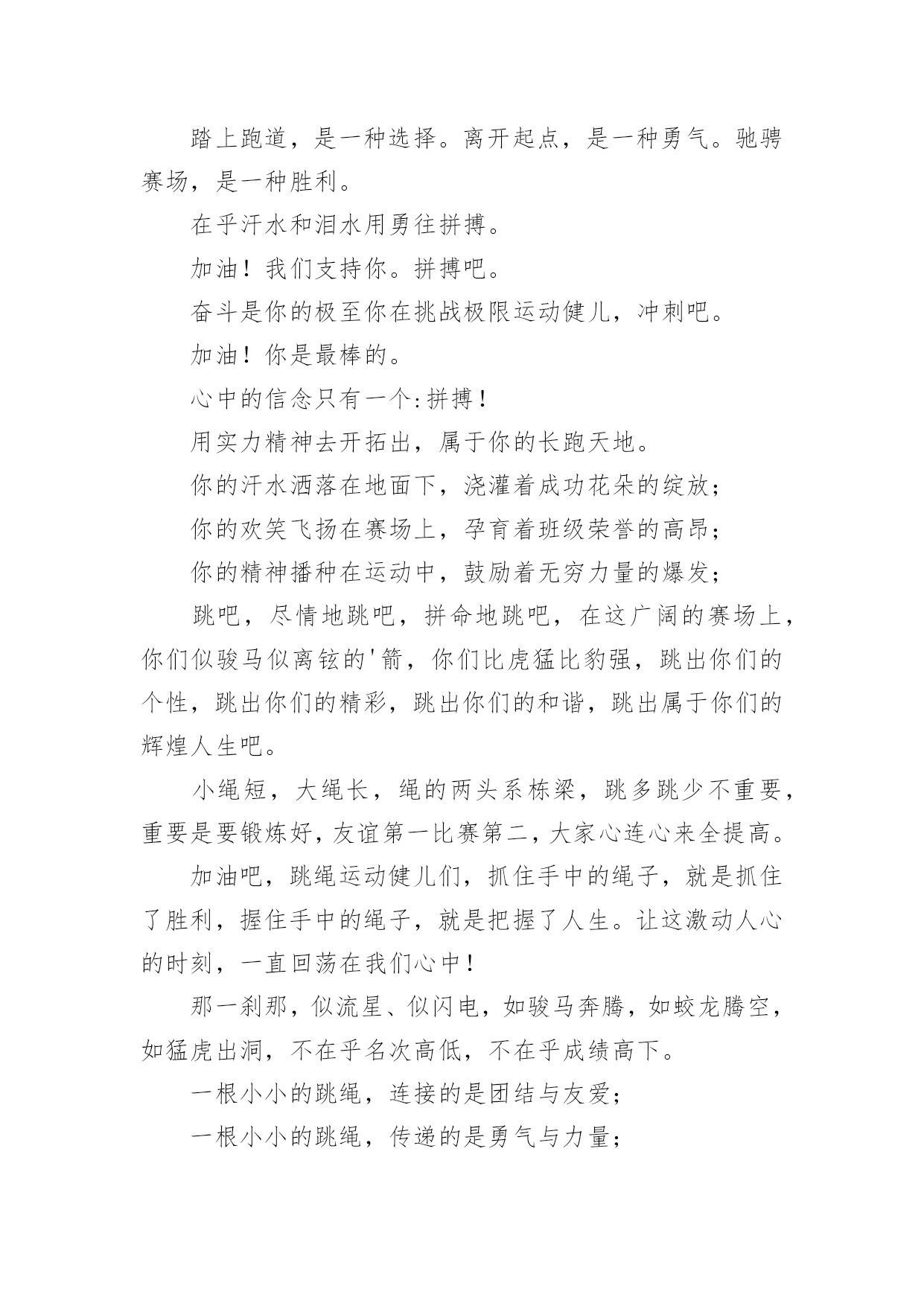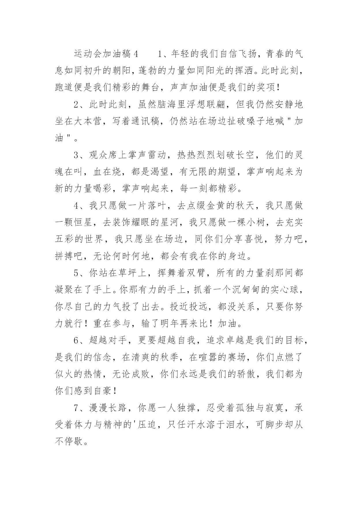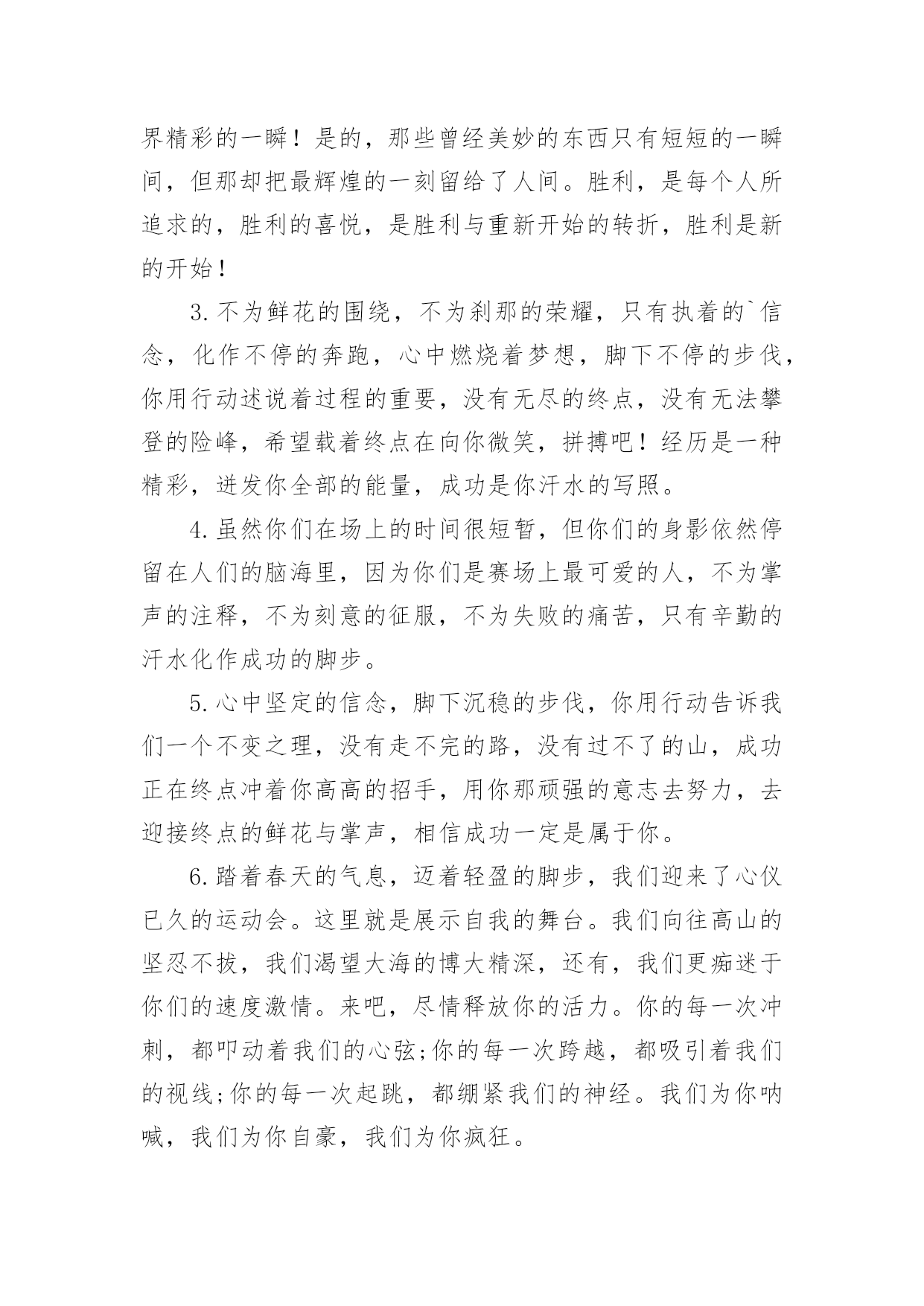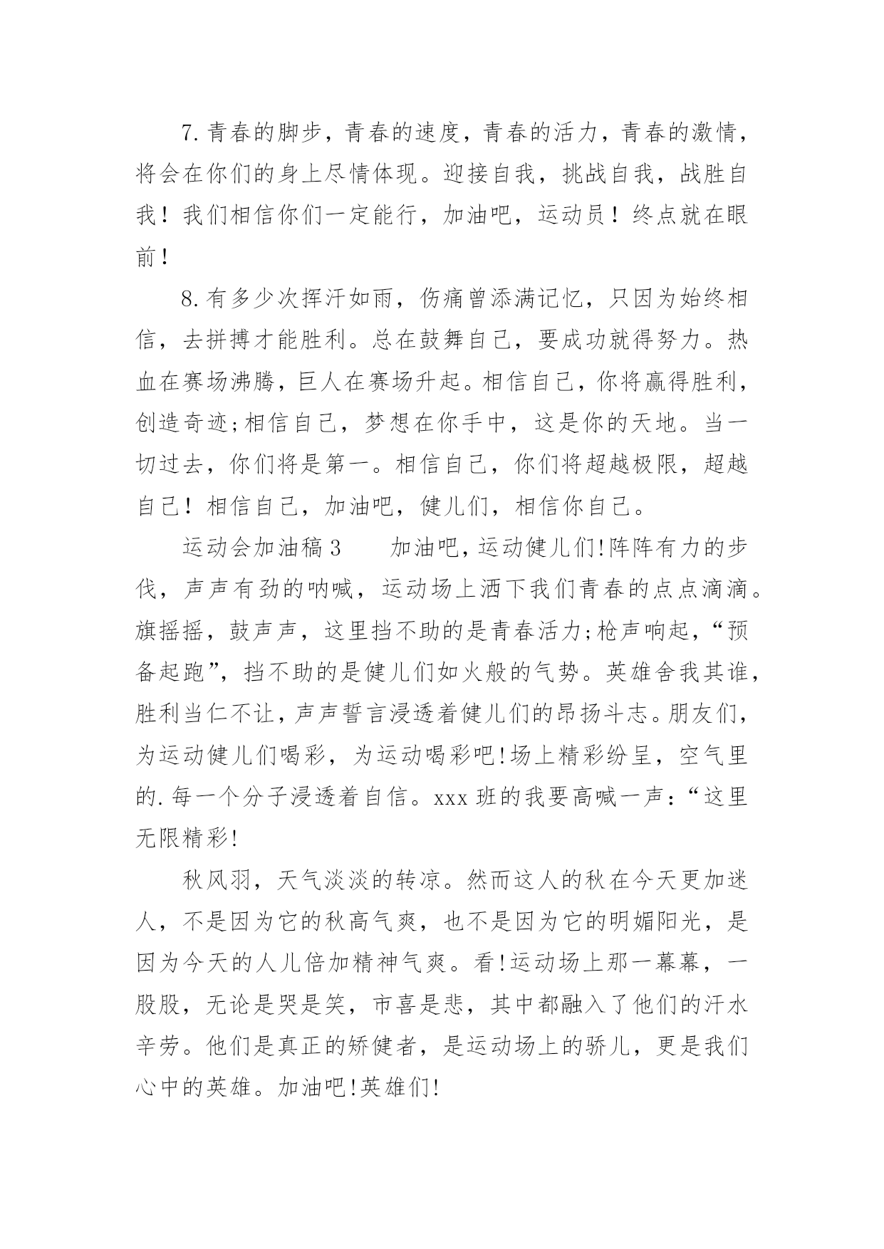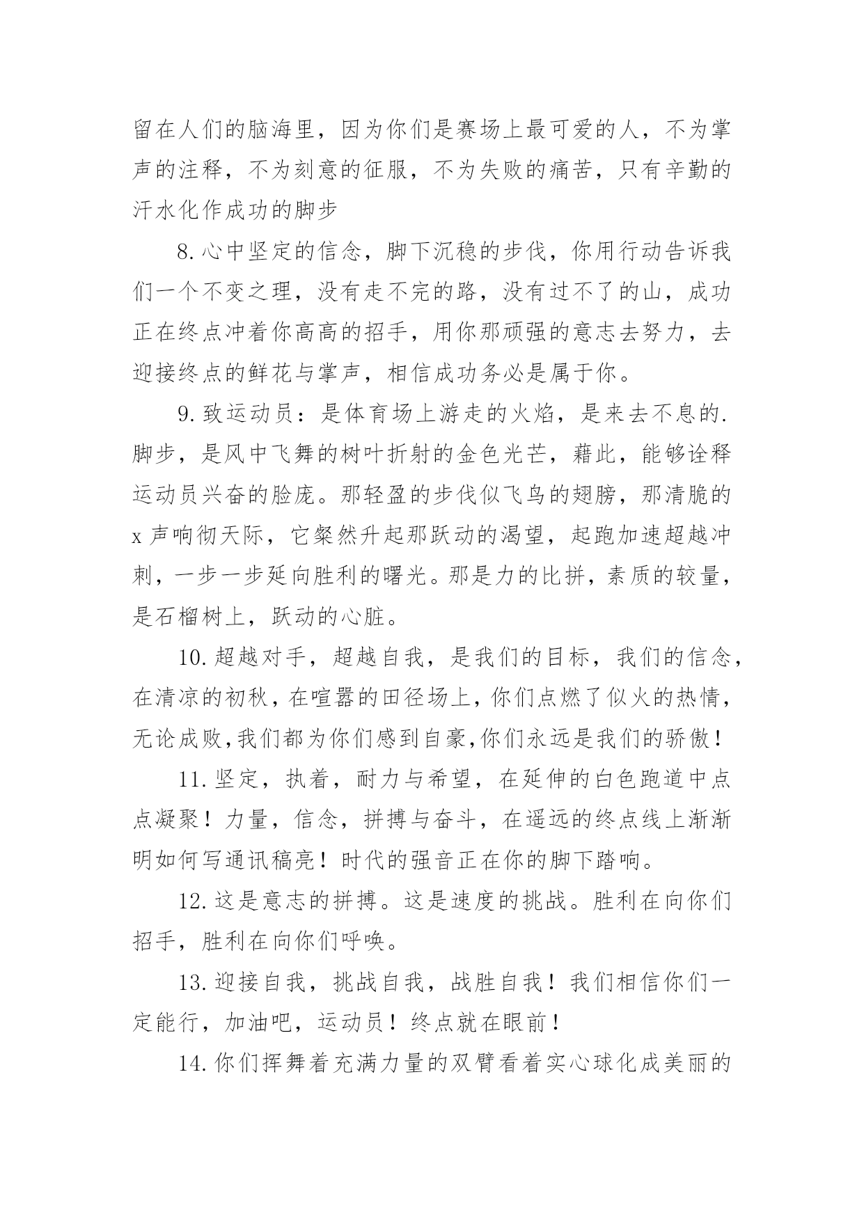 运动会加油稿运动会加油稿【大全15篇】在我们平凡的日常里,我们都跟加油稿有着直接或间接的联系,加油稿可以起到活跃气氛的作用。那么问题来了,到底应如何写好一份加油稿呢?下面是小编整理的运动会加油稿,欢迎阅读与收藏。运动会加油稿1我们不喜欢无云的天空,我们不喜欢无泪的人生,因为,云朵也是一道风景,眼泪也是一种晶莹,不要总是遗憾,生命的美丽,常常在于过程,不要总是哀叹,一点点挫折,只会让人,越战越勇。今日的你们英姿飒爽,今日的你们一马当先。不要放下,不要气馁。相信自己,你是最棒的!你永远都是我们心中的'体育健儿!加油!时值秋暮冬初,虽然已过了金秋十月,然而初冬依然暖阳高照,校运动会在这样风和日丽的天气里如期举行了。运动会加油稿21.尊敬的班长大人,我们八班同学都希望在赛场上也能看见你的神威,我们都知道,八的班长是一个文武双全的奇女子,在学习上,你是我们的榜样,也曾为班级获得过许多荣誉。在这次运动会上,我们坚信你能为班级再添一次荣誉!加油!2.也许流星并不少见,但它燃烧的刹那,留给人间最美丽的回忆!也许笑脸并不少见,但胜利的喜悦,总会留给世界精彩的一瞬!是的,那些曾经美妙的东西只有短短的一瞬间,但那却把最辉煌的一刻留给了人间。胜利,是每个人所追求的,胜利的喜悦,是胜利与重新开始的转折,胜利是新的开始!3.不为鲜花的围绕,不为刹那的荣耀,只有执着的`信念,化作不停的奔跑,心中燃烧着梦想,脚下不停的步伐,你用行动述说着过程的重要,没有无尽的终点,没有无法攀登的险峰,希望载着终点在向你微笑,拼搏吧!经历是一种精彩,迸发你全部的能量,成功是你汗水的写照。4.虽然你们在场上的时间很短暂,但你们的身影依然停留在人们的脑海里,因为你们是赛场上最可爱的人,不为掌声的注释,不为刻意的征服,不为失败的痛苦,只有辛勤的汗水化作成功的脚步。5.心中坚定的信念,脚下沉稳的步伐,你用行动告诉我们一个不变之理,没有走不完的路,没有过不了的山,成功正在终点冲着你高高的招手,用你那顽强的意志去努力,去迎接终点的鲜花与掌声,相信成功一定是属于你。6.踏着春天的气息,迈着轻盈的脚步,我们迎来了心仪已久的运动会。这里就是展示自我的舞台。我们向往高山的坚忍不拔,我们渴望大海的博大精深,还有,我们更痴迷于你们的速度激情。来吧,尽情释放你的活力。你的每一次冲刺,都叩动着我们的心弦;你的每一次跨越,都吸引着我们的视线;你的每一次起跳,都绷紧我们的神经。我们为你呐喊,我们为你自豪,我们为你疯狂。7.青春的脚步,青春的速度,青春的活力,青春的激情,将会在你们的身上尽情体现。迎接自我,挑战自我,战胜自我!我们相信你们一定能行,加油吧,运动员!终点就在眼前!8.有多少次挥汗如雨,伤痛曾添满记忆,只因为始终相信,去拼搏才能胜利。总在鼓舞自己,要成功就得努力。热血在赛场沸腾,巨人在赛场升起。相信自己,你将赢得胜利,创造奇迹;相信自己,梦想在你手中,这是你的天地。当一切过去,你们将是第一。相信自己,你们将超越极限,超越自己!相信自己,加油吧,健儿们,相信你自己。运动会加油稿3加油吧,运动健儿们!阵阵有力的步伐,声声有劲的呐喊,运动场上洒下我们青春的点点滴滴。旗摇摇,鼓声声,这里挡不助的是青春活力;枪声响起,“预备起跑”,挡不助的是健儿们如火般的气势。英雄舍我其谁,胜利当仁不让,声声誓言浸透着健儿们的昂扬斗志。朋友们,为运动健儿们喝彩,为运动喝彩吧!场上精彩纷呈,空气里的.每一个分子浸透着自信。xxx班的我要高喊一声:“这里无限精彩!秋风羽,天气淡淡的转凉。然而这人的秋在今天更加迷人,不是因为它的秋高气爽,也不是因为它的明媚阳光,是因为今天的人儿倍加精神气爽。看!运动场上那一幕幕,一股股,无论是哭是笑,市喜是悲,其中都融入了他们的汗水辛劳。他们是真正的矫健者,是运动场上的骄儿,更是我们心中的英雄。加油吧!英雄们!运动会加油稿41、年轻的我们自信飞扬,青春的气息如同初升的朝阳,蓬勃的力量如同阳光的挥洒。此时此刻,跑道便是我们精彩的舞台,声声加油便是我们的奖项!2、此时此刻,虽然脑海里浮想联翩,但我仍然安静地坐在大本营,写着通讯稿,仍然站在场边扯破嗓子地喊"加油"。3、观众席上掌声雷动,热热烈烈划破长空,他们的灵魂在叫,血在烧,都是渴望,有无限的期望,掌声响起来为新的力量喝彩,掌声响起来,每一刻都精彩。4、我只愿做一片落叶,去点缀金黄的秋天,我只愿做一颗恒星,去装饰耀眼的星河,我只愿做一棵小树,去充实五彩的世界,我只愿坐在场边,同你们分享喜悦,努力吧,拼搏吧,无论何时何地,都会有我在你的身边。5、你站在草坪上,挥舞着双臂,所有的力量刹那间都凝聚在了手上。你那有力的手上,抓着一个沉甸甸的实心球,你尽自己的力气投了出去。投近投远,都没关系,只要你努力就行!重在参与,输了明年再来比!加油。6、超越对手,