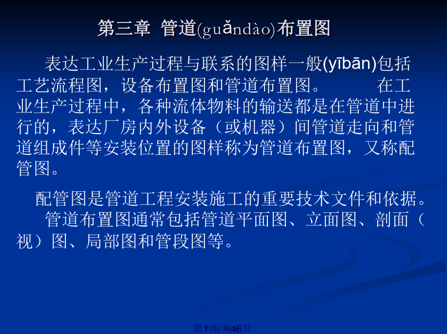 会计学第三章管道(guǎndào)布置图管道布置图的内容及表示方法,也就是管道布置图需要画什么及如何画的问题。由于对图使用的要求不同,其表达(biǎodá)的重点、深度、广度、内容详略等也各有不同。图纸是供施工和生产用的,是给别人看的,不应由于不适当的简化或画错给施工和生产造成困难,至于表示方法,主要是“技巧”问题,熟练的设计者通过简洁的图形,适量的标注及文字说明即可准确表达(biǎodá)设计的意图;表达(biǎodá)能力差者则相反,画了许多图形再加上大量的标注和文字说明,最终仍不能准确表达(biǎodá)设计意图。绘制管道布置图的一般要求1.按比例管道图原则上均应按比例绘制。按比例的主要目的和好处在于正确表达管道及组件所占据的空间,避免碰撞及影响施工和操作。下列两类要求按比例或大致按比例绘制。①构筑物、建筑物的断面形状和尺寸,墙的厚度(hòudù),门、窗、梯子的位置等。②管道配件的形状和尺寸。如管子横断面的直径、对焊弯头的半径、法兰的外径、阀门的长度和高度,保温管道的外径等。管道布置图的常用比例为1:20、1:25、1:33、1:40和1:50等。管道、设备图线符号及图例1.常用图线及其应用范围在管道图中,各种线型的含义和作用是不同的,各部(委)、行业对管道线型的规定也不同,在石油化工行业工艺管道途中的图线及其应用范围见表5-1。2.设备代号与图例石化设备在工艺管道图上一般按比例用细线画出能够反映设备特征得主要轮廓;有时也画出具有工艺特征的内件示意(shìyì)结构。3.管子、管件、阀门及其常用图例符号图例是一种用示意(shìyì)性的简单图形表示具体的管道和管道附件等象形符号,石化工艺管道图中常用的图例符号见表5-3。///第二节管道(guǎndào)及管道(guǎndào)组成件的绘制一、管子的单、双线图虚线表示管子的内壁;在俯视图里的两个同心圆.管子的长短(chángduǎn)和管径与管子相同,但是用于表示管子壁厚的虚线和实线已省去不画二、弯头(wāntóu)的单、双线图2.450弯头(wāntóu)3.任意(rènyì)角度弯管图5-21(a)所示为等径正三通的三视图的双线图,两管的交接线呈V字形直线,双线图仅画外形图样即可。图5-21(b)所示为异径正三通的三视图的双线图,两管的交接线为弧线。双线图仅画外形图样即可。图5-21(c)所示为三通的单线图,在平面图上先看到立管的断口,所以把立管画成一个圆心带点的小圆,横管画到小圆边上(biānshànɡ);在左立面图(左视图)上先看到横管的断口,所以把横管画成一个圆心带点的小圆,立管画在小圆两边;在右立面图(右视图)上,先看到立管,横管的断口在背面看不到,这时横管画成小圆,立管通过圆心。图5-21(d)所示为三通的另一种表示形式,这两种画法意义相同。三、三通(sāntōnɡ)的单、双线图等径斜三通的单、双线图。在单线图里,不论是同径正三通还是异径正三通,其立面图图样(túyàng)的表示形式相同,等径斜三通或异径斜三通在单线图里其立面图的表示形式也相同。四、四通的单、双线图在等径四通的双线图中,其交接线呈X形直线,等径四通和异径四通的单线图在图样的表示形式上相同。在施工图中,是用标注(biāozhù)管子口径的方法来区别四通的等径与异径的。五.异径管单、双线图同心异径管在单线(dānxiàn)图里有的画成等腰梯形,有的画成等腰三角形,如图5-24(b)所示,这两种表示形式意义相同。偏心异径管的单线图和双线图。偏心异径外接头在平面图上的图样与同心异径外接头相同,用文字(wénzì)加以注明偏心两字,以免混淆。六.阀门的画法:阀门的种类很多,用来表示(biǎoshì)阀门的特定图例符号的部颁标准或行业标准也很多。3.直管与阀门连接的积聚(jījù)4.弯管与阀门相连的积聚(jījù)八.管子的重叠1.管子的重叠形式长短相等、直径相同(或接近)的两根管子,如果叠合在一起,它们的投影就完全重合,反映在投影面上好像是一根的投影,这种现象称为管子的重叠。管子重叠(交叉)的表示方法有折断显露法、遮挡(zhēdǎng)法和标注法2.两路管子的重叠表示方法为了识读方便对重叠管子的表示方法做了规定,当投影中出现两路管子重叠时,假想(jiǎxiǎng)前(上)面一路管子已经截去一段(用折断符号表示),这样便显露出后(下)面表示断开的管子高于中间显露的管子;如果此图是立面图,那么断开的管子表示在前,中间显露的管子表示在后。如果是平面图,当弯管高于直管时,画起来一般是让弯管和直管稍微(shāowēi)断开3-4mm,以示区别弯管和直管不在同一个标高上,这种表示方法称为遮挡法。如果是立面图,则弯头在前面,直管在后面。当直管高于弯管时,一般是用折断法将