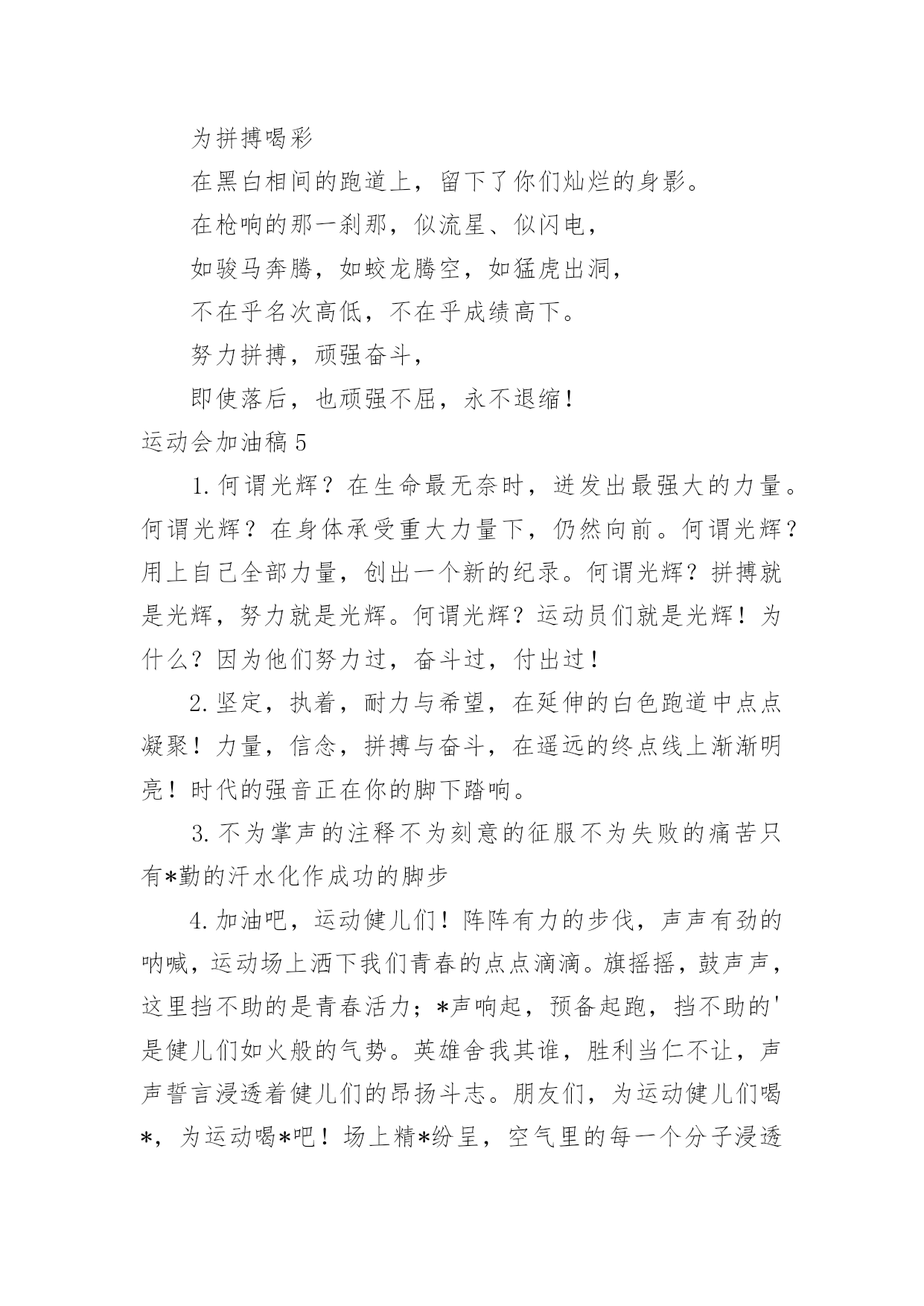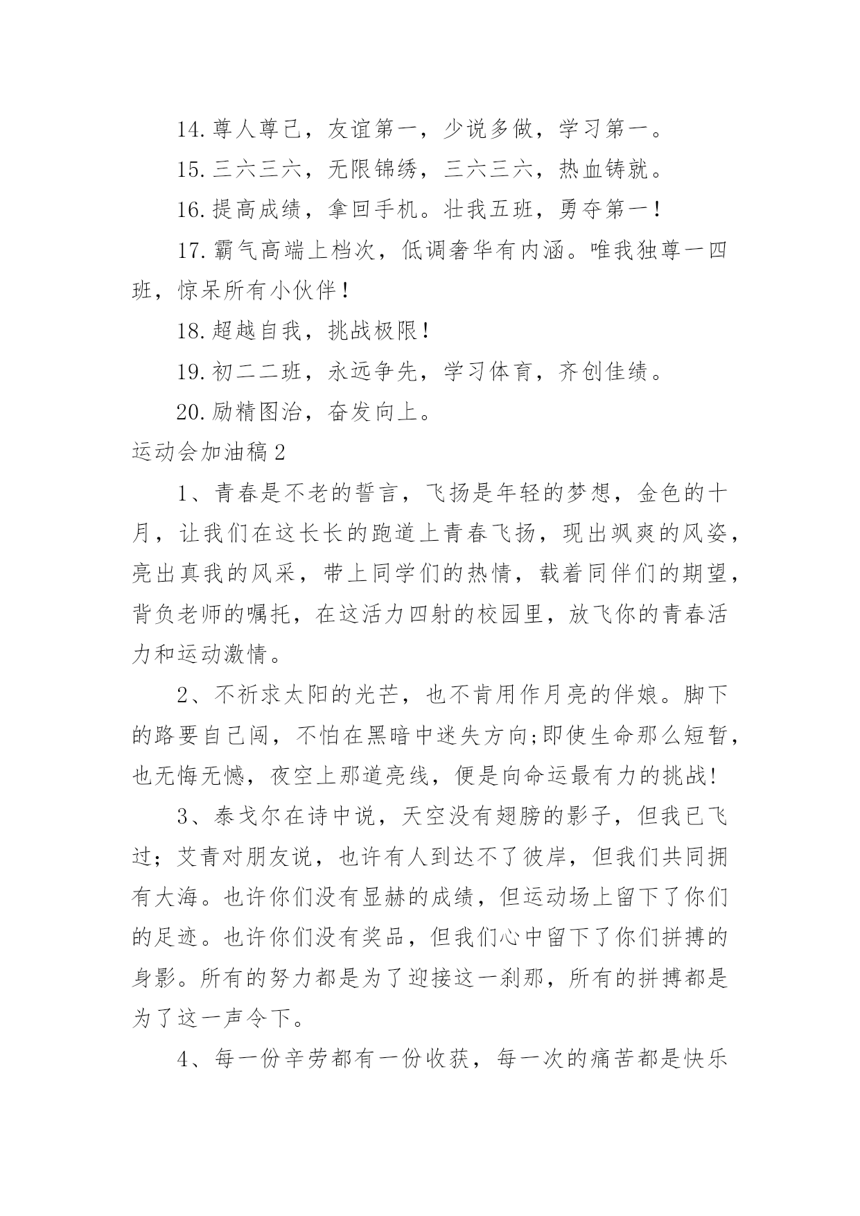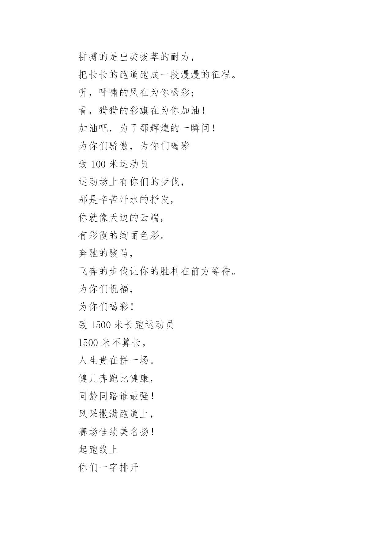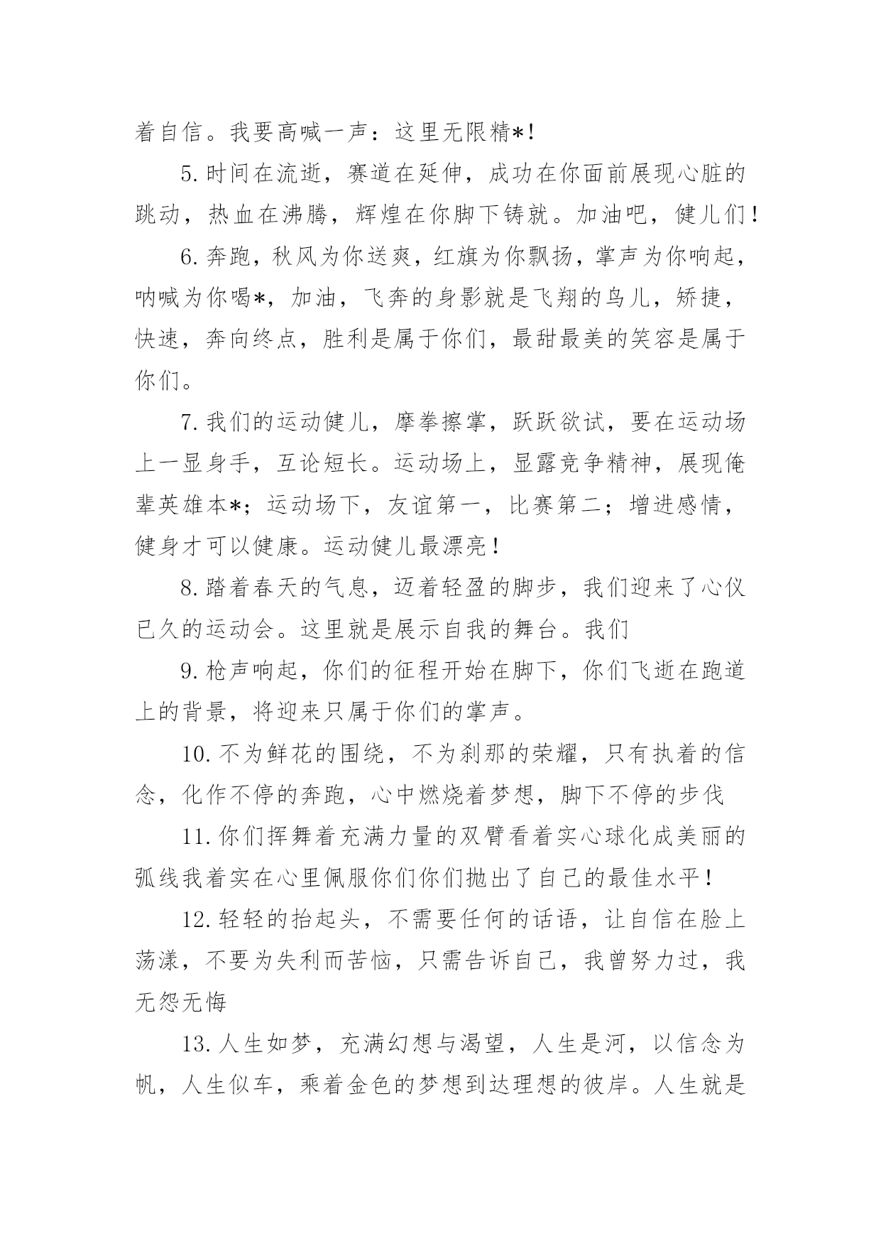 运动会加油稿运动会加油稿精品(15篇)在我们平凡的日常里,能够利用到加油稿的场合越来越多,借助加油稿可以更好地为他人加油打气。为了让您在写加油稿时更加简单方便,下面是小编整理的运动会加油稿,欢迎阅读,希望大家能够喜欢。运动会加油稿11.八二八二,独一无二,策马金安,为我二班。2.团结友爱,勤奋好学,活力飞扬。3.经数经数,推导无度,五年修满,一生是处。4.山中猛虎,出水蛟龙,XXX班,卧虎藏龙。5.百舸争流,永争第一,八二八二,独一无二。6.顽强拼搏,超越自我,不鸣则已,一鸣惊人。7.初二时代,八班最帅,团结友爱,样样厉害8.时不我待,努力举绩,一鼓作气,挑战佳绩。9.团结拼搏,奋发有为。10.努力拼搏,睿智进取,携手奋进,共创佳绩。11.齐心协力,争创佳绩,勇夺三军,所向披靡。12.团结一致,奋发拼搏,激扬青春,放飞梦想。13.学习竞赛,体育不怠,只要我在,不败。14.尊人尊己,友谊第一,少说多做,学习第一。15.三六三六,无限锦绣,三六三六,热血铸就。16.提高成绩,拿回手机。壮我五班,勇夺第一!17.霸气高端上档次,低调奢华有内涵。唯我独尊一四班,惊呆所有小伙伴!18.超越自我,挑战极限!19.初二二班,永远争先,学习体育,齐创佳绩。20.励精图治,奋发向上。运动会加油稿21、青春是不老的誓言,飞扬是年轻的梦想,金色的十月,让我们在这长长的跑道上青春飞扬,现出飒爽的风姿,亮出真我的风采,带上同学们的热情,载着同伴们的期望,背负老师的嘱托,在这活力四射的校园里,放飞你的青春活力和运动激情。2、不祈求太阳的光芒,也不肯用作月亮的伴娘。脚下的路要自己闯,不怕在黑暗中迷失方向;即使生命那么短暂,也无悔无憾,夜空上那道亮线,便是向命运最有力的挑战!3、泰戈尔在诗中说,天空没有翅膀的影子,但我已飞过;艾青对朋友说,也许有人到达不了彼岸,但我们共同拥有大海。也许你们没有显赫的成绩,但运动场上留下了你们的足迹。也许你们没有奖品,但我们心中留下了你们拼搏的身影。所有的努力都是为了迎接这一刹那,所有的拼搏都是为了这一声令下。4、每一份辛劳都有一份收获,每一次的痛苦都是快乐的开始,每一声呐喊都是力量的呼唤。我们有着大浪拍岸的豪迈,所以你不必在乎小荷初露的恬静,我们有着春日的阳光明媚,所以不用去羡慕冬日乱玉碎琼,我们是雨天的一把伞,是寒冷冬日里的一盆碳火,温暖的`不只是你我,而是大家的心。运动场上的健儿,掌声属于你们,鲜花属于你们,成功也是属于你们!5、是体育场上游走的火焰,是来去不息的脚步,是风中飞舞的树叶折射的金色光芒,藉此,可以诠释运动员兴奋的脸庞。那轻盈的步伐似飞鸟的翅膀,那清脆的枪声响彻天际,它粲然升起那跃动的渴望,起跑、加速、超越、冲刺,一步一步延向胜利的曙光。那是力的比拼,素质的较量,是石榴树上,跃动的心脏。6、你站在草坪上,挥舞着双臂,所有的力量顿时间都凝聚在了手上。你那有力的手上,,抓着一个沉甸甸的实心球,你尽自己最打的力气投了出去。投近投远,都没关系,只要你努力就行!重在参与,输了明年再来比!加油。7、时间在流逝,赛道在延伸,成功在你面前展现心脏的跳动,热血在沸腾,辉煌在你脚下铸就加油吧,健儿们。8、汗水,泪水;笑声,歌声;我们尽情挥洒。开幕式上,运动场上,我们尽情展现,多少艰辛,多少困苦,我们勇敢承担。因为年轻,因为张扬,因为我们知道:用今天的汗水换来明天的微笑。9、加油吧!让这激动人心的时刻,一直回荡在大家心中!致400M运动员无论结局是好是坏,无怨无悔是大家的选择,每当运动员奔驰在400米跑道上时,大家为你祝福为你喝彩。10、人生的路,有坦途,也有坎坷;做过的岁月,有欢笑,也有苦涩,泪水告诉我一个跌倒的故事,汗水使我多了一份沉重,几多成熟。11、青春在飞扬,个性在张扬,运动场上的运动健儿们,拿出你们的热情,拿出你们的自信,让运动展现你们的风采吧!伴随着激动人心的音乐,你的心必须在跳跃着。让行动证明你们的魅力吧!我们永远支持你们,无论成败,无论结果如何,你们始终是我们心中的英雄。12、人生的路,有坦途,也有坎坷;做过的岁月,有欢笑,也有苦涩,泪水告诉我一个跌倒的故事,汗水使我多了一份沉重,几多成熟。运动会加油稿3掌声依然为你响起,鲜花依然为你献上。一时的输赢不代表终生的成败!擦干泪水,振作精神,新的冲锋号已经吹响!谁说天空没有鸟的痕迹而鸟已飞过?鸟飞过的痕迹已刻在天空的.心中。你的精神也刻在了所有人的心中。不论结果如何。总结经验,吸取教训,继续努力。无论失败与否重要的是你勇于参与的精神。付出的背后是胜利。运动会加油稿4你的汗水一滴滴的滴落在红色的跑道上,你的步伐渐渐沉重、缓慢。想起我曾经对你鼓励的话语,此刻都脆弱的不堪一击。努力、坚持。这些话语此时都没有了意义。我只在心底里为你祝福,为你鼓劲。企盼你能微笑着冲过终点,