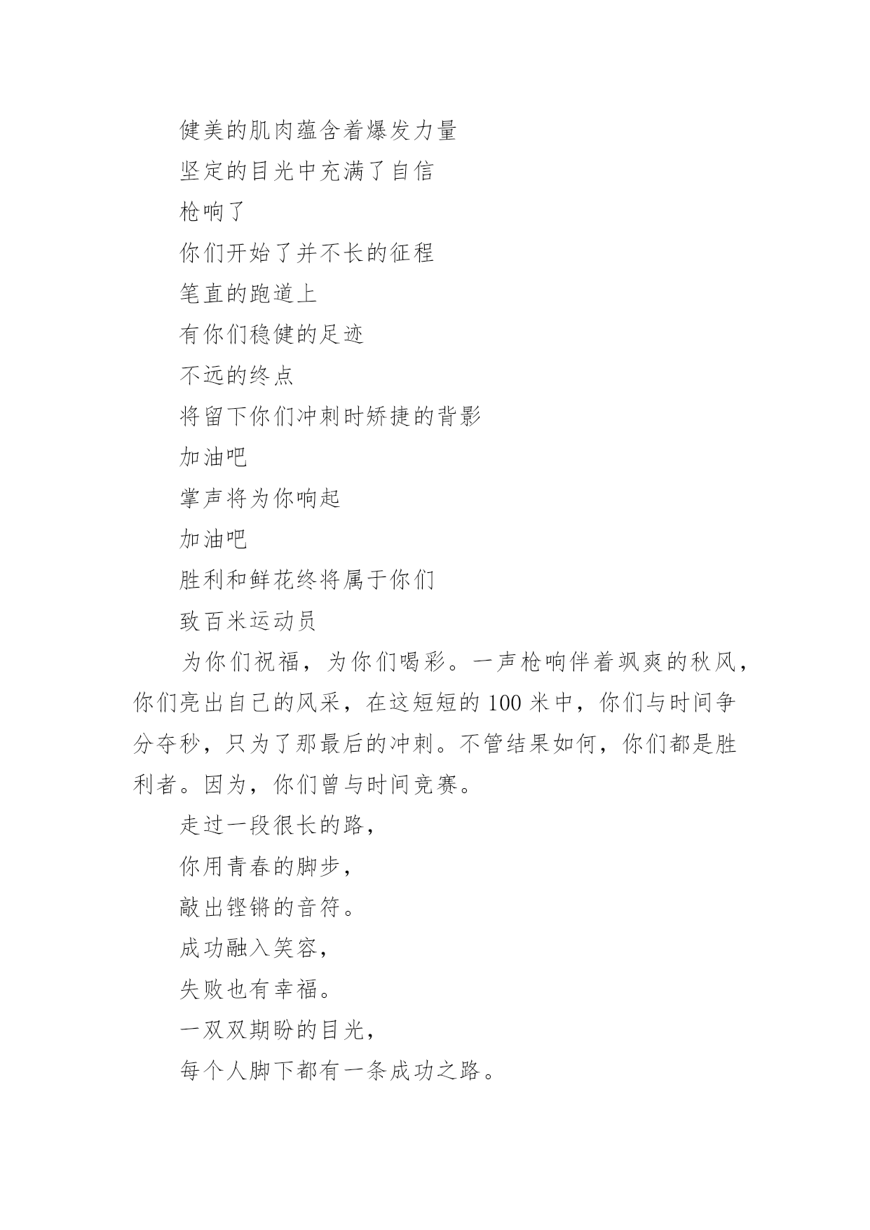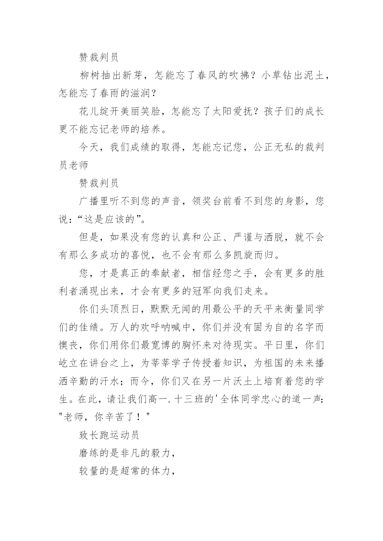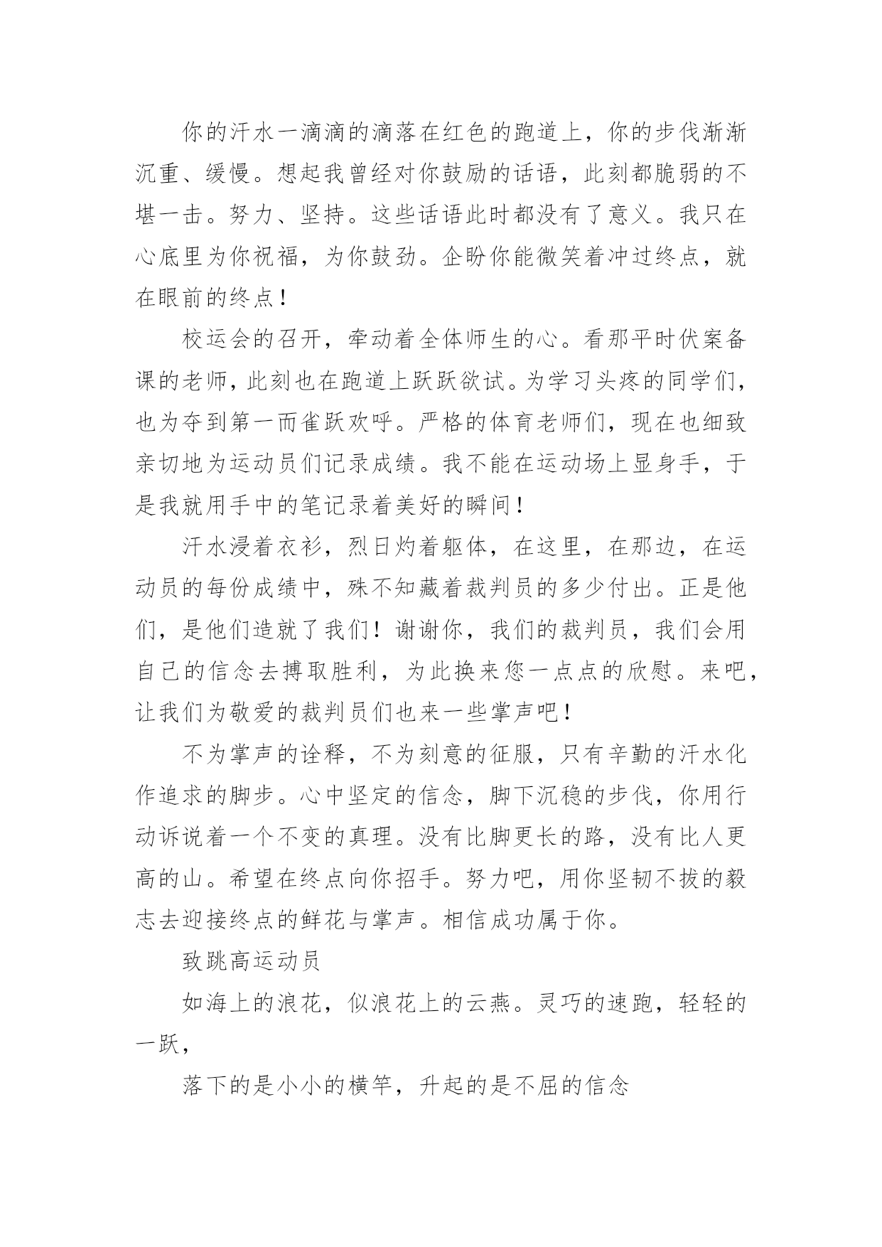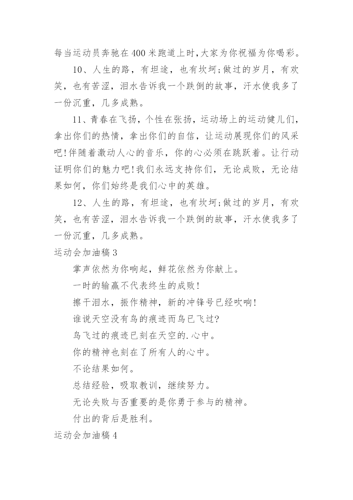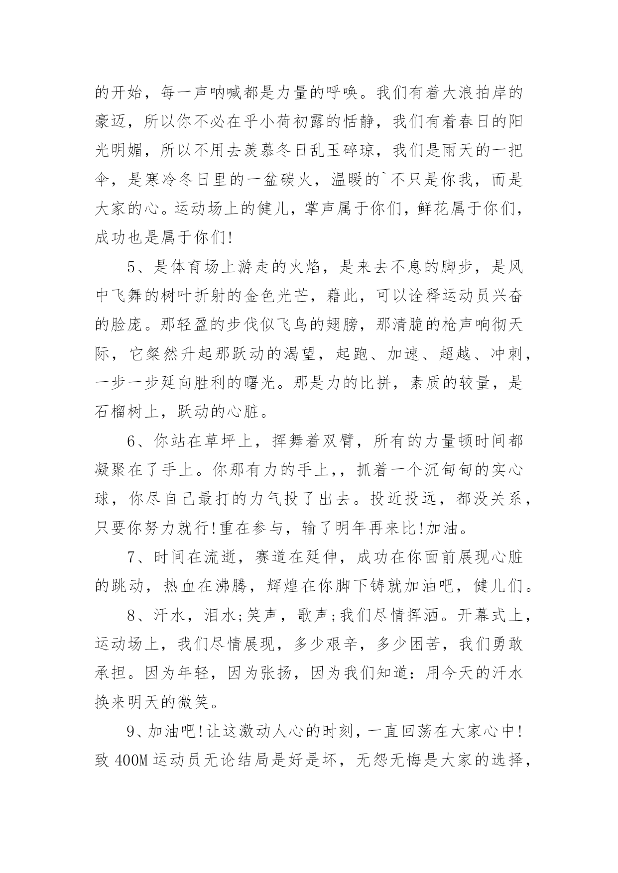 运动会加油稿运动会加油稿精品(15篇)在我们平凡的日常里,能够利用到加油稿的场合越来越多,借助加油稿可以更好地为他人加油打气。为了让您在写加油稿时更加简单方便,下面是小编整理的运动会加油稿,欢迎阅读,希望大家能够喜欢。运动会加油稿11.八二八二,独一无二,策马金安,为我二班。2.团结友爱,勤奋好学,活力飞扬。3.经数经数,推导无度,五年修满,一生是处。4.山中猛虎,出水蛟龙,XXX班,卧虎藏龙。5.百舸争流,永争第一,八二八二,独一无二。6.顽强拼搏,超越自我,不鸣则已,一鸣惊人。7.初二时代,八班最帅,团结友爱,样样厉害8.时不我待,努力举绩,一鼓作气,挑战佳绩。9.团结拼搏,奋发有为。10.努力拼搏,睿智进取,携手奋进,共创佳绩。11.齐心协力,争创佳绩,勇夺三军,所向披靡。12.团结一致,奋发拼搏,激扬青春,放飞梦想。13.学习竞赛,体育不怠,只要我在,不败。14.尊人尊己,友谊第一,少说多做,学习第一。15.三六三六,无限锦绣,三六三六,热血铸就。16.提高成绩,拿回手机。壮我五班,勇夺第一!17.霸气高端上档次,低调奢华有内涵。唯我独尊一四班,惊呆所有小伙伴!18.超越自我,挑战极限!19.初二二班,永远争先,学习体育,齐创佳绩。20.励精图治,奋发向上。运动会加油稿21、青春是不老的誓言,飞扬是年轻的梦想,金色的十月,让我们在这长长的跑道上青春飞扬,现出飒爽的风姿,亮出真我的风采,带上同学们的热情,载着同伴们的期望,背负老师的嘱托,在这活力四射的校园里,放飞你的青春活力和运动激情。2、不祈求太阳的光芒,也不肯用作月亮的伴娘。脚下的路要自己闯,不怕在黑暗中迷失方向;即使生命那么短暂,也无悔无憾,夜空上那道亮线,便是向命运最有力的挑战!3、泰戈尔在诗中说,天空没有翅膀的影子,但我已飞过;艾青对朋友说,也许有人到达不了彼岸,但我们共同拥有大海。也许你们没有显赫的成绩,但运动场上留下了你们的足迹。也许你们没有奖品,但我们心中留下了你们拼搏的身影。所有的努力都是为了迎接这一刹那,所有的拼搏都是为了这一声令下。4、每一份辛劳都有一份收获,每一次的痛苦都是快乐的开始,每一声呐喊都是力量的呼唤。我们有着大浪拍岸的豪迈,所以你不必在乎小荷初露的恬静,我们有着春日的阳光明媚,所以不用去羡慕冬日乱玉碎琼,我们是雨天的一把伞,是寒冷冬日里的一盆碳火,温暖的`不只是你我,而是大家的心。运动场上的健儿,掌声属于你们,鲜花属于你们,成功也是属于你们!5、是体育场上游走的火焰,是来去不息的脚步,是风中飞舞的树叶折射的金色光芒,藉此,可以诠释运动员兴奋的脸庞。那轻盈的步伐似飞鸟的翅膀,那清脆的枪声响彻天际,它粲然升起那跃动的渴望,起跑、加速、超越、冲刺,一步一步延向胜利的曙光。那是力的比拼,素质的较量,是石榴树上,跃动的心脏。6、你站在草坪上,挥舞着双臂,所有的力量顿时间都凝聚在了手上。你那有力的手上,,抓着一个沉甸甸的实心球,你尽自己最打的力气投了出去。投近投远,都没关系,只要你努力就行!重在参与,输了明年再来比!加油。7、时间在流逝,赛道在延伸,成功在你面前展现心脏的跳动,热血在沸腾,辉煌在你脚下铸就加油吧,健儿们。8、汗水,泪水;笑声,歌声;我们尽情挥洒。开幕式上,运动场上,我们尽情展现,多少艰辛,多少困苦,我们勇敢承担。因为年轻,因为张扬,因为我们知道:用今天的汗水换来明天的微笑。9、加油吧!让这激动人心的时刻,一直回荡在大家心中!致400M运动员无论结局是好是坏,无怨无悔是大家的选择,每当运动员奔驰在400米跑道上时,大家为你祝福为你喝彩。10、人生的路,有坦途,也有坎坷;做过的岁月,有欢笑,也有苦涩,泪水告诉我一个跌倒的故事,汗水使我多了一份沉重,几多成熟。11、青春在飞扬,个性在张扬,运动场上的运动健儿们,拿出你们的热情,拿出你们的自信,让运动展现你们的风采吧!伴随着激动人心的音乐,你的心必须在跳跃着。让行动证明你们的魅力吧!我们永远支持你们,无论成败,无论结果如何,你们始终是我们心中的英雄。12、人生的路,有坦途,也有坎坷;做过的岁月,有欢笑,也有苦涩,泪水告诉我一个跌倒的故事,汗水使我多了一份沉重,几多成熟。运动会加油稿3掌声依然为你响起,鲜花依然为你献上。一时的输赢不代表终生的成败!擦干泪水,振作精神,新的冲锋号已经吹响!谁说天空没有鸟的痕迹而鸟已飞过?鸟飞过的痕迹已刻在天空的.心中。你的精神也刻在了所有人的心中。不论结果如何。总结经验,吸取教训,继续努力。无论失败与否重要的是你勇于参与的精神。付出的背后是胜利。运动会加油稿4你的汗水一滴滴的滴落在红色的跑道上,你的步伐渐渐沉重、缓慢。想起我曾经对你鼓励的话语,此刻都脆弱的不堪一击。努力、坚持。这些话语此时都没有了意义。我只在心底里为你祝福,为你鼓劲。企盼你能微笑着冲过终点,