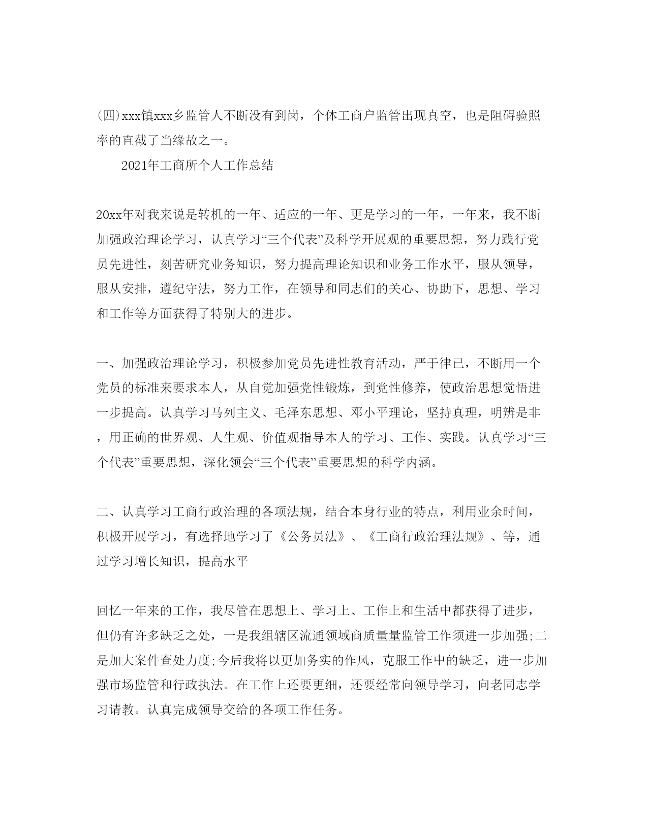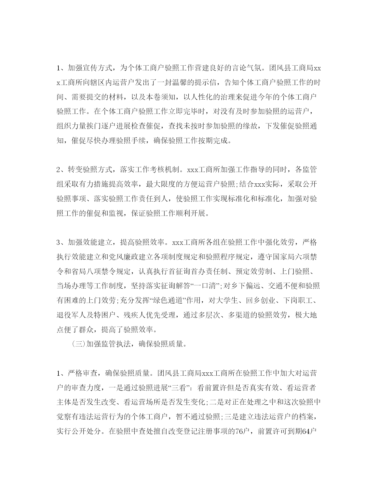 2021年工商所工作参考总结2021年工商所个人工作总结20xx年团风县工商局xxx工商所按照《行政许可法》、《城乡个体工商户治理暂行条例》、《个体工商户验照方法》等法律法规规定和团风县工商局的安排部署,结合xxx实际,突出效劳科学开展主题,坚持“两个第一”、落实“五个更加”,深化施行“市场主体增量”,加快推进传统粗放型治理向现代高效治理型晋级,探究监管效劳新方式,较好地完成了20xx年度个体工商户验照工作。一、20xx年度验照根本情况xxx镇辖区共有个体工商户1202户,(xxx有个体工商户215户)其中查无下落个体工商户283户,办理注销登记87户,应验照832户,已验照607户,验照率73%,比上一年度提高了5.07%.二、主要做法(一)加强组织领导,全面推进验照工作。为做好2021年度个体工商户验照工作,xxx工商所在2021年1月组织全体干部职工学习了《行政许可法》、《城乡个体工商户治理暂行条例》、《个体工商户验照方法》等法律法规,詹应华同志召开专题会议,进一步加强个体工商户验照工作必要性。xxx工商所把个体工商户验照工作作为工商部门为运营户集中提供效劳的过程,作为加强机关效能建立、转变工作作风、改良工作方法、完善效劳环境、提高办事效率的过程,不断提高验照率和亮照率;工商所成立领导小组,由詹应华所长负总责,副所长亲身抓,各组监管人详细抓,注册室抓落实和各组协调配合的工作方式,采取自上而下“逐级治理、分级负责”的原则,稳定有序地开展了个体工商户验照工作(二)创新效劳方式,树立工商部门形象.1、加强宣传方式,为个体工商户验照工作营建良好的言论气氛。团风县工商局xxx工商所向辖区内运营户发出了一封温馨的提示信,告知个体工商户验照工作的时间、需要提交的材料,以及本卷须知,以人性化的治理来促进今年的个体工商户验照工作。在个体工商户验照工作立即完毕时,对没有及时参加验照的运营户,组织力量挨门逐户进展检查催促,查找未按时参加验照的缘故,下发催促验照通知,催促尽快办理验照手续,确保验照工作按期完成。2、转变验照方式,落实工作考核机制。xxx工商所加强工作指导的同时,各监管组采取有力措施提高效率,最大限度的方便运营户验照;结合xxx实际,采取公开验照事项、落实验照工作责任到人,使验照工作实现标准化和标准化,加强对验照工作的催促和监视,保证验照工作顺利开展。3、加强效能建立,提高验照效率。xxx工商所各组在验照工作中强化效劳,严格执行效能建立和党风廉政建立各项制度规定和验照程序规定,遵守国家局六项禁令和省局八项禁令规定,认真执行首征询首办责任制、预定效劳制、上门验照、当场办理等工作制度,坚持落实征询解答“一口清”;对乡下偏远、交通不便和验照有困难的上门效劳;充分发挥“绿色通道”作用,对大学生、回乡创业、下岗职工、退役军人及特困户、残疾人优先受理,通过多层次、多渠道的验照效劳,极大地点便了群众,提高了验照效率。(三)加强监管执法,确保验照质量。1、严格审查,确保验照质量。团风县工商局xxx工商所在验照工作中加大对运营户的审查力度,一是通过验照进展“三看”:看前置许但是否真实有效、看运营者主体是否发生改变、看运营场所是否发生变化;二是对正在处理之中和这次验照中觉察有违法运营行为的个体工商户,暂不通过验照;三是建立违法运营户的档案,实行公开处分。在验照中查处擅自改变登记注册事项的76户,前置许可到期64户,责令改正64户,批判教育12户,建议县局向发证机关发送《行政建议书》59户。2、紧抓五个结合,努力做到监管与效劳的统一。一是把验照同法律、法规宣传工作相结合。结合年检验照,开展了《行政许可法》、《无照运营查处取缔方法》、《个体工商户验照方法》等相关法律法规的宣传,发放法律法规宣传材料300余份,不断加强市场主体的法律认识。二是把验照同市场巡查相结合。xxx工商所实行网格化监管,加大市场巡查力度,结合各项专项整治,催促运营户按期参加验照和“亮照”运营;三是把验照同运营户信誉分类及分层分类登记相结合。通过验照进一步补充、完善了运营户的书式、电子数据档案。利用信息化手段,依法对运营户的市场准入、运营行为、市场退出等信息进展录入和信誉评价分类;四是把验照同无照运营查处取缔工作结合起来。截止目前,xxx分局检查各类市场主体923个,查处无照运营26户,补办营业执照19户,依法取缔7户,罚没款1.8万元。五是把验照工作与食品平安专项整治工作相结合。对辖区食品运营户全部登记造册,前置审批证件备案存档,强化索证索票台帐的建立工作。三、阻碍验照率的缘故(一)法律认识淡薄,直截了当阻碍验照率。个别运营者缺乏依法、按时、主动验照的认识;运营户在未及时办理注销或歇业手续就退出市场,给监管工作带来一定的难度;现行法规对逾期未办理验照手