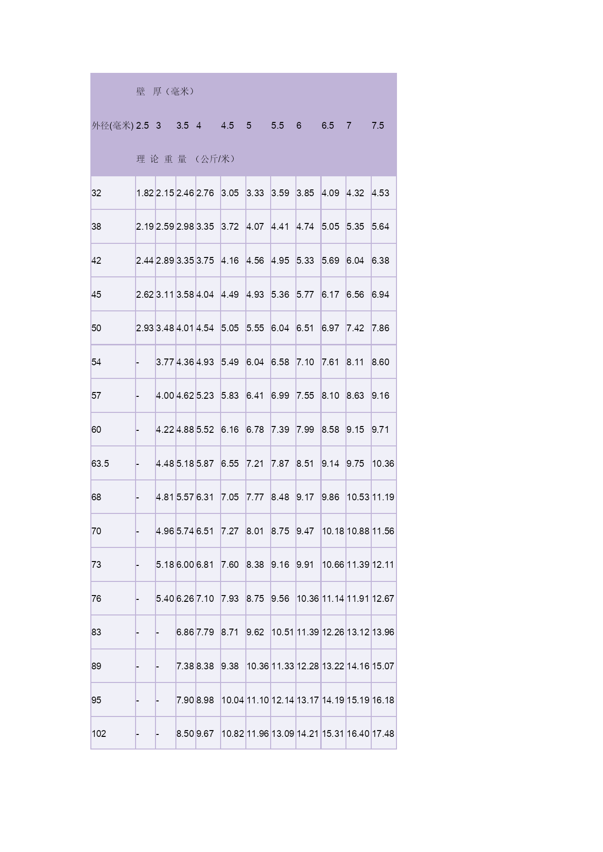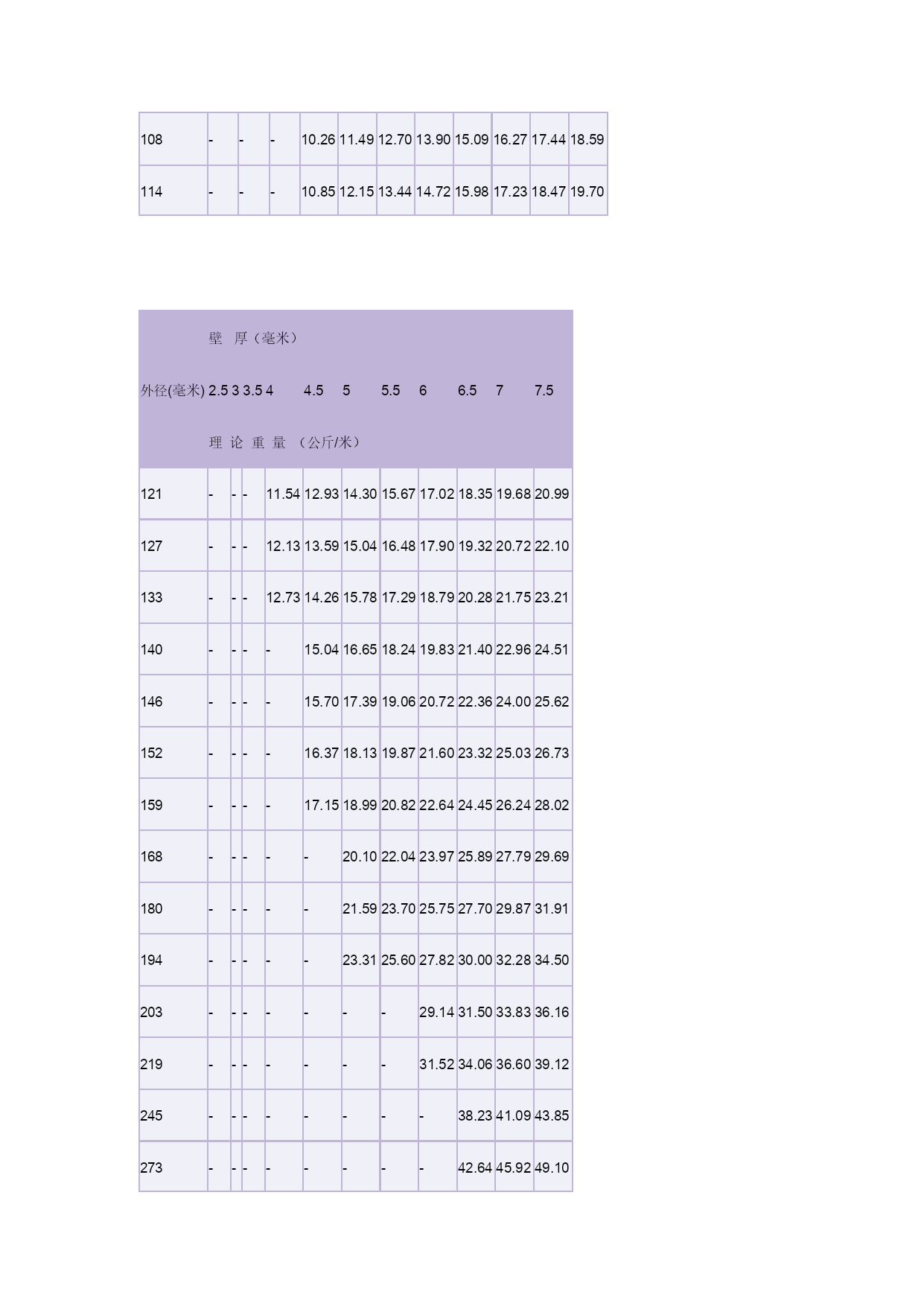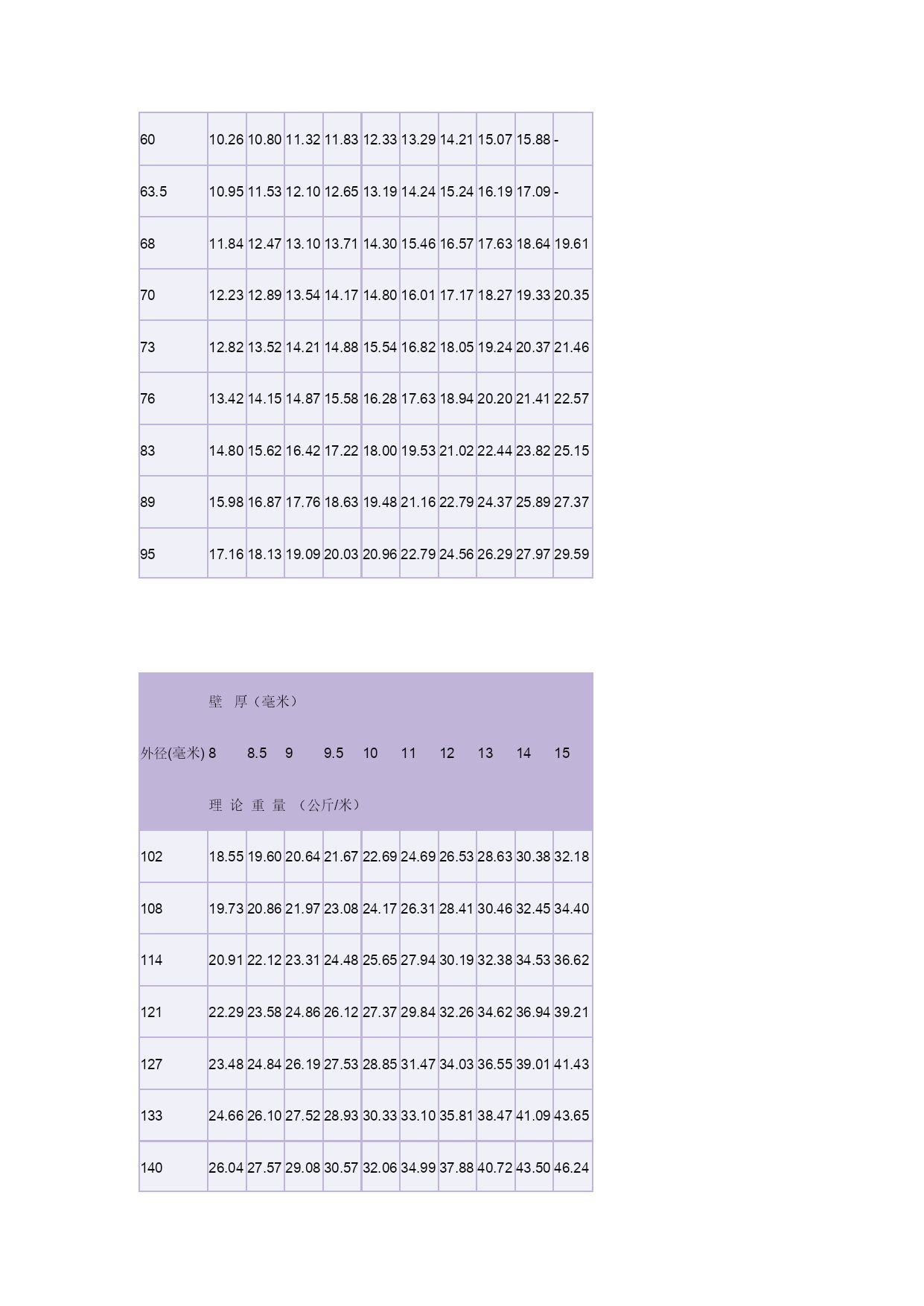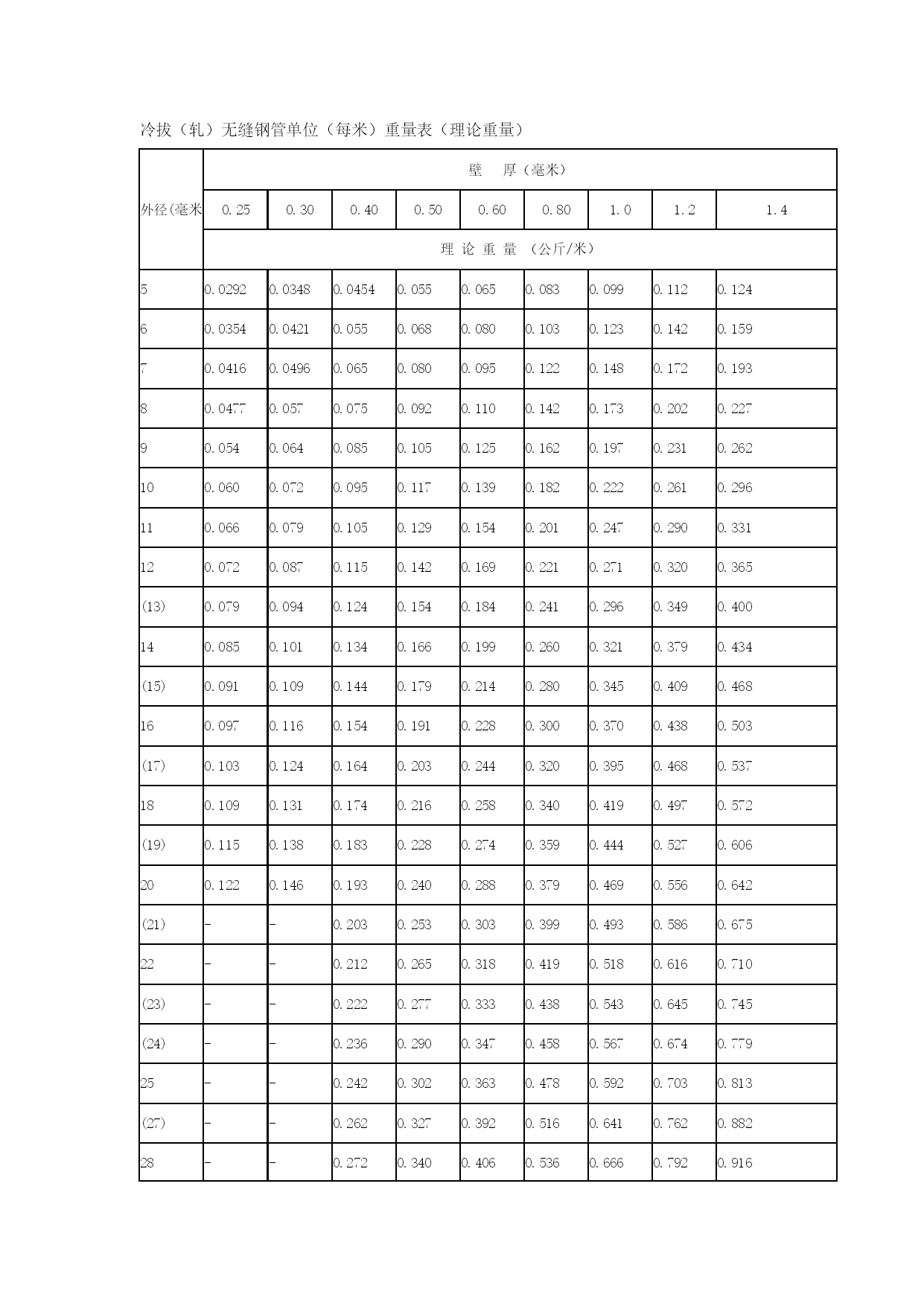 钢管理论重量表3优质资料(可以直接使用,可编辑优质资料,欢迎下载)冷拔(轧)无缝钢管单位(每米)重量表(理论重量)外径(毫米)壁厚(毫米)0.250.300.400.500.600.801.01.21.4理论重量(公斤/米)50.02920.03480.04540.0550.0650.0830.0990.1120.12460.03540.04210.0550.0680.0800.1030.1230.1420.15970.04160.04960.0650.0800.0950.1220.1480.1720.19380.04770.0570.0750.0920.1100.1420.1730.2020.22790.0540.0640.0850.1050.1250.1620.1970.2310.262100.0600.0720.0950.1170.1390.1820.2220.2610.296110.0660.0790.1050.1290.1540.2010.2470.2900.331120.0720.0870.1150.1420.1690.2210.2710.3200.365(13)0.0790.0940.1240.1540.1840.2410.2960.3490.400140.0850.1010.1340.1660.1990.2600.3210.3790.434(15)0.0910.1090.1440.1790.2140.2800.3450.4090.468160.0970.1160.1540.1910.2280.3000.3700.4380.503(17)0.1030.1240.1640.2030.2440.3200.3950.4680.537180.1090.1310.1740.2160.2580.3400.4190.4970.572(19)0.1150.1380.1830.2280.2740.3590.4440.5270.606200.1220.1460.1930.2400.2880.3790.4690.5560.642(21)--0.2030.2530.3030.3990.4930.5860.67522--0.2120.2650.3180.4190.5180.6160.710(23)--0.2220.2770.3330.4380.5430.6450.745(24)--0.2360.2900.3470.4580.5670.6740.77925--0.2420.3020.3630.4780.5920.7030.813(27)--0.2620.3270.3920.5160.6410.7620.88228--0.2720.3400.4060.5360.6660.7920.91629--0.2820.3520.4180.5530.6910.8230.95130--0.2920.3640.4360.5760.7150.8510.98632--0.3110.3890.4660.6150.7650.9101.0534--0.3310.4130.4960.6550.8140.9681.12(35)--0.3410.4260.5100.6750.8380.9981.1636--0.3500.4380.5250.6950.8631.031.1938--0.3700.4640.5550.7340.9121.091.2640--0.3900.4940.5850.7740.9621.151.3342------1.01-1.211.4144.5------1.07-1.281.4845------1.091.301.5148------1.161.381.6150------1.211.441.68(51)------1.231.471.7153------1.281.531.78(54)------1.311.591.8256------1.361.621.89(57)------1.381.651.9260------1.461.742.0263------1.531.832.1365------1.581.892.20(68)------1.651.982.3070------1.702.032.37(73)------1.782.122.4775------1.822.182.54外径(毫米)壁厚(毫米)2.533.544.555.566.577.5理论重量(公斤/米)321.822.152.462.763.053.333.593.854.094.324.53382.192.592.983.353.724.074.414.745.055.355.64422.442.893.353.754.164.564.955.335.696.04