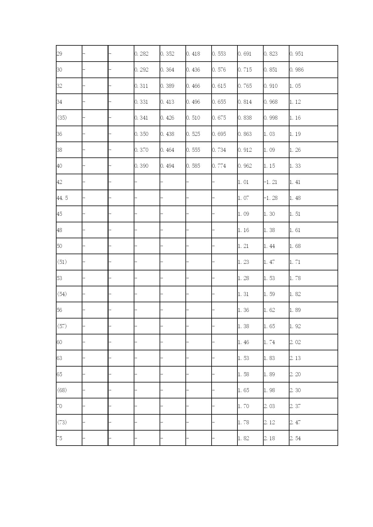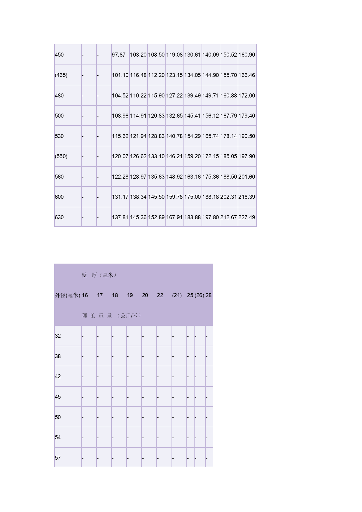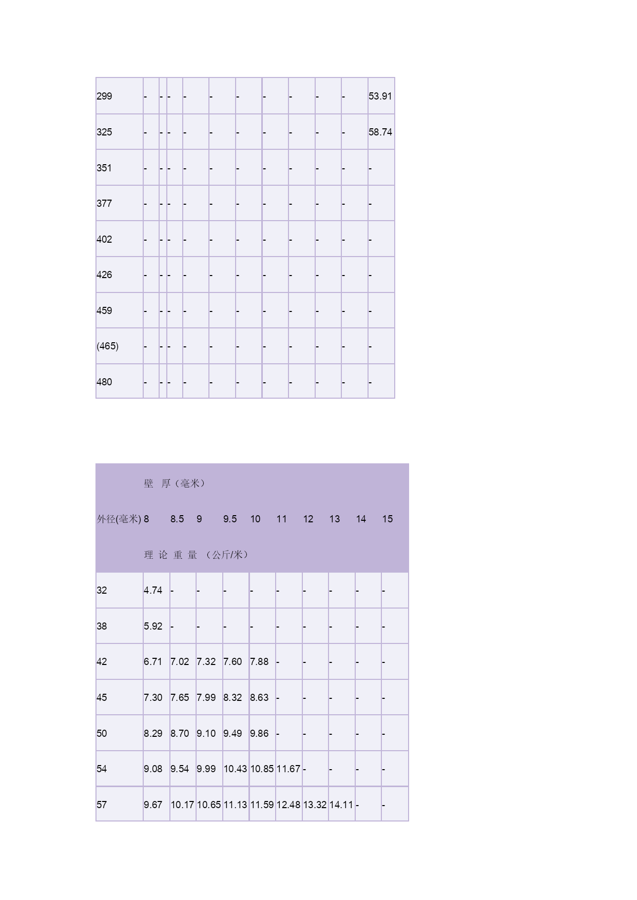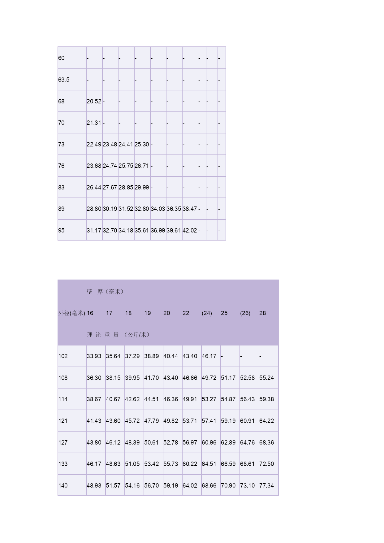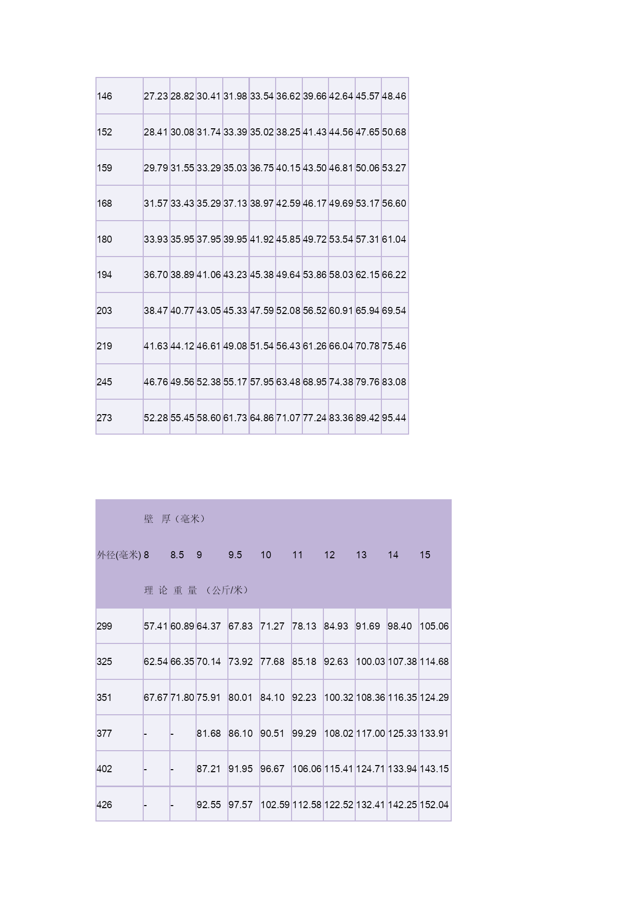 钢管理论重量表3优质资料(可以直接使用,可编辑优质资料,欢迎下载)冷拔(轧)无缝钢管单位(每米)重量表(理论重量)外径(毫米)壁厚(毫米)0.250.300.400.500.600.801.01.21.4理论重量(公斤/米)50.02920.03480.04540.0550.0650.0830.0990.1120.12460.03540.04210.0550.0680.0800.1030.1230.1420.15970.04160.04960.0650.0800.0950.1220.1480.1720.19380.04770.0570.0750.0920.1100.1420.1730.2020.22790.0540.0640.0850.1050.1250.1620.1970.2310.262100.0600.0720.0950.1170.1390.1820.2220.2610.296110.0660.0790.1050.1290.1540.2010.2470.2900.331120.0720.0870.1150.1420.1690.2210.2710.3200.365(13)0.0790.0940.1240.1540.1840.2410.2960.3490.400140.0850.1010.1340.1660.1990.2600.3210.3790.434(15)0.0910.1090.1440.1790.2140.2800.3450.4090.468160.0970.1160.1540.1910.2280.3000.3700.4380.503(17)0.1030.1240.1640.2030.2440.3200.3950.4680.537180.1090.1310.1740.2160.2580.3400.4190.4970.572(19)0.1150.1380.1830.2280.2740.3590.4440.5270.606200.1220.1460.1930.2400.2880.3790.4690.5560.642(21)--0.2030.2530.3030.3990.4930.5860.67522--0.2120.2650.3180.4190.5180.6160.710(23)--0.2220.2770.3330.4380.5430.6450.745(24)--0.2360.2900.3470.4580.5670.6740.77925--0.2420.3020.3630.4780.5920.7030.813(27)--0.2620.3270.3920.5160.6410.7620.88228--0.2720.3400.4060.5360.6660.7920.91629--0.2820.3520.4180.5530.6910.8230.95130--0.2920.3640.4360.5760.7150.8510.98632--0.3110.3890.4660.6150.7650.9101.0534--0.3310.4130.4960.6550.8140.9681.12(35)--0.3410.4260.5100.6750.8380.9981.1636--0.3500.4380.5250.6950.8631.031.1938--0.3700.4640.5550.7340.9121.091.2640--0.3900.4940.5850.7740.9621.151.3342------1.01-1.211.4144.5------1.07-1.281.4845------1.091.301.5148------1.161.381.6150------1.211.441.68(51)------1.231.471.7153------1.281.531.78(54)------1.311.591.8256------1.361.621.89(57)------1.381.651.9260------1.461.742.0263------1.531.832.1365------1.581.892.20(68)------1.651.982.3070------1.702.032.37(73)------1.782.122.4775------1.822.182.54外径(毫米)壁厚(毫米)2.533.544.555.566.577.5理论重量(公斤/米)321.822.152.462.763.053.333.593.854.094.324.53382.192.592.983.353.724.074.414.745.055.355.64422.442.893.353.754.164.564.955.335.696.04