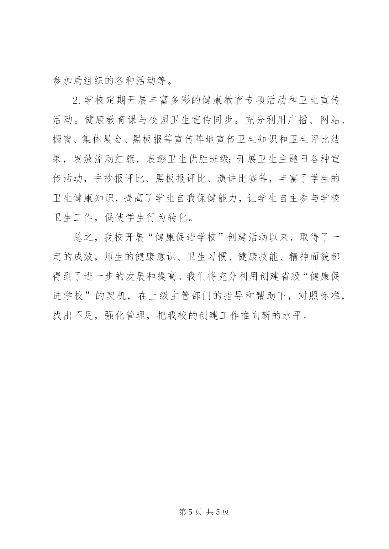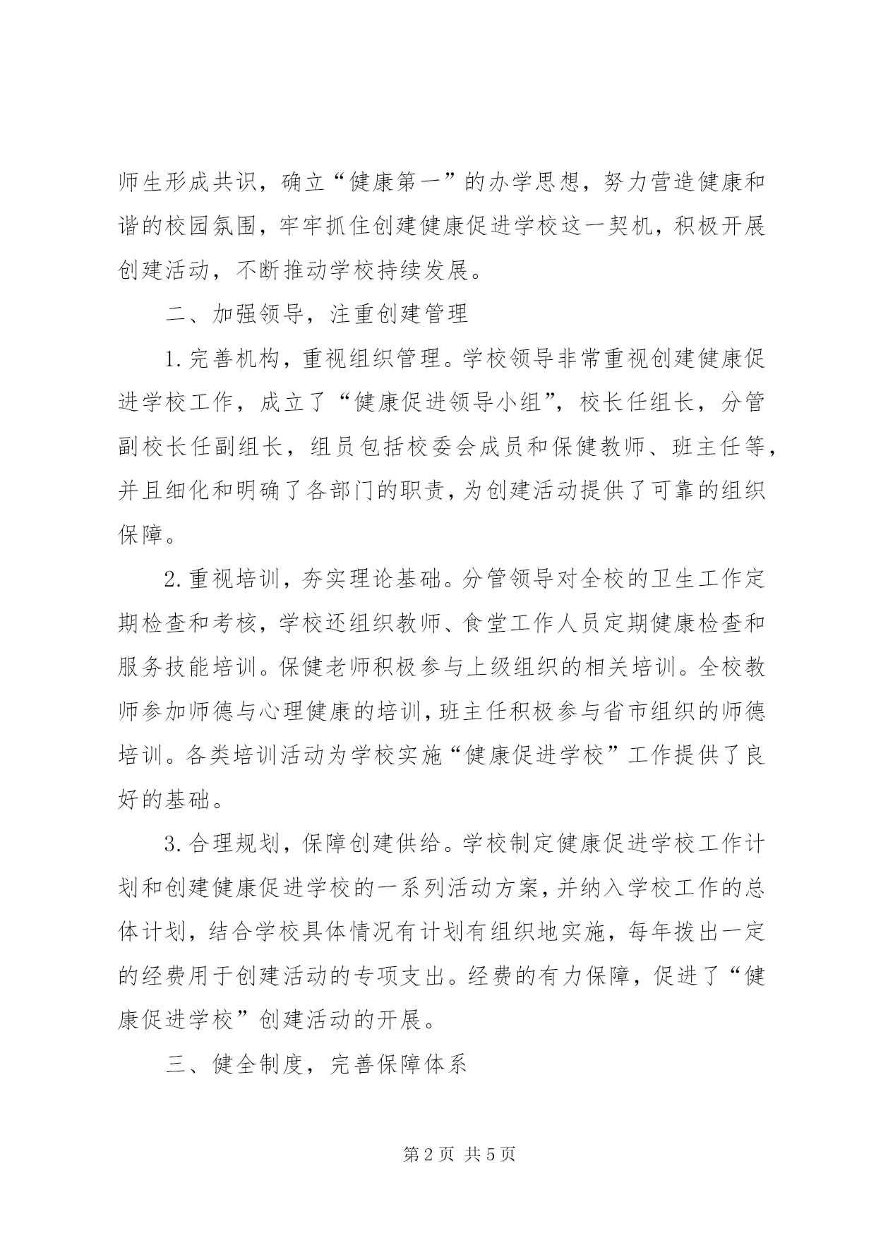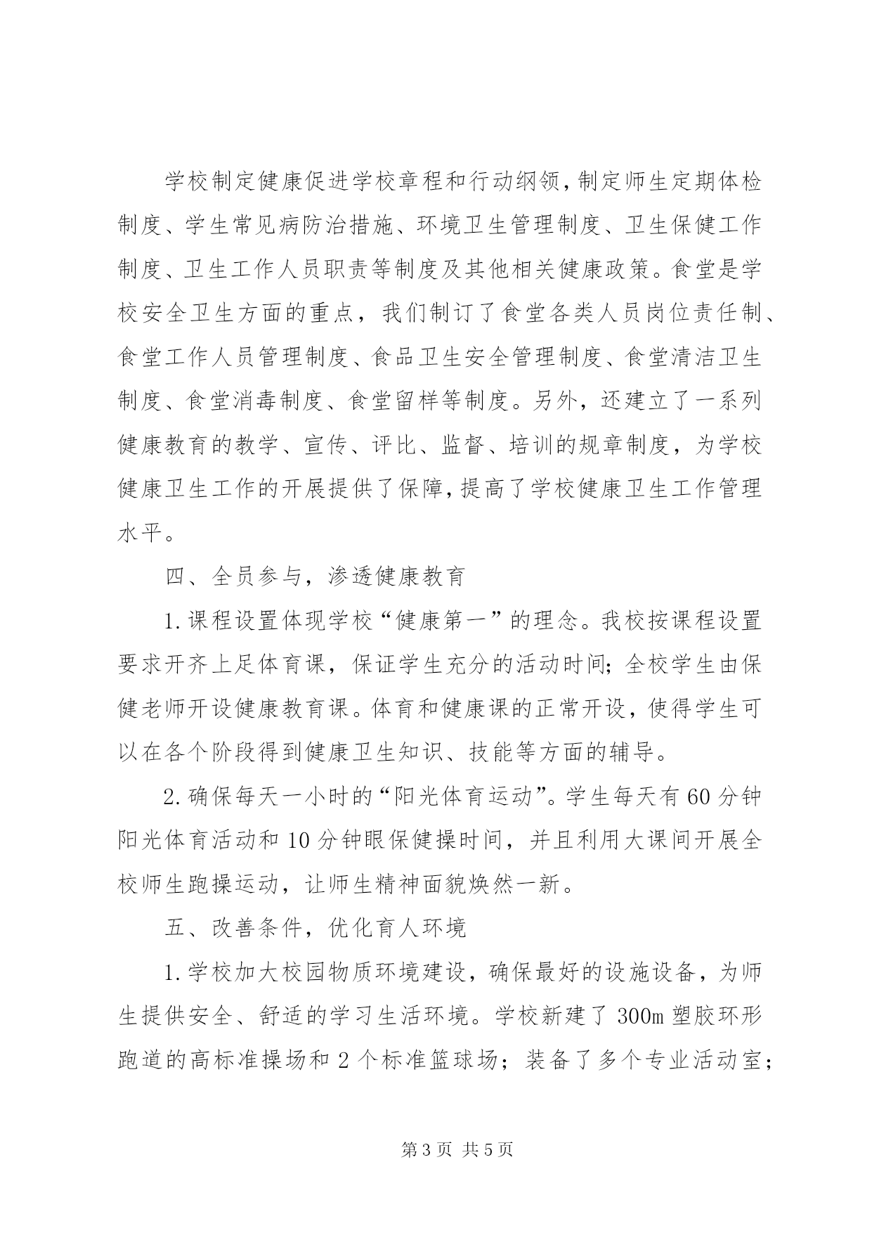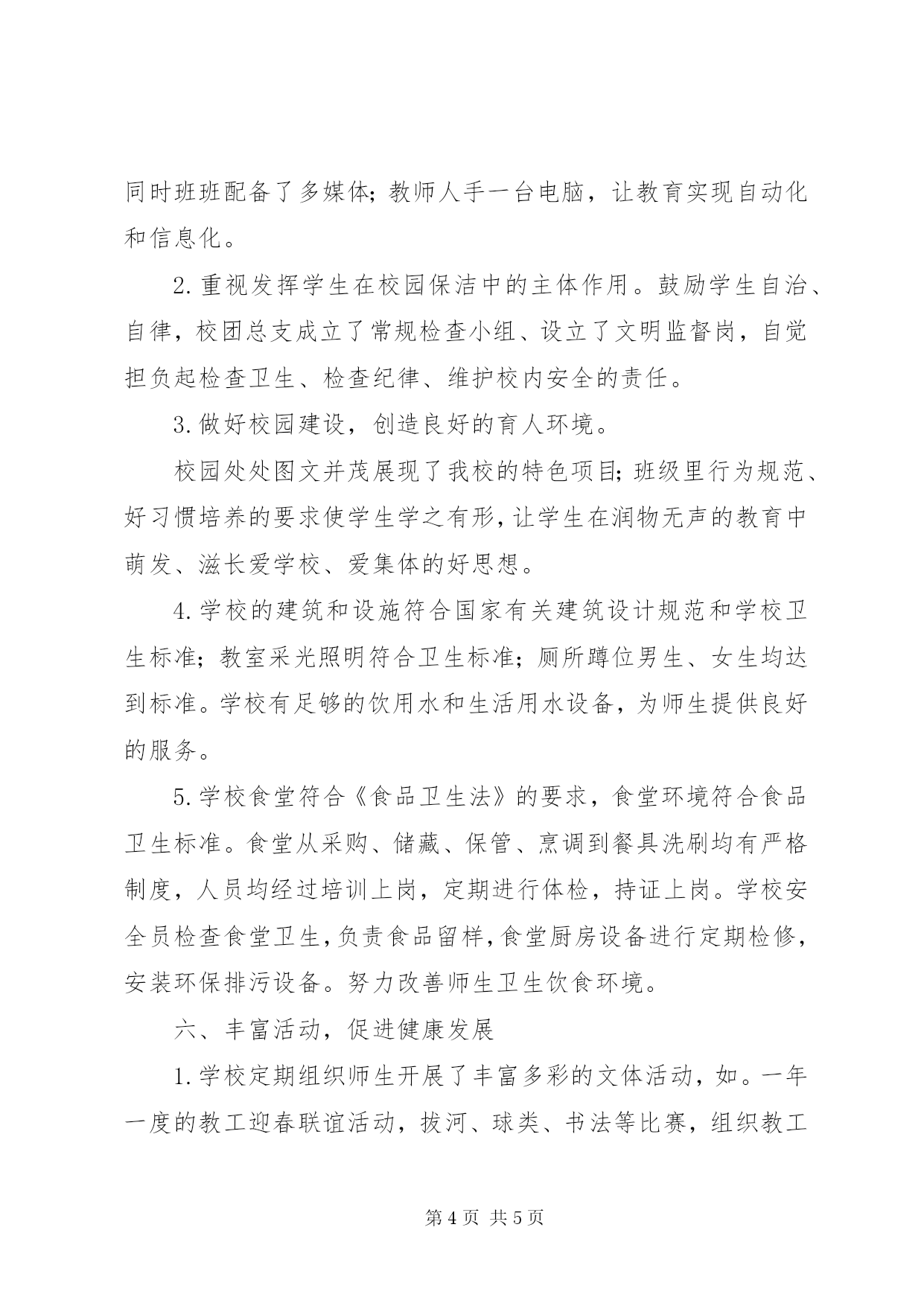 第PAGE\*Arabic\*MERGEFORMAT5页共NUMPAGES\*MERGEFORMAT5页健康促进汇报材料营造和谐氛围促进健康发展——****中学创建“XX省健康促进学校”工作汇报****中学位于****镇淮海路北首。学校始建于1958年,2000年搬迁至此,校园占地45亩,校舍总面积10245平米,学校绿化10000平米。现有16个教学班,695名学生,132名教职工。学校设有理化生实验室、音体美活动室、微机室、图书室、阅览室、多媒体教室、心理卫生保健室等多口专用教室,器材配备齐全。学校先后获得“XX省示范初中”“XX市模范学校”、“XX市依法治校示范校”、“XX县区和谐校园”、“XX县区安全管理工作先进单位”、“XX县区心理健康教育工作先进单位”等荣誉称号。创建省“健康促进学校”是我校追求的又一个目标,全校师生树立起“健康第一”的思想,营造和谐向上的校园环境,积极开展健康促进活动,培养师生良好的卫生习惯和健康行为,有条不紊地开展健康促进学校的创建工作。现将创建工作汇报如下:一、形成共识,树立健康理念自从确立创建“健康促进学校”后,学校秉承“求真求善自律自强”的校训,坚持“校以育人为本师以敬业为乐生以成才为志”的办学理念,始终把培养“健康人”放在学校工作的首位。学校制定计划,利用多种途径宣传创建目标和实施内容,使全校师生形成共识,确立“健康第一”的办学思想,努力营造健康和谐的校园氛围,牢牢抓住创建健康促进学校这一契机,积极开展创建活动,不断推动学校持续发展。二、加强领导,注重创建管理1.完善机构,重视组织管理。学校领导非常重视创建健康促进学校工作,成立了“健康促进领导小组”,校长任组长,分管副校长任副组长,组员包括校委会成员和保健教师、班主任等,并且细化和明确了各部门的职责,为创建活动提供了可靠的组织保障。2.重视培训,夯实理论基础。分管领导对全校的卫生工作定期检查和考核,学校还组织教师、食堂工作人员定期健康检查和服务技能培训。保健老师积极参与上级组织的相关培训。全校教师参加师德与心理健康的培训,班主任积极参与省市组织的师德培训。各类培训活动为学校实施“健康促进学校”工作提供了良好的基础。3.合理规划,保障创建供给。学校制定健康促进学校工作计划和创建健康促进学校的一系列活动方案,并纳入学校工作的总体计划,结合学校具体情况有计划有组织地实施,每年拨出一定的经费用于创建活动的专项支出。经费的有力保障,促进了“健康促进学校”创建活动的开展。三、健全制度,完善保障体系学校制定健康促进学校章程和行动纲领,制定师生定期体检制度、学生常见病防治措施、环境卫生管理制度、卫生保健工作制度、卫生工作人员职责等制度及其他相关健康政策。食堂是学校安全卫生方面的重点,我们制订了食堂各类人员岗位责任制、食堂工作人员管理制度、食品卫生安全管理制度、食堂清洁卫生制度、食堂消毒制度、食堂留样等制度。另外,还建立了一系列健康教育的教学、宣传、评比、监督、培训的规章制度,为学校健康卫生工作的开展提供了保障,提高了学校健康卫生工作管理水平。四、全员参与,渗透健康教育1.课程设置体现学校“健康第一”的理念。我校按课程设置要求开齐上足体育课,保证学生充分的活动时间;全校学生由保健老师开设健康教育课。体育和健康课的正常开设,使得学生可以在各个阶段得到健康卫生知识、技能等方面的辅导。2.确保每天一小时的“阳光体育运动”。学生每天有60分钟阳光体育活动和10分钟眼保健操时间,并且利用大课间开展全校师生跑操运动,让师生精神面貌焕然一新。五、改善条件,优化育人环境1.学校加大校园物质环境建设,确保最好的设施设备,为师生提供安全、舒适的学习生活环境。学校新建了300m塑胶环形跑道的高标准操场和2个标准篮球场;装备了多个专业活动室;同时班班配备了多媒体;教师人手一台电脑,让教育实现自动化和信息化。2.重视发挥学生在校园保洁中的主体作用。鼓励学生自治、自律,校团总支成立了常规检查小组、设立了文明监督岗,自觉担负起检查卫生、检查纪律、维护校内安全的责任。3.做好校园建设,创造良好的育人环境。校园处处图文并茂展现了我校的特色项目;班级里行为规范、好习惯培养的要求使学生学之有形,让学生在润物无声的教育中萌发、滋长爱学校、爱集体的好思想。4.学校的建筑和设施符合国家有关建筑设计规范和学校卫生标准;教室采光照明符合卫生标准;厕所蹲位男生、女生均达到标准。学校有足够的饮用水和生活用水设备,为师生提供良好的服务。5.学校食堂符合《食品卫生法》的要求,食堂环境符合食品卫生标准。食堂从采购、储藏、保管、烹调到餐具洗刷均有严格制度,人员均经过培训上岗,定期进行体检,持证上岗。学校安全员检查食堂卫生,负责食品留样,食堂厨房设备进行定期检修,安装环保排污设备。努力改善