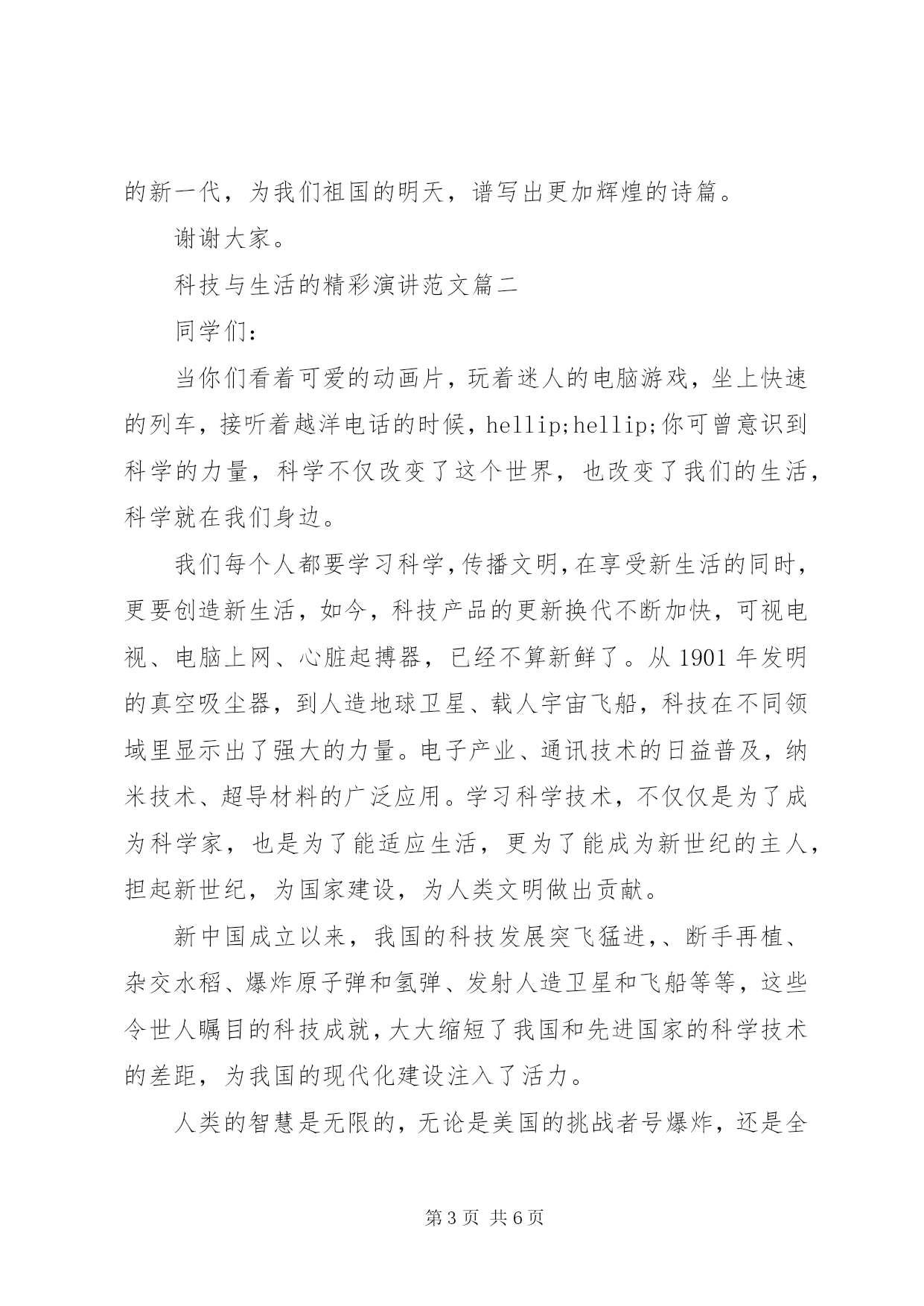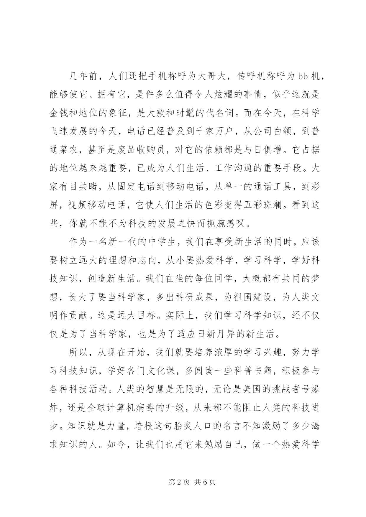 第PAGE\*Arabic\*MERGEFORMAT6页共NUMPAGES\*MERGEFORMAT6页科技与生活的精彩演讲范文科技与生活的精彩演讲范文篇一尊敬的老师、亲爱的同学们:谈到科技,人们首先可能会自然而然地联系到人造地球卫星、载人宇宙飞船、原子弹等这些似乎离我们遥不可及的事物上,她往往给人以高高在上的感觉,实际上,科学技术的日新月异,使得科学不只为尖端技术服务,也越来越多地渗透到我们的日常生活之中。科技与生活是早已是密不可分的,科技无处不在。暑假里,我随团参加了小记者北京采风夏令营活动。在远离父母的几天里,老师要求我们每天向家长通报活动情况。入住到北京的酒店,由于人地两生,又不能随便活动,找公用电话便成了极为困难的事情,临行之前准备的ic电话卡也经常失去用武之地。这时就会特别地羡慕那些有手机的团友,也更深切地感受到手机带给人们的方便。在中国科技馆里,我们看到了在电视和老电影中才能看到的老式的手摇电话,也了解到更久以前,在没有电话的年代,人们用原始的方式联系是多么地不便。每当看到电影中地下党员冒着生命危险接头送情报、战斗中失去联络信号等镜头,都会不由自主地联想到,当时如果有了手机,不就避免这些无谓的牺牲了吗。每每这时,我就会更强烈地意识到科学的力量,科学不仅改变了整个世界,也改变了我们的生活,科学就在我们身边。几年前,人们还把手机称呼为大哥大,传呼机称呼为bb机,能够使它、拥有它,是件多么值得令人炫耀的事情,似乎这就是金钱和地位的象征,是大款和时髦的代名词。而在今天,在科学飞速发展的今天,电话已经普及到千家万户,从公司白领,到普通菜农,甚至是废品收购员,对它的依赖都是与日俱增。它占据的地位越来越重要,已成为人们生活、工作沟通的重要手段。大家有目共睹,从固定电话到移动电话,从单一的通话工具,到彩屏,视频移动电话,它使人们生活的色彩变得五彩斑斓。看到这些,你就不能不为科技的发展之快而扼腕感叹。作为一名新一代的中学生,我们在享受新生活的同时,应该要树立远大的理想和志向,从小要热爱科学,学习科学,学好科技知识,创造新生活。我们在坐的每位同学,大概都有共同的梦想,长大了要当科学家,多出科研成果,为祖国建设,为人类文明作贡献。这是远大目标。实际上,我们学习科学知识,还不仅仅是为了当科学家,也是为了适应日新月异的新生活。所以,从现在开始,我们就要培养浓厚的学习兴趣,努力学习科技知识,学好各门文化课,多阅读一些科普书籍,积极参与各种科技活动。人类的智慧是无限的,无论是美国的挑战者号爆炸,还是全球计算机病毒的升级,从来都不能阻止人类的科技进步。知识就是力量,培根这句脍炙人口的名言不知激励了多少渴求知识的人。如今,让我们也用它来勉励自己,做一个热爱科学的新一代,为我们祖国的明天,谱写出更加辉煌的诗篇。谢谢大家。科技与生活的精彩演讲范文篇二同学们:当你们看着可爱的动画片,玩着迷人的电脑游戏,坐上快速的列车,接听着越洋电话的时候,hellip;hellip;你可曾意识到科学的力量,科学不仅改变了这个世界,也改变了我们的生活,科学就在我们身边。我们每个人都要学习科学,传播文明,在享受新生活的同时,更要创造新生活,如今,科技产品的更新换代不断加快,可视电视、电脑上网、心脏起搏器,已经不算新鲜了。从1901年发明的真空吸尘器,到人造地球卫星、载人宇宙飞船,科技在不同领域里显示出了强大的力量。电子产业、通讯技术的日益普及,纳米技术、超导材料的广泛应用。学习科学技术,不仅仅是为了成为科学家,也是为了能适应生活,更为了能成为新世纪的主人,担起新世纪,为国家建设,为人类文明做出贡献。新中国成立以来,我国的科技发展突飞猛进,、断手再植、杂交水稻、爆炸原子弹和氢弹、发射人造卫星和飞船等等,这些令世人瞩目的科技成就,大大缩短了我国和先进国家的科学技术的差距,为我国的现代化建设注入了活力。人类的智慧是无限的,无论是美国的挑战者号爆炸,还是全球计算机病毒的升级,从来都不能阻止人类的科技进步。知识就是力量,培根这句脍炙人口的格言不知激励了多少渴求知识的人。如今,让我们也用它来勉励自己,做一个热爱科学的新一代,担起新世纪的重任,为我们祖国的明天,谱写出更加辉煌的诗篇。科技与生活的精彩演讲范文篇三尊敬的各位领导、老师,亲爱的同学们:你们好,今天我演讲的题目是《科技让人类文明之花倾情绽放》。众所周知,科技是第一生产力。创新是一个民族进步的灵魂。人类得益于科技,科技得益于创新,创新是科技的灵魂。从基因工程让人活到一千岁的梦想,到纳米技术包你穿衣不用洗的诺言;从人工智能送你一只可爱机器狗的温馨,到转基因技术让老鼠长出人耳朵的奇观。新科技令人感到日新月异、欣喜若狂。不仅如此,科普知识也成了我们关注的焦点,爱因斯坦、霍金、比尔盖茨是我们心目中的明星,计算机
