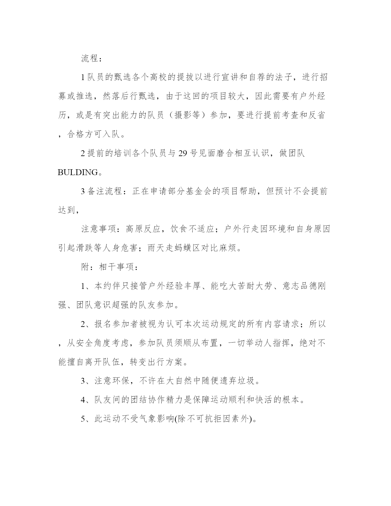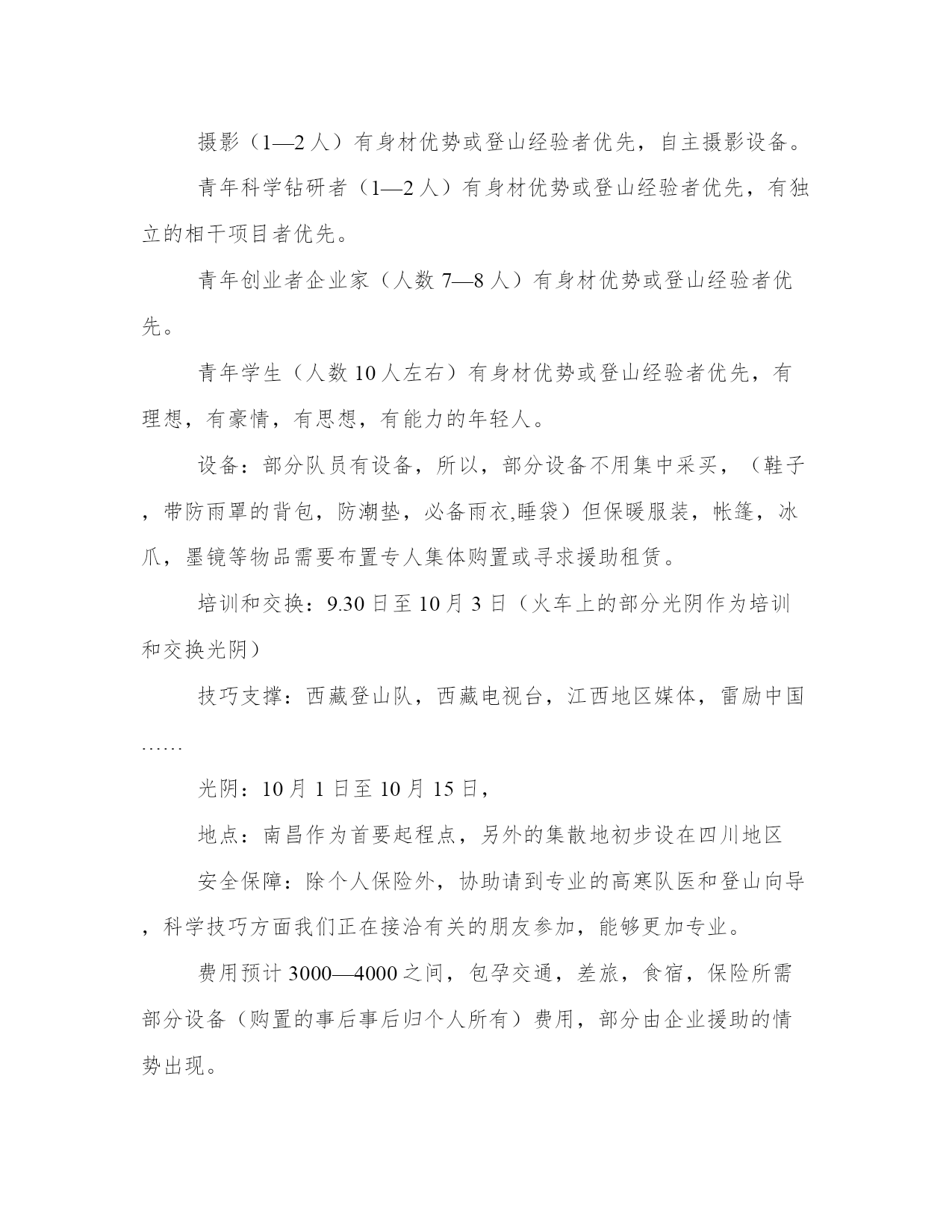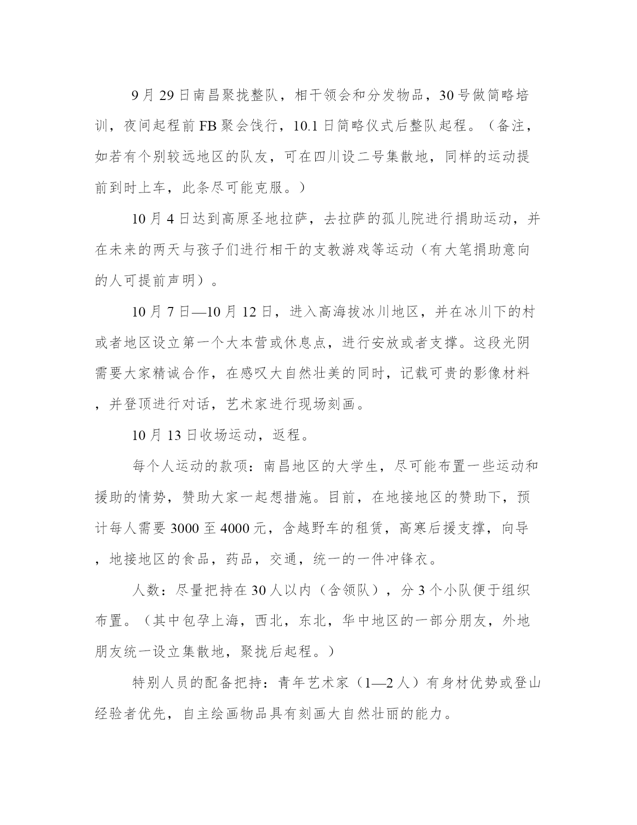 西藏公益运动策划书冰川是一条以冰块组成的庞大河流,又称为冰河。在长年冰封的高山或两极地区,多年的积雪在重力作用下挤压成冰块,沿斜坡向下滑形成冰川。两极地区的冰川又名大陆冰川,笼罩领域较广,是冰河时代遗留下来的。冰川是地球上最大的淡水资源,也是地球上继海洋以后最大的天然水库。七大洲都有冰川。中国的母亲河长江和黄河就是发源于冰川的河流。2010年,我们看到了越来越多的自然灾难,天气变暖、继续干旱……一天天人们在看到现在冰川随着天气的变暖正在消散,岛屿和低地地面正在蒙受灭顶之灾,现在的自然灾难大家已经看到了,其实这就是我们自身造成的,如果冰川消释,海平面上升,那雪山不在的时候,就会继续干旱地面失去滋润,容易洪涝,低海拔地区的华东地区这种处所,就不会存在了。青年人,是社会的未来,优异的年轻人,更是我们这个国家的脊梁,对我们所处的社会和环境需要更高的认知,更深的意识,更首要的责任,只有具有对自然对社会的大爱,才干去关爱更多身边的人。为了呼吁人民“低碳”生活,减缓全球冰川的消融速度,鼓励和培植年轻人对于环保的意识和责任,THEONE好青年公益组织和江西省南昌市慈善义工协会及多家媒体企业,发起一项名为“环保—能力—与责任对话2010”的公益环保运动,将组建一支由青年科学钻研者、青年创业者企业家、青年记者、青年志愿者、青年大学生,青年艺术家参与的队伍,对西藏地区的的要冰川进行科学记载(首要是影像记载),并寻衅自己,在海拔6000左右的地区进行徒步穿越的运动,最终在冰川雪峰之巅进行一个各种优异青年之间的对话,关于“环保—能力—与责任”并进行影像记载。在返程之后,将进行各种鼓吹,呼吁和唤醒更多的人关爱我们的母亲河及其源头和身边的环保。江西,地处长江中下游地区,湿地和水系发达,海拔较低,因此对水资源和环境的依附更加首要。因此,我们以江西为主导,与全国其他地区的优异年轻人(企业家,艺术家,科研人员等)作为一支独立的队伍参加。首要的地区:长江源头的西藏地区的雪山冰川合作机构:江西南昌慈善义工协会……(援助企业)我们去那里首要有以下几项任务:1通过自身的感受,将高原的情况带回来鼓吹环保2拍摄和记载科学笔记和数据,有可能与其它地区的学者和科学家进行交换3赞助一些孤儿院的的孩子,进行捐助,(提前筹办1到15岁孩子的衣物,鞋裤等)并做一些社区运动。4寻衅自己,团队励练,结下深厚的友谊,领会自己在这个自然中身处的地位和责任,途中,我们要登上海拔6000米的雪山进行对话.预计运动光阴15天9月29日南昌聚拢整队,相干领会和分发物品,30号做简略培训,夜间起程前FB聚会饯行,10.1日简略仪式后整队起程。(备注,如若有个别较远地区的队友,可在四川设二号集散地,同样的运动提前到时上车,此条尽可能克服。)10月4日达到高原圣地拉萨,去拉萨的孤儿院进行捐助运动,并在未来的两天与孩子们进行相干的支教游戏等运动(有大笔捐助意向的人可提前声明)。10月7日—10月12日,进入高海拔冰川地区,并在冰川下的村或者地区设立第一个大本营或休息点,进行安放或者支撑。这段光阴需要大家精诚合作,在感叹大自然壮美的同时,记载可贵的影像材料,并登顶进行对话,艺术家进行现场刻画。10月13日收场运动,返程。每个人运动的款项:南昌地区的大学生,尽可能布置一些运动和援助的情势,赞助大家一起想措施。目前,在地接地区的赞助下,预计每人需要3000至4000元,含越野车的租赁,高寒后援支撑,向导,地接地区的食品,药品,交通,统一的一件冲锋衣。人数:尽量把持在30人以内(含领队),分3个小队便于组织布置。(其中包孕上海,西北,东北,华中地区的一部分朋友,外地朋友统一设立集散地,聚拢后起程。)特别人员的配备把持:青年艺术家(1—2人)有身材优势或登山经验者优先,自主绘画物品具有刻画大自然壮丽的能力。摄影(1—2人)有身材优势或登山经验者优先,自主摄影设备。青年科学钻研者(1—2人)有身材优势或登山经验者优先,有独立的相干项目者优先。青年创业者企业家(人数7—8人)有身材优势或登山经验者优先。青年学生(人数10人左右)有身材优势或登山经验者优先,有理想,有豪情,有思想,有能力的年轻人。设备:部分队员有设备,所以,部分设备不用集中采买,(鞋子,带防雨罩的背包,防潮垫,必备雨衣,睡袋)但保暖服装,帐篷,冰爪,墨镜等物品需要布置专人集体购置或寻求援助租赁。培训和交换:9.30日至10月3日(火车上的部分光阴作为培训和交换光阴)技巧支撑:西藏登山队,西藏电视台,江西地区媒体,雷励中国……光阴:10月1日至10月15日,地点:南昌作为首要起程点,另外的集散地初步设在四川地区安全保障:除个人保险外,协助请到专业的高寒队医和登山向导,科学技巧方面我们正在接洽有关的朋