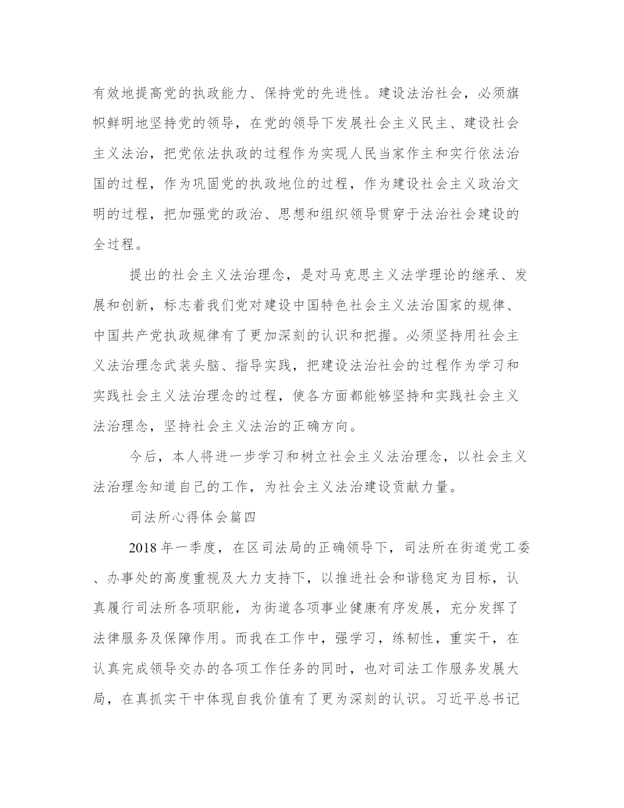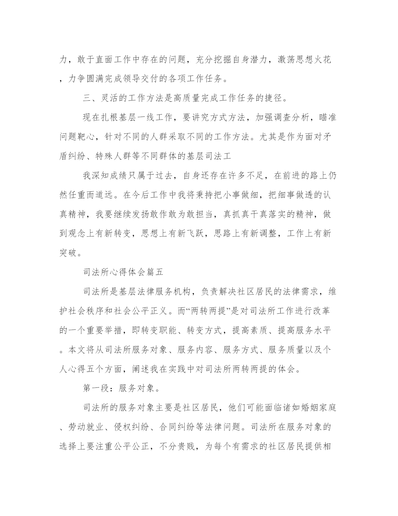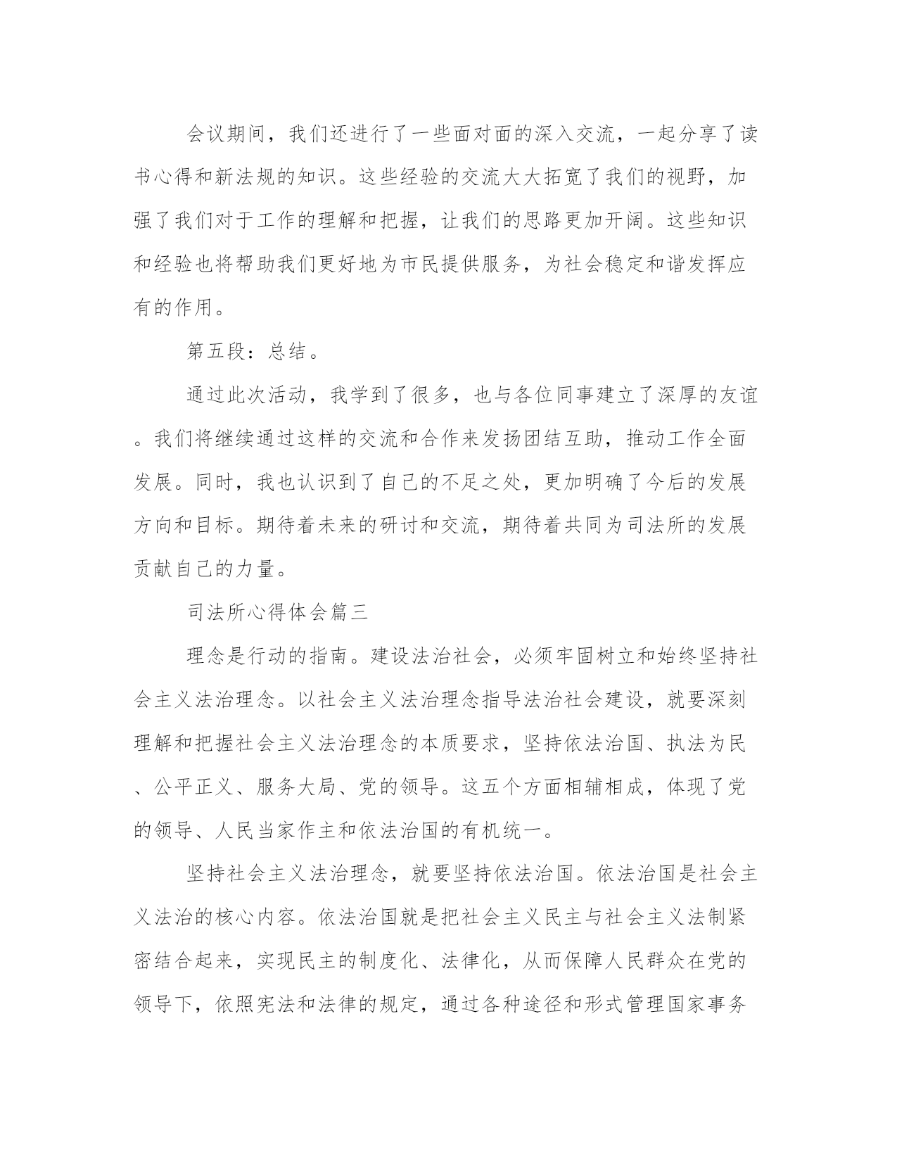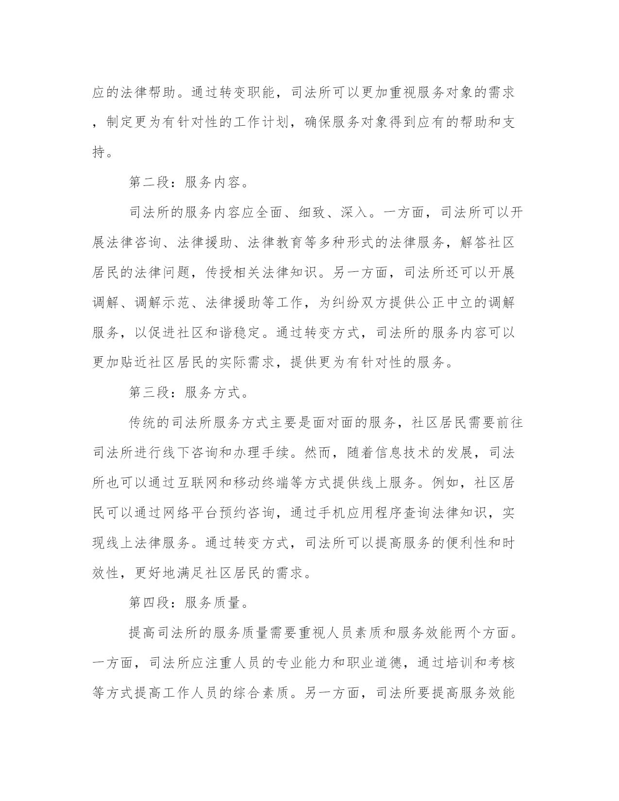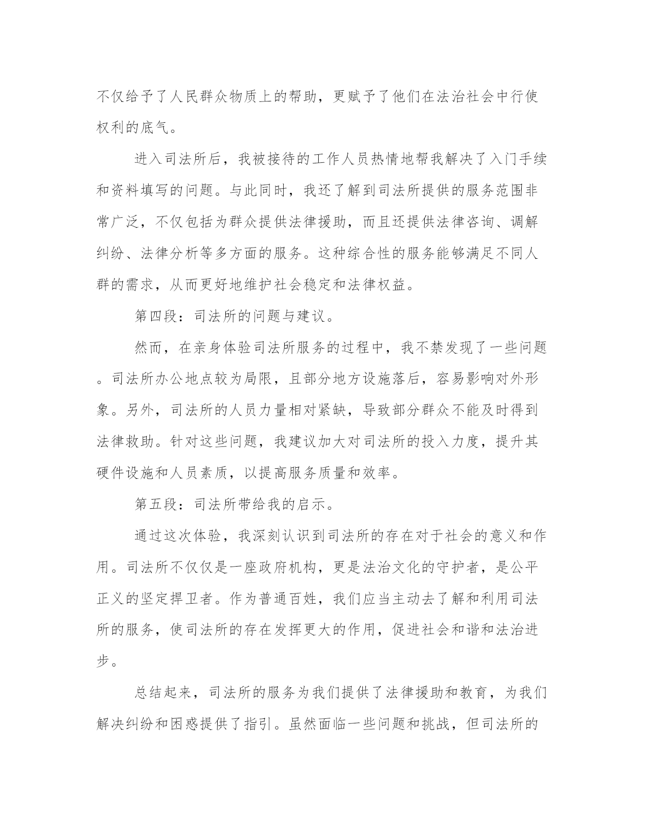 最新司法所心得体会(模板10篇)我们在一些事情上受到启发后,应该马上记录下来,写一篇心得体会,这样我们可以养成良好的总结方法。心得体会是我们对于所经历的事件、经验和教训的总结和反思。下面我帮大家找寻并整理了一些优秀的心得体会范文,我们一起来了解一下吧。司法所心得体会篇一司法所是人民群众走向公平正义的门户。作为基层法律服务机构,司法所承担着调解纠纷、传达法律政策、维护社会稳定等重要职责。近期,我亲身体验了司法所的服务,深有感触。下面将就这次体验,对司法所的工作进行反思和总结。第一段:初次接触司法所。这次接触司法所,是因为我深陷一起家庭纠纷无法自拔。面对眼前的困境,我不得不难过地承认,家庭纠纷仅仅依靠亲友劝说是无法解决的。于是,我踏上了司法所的门槛,希望能够得到专业的法律援助和指导。第二段:司法所的服务意义。在司法所的大门前,我看到了许多人们。他们中既有和我一样,在矛盾纠纷中无助的普通百姓,也有办案人员和律师。我被这种平等和融洽的氛围所打动,深感司法所承担的责任之重。司法所的存在,不仅给予了人民群众物质上的帮助,更赋予了他们在法治社会中行使权利的底气。进入司法所后,我被接待的工作人员热情地帮我解决了入门手续和资料填写的问题。与此同时,我还了解到司法所提供的服务范围非常广泛,不仅包括为群众提供法律援助,而且还提供法律咨询、调解纠纷、法律分析等多方面的服务。这种综合性的服务能够满足不同人群的需求,从而更好地维护社会稳定和法律权益。第四段:司法所的问题与建议。然而,在亲身体验司法所服务的过程中,我不禁发现了一些问题。司法所办公地点较为局限,且部分地方设施落后,容易影响对外形象。另外,司法所的人员力量相对紧缺,导致部分群众不能及时得到法律救助。针对这些问题,我建议加大对司法所的投入力度,提升其硬件设施和人员素质,以提高服务质量和效率。第五段:司法所带给我的启示。通过这次体验,我深刻认识到司法所的存在对于社会的意义和作用。司法所不仅仅是一座政府机构,更是法治文化的守护者,是公平正义的坚定捍卫者。作为普通百姓,我们应当主动去了解和利用司法所的服务,使司法所的存在发挥更大的作用,促进社会和谐和法治进步。总结起来,司法所的服务为我们提供了法律援助和教育,为我们解决纠纷和困惑提供了指引。虽然面临一些问题和挑战,但司法所的未来是光明的。只有加大对司法所的支持和投入,完善其机制和功能,才能更好地保障人民群众的合法权益,让司法所成为支撑社会稳定和发展的重要力量。司法所心得体会篇二近日,某市司法所举行了一次“司法所两会学会”的活动,以便加强司法所内部的交流和合作,同时进一步提高工作质量。我很幸运地参加了这次活动,并从中获得了很多收获。第二段:学习内容。活动开始后,我们首先听取了来自上级部门的贯彻精神,强化规范管理,提高服务质量的指示。随后,各组别进行了自我介绍,展示了过去一年间所取得的成绩,并分享了工作中遇到的疑问和难题。此次交流会让我感受到了团结和协作的重要性,同时也意识到了自身在工作方面的不足之处。第三段:深化交流。此次会议还设置了专题论坛和分组研讨,为大家提供了一个探讨问题、交流见解的平台。我们进行了深入而系统的案例分析和讨论,以更好地评估司法所的业务水平和服务质量。我们还发现不同组别在工作中有着各自的优势和缺点,需要互相学习,共同进步。这些交流和研讨产生的有益信息和想法,对今后的工作具有极大的指导作用。第四段:加强学习。会议期间,我们还进行了一些面对面的深入交流,一起分享了读书心得和新法规的知识。这些经验的交流大大拓宽了我们的视野,加强了我们对于工作的理解和把握,让我们的思路更加开阔。这些知识和经验也将帮助我们更好地为市民提供服务,为社会稳定和谐发挥应有的作用。第五段:总结。通过此次活动,我学到了很多,也与各位同事建立了深厚的友谊。我们将继续通过这样的交流和合作来发扬团结互助,推动工作全面发展。同时,我也认识到了自己的不足之处,更加明确了今后的发展方向和目标。期待着未来的研讨和交流,期待着共同为司法所的发展贡献自己的力量。司法所心得体会篇三理念是行动的指南。建设法治社会,必须牢固树立和始终坚持社会主义法治理念。以社会主义法治理念指导法治社会建设,就要深刻理解和把握社会主义法治理念的本质要求,坚持依法治国、执法为民、公平正义、服务大局、党的领导。这五个方面相辅相成,体现了党的领导、人民当家作主和依法治国的有机统一。坚持社会主义法治理念,就要坚持依法治国。依法治国是社会主义法治的核心内容。依法治国就是把社会主义民主与社会主义法制紧密结合起来,实现民主的制度化、法律化,从而保障人民群众在党的领导下,依照宪法和法律的规定,通过各种途径和形式管理国家事务,管理经济文化事业,管理社会事务,保证国家各项工作都