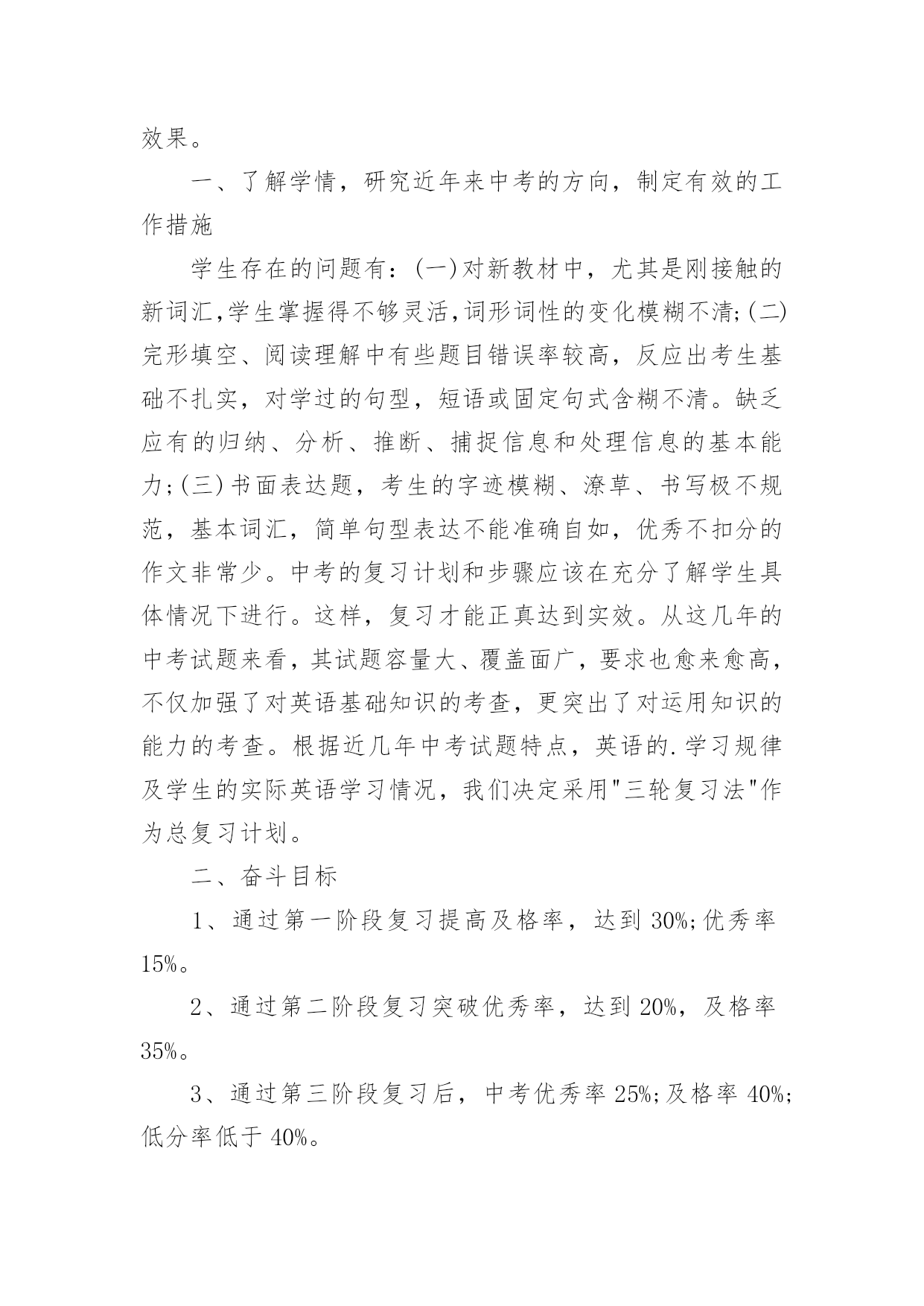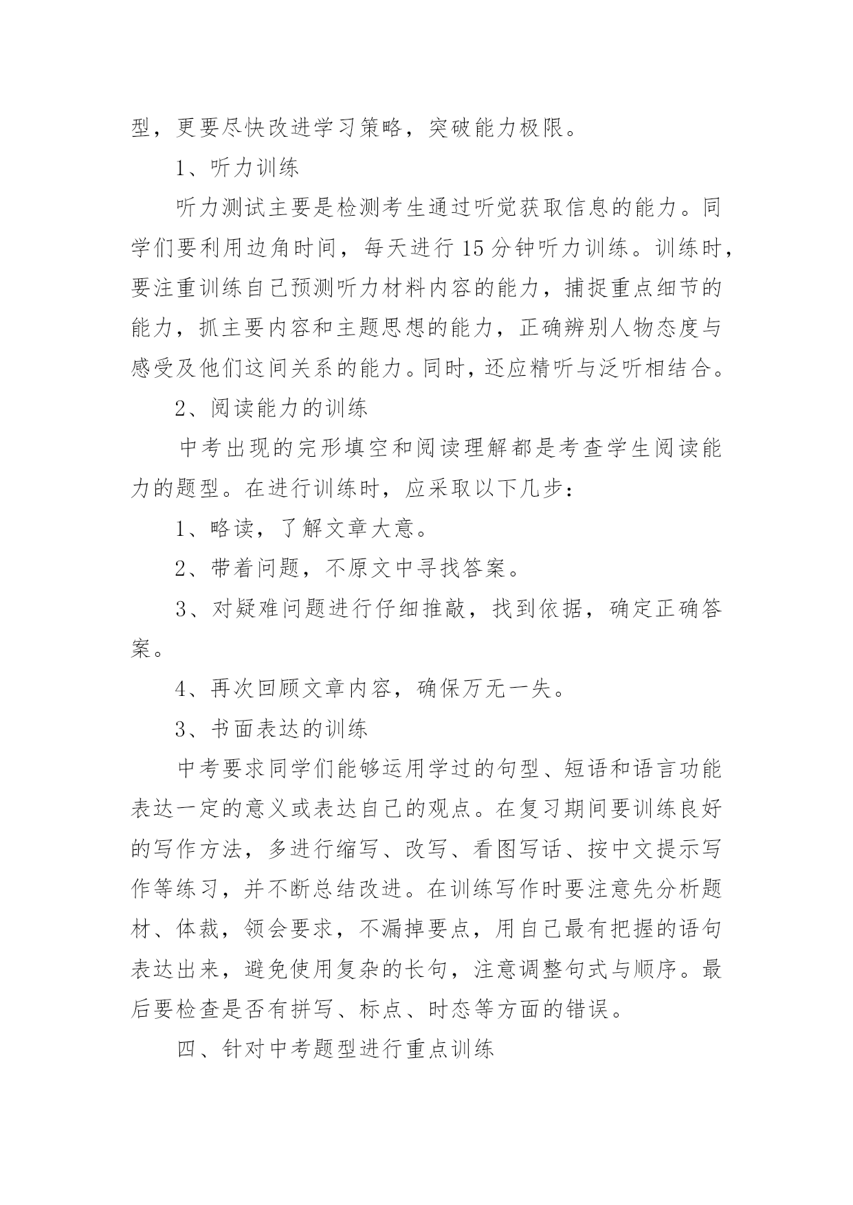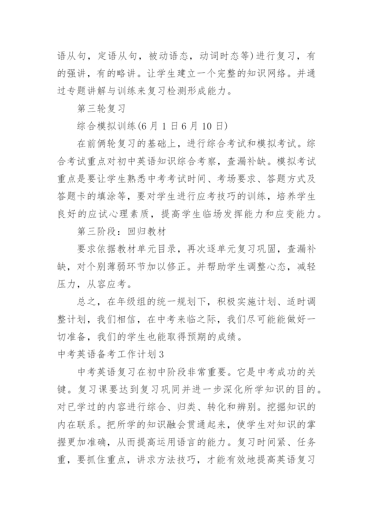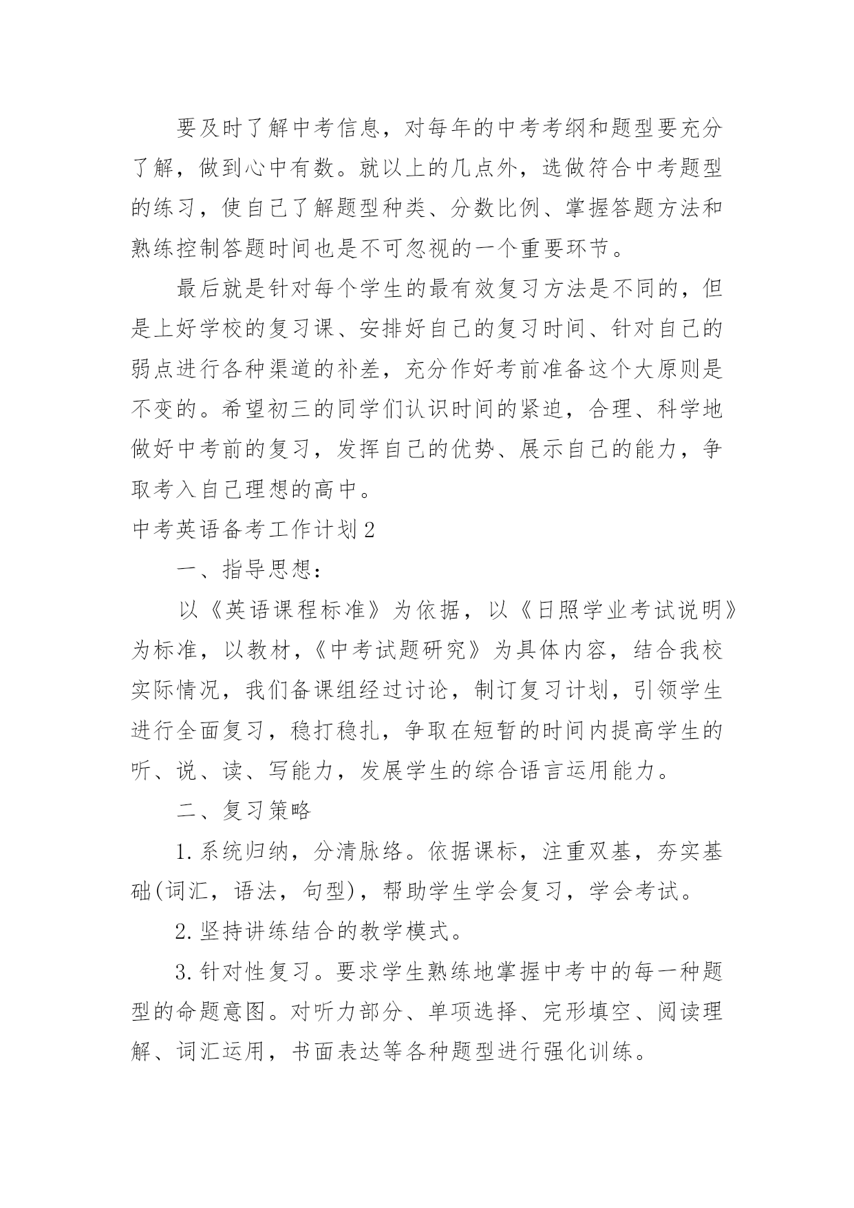 中考英语备考工作计划中考英语备考工作计划光阴迅速,一眨眼就过去了,我们的工作又进入新的阶段,为了今后更好的工作发展,不妨坐下来好好写写计划吧。可是到底什么样的计划才是适合自己的呢?以下是小编整理的中考英语备考工作计划,欢迎大家借鉴与参考,希望对大家有所帮助。中考英语备考工作计划1一、制定和调整复习计划同学们要合理制定并及时调整复习计划,不仅有月计划,周计划,还应有每天的学习计划。大到每本书的复习计划,小到每单元、每一课的学习计划都应有很好的安排。初中三年级需要掌握的单词约1500个,词组200—300个,有用句型近100个。如果没有计划性,很难在短暂的时间之内复习周全。同时,制定复习计划应充分考虑老师的教学进度,最好与老师的复习计划同步进行,或者可以稍微提前一点,使自己的复习计划与老师的复习指导紧密联系起来,能很好地帮助你提高复习效率,抓住知识的重点和难点,切不可完全偏离老师的复习进度。二、强化基础知识的训练对于基础知识的复习要采用梳理知识结构、构建知识框架的办法,使基础知识的复习建立在知识之间相互联系的基础之上。1、吃透课本,抓住要点每天坚持按计划复习课本知识,勤记单词、词组、句型和要点。对于固定词组和习惯用语要背诵并能够默写。词组也可以归纳复习,例如跟动词take有关的短语有:takecareof,take……to…。。,take(it)away,taketurns,takeanactivepartin,takeplace等。2、加强语法归纳与练习语法知识是遣词造句的纲目,通过掌握语法知识可以正确理解和运用句子,而通过句子的复习又可以加深对语法的复习。有了正确的语法知识,才能写出合乎语法的表达方式。尤其是八种时态,两种语态,应结合具体的句子,采取归纳总结、对比的办法,达到举一反三的效果。3、重视情景交际英语的运用,培养跨国文化意识新课程指导下捉考英语试卷强调突出语境,注重交际,在中考试卷中体现交际英语的地方很多,考查的题型有:听力、选择填空、阅读理解及写作。所以复习英语时要注重语言的功能,培养自己的'跨国文化意识。三、针对弱项进行重点训练通过对试卷中错误的分析,同学们要及时发现自己在哪种题型上失分较多,在中考前应集中力量把自己的弱项补上来。如加强词汇的拼写、积累好的语句为写作做准备等等。只有这样,才能更快地提高自己的成绩。对于考查能力的题型,更要尽快改进学习策略,突破能力极限。1、听力训练听力测试主要是检测考生通过听觉获取信息的能力。同学们要利用边角时间,每天进行15分钟听力训练。训练时,要注重训练自己预测听力材料内容的能力,捕捉重点细节的能力,抓主要内容和主题思想的能力,正确辨别人物态度与感受及他们这间关系的能力。同时,还应精听与泛听相结合。2、阅读能力的训练中考出现的完形填空和阅读理解都是考查学生阅读能力的题型。在进行训练时,应采取以下几步:1、略读,了解文章大意。2、带着问题,不原文中寻找答案。3、对疑难问题进行仔细推敲,找到依据,确定正确答案。4、再次回顾文章内容,确保万无一失。3、书面表达的训练中考要求同学们能够运用学过的句型、短语和语言功能表达一定的意义或表达自己的观点。在复习期间要训练良好的写作方法,多进行缩写、改写、看图写话、按中文提示写作等练习,并不断总结改进。在训练写作时要注意先分析题材、体裁,领会要求,不漏掉要点,用自己最有把握的语句表达出来,避免使用复杂的长句,注意调整句式与顺序。最后要检查是否有拼写、标点、时态等方面的错误。四、针对中考题型进行重点训练要及时了解中考信息,对每年的中考考纲和题型要充分了解,做到心中有数。就以上的几点外,选做符合中考题型的练习,使自己了解题型种类、分数比例、掌握答题方法和熟练控制答题时间也是不可忽视的一个重要环节。最后就是针对每个学生的最有效复习方法是不同的,但是上好学校的复习课、安排好自己的复习时间、针对自己的弱点进行各种渠道的补差,充分作好考前准备这个大原则是不变的。希望初三的同学们认识时间的紧迫,合理、科学地做好中考前的复习,发挥自己的优势、展示自己的能力,争取考入自己理想的高中。中考英语备考工作计划2一、指导思想:以《英语课程标准》为依据,以《日照学业考试说明》为标准,以教材,《中考试题研究》为具体内容,结合我校实际情况,我们备课组经过讨论,制订复习计划,引领学生进行全面复习,稳打稳扎,争取在短暂的时间内提高学生的听、说、读、写能力,发展学生的综合语言运用能力。二、复习策略1.系统归纳,分清脉络。依据课标,注重双基,夯实基础(词汇,语法,句型),帮助学生学会复习,学会考试。2.坚持讲练结合的教学模式。3.针对性复习。要求学生熟练地掌握中考中的每一种题型的命题意图。对听力部分、单项选择、完形填空、阅读理解、词汇运用,书面表达等各种题型进行强化训练。三、情况分