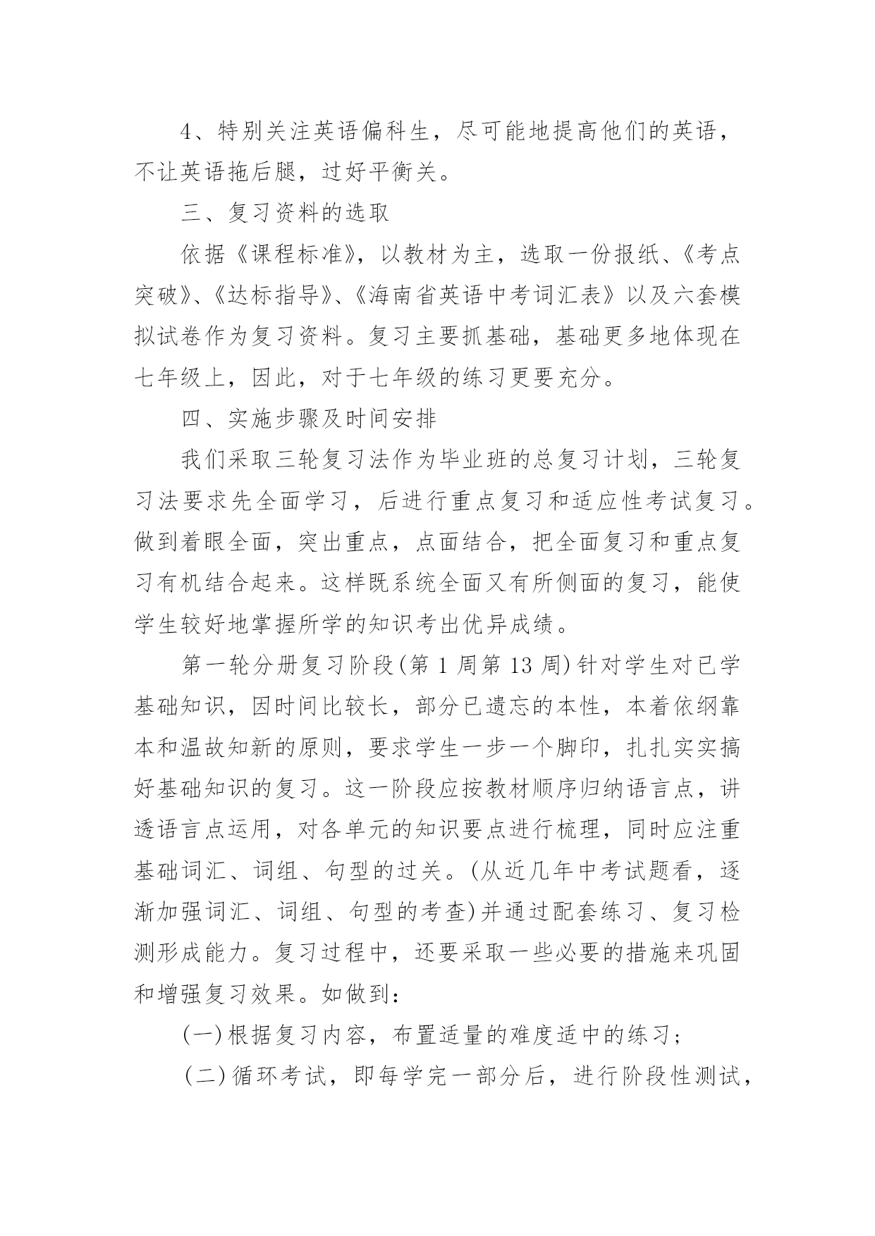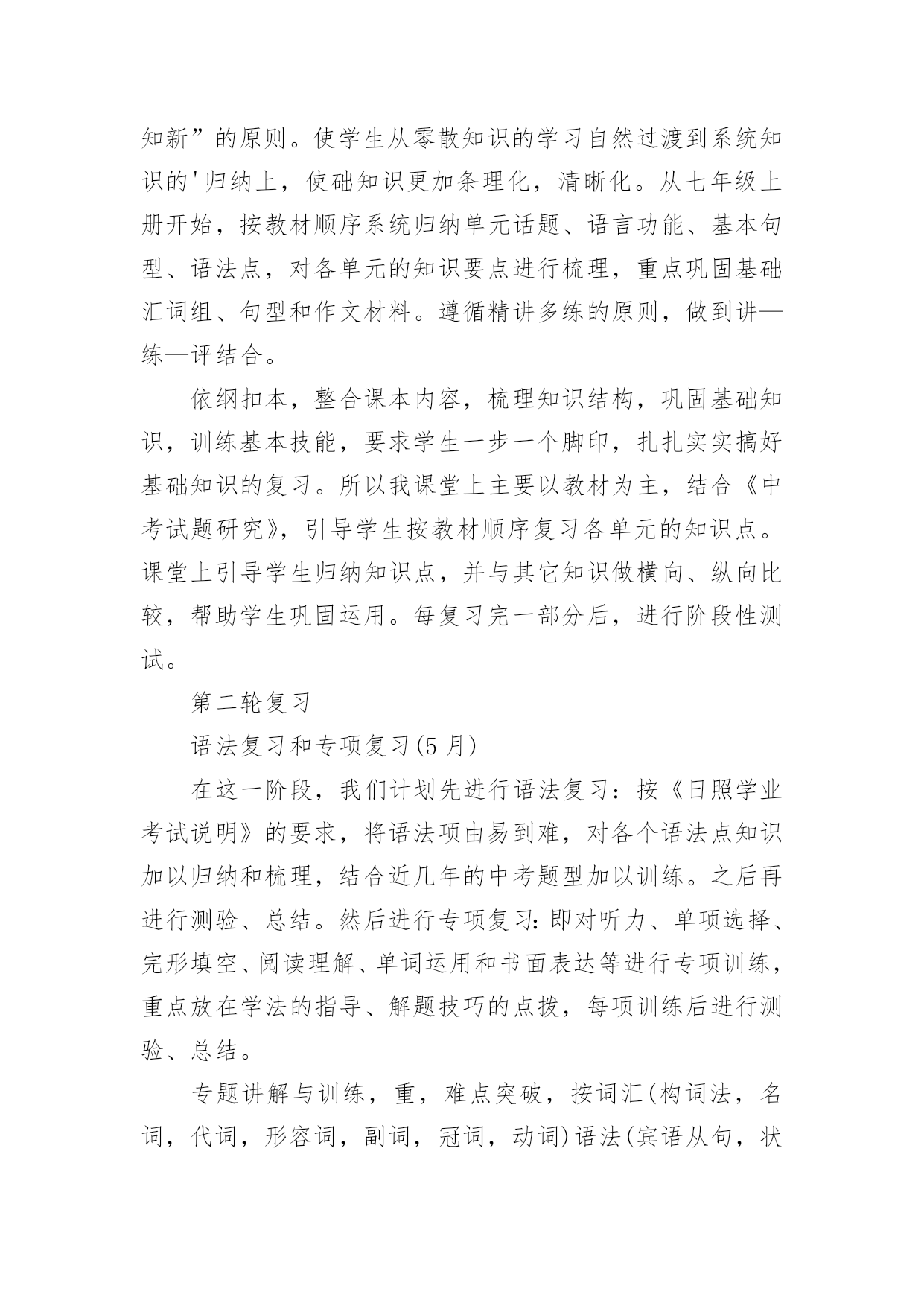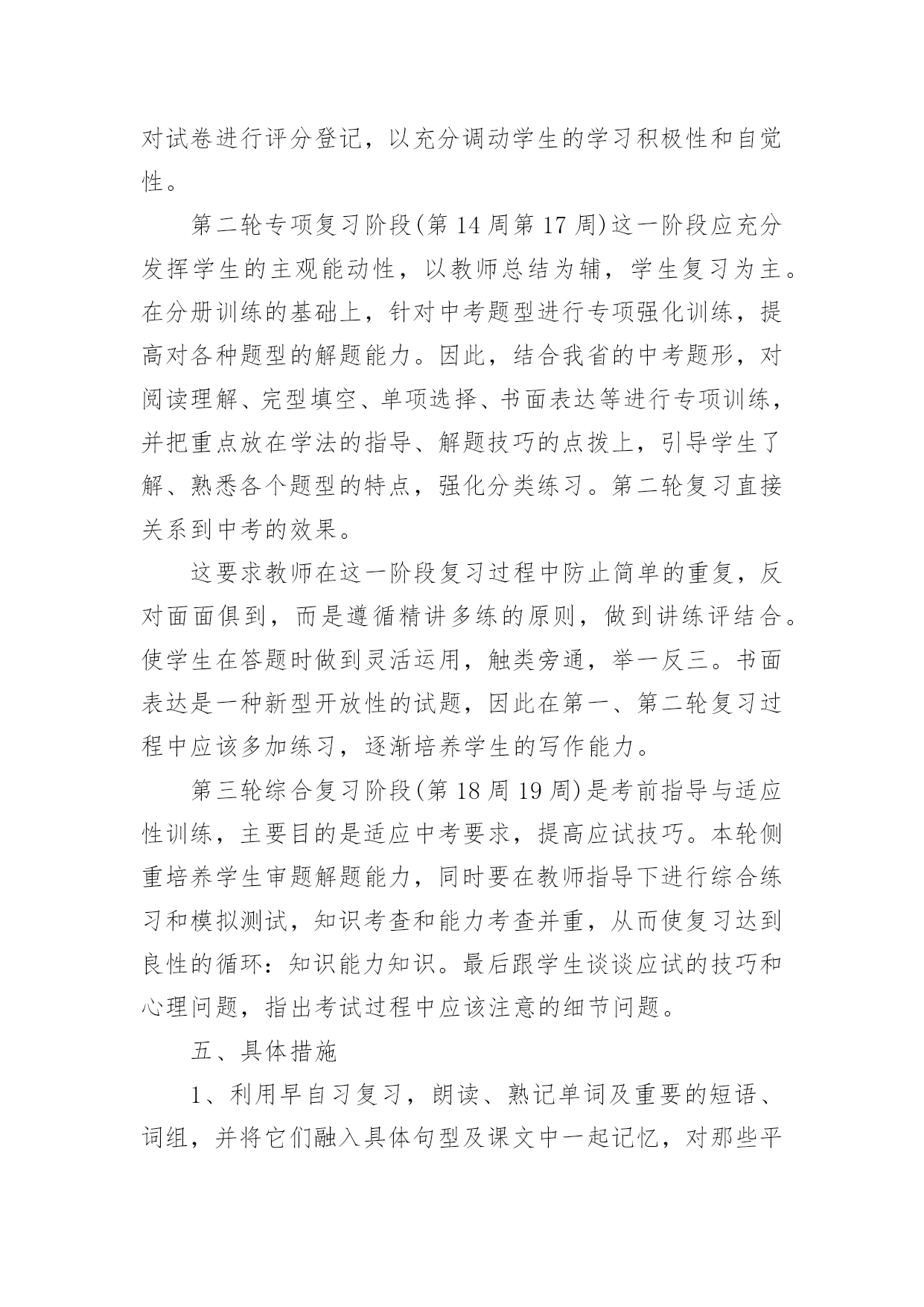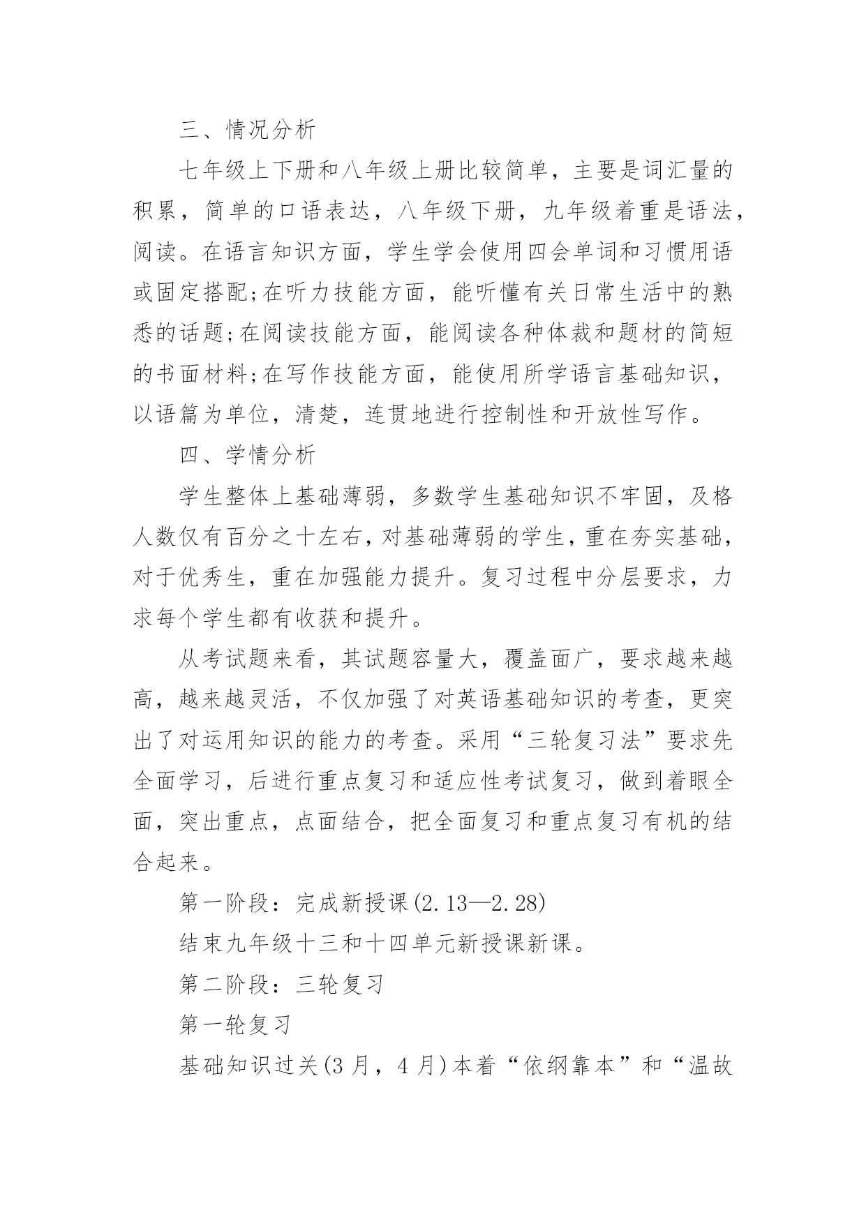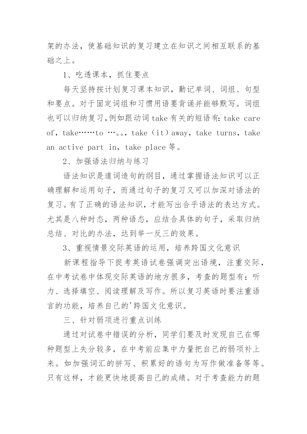 中考英语备考工作计划中考英语备考工作计划光阴迅速,一眨眼就过去了,我们的工作又进入新的阶段,为了今后更好的工作发展,不妨坐下来好好写写计划吧。可是到底什么样的计划才是适合自己的呢?以下是小编整理的中考英语备考工作计划,欢迎大家借鉴与参考,希望对大家有所帮助。中考英语备考工作计划1一、制定和调整复习计划同学们要合理制定并及时调整复习计划,不仅有月计划,周计划,还应有每天的学习计划。大到每本书的复习计划,小到每单元、每一课的学习计划都应有很好的安排。初中三年级需要掌握的单词约1500个,词组200—300个,有用句型近100个。如果没有计划性,很难在短暂的时间之内复习周全。同时,制定复习计划应充分考虑老师的教学进度,最好与老师的复习计划同步进行,或者可以稍微提前一点,使自己的复习计划与老师的复习指导紧密联系起来,能很好地帮助你提高复习效率,抓住知识的重点和难点,切不可完全偏离老师的复习进度。二、强化基础知识的训练对于基础知识的复习要采用梳理知识结构、构建知识框架的办法,使基础知识的复习建立在知识之间相互联系的基础之上。1、吃透课本,抓住要点每天坚持按计划复习课本知识,勤记单词、词组、句型和要点。对于固定词组和习惯用语要背诵并能够默写。词组也可以归纳复习,例如跟动词take有关的短语有:takecareof,take……to…。。,take(it)away,taketurns,takeanactivepartin,takeplace等。2、加强语法归纳与练习语法知识是遣词造句的纲目,通过掌握语法知识可以正确理解和运用句子,而通过句子的复习又可以加深对语法的复习。有了正确的语法知识,才能写出合乎语法的表达方式。尤其是八种时态,两种语态,应结合具体的句子,采取归纳总结、对比的办法,达到举一反三的效果。3、重视情景交际英语的运用,培养跨国文化意识新课程指导下捉考英语试卷强调突出语境,注重交际,在中考试卷中体现交际英语的地方很多,考查的题型有:听力、选择填空、阅读理解及写作。所以复习英语时要注重语言的功能,培养自己的'跨国文化意识。三、针对弱项进行重点训练通过对试卷中错误的分析,同学们要及时发现自己在哪种题型上失分较多,在中考前应集中力量把自己的弱项补上来。如加强词汇的拼写、积累好的语句为写作做准备等等。只有这样,才能更快地提高自己的成绩。对于考查能力的题型,更要尽快改进学习策略,突破能力极限。1、听力训练听力测试主要是检测考生通过听觉获取信息的能力。同学们要利用边角时间,每天进行15分钟听力训练。训练时,要注重训练自己预测听力材料内容的能力,捕捉重点细节的能力,抓主要内容和主题思想的能力,正确辨别人物态度与感受及他们这间关系的能力。同时,还应精听与泛听相结合。2、阅读能力的训练中考出现的完形填空和阅读理解都是考查学生阅读能力的题型。在进行训练时,应采取以下几步:1、略读,了解文章大意。2、带着问题,不原文中寻找答案。3、对疑难问题进行仔细推敲,找到依据,确定正确答案。4、再次回顾文章内容,确保万无一失。3、书面表达的训练中考要求同学们能够运用学过的句型、短语和语言功能表达一定的意义或表达自己的观点。在复习期间要训练良好的写作方法,多进行缩写、改写、看图写话、按中文提示写作等练习,并不断总结改进。在训练写作时要注意先分析题材、体裁,领会要求,不漏掉要点,用自己最有把握的语句表达出来,避免使用复杂的长句,注意调整句式与顺序。最后要检查是否有拼写、标点、时态等方面的错误。四、针对中考题型进行重点训练要及时了解中考信息,对每年的中考考纲和题型要充分了解,做到心中有数。就以上的几点外,选做符合中考题型的练习,使自己了解题型种类、分数比例、掌握答题方法和熟练控制答题时间也是不可忽视的一个重要环节。最后就是针对每个学生的最有效复习方法是不同的,但是上好学校的复习课、安排好自己的复习时间、针对自己的弱点进行各种渠道的补差,充分作好考前准备这个大原则是不变的。希望初三的同学们认识时间的紧迫,合理、科学地做好中考前的复习,发挥自己的优势、展示自己的能力,争取考入自己理想的高中。中考英语备考工作计划2一、指导思想:以《英语课程标准》为依据,以《日照学业考试说明》为标准,以教材,《中考试题研究》为具体内容,结合我校实际情况,我们备课组经过讨论,制订复习计划,引领学生进行全面复习,稳打稳扎,争取在短暂的时间内提高学生的听、说、读、写能力,发展学生的综合语言运用能力。二、复习策略1.系统归纳,分清脉络。依据课标,注重双基,夯实基础(词汇,语法,句型),帮助学生学会复习,学会考试。2.坚持讲练结合的教学模式。3.针对性复习。要求学生熟练地掌握中考中的每一种题型的命题意图。对听力部分、单项选择、完形填空、阅读理解、词汇运用,书面表达等各种题型进行强化训练。三、情况分