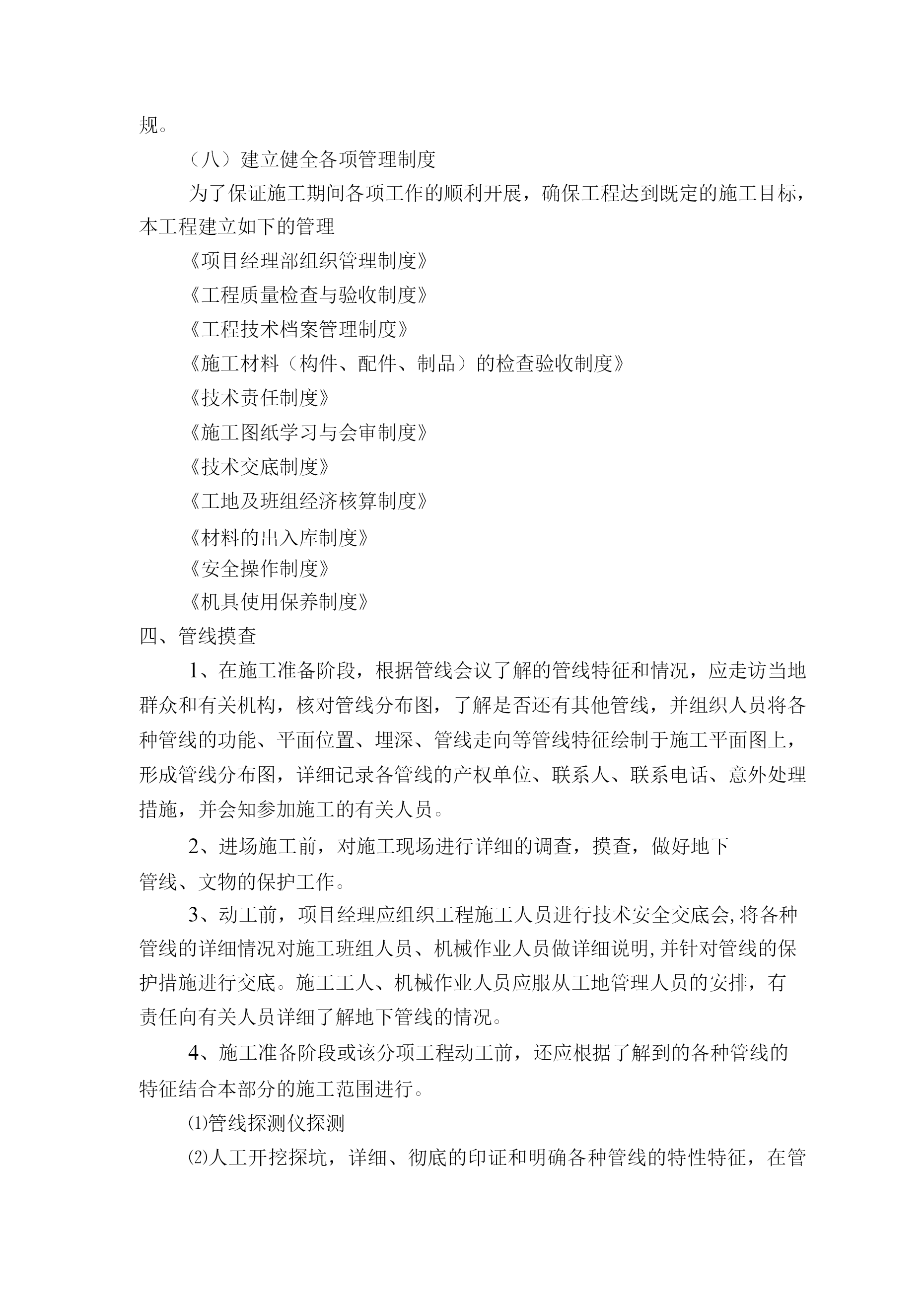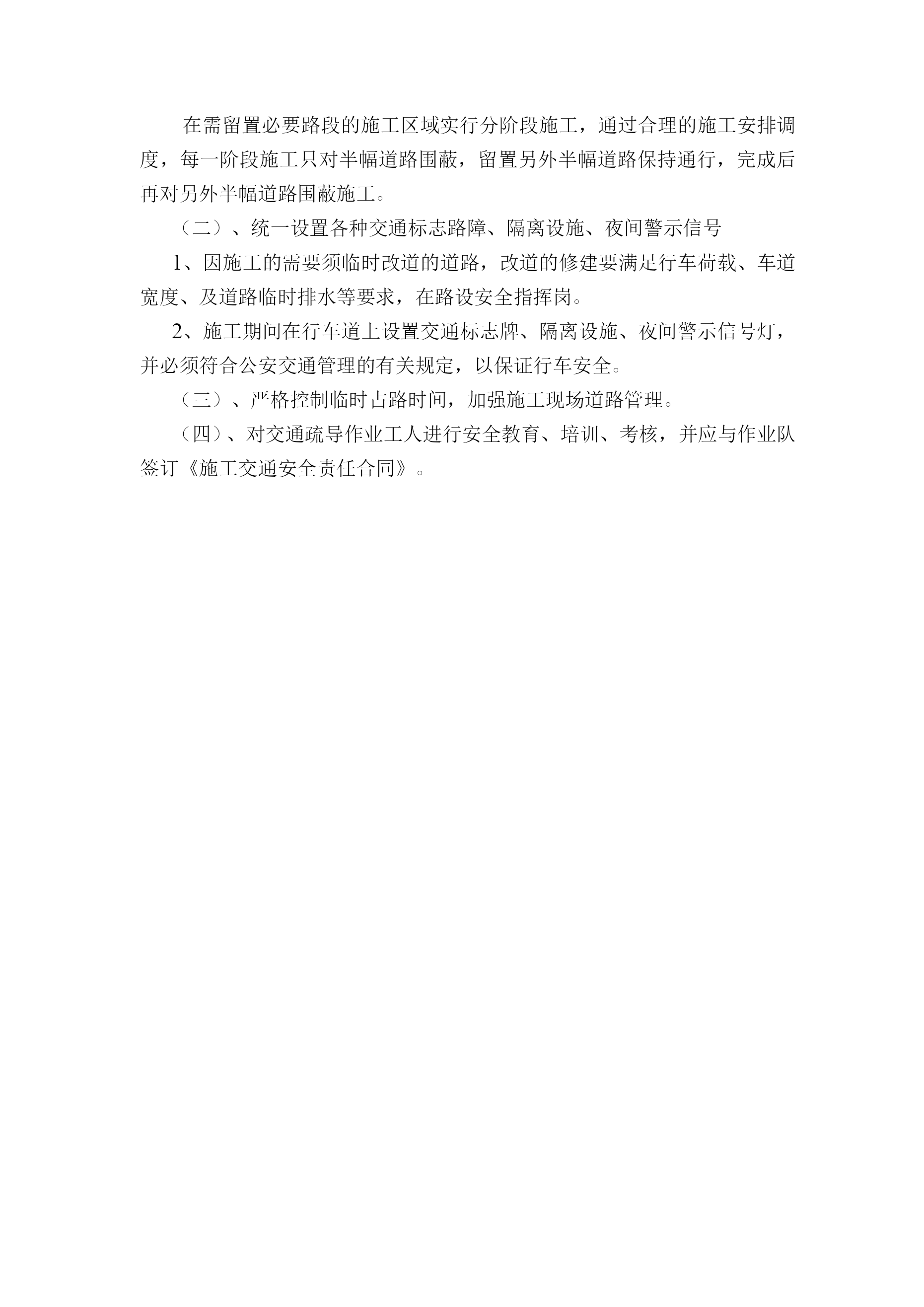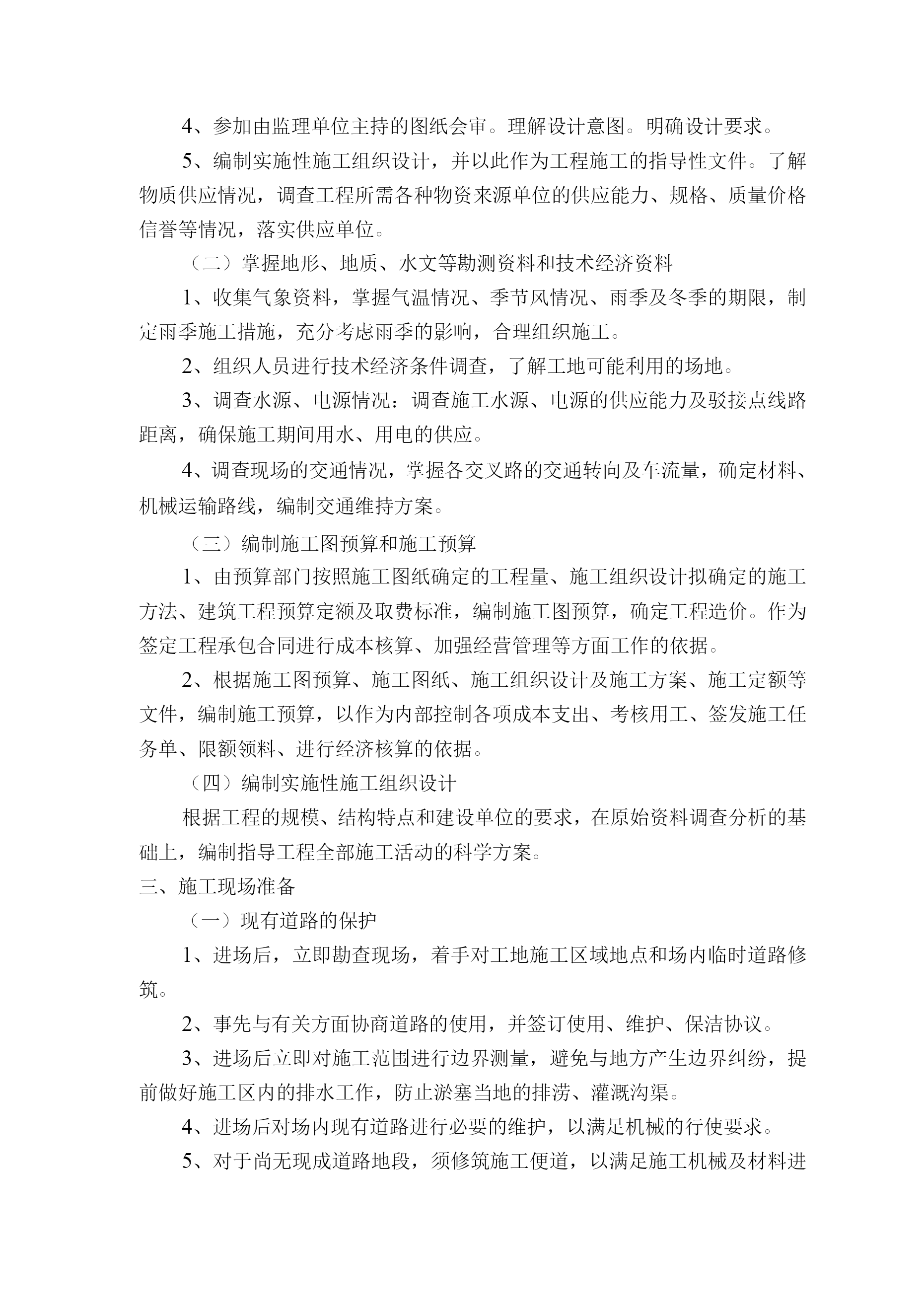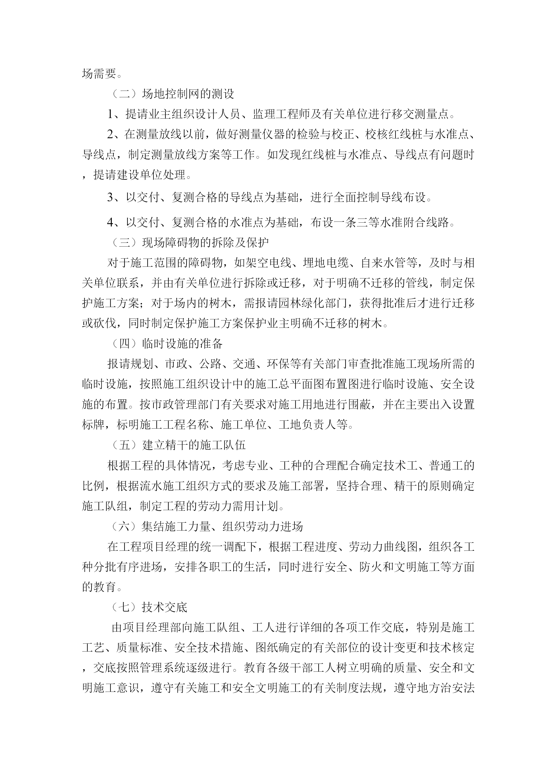 道路施工准备计划及交通疏导方案第一节施工准备计划为了确保本工程项目按时保质完成,我方将组织人员开展施工前期的各项工作,为确保工程快速、顺利进入实施性施工阶段做好准备。一、思想动员我公司将利用1至2天时间进行施工前分层开工动员,首先由项目经理召集各部门负责人用1天时间进行高级管理层的施工动员及交底;其次由各部门用半天时间对其管辖范围内中级管理人员进行施工动员及交底;再次由中级管理人员用1天时间对各施工作业队工长、组长、专业施工人员进行施工动员及交底。动员工作的主要内容:1、介绍本工程基本情况和建设意义;2、讲述本标段工程概况和工程施工特点、施工方法及注意事项;3、强化工期意识及质量意识、安全意识和环保意识;4、强调本标段施工作业高标准、高起点、高速度的具体要求。经过以上逐级动员工作,做到:施工动员普及率达97%以上;施工人员了解工程基本概况,清楚施工特点及注意事项,做到心中有数;提高思想认识,振奋工作精神,以饱满的热情、高昂的士气上场,以实际行动按期、优质、安全地完成施工任务。二、技术准备由公司生产技术部门协助项目部有关人员认真学习图纸。并进行自审、会审和现场签证工作,以便为编制施工组织提供依据。熟悉、审查施工图纸及有关设计文件1、学习和熟悉设计图纸以及有关设计文件,了解设计要求施工达到的技术标准,2、明确工艺流程,做好设计交底。审查设计图纸及有关说明,检查图纸的尺寸、标高。对图纸不明确或疑问处,提请设计单位解析。3、掌握地形、地质、水文等勘测资料和技术经济资料,进行施工现场勘查,查看现场的地形、环境、水电、地面和地下构筑物的现状与图纸是否有出入。4、参加由监理单位主持的图纸会审。理解设计意图。明确设计要求。5、编制实施性施工组织设计,并以此作为工程施工的指导性文件。了解物质供应情况,调查工程所需各种物资来源单位的供应能力、规格、质量价格信誉等情况,落实供应单位。(二)掌握地形、地质、水文等勘测资料和技术经济资料1、收集气象资料,掌握气温情况、季节风情况、雨季及冬季的期限,制定雨季施工措施,充分考虑雨季的影响,合理组织施工。2、组织人员进行技术经济条件调查,了解工地可能利用的场地。3、调查水源、电源情况:调查施工水源、电源的供应能力及驳接点线路距离,确保施工期间用水、用电的供应。4、调查现场的交通情况,掌握各交叉路的交通转向及车流量,确定材料、机械运输路线,编制交通维持方案。(三)编制施工图预算和施工预算1、由预算部门按照施工图纸确定的工程量、施工组织设计拟确定的施工方法、建筑工程预算定额及取费标准,编制施工图预算,确定工程造价。作为签定工程承包合同进行成本核算、加强经营管理等方面工作的依据。2、根据施工图预算、施工图纸、施工组织设计及施工方案、施工定额等文件,编制施工预算,以作为内部控制各项成本支出、考核用工、签发施工任务单、限额领料、进行经济核算的依据。(四)编制实施性施工组织设计根据工程的规模、结构特点和建设单位的要求,在原始资料调查分析的基础上,编制指导工程全部施工活动的科学方案。三、施工现场准备(一)现有道路的保护1、进场后,立即勘查现场,着手对工地施工区域地点和场内临时道路修筑。2、事先与有关方面协商道路的使用,并签订使用、维护、保洁协议。3、进场后立即对施工范围进行边界测量,避免与地方产生边界纠纷,提前做好施工区内的排水工作,防止淤塞当地的排涝、灌溉沟渠。4、进场后对场内现有道路进行必要的维护,以满足机械的行使要求。5、对于尚无现成道路地段,须修筑施工便道,以满足施工机械及材料进场需要。(二)场地控制网的测设1、提请业主组织设计人员、监理工程师及有关单位进行移交测量点。2、在测量放线以前,做好测量仪器的检验与校正、校核红线桩与水准点、导线点,制定测量放线方案等工作。如发现红线桩与水准点、导线点有问题时,提请建设单位处理。3、以交付、复测合格的导线点为基础,进行全面控制导线布设。4、以交付、复测合格的水准点为基础,布设一条三等水准附合线路。(三)现场障碍物的拆除及保护对于施工范围的障碍物,如架空电线、埋地电缆、自来水管等,及时与相关单位联系,并由有关单位进行拆除或迁移,对于明确不迁移的管线,制定保护施工方案;对于场内的树木,需报请园林绿化部门,获得批准后才进行迁移或砍伐,同时制定保护施工方案保护业主明确不迁移的树木。(四)临时设施的准备报请规划、市政、公路、交通、环保等有关部门审查批准施工现场所需的临时设施,按照施工组织设计中的施工总平面图布置图进行临时设施、安全设施的布置。按市政管理部门有关要求对施工用地进行围蔽,并在主要出入设置标牌,标明施工工程名称、施工单位、工地负责人等。(五)建立精干的施工队伍根据工程的具体情况,考