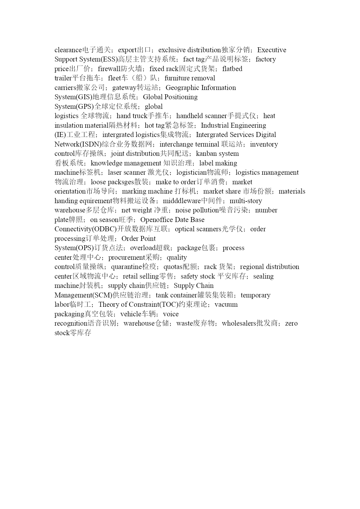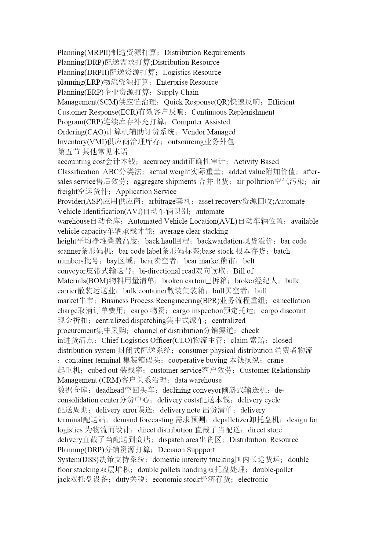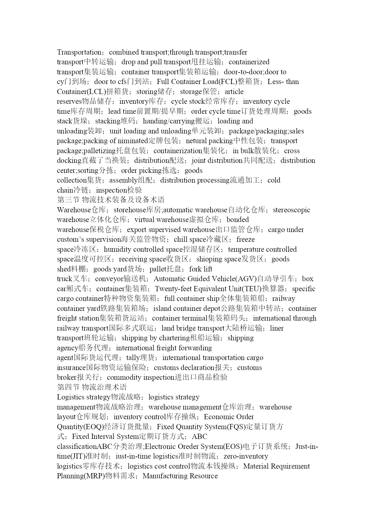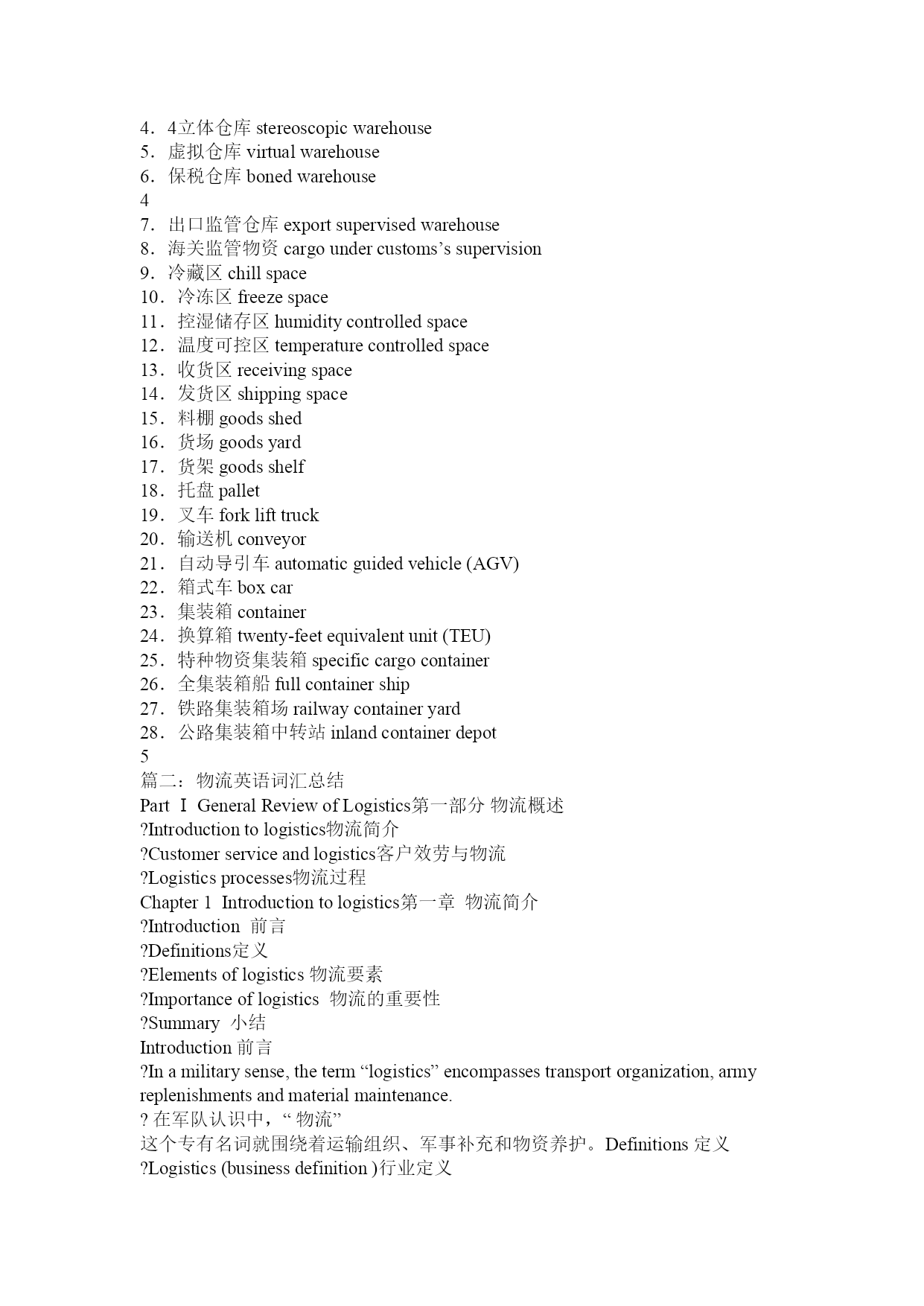 物流英语词汇篇一:常用物流英语单词常用物流英语单词根本概念术语1.物品article2.物流logistics3.物流活动logisticsactivity4.物流作业logisticsoperation5.物流模数logisticsmodulus6.物流技术logisticstechnology7.物流本钱logisticscost8.物流治理logisticsmanagement9.物流中心logisticscenter10.物流网络logisticsnetwork11.物流信息logisticsinformation12.物流企业logisticsenterprise13.物流单证logisticsdocuments14.物流联盟logisticsalliance15.供应物流supplylogistics16.消费物流productionlogistics17.销售物流distributionlogistics18.回收物流returnedlogistics19.废弃物物流wastemateriallogistics20.绿色物流environmentallogistics121.企业物流internallogistics22.社会物流externallogistics23.军事物流militarylogistics24.国际物流internationallogistics25.第三方物流third-partlogistics(TPL)26.定制物流customizedlogistics27.虚拟物流virtuallogistics28.增值物流效劳value-addedlogisticsservice29.供应链supplychain30.条码barcode31.电子数据交换electronicdatainterchange(EDI)32.有形消耗tangibleloss33.无形消耗intangibleloss物流作业术语1.运输transportation2.结合运输combinedtransport3.直达运输throughtransport4.中转运输transfertransport5.甩挂运输_dropandpulltransport6.集装运输containerizedtransport7.集装箱运输containertransport28.门到门door-to-door9.整箱货fullcontainerload(FCL)10.拼箱货lessthancontainerload(LCL)11.储存storing12.保管storage13.物品储存articlereserves14.库存inventory15.经常库存cyclestock16.平安库存safetystock17.库存周期inventorycycletime18.前置期(或提早期)leadtime19.订货处理周期ordercycletime20.货垛goodsstack21.堆码stacking22.搬运handling/carrying23.装卸loadingandunloading24.单元装卸unitloadingandunloading25.包装package/packaging26.销售包装salespackage27.定牌包装packingofnominatedbrand28.中性包装neutralpacking29.运输包装transportpackage330.托盘包装palletizing31.集装化containerization32.散装化containerization33.直截了当换装crossdocking34.配送distribution35.共同配送jointdistribution36.配送中心distributioncenter37.分拣sorting38.拣选orderpicking39.集货goodscollection40.组配assembly41.流通加工distributionprocessing42.冷链coldchain43.检验inspection物流技术装备及设备术语1.仓库warehouse2.库房storehouse3.自动化仓库automaticwarehouse4.4立体仓库stereoscopicwarehouse5.虚拟仓库virtualwarehouse6.保税仓库bonedwarehouse47.出口监管仓库exportsupervisedwarehouse8.海关监管物资cargou