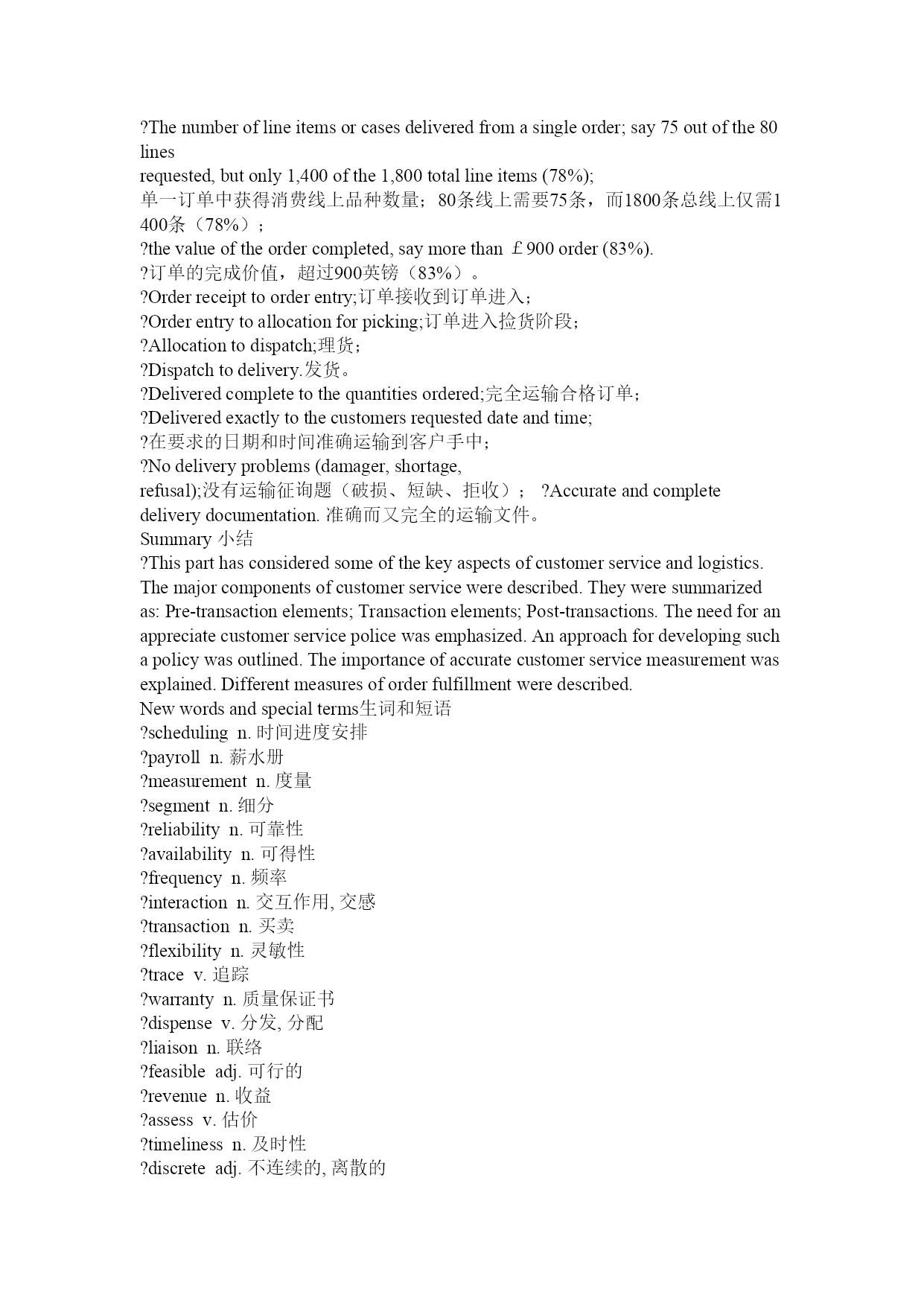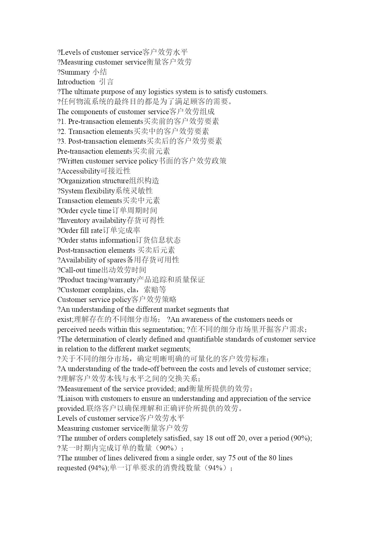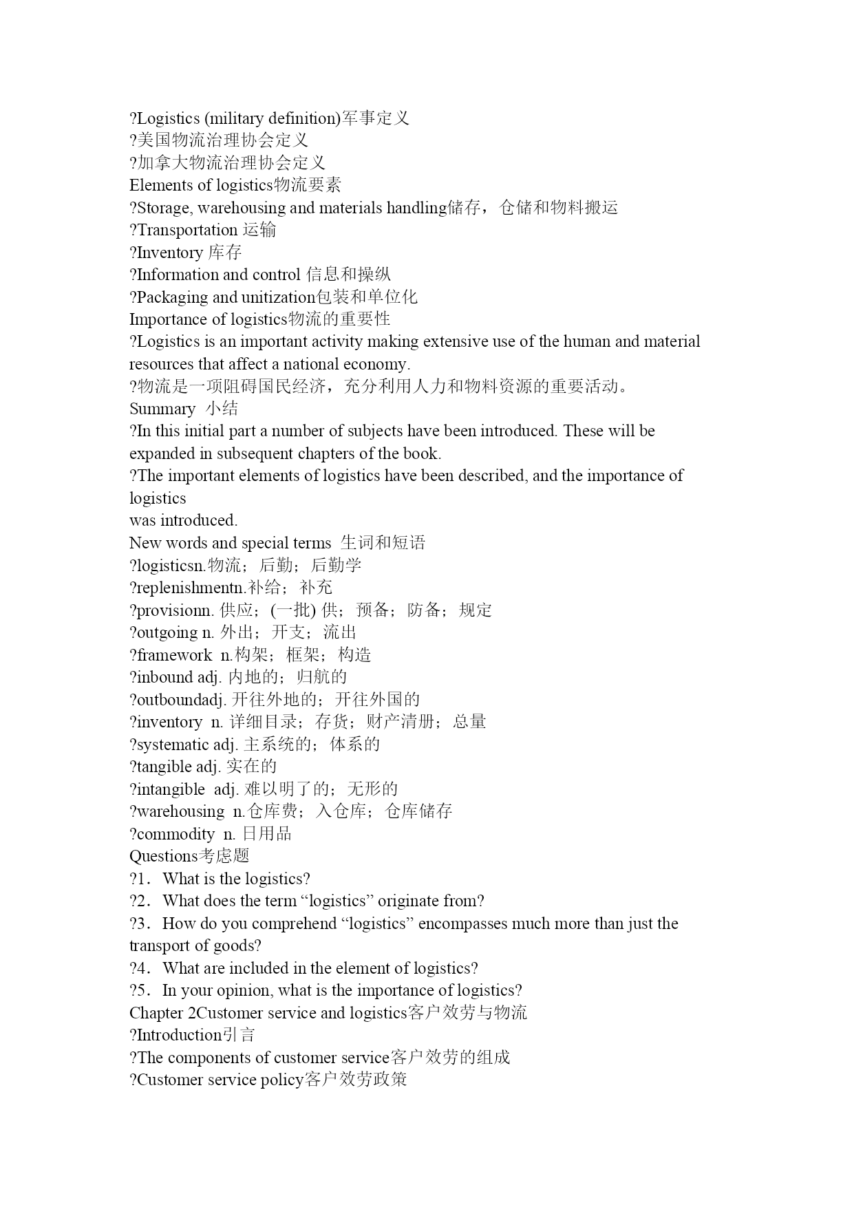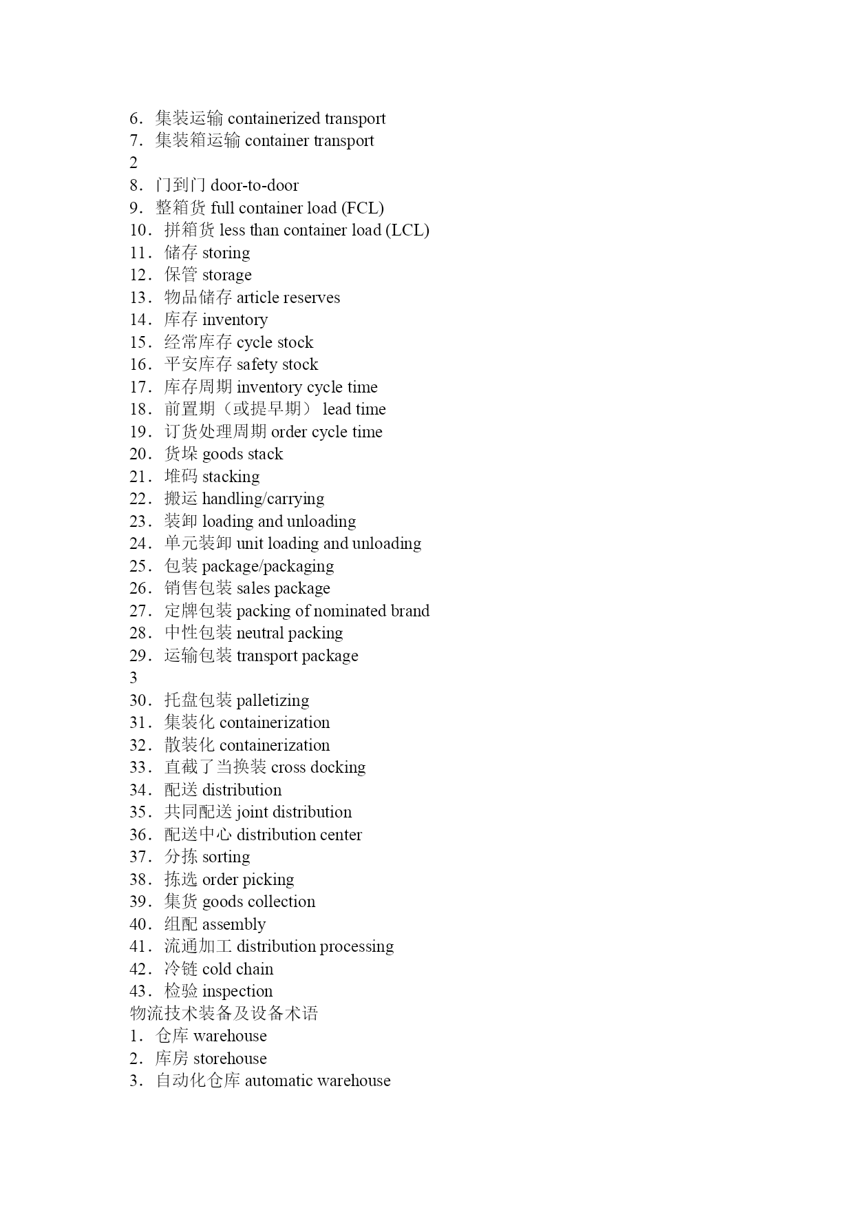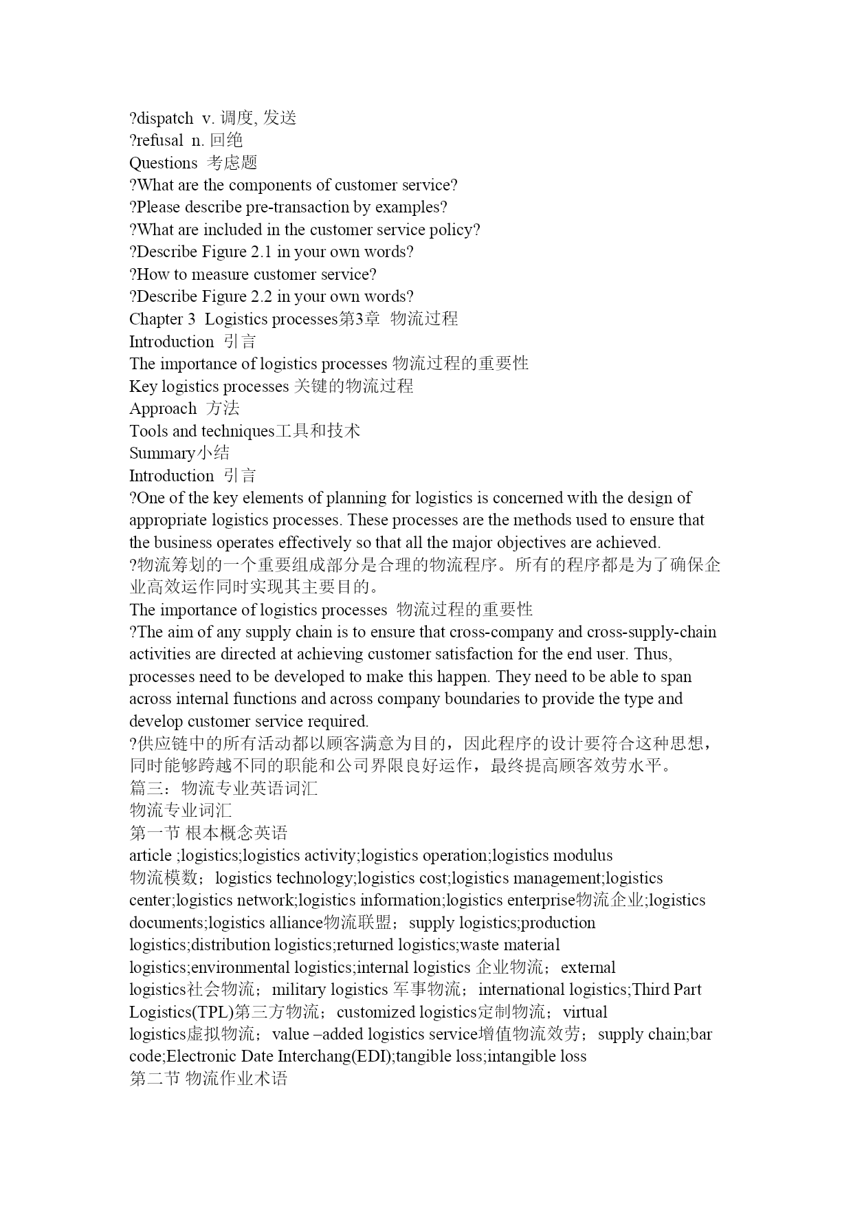 物流英语词汇篇一:常用物流英语单词常用物流英语单词根本概念术语1.物品article2.物流logistics3.物流活动logisticsactivity4.物流作业logisticsoperation5.物流模数logisticsmodulus6.物流技术logisticstechnology7.物流本钱logisticscost8.物流治理logisticsmanagement9.物流中心logisticscenter10.物流网络logisticsnetwork11.物流信息logisticsinformation12.物流企业logisticsenterprise13.物流单证logisticsdocuments14.物流联盟logisticsalliance15.供应物流supplylogistics16.消费物流productionlogistics17.销售物流distributionlogistics18.回收物流returnedlogistics19.废弃物物流wastemateriallogistics20.绿色物流environmentallogistics121.企业物流internallogistics22.社会物流externallogistics23.军事物流militarylogistics24.国际物流internationallogistics25.第三方物流third-partlogistics(TPL)26.定制物流customizedlogistics27.虚拟物流virtuallogistics28.增值物流效劳value-addedlogisticsservice29.供应链supplychain30.条码barcode31.电子数据交换electronicdatainterchange(EDI)32.有形消耗tangibleloss33.无形消耗intangibleloss物流作业术语1.运输transportation2.结合运输combinedtransport3.直达运输throughtransport4.中转运输transfertransport5.甩挂运输_dropandpulltransport6.集装运输containerizedtransport7.集装箱运输containertransport28.门到门door-to-door9.整箱货fullcontainerload(FCL)10.拼箱货lessthancontainerload(LCL)11.储存storing12.保管storage13.物品储存articlereserves14.库存inventory15.经常库存cyclestock16.平安库存safetystock17.库存周期inventorycycletime18.前置期(或提早期)leadtime19.订货处理周期ordercycletime20.货垛goodsstack21.堆码stacking22.搬运handling/carrying23.装卸loadingandunloading24.单元装卸unitloadingandunloading25.包装package/packaging26.销售包装salespackage27.定牌包装packingofnominatedbrand28.中性包装neutralpacking29.运输包装transportpackage330.托盘包装palletizing31.集装化containerization32.散装化containerization33.直截了当换装crossdocking34.配送distribution35.共同配送jointdistribution36.配送中心distributioncenter37.分拣sorting38.拣选orderpicking39.集货goodscollection40.组配assembly41.流通加工distributionprocessing42.冷链coldchain43.检验inspection物流技术装备及设备术语1.仓库warehouse2.库房storehouse3.自动化仓库automaticwarehouse4.4立体仓库stereoscopicwarehouse5.虚拟仓库virtualwarehouse6.保税仓库bonedwarehouse47.出口监管仓库exportsupervisedwarehouse8.海关监管物资cargou
