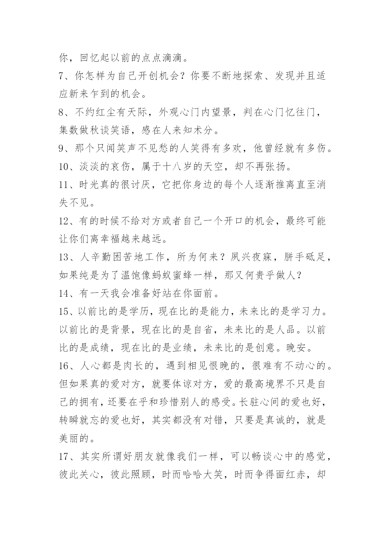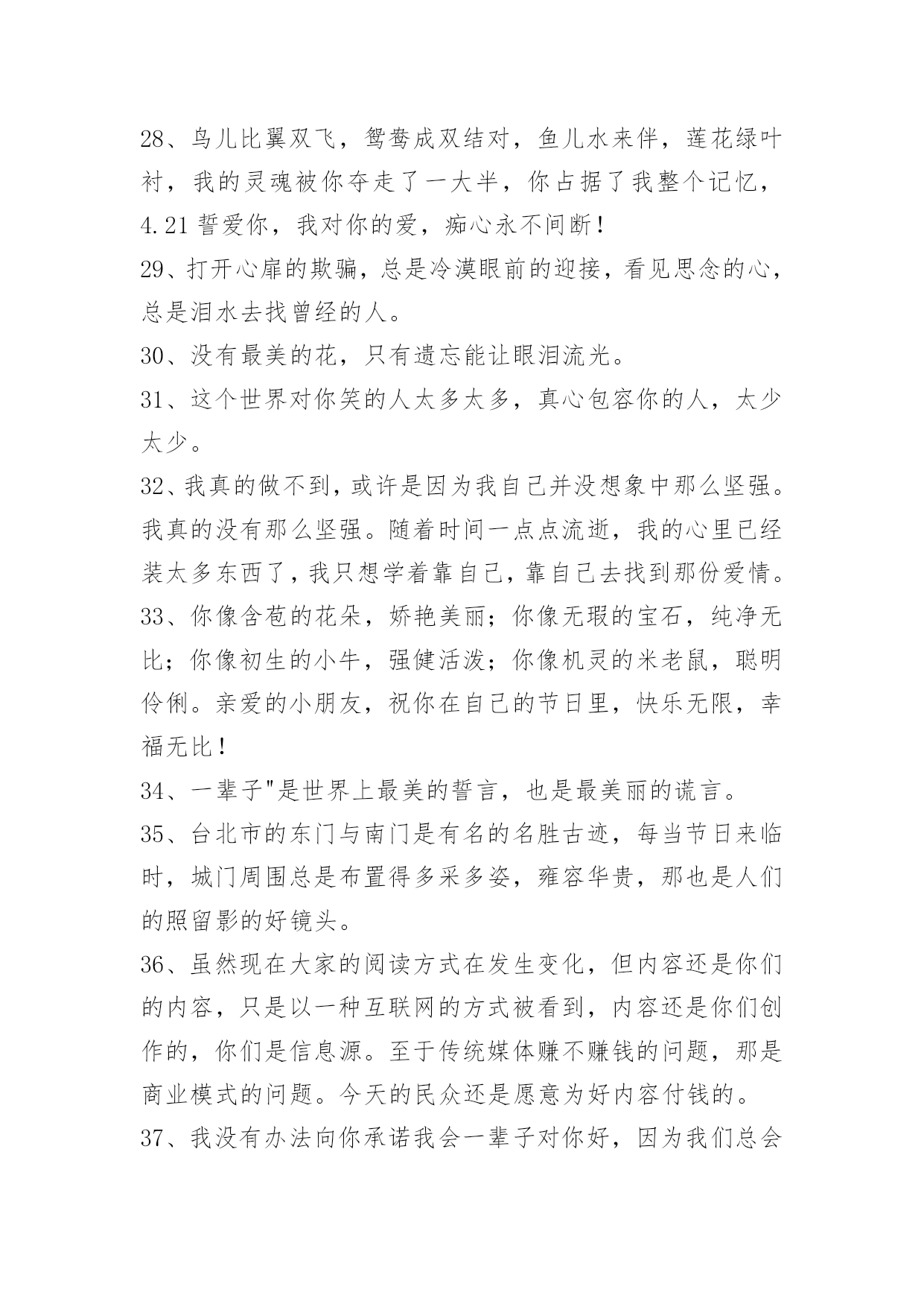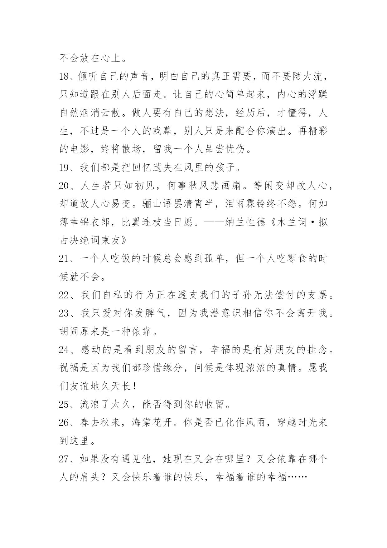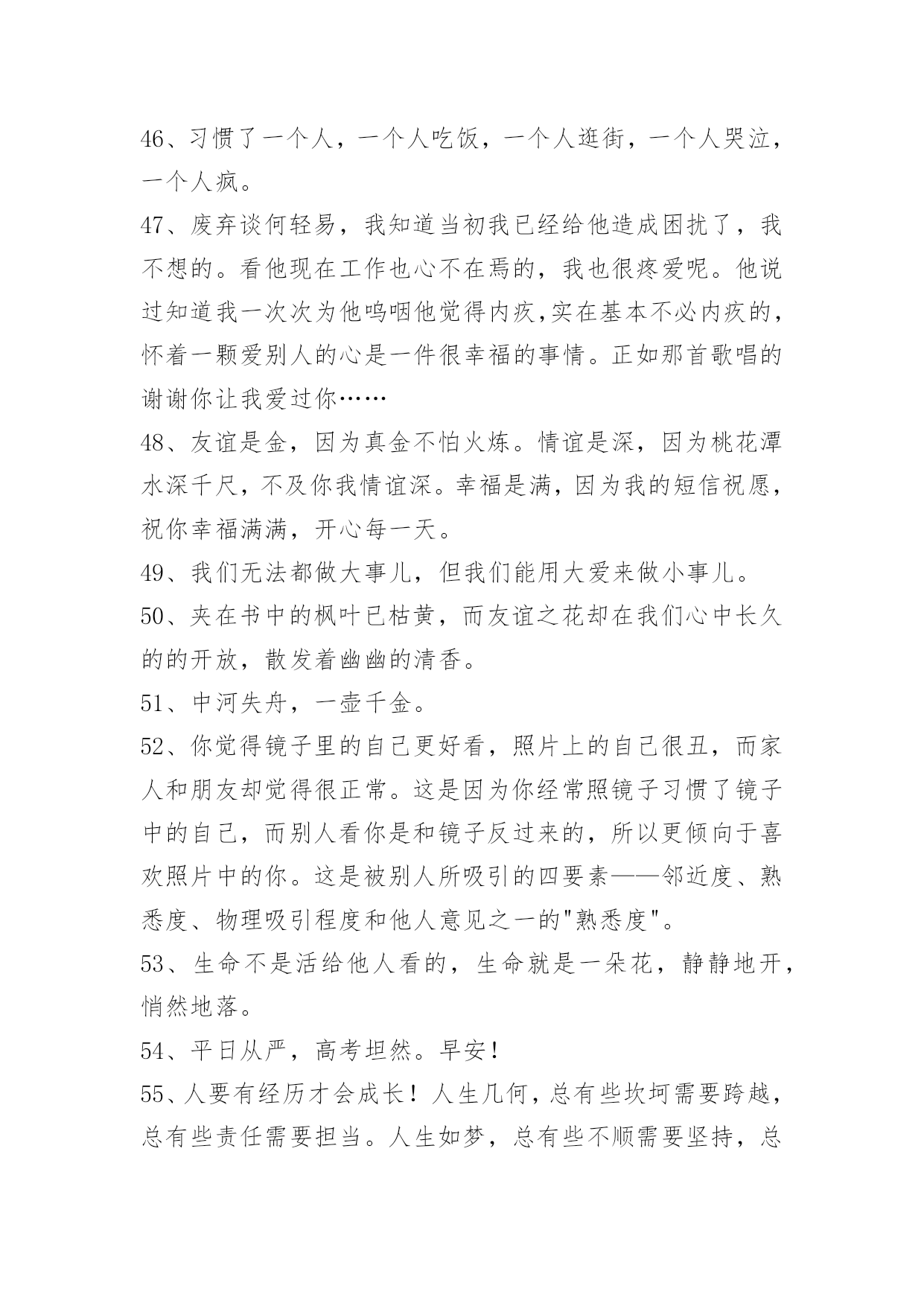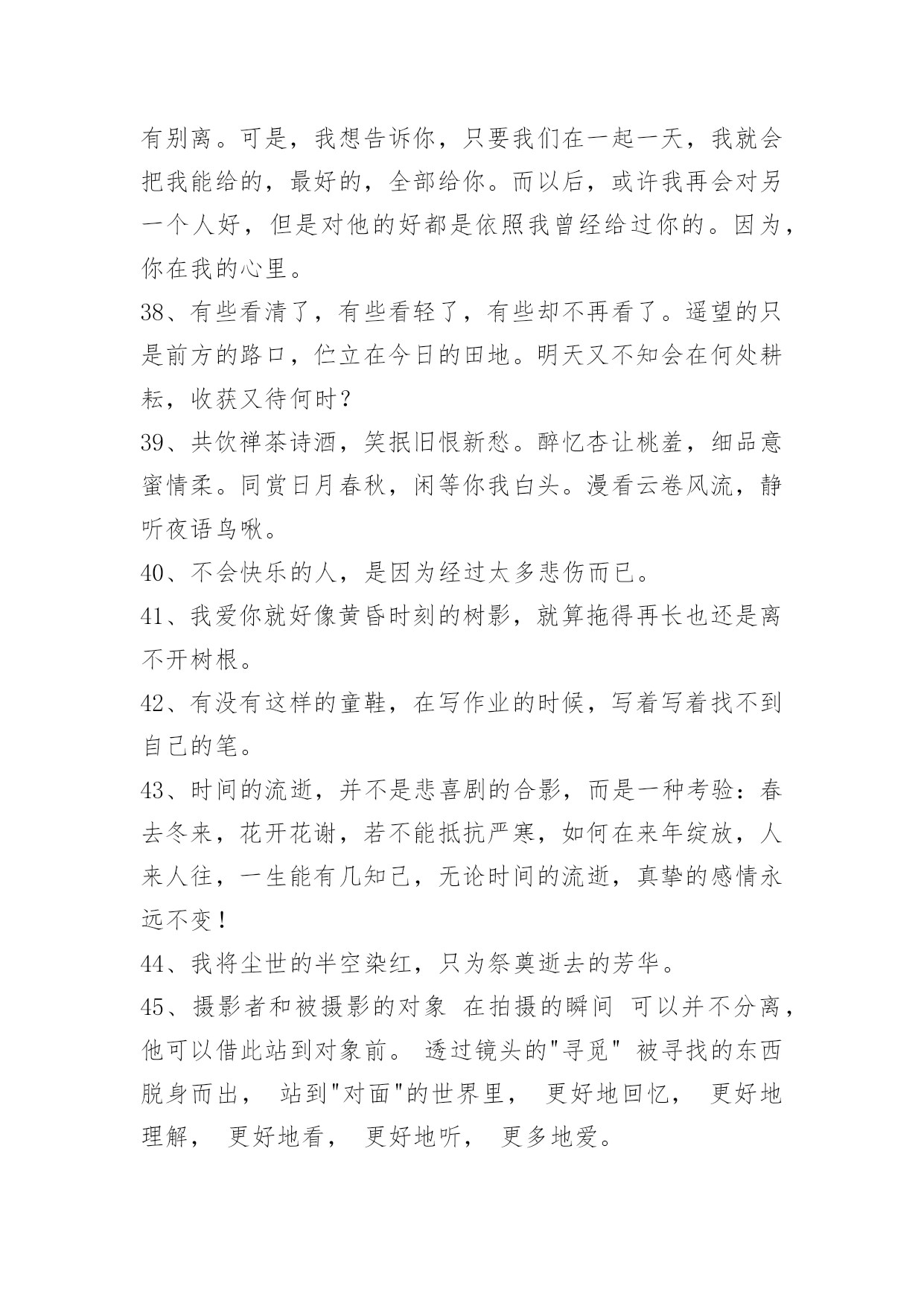 简单的唯美的生活语录2024年简单的唯美的生活语录锦集56句风把记忆吹成长线,原本清晰的脚印也被尘土覆盖,我们间的定局也无从改变。下面是小编为大家整理的唯美的生活语录56句,欢迎阅读,希望能够对大家有所帮助。1、寒来过小楼,白雪未临州。况景冬撩绪,江南月酌眸。余红频向晚,嫩翠冷凝幽。灯火阑珊忆,东风不识愁。2、永夜恹恹欢意少,空梦长安,认取长安道。为报今年春色好,花光月影宜相照。随意杯盘虽草草,酒美梅酸,恰称人怀抱。醉莫插花花莫笑,可怜春似人将老。3、菩提岁月,人间繁华几许,转眼而逝,不过一季换一季。挽一段岁月静好,抒一时情感所依,品一壶清淡茶香。缓一时郁之愁,抒一时情之殇。人生如茶,甜苦暖凉,自品自知。繁华三千,终将尘埃落定,浮生若梦,终将俱静归尘。4、简静,不是远避尘世,而是远避喧嚣。俗世有太多的蝇营狗苟,简静的人,以心灵的弦歌雅意对立和抗争。简静的人,从他人那里,一步一步退回到了自我的生命里,一切删繁就简,走向生命内在的丰富和高贵。5、520,祝你快乐!你的过去我来不及参与,你的未来我不会再错过!真诚之中,与你相识相知;灵犀之间,与你朝夕相伴。6、你已经消失在我的眼幕。可是每到深夜时候我都会想起你,回忆起以前的点点滴滴。7、你怎样为自己开创机会?你要不断地探索、发现并且适应新来乍到的机会。8、不约红尘有天际,外观心门内望景,判在心门忆往门,集数做秋谈笑语,感在人来知术分。9、那个只闻笑声不见愁的人笑得有多欢,他曾经就有多伤。10、淡淡的哀伤,属于十八岁的天空,却不再张扬。11、时光真的很讨厌,它把你身边的每个人逐渐推离直至消失不见。12、有的时候不给对方或者自己一个开口的机会,最终可能让你们离幸福越来越远。13、人辛勤困苦地工作,所为何来?夙兴夜寐,胼手砥足,如果纯是为了温饱像蚂蚁蜜蜂一样,那又何贵乎做人?14、有一天我会准备好站在你面前。15、以前比的是学历,现在比的是能力,未来比的是学习力。以前比的是背景,现在比的是自省,未来比的是人品。以前比的是成绩,现在比的是业绩,未来比的是创意。晚安。16、人心都是肉长的,遇到相见恨晚的,很难有不动心的。但如果真的爱对方,就要体谅对方,爱的最高境界不只是自己的拥有,还要在乎和珍惜别人的感受。长驻心间的爱也好,转瞬就忘的爱也好,其实都没有对错,只要是真诚的,就是美丽的。17、其实所谓好朋友就像我们一样,可以畅谈心中的感觉,彼此关心,彼此照顾,时而哈哈大笑,时而争得面红赤,却不会放在心上。18、倾听自己的声音,明白自己的真正需要,而不要随大流,只知道跟在别人后面走。让自己的心简单起来,内心的浮躁自然烟消云散。做人要有自己的想法,经历后,才懂得,人生,不过是一个人的戏幕,别人只是来配合你演出。再精彩的电影,终将散场,留我一个人品尝忧伤。19、我们都是把回忆遗失在风里的孩子。20、人生若只如初见,何事秋风悲画扇。等闲变却故人心,却道故人心易变。骊山语罢清宵半,泪雨霖铃终不怨。何如薄幸锦衣郎,比翼连枝当日愿。——纳兰性德《木兰词·拟古决绝词柬友》21、一个人吃饭的时候总会感到孤单,但一个人吃零食的时候就不会。22、我们自私的行为正在透支我们的子孙无法偿付的支票。23、我只爱对你发脾气,因为我潜意识相信你不会离开我。胡闹原来是一种依靠。24、感动的是看到朋友的留言,幸福的是有好朋友的挂念。祝福是因为我们都珍惜缘分,问候是体现浓浓的真情。愿我们友谊地久天长!25、流浪了太久,能否得到你的收留。26、春去秋来,海棠花开。你是否已化作风雨,穿越时光来到这里。27、如果没有遇见他,她现在又会在哪里?又会依靠在哪个人的肩头?又会快乐着谁的快乐,幸福着谁的幸福……28、鸟儿比翼双飞,鸳鸯成双结对,鱼儿水来伴,莲花绿叶衬,我的灵魂被你夺走了一大半,你占据了我整个记忆,4.21誓爱你,我对你的爱,痴心永不间断!29、打开心扉的欺骗,总是冷漠眼前的迎接,看见思念的心,总是泪水去找曾经的人。30、没有最美的花,只有遗忘能让眼泪流光。31、这个世界对你笑的人太多太多,真心包容你的人,太少太少。32、我真的做不到,或许是因为我自己并没想象中那么坚强。我真的没有那么坚强。随着时间一点点流逝,我的心里已经装太多东西了,我只想学着靠自己,靠自己去找到那份爱情。33、你像含苞的花朵,娇艳美丽;你像无瑕的宝石,纯净无比;你像初生的小牛,强健活泼;你像机灵的米老鼠,聪明伶俐。亲爱的小朋友,祝你在自己的节日里,快乐无限,幸福无比!34、一辈子"是世界上最美的誓言,也是最美丽的谎言。35、台北市的东门与南门是有名的名胜古迹,每当节日来临时,城门周围总是布置得多采多姿,雍容华贵,那也是人们的照留影的好镜头。36、虽然现在大家的阅读方式在发生变化,但内容还是你们的内容,只是以一种互联网的方式被看到,内容还是你们创作的,你们是信息