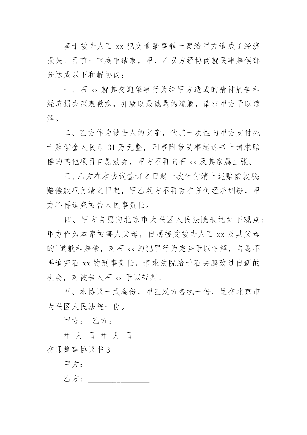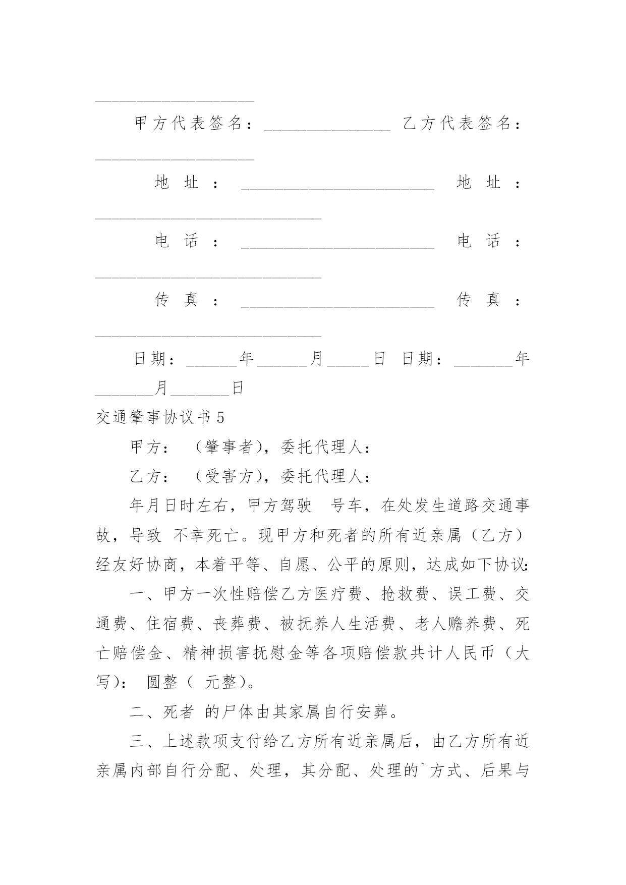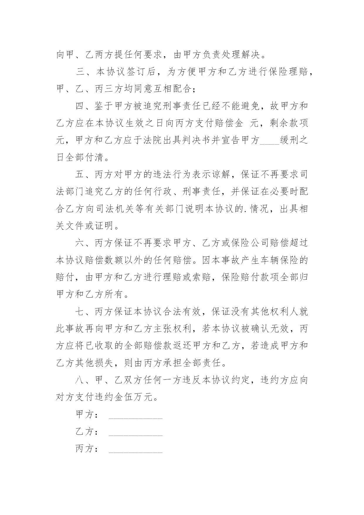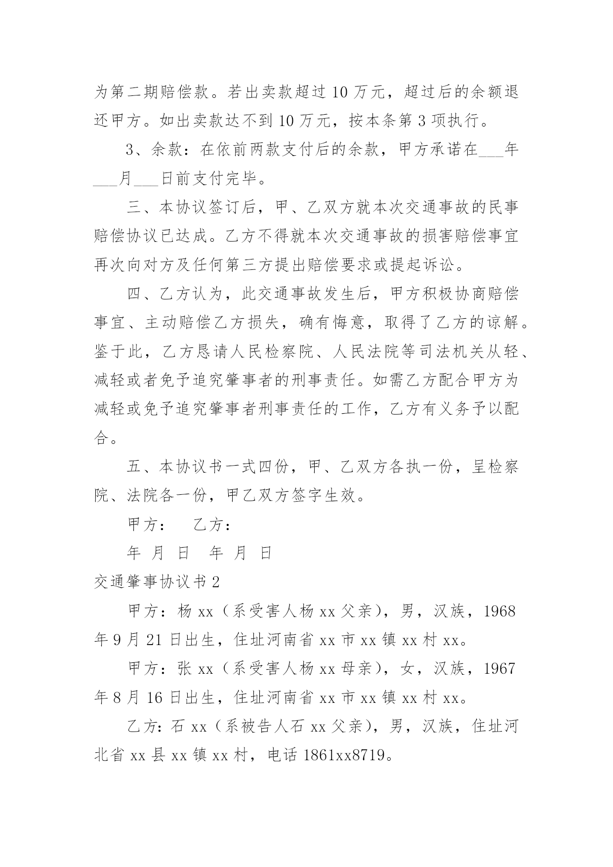 交通肇事协议书交通肇事协议书15篇在现在社会,越来越多地方需要用到协议,签订协议可以使双方受到法律的保护。拟起协议来就毫无头绪?以下是小编收集整理的交通肇事协议书,欢迎大家分享。交通肇事协议书1甲方:乙方:年月日,甲方之夫驾驶鄂___号货车交通肇事,致乙方之妻受伤后抢救无效死亡。现甲方与乙方就该交通事故的赔偿事宜,经双方平等协商、自愿达成如下协议:一、赔偿总额:甲、乙双方确定该交通事故赔偿总额为:人民币壹拾肆万元(含甲方在本协议签订前已支付的两万元),该赔偿总额包括了死亡赔偿金、丧葬费、被扶养人生活费、精神赔偿金、有关人员处理丧事的费用等一切赔偿费用。二、支付方式:1、首付:人民币肆万元,包含本协议前甲方已支付的`两万元,即本协议签订后甲方再立即支付两万元。2、第二期:乙方申请法院解除对鄂___号货车的财产保全措施。由甲方和乙方共同出卖该车,出售该车的所得作为第二期赔偿款。若出卖款超过10万元,超过后的余额退还甲方。如出卖款达不到10万元,按本条第3项执行。3、余款:在依前两款支付后的余款,甲方承诺在___年___月___日前支付完毕。三、本协议签订后,甲、乙双方就本次交通事故的民事赔偿协议已达成。乙方不得就本次交通事故的损害赔偿事宜再次向对方及任何第三方提出赔偿要求或提起诉讼。四、乙方认为,此交通事故发生后,甲方积极协商赔偿事宜、主动赔偿乙方损失,确有悔意,取得了乙方的谅解。鉴于此,乙方恳请人民检察院、人民法院等司法机关从轻、减轻或者免予追究肇事者的刑事责任。如需乙方配合甲方为减轻或免予追究肇事者刑事责任的工作,乙方有义务予以配合。五、本协议书一式四份,甲、乙双方各执一份,呈检察院、法院各一份,甲乙双方签字生效。甲方:乙方:年月日年月日交通肇事协议书2甲方:杨xx(系受害人杨xx父亲),男,汉族,1968年9月21日出生,住址河南省xx市xx镇xx村xx。甲方:张xx(系受害人杨xx母亲),女,汉族,1967年8月16日出生,住址河南省xx市xx镇xx村xx。乙方:石xx(系被告人石xx父亲),男,汉族,住址河北省xx县xx镇xx村,电话1861xx8719。鉴于被告人石xx犯交通肇事罪一案给甲方造成了经济损失。目前一审庭审结束,甲、乙双方经协商就民事赔偿部分达成以下和解协议:一、石xx就其交通肇事行为给甲方造成的精神痛苦和经济损失深表歉意,并致以最诚恳的道歉,请求甲方予以谅解。二、乙方作为被告人的父亲,代其一次性向甲方支付死亡赔偿金人民币31万元整,刑事附带民事起诉书上请求赔偿的其他项目自愿放弃,甲方不再向石xx及其家属主张。三、乙方在本协议签订之日起一次性付清上述赔偿款项;赔偿款项付清之日起,甲乙双方不再存在任何经济纠纷,甲方不再追究被告人民事责任。四、甲方自愿向北京市大兴区人民法院表达如下观点:甲方作为本案被害人父母,自愿接受被告人石xx及其父母的`道歉和赔偿,对石xx的犯罪行为完全予以谅解,自愿不再追究石xx的刑事责任,请求法院给予石去鹏改过自新的机会,对被告人石xx予以轻判。五、本协议一式叁份,甲乙双方各执一份,呈交北京市大兴区人民法院一份。甲方:乙方:年月日年月日交通肇事协议书3甲方:_______________乙方:_______________对于年月日发生的交通事故,经甲、乙双方充分协商一致达成如下协议:一、甲方赔偿给乙方各项损失共计_____元人民币(包括已经支付的_____元)。二、剩余_____元是由医疗补助金和甲方的赔偿金组成,在医疗补助金的基础上由甲方补足。三、损失赔偿包括乙方的交通费、护理费、误工费、伙食住宿费、后续治疗费、精神损失费、残疾赔偿金等各项损失赔偿。四、本协议所涉及的赔偿是一次性终结赔偿,甲方支付乙方费用后,今后乙方不得以任何理由向甲方主张任何权利,甲方不再负有任何赔偿责任。五、本协议签订时,双方均是在自愿的情形下签订的`,不存在任何重大误解或显示公平的情形,甲、乙双方不得以任何理由对于协议提出反悔。六、本协议自双方当事人签字后生效。七、本协议一式三份,甲、乙双方各执一份,交警一份。甲方:___________乙方:_______________年_____月_____日交通肇事协议书4甲方:_________________乙方:_________________对于_______年____月____日发生的交通事故,经甲、乙双方充分协商一致达成如下协议:一、甲方自愿赔偿给乙方各项损失共计________元人民币(包括已经支付的_____元)。二、损失赔偿包括乙方的交通费、护理费、误工费、伙食住宿费、被扶养人生活费、后续治疗费、精神损失费、残疾赔偿金等各项损失赔偿。三、本协议签定时,甲方支付乙方________元,余款在乙方配合甲方向保险公司理赔后,支付给乙方。乙方的具体配合