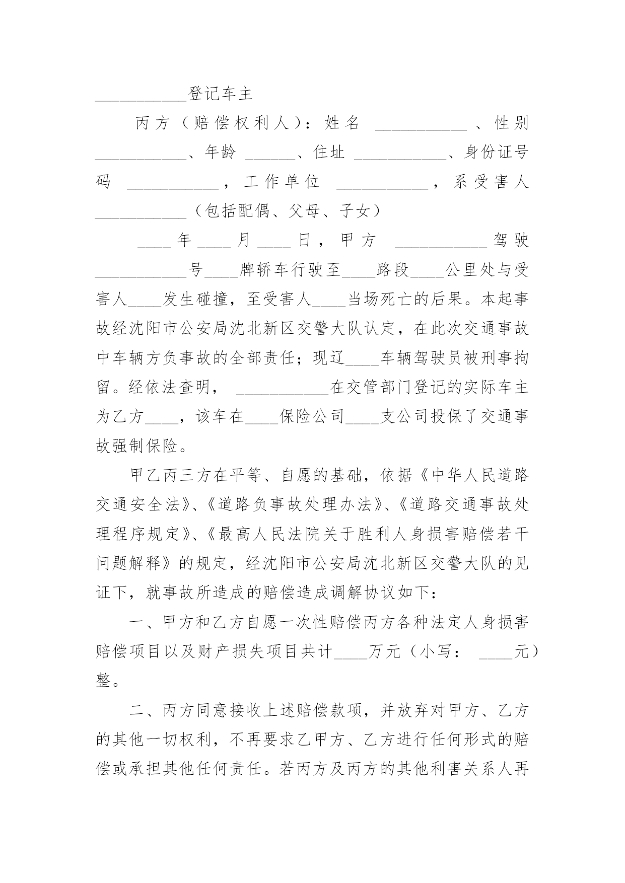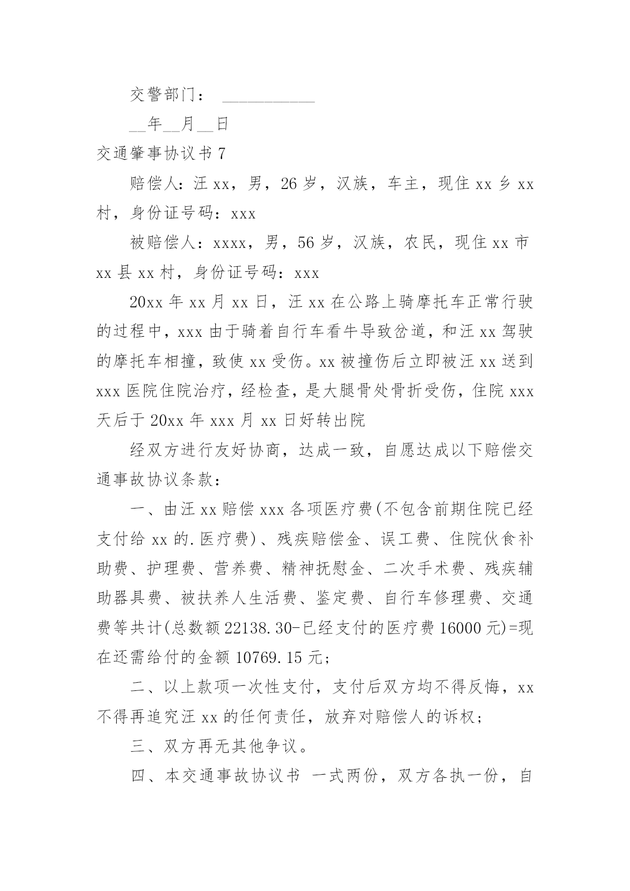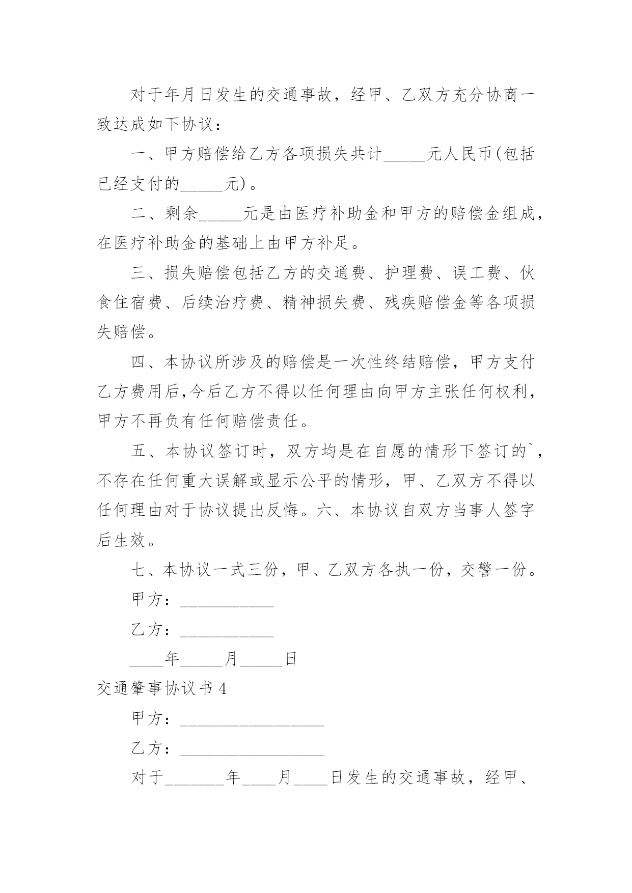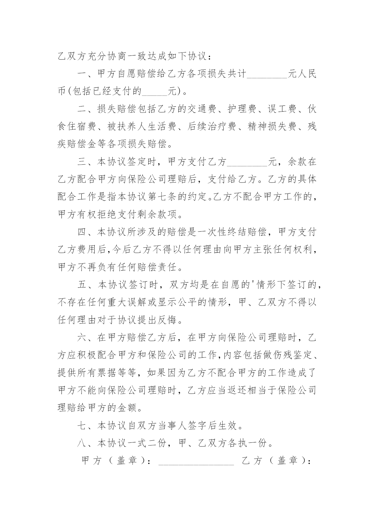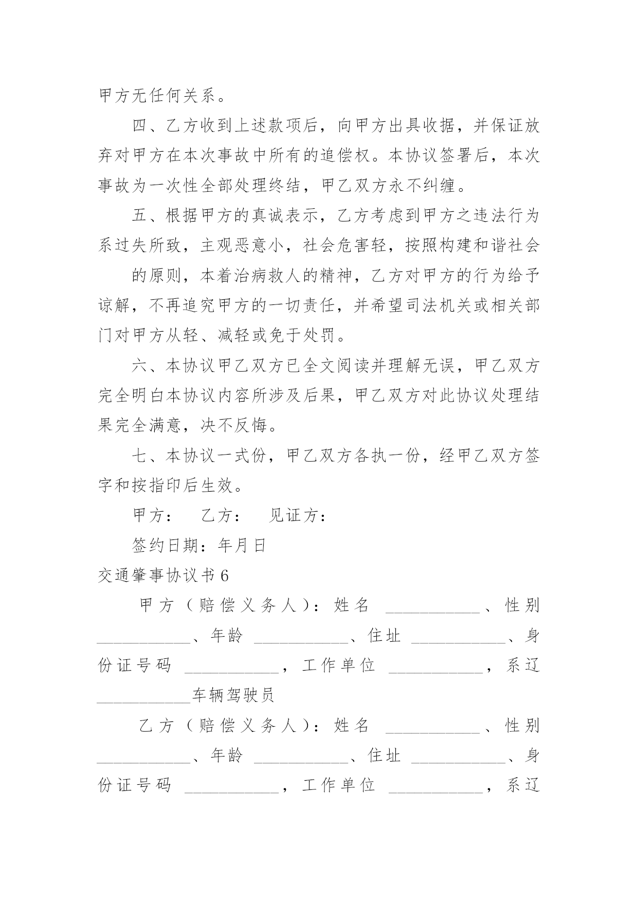 交通肇事协议书交通肇事协议书15篇在现在社会,越来越多地方需要用到协议,签订协议可以使双方受到法律的保护。拟起协议来就毫无头绪?以下是小编收集整理的交通肇事协议书,欢迎大家分享。交通肇事协议书1甲方:乙方:年月日,甲方之夫驾驶鄂___号货车交通肇事,致乙方之妻受伤后抢救无效死亡。现甲方与乙方就该交通事故的赔偿事宜,经双方平等协商、自愿达成如下协议:一、赔偿总额:甲、乙双方确定该交通事故赔偿总额为:人民币壹拾肆万元(含甲方在本协议签订前已支付的两万元),该赔偿总额包括了死亡赔偿金、丧葬费、被扶养人生活费、精神赔偿金、有关人员处理丧事的费用等一切赔偿费用。二、支付方式:1、首付:人民币肆万元,包含本协议前甲方已支付的`两万元,即本协议签订后甲方再立即支付两万元。2、第二期:乙方申请法院解除对鄂___号货车的财产保全措施。由甲方和乙方共同出卖该车,出售该车的所得作为第二期赔偿款。若出卖款超过10万元,超过后的余额退还甲方。如出卖款达不到10万元,按本条第3项执行。3、余款:在依前两款支付后的余款,甲方承诺在___年___月___日前支付完毕。三、本协议签订后,甲、乙双方就本次交通事故的民事赔偿协议已达成。乙方不得就本次交通事故的损害赔偿事宜再次向对方及任何第三方提出赔偿要求或提起诉讼。四、乙方认为,此交通事故发生后,甲方积极协商赔偿事宜、主动赔偿乙方损失,确有悔意,取得了乙方的谅解。鉴于此,乙方恳请人民检察院、人民法院等司法机关从轻、减轻或者免予追究肇事者的刑事责任。如需乙方配合甲方为减轻或免予追究肇事者刑事责任的工作,乙方有义务予以配合。五、本协议书一式四份,甲、乙双方各执一份,呈检察院、法院各一份,甲乙双方签字生效。甲方:乙方:年月日年月日交通肇事协议书2甲方:杨xx(系受害人杨xx父亲),男,汉族,1968年9月21日出生,住址河南省xx市xx镇xx村xx。甲方:张xx(系受害人杨xx母亲),女,汉族,1967年8月16日出生,住址河南省xx市xx镇xx村xx。乙方:石xx(系被告人石xx父亲),男,汉族,住址河北省xx县xx镇xx村,电话1861xx8719。鉴于被告人石xx犯交通肇事罪一案给甲方造成了经济损失。目前一审庭审结束,甲、乙双方经协商就民事赔偿部分达成以下和解协议:一、石xx就其交通肇事行为给甲方造成的精神痛苦和经济损失深表歉意,并致以最诚恳的道歉,请求甲方予以谅解。二、乙方作为被告人的父亲,代其一次性向甲方支付死亡赔偿金人民币31万元整,刑事附带民事起诉书上请求赔偿的其他项目自愿放弃,甲方不再向石xx及其家属主张。三、乙方在本协议签订之日起一次性付清上述赔偿款项;赔偿款项付清之日起,甲乙双方不再存在任何经济纠纷,甲方不再追究被告人民事责任。四、甲方自愿向北京市大兴区人民法院表达如下观点:甲方作为本案被害人父母,自愿接受被告人石xx及其父母的`道歉和赔偿,对石xx的犯罪行为完全予以谅解,自愿不再追究石xx的刑事责任,请求法院给予石去鹏改过自新的机会,对被告人石xx予以轻判。五、本协议一式叁份,甲乙双方各执一份,呈交北京市大兴区人民法院一份。甲方:乙方:年月日年月日交通肇事协议书3甲方:_______________乙方:_______________对于年月日发生的交通事故,经甲、乙双方充分协商一致达成如下协议:一、甲方赔偿给乙方各项损失共计_____元人民币(包括已经支付的_____元)。二、剩余_____元是由医疗补助金和甲方的赔偿金组成,在医疗补助金的基础上由甲方补足。三、损失赔偿包括乙方的交通费、护理费、误工费、伙食住宿费、后续治疗费、精神损失费、残疾赔偿金等各项损失赔偿。四、本协议所涉及的赔偿是一次性终结赔偿,甲方支付乙方费用后,今后乙方不得以任何理由向甲方主张任何权利,甲方不再负有任何赔偿责任。五、本协议签订时,双方均是在自愿的情形下签订的`,不存在任何重大误解或显示公平的情形,甲、乙双方不得以任何理由对于协议提出反悔。六、本协议自双方当事人签字后生效。七、本协议一式三份,甲、乙双方各执一份,交警一份。甲方:___________乙方:_______________年_____月_____日交通肇事协议书4甲方:_________________乙方:_________________对于_______年____月____日发生的交通事故,经甲、乙双方充分协商一致达成如下协议:一、甲方自愿赔偿给乙方各项损失共计________元人民币(包括已经支付的_____元)。二、损失赔偿包括乙方的交通费、护理费、误工费、伙食住宿费、被扶养人生活费、后续治疗费、精神损失费、残疾赔偿金等各项损失赔偿。三、本协议签定时,甲方支付乙方________元,余款在乙方配合甲方向保险公司理赔后,支付给乙方。乙方的具体配合