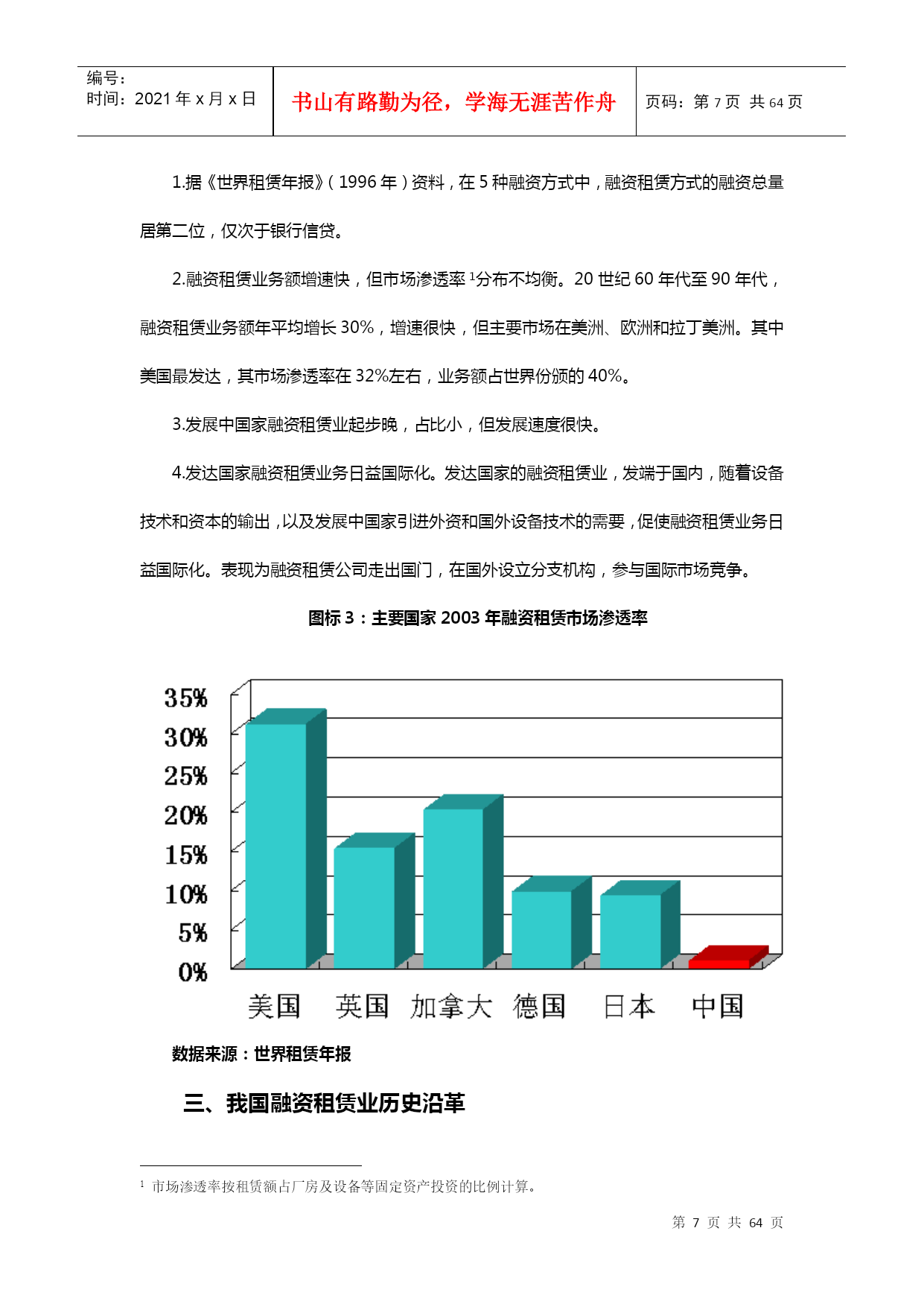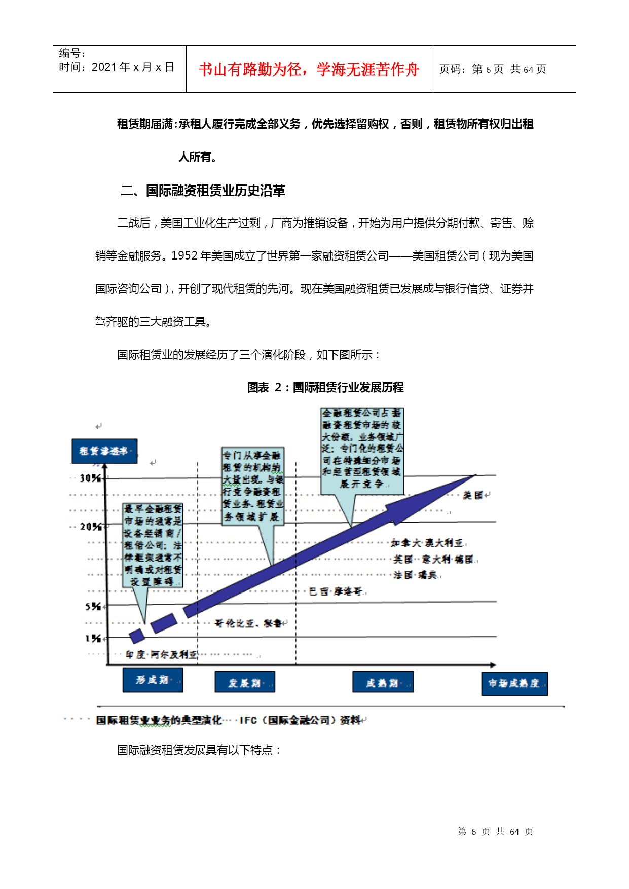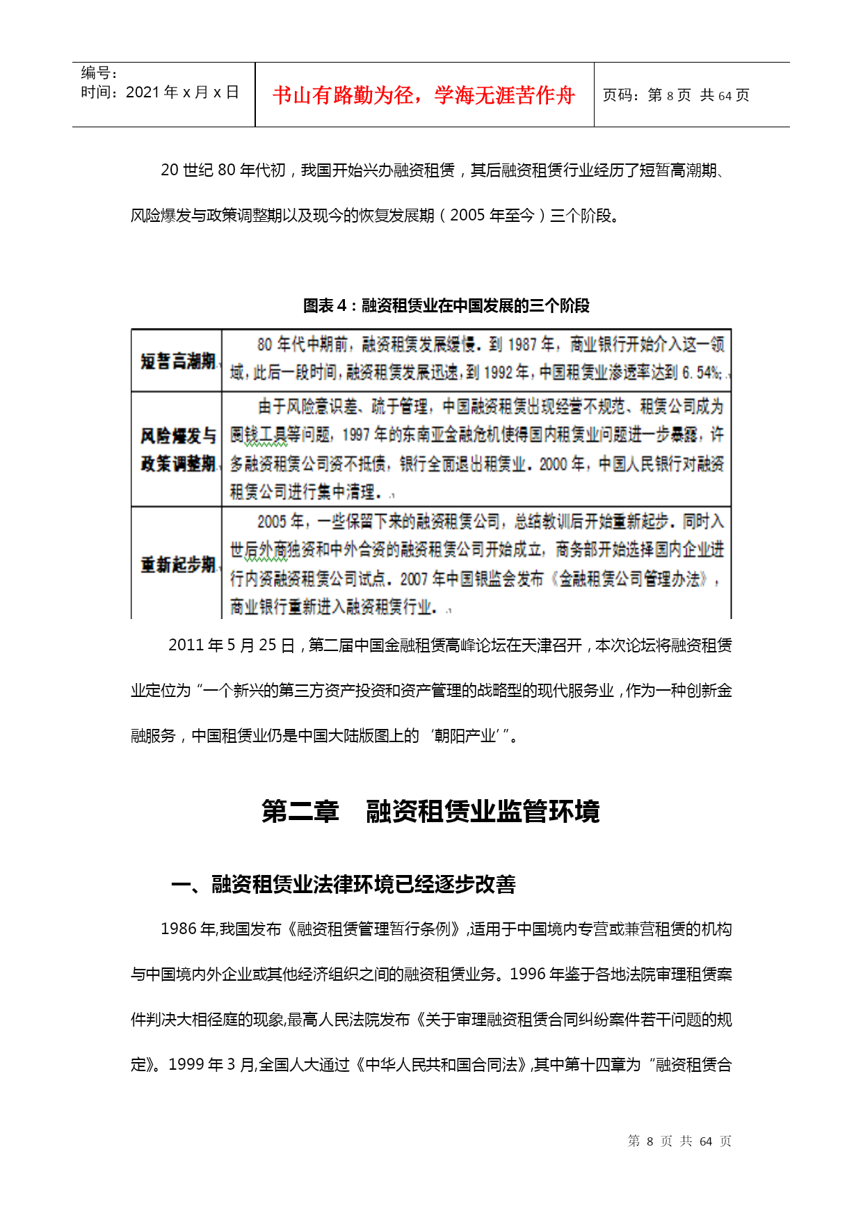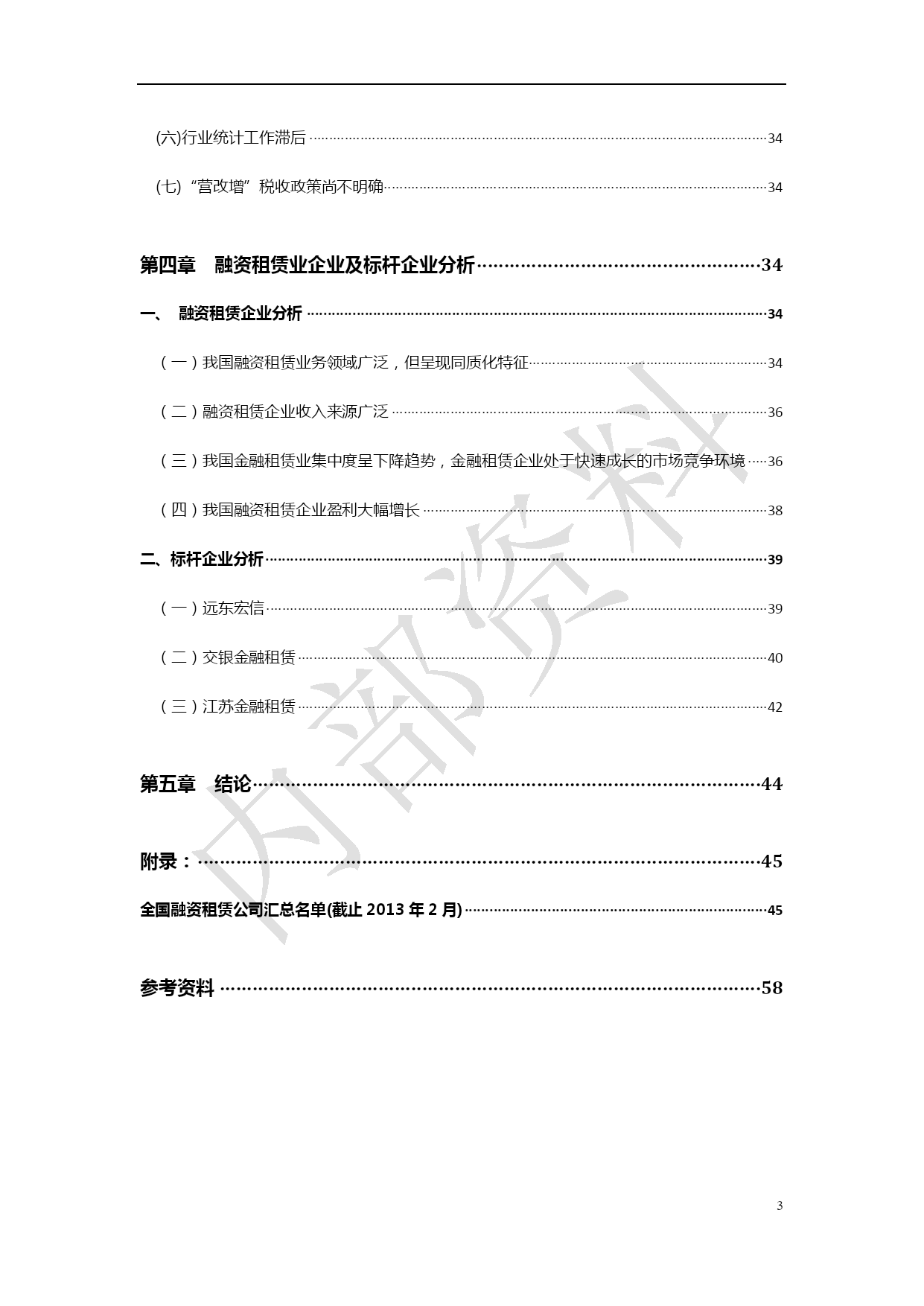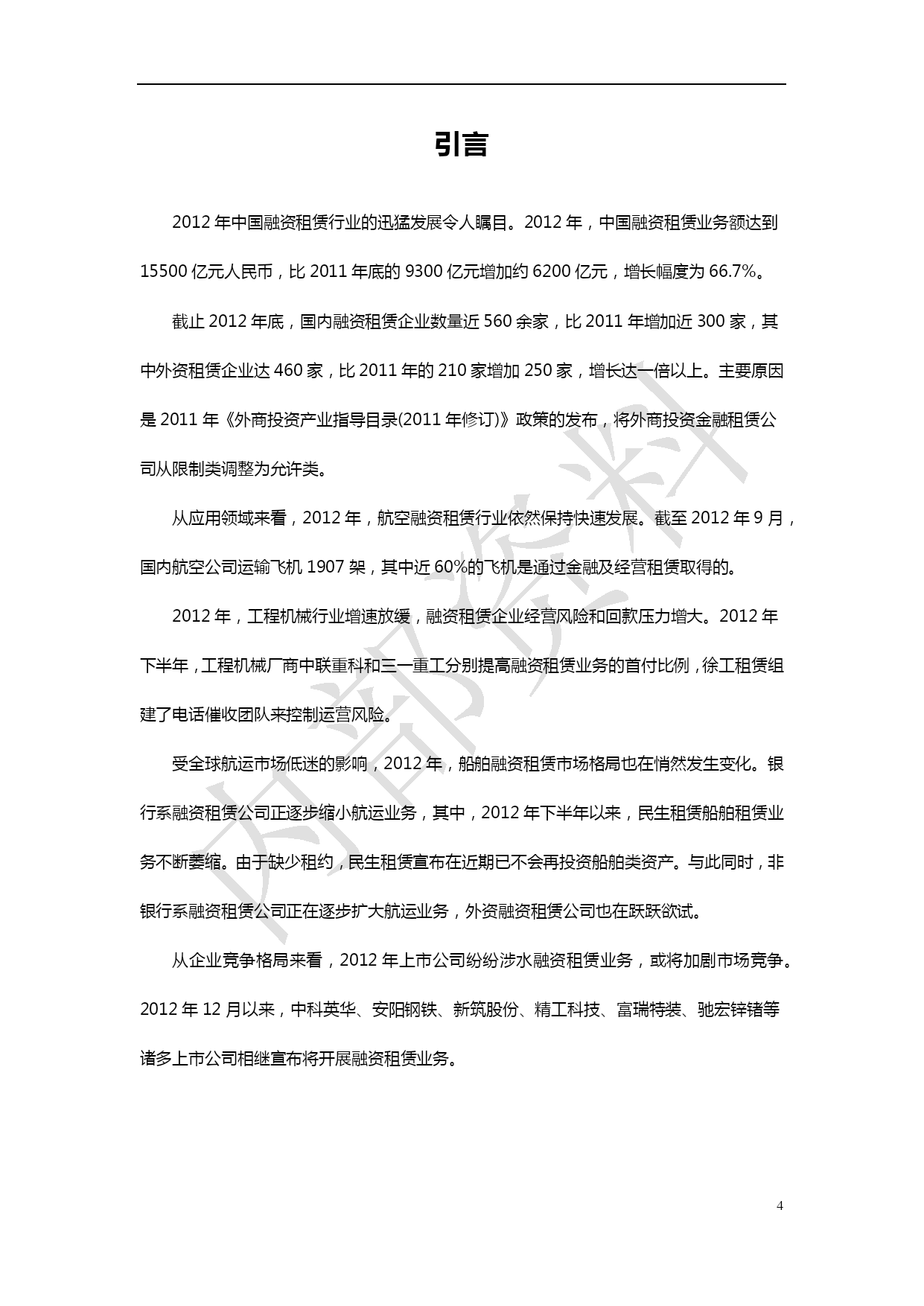 PAGE\*MERGEFORMAT4融资租赁行业分析报告2013年8月金融事业投资部目录TOC\o"1-3"\h\z\uHYPERLINK\l"_Toc365634117"引言PAGEREF_Toc365634117\h4HYPERLINK\l"_Toc365634118"第一章融资租赁概念及行业历史沿革PAGEREF_Toc365634118\h5HYPERLINK\l"_Toc365634119"一、融资租赁概念及交易结构图PAGEREF_Toc365634119\h5HYPERLINK\l"_Toc365634120"二、国际融资租赁业历史沿革PAGEREF_Toc365634120\h6HYPERLINK\l"_Toc365634121"三、我国融资租赁业历史沿革PAGEREF_Toc365634121\h7HYPERLINK\l"_Toc365634122"第二章融资租赁业监管环境PAGEREF_Toc365634122\h8HYPERLINK\l"_Toc365634123"一、融资租赁业法律环境已经逐步改善PAGEREF_Toc365634123\h8HYPERLINK\l"_Toc365634124"二、有关法律规定及比较PAGEREF_Toc365634124\h9HYPERLINK\l"_Toc365634125"(一)租赁物的物权保障PAGEREF_Toc365634125\h9HYPERLINK\l"_Toc365634126"(二)租赁物所有权的特殊性PAGEREF_Toc365634126\h9HYPERLINK\l"_Toc365634127"(三)关于租赁物所有权保全方案PAGEREF_Toc365634127\h9HYPERLINK\l"_Toc365634128"(四)关于租赁物留购PAGEREF_Toc365634128\h10HYPERLINK\l"_Toc365634129"(五)融资租赁与传统租赁比较PAGEREF_Toc365634129\h10HYPERLINK\l"_Toc365634130"(六)融资租赁与银行按揭比较PAGEREF_Toc365634130\h11HYPERLINK\l"_Toc365634131"三、融资租赁业监管格局与相关制度PAGEREF_Toc365634131\h12HYPERLINK\l"_Toc365634132"四、金融租赁股东资格PAGEREF_Toc365634132\h13HYPERLINK\l"_Toc365634133"五、融资租赁公司的资本金要求PAGEREF_Toc365634133\h13HYPERLINK\l"_Toc365634134"六、融资租赁业会计税收政策环境PAGEREF_Toc365634134\h14HYPERLINK\l"_Toc365634135"(一)税收政策PAGEREF_Toc365634135\h14HYPERLINK\l"_Toc365634136"(二)承租人和出租人涉及的税收的对比PAGEREF_Toc365634136\h14HYPERLINK\l"_Toc365634137"第三章融资租赁业行业发展PAGEREF_Toc365634137\h15HYPERLINK\l"_Toc365634138"一、国际融资租赁业增速迅猛、规模巨大PAGEREF_Toc365634138\h15HYPERLINK\l"_Toc365634139"二、我国融资租赁业处于起步阶段,市场增长潜力较大PAGEREF_Toc365634139\h16HYPERLINK\l"_Toc365634140"(一)近年融资租赁业发展PAGEREF_Toc365634140\h16HYPERLINK\l"_Toc365634141"(二)2012年融资租赁业发展PAGEREF_Toc365634141\h17HYPERLINK\l"_Toc365634142"(三)我国融资租赁业发展前景PAGEREF_Toc365634142\h21HYPERLINK\l"_Toc365634143"三、我国融资租赁业发展特点PAGEREF_Toc36563414