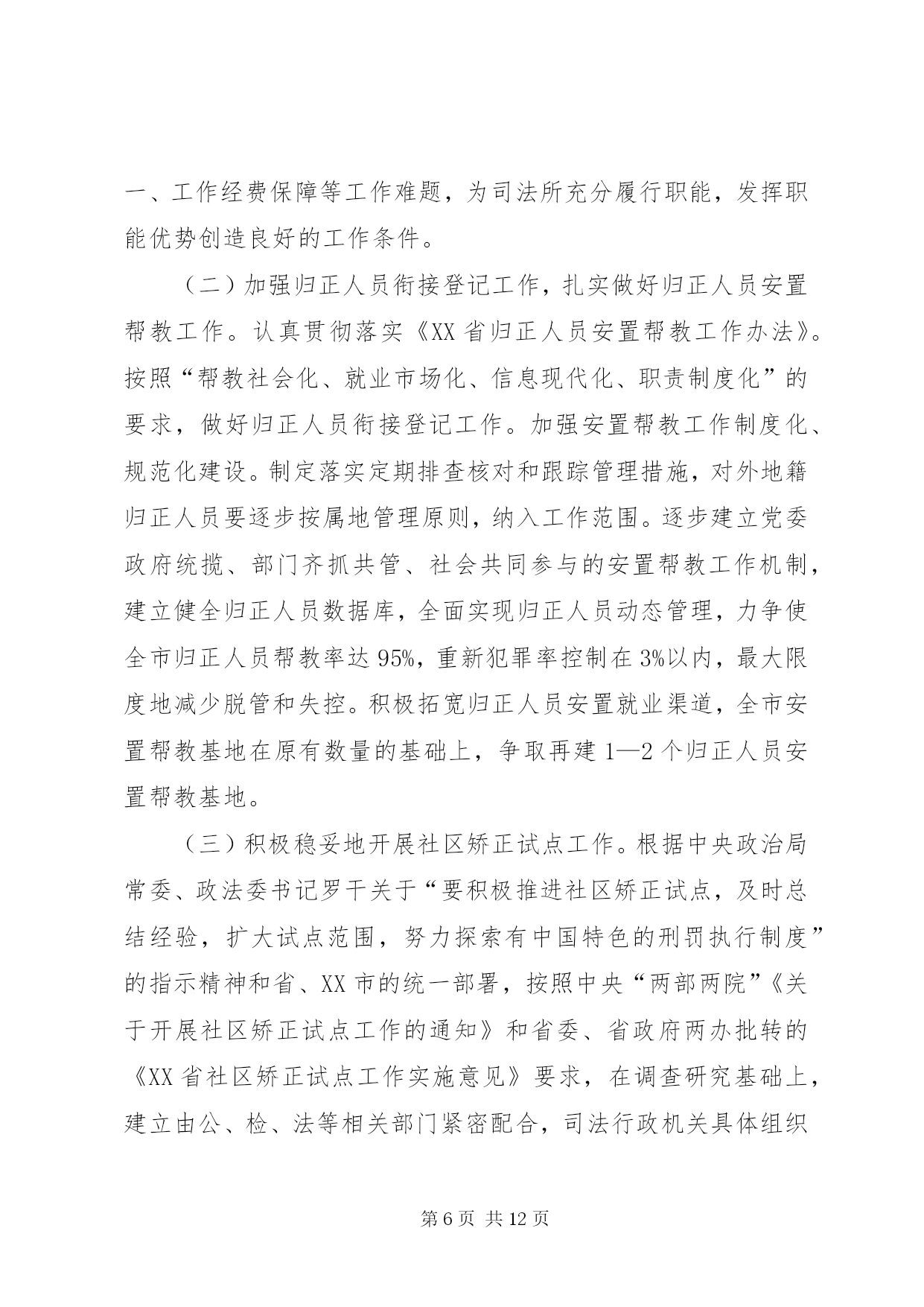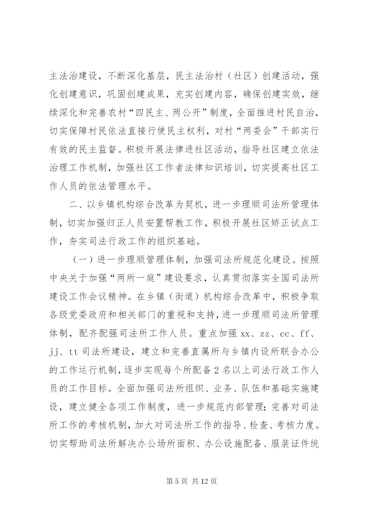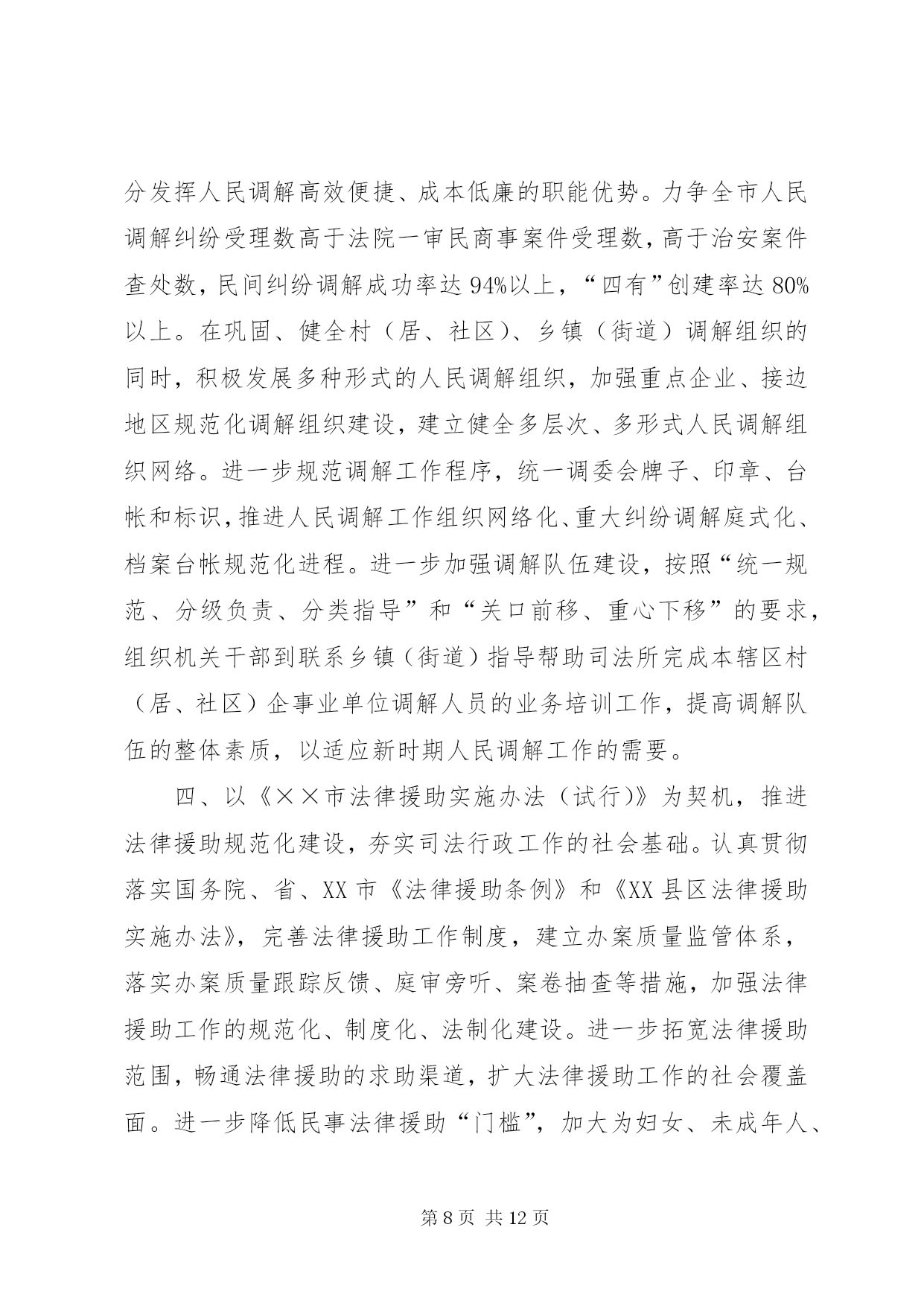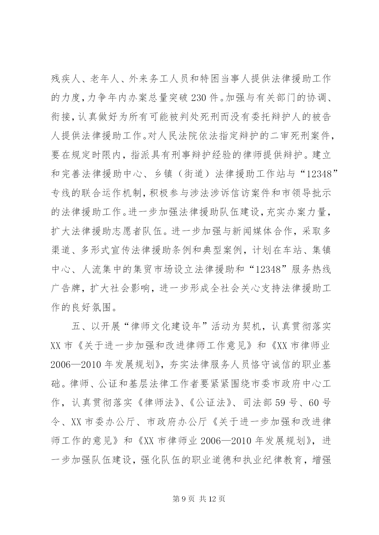 第PAGE\*Arabic\*MERGEFORMAT12页共NUMPAGES\*MERGEFORMAT12页司法局二00七年工作思路××市司法局二00七年工作思路二00七年我市司法行政工作总的指导思想是。以“三个代表”重要思想、党的十六大和十六届六中全会精神为指导,坚持科学发展观,认真贯彻落实全国基层司法所建设会议、全省司法行政工作和省委政法工作会议精神,紧紧围绕党委、政府中心工作,服务经济建设大局,切实履行司法行政工作职能,充分发挥法制宣传、法律服务和法律保障职能优势,突出办案和服务两个重点,进一步理顺司法所管理体制,加大司法所规范化建设、法律援助工作和推行人民调解“以奖代补”政策的工作力度,积极开展社区矫正试点工作,为构建社会主义和谐社会,建设“法治建德”做出新的贡献。根据这一总体思路,明年我局将着重抓好以下几项工作:一、以建设“法治××”为契机,认真组织实施《××市2006—2010年普法教育依法治市规划》,夯实司法行政工作的法治基础。二00七年是启动新一轮普法教育依法治市规划的关键之年,要在市委市政府领导与市人大的监督下,按照省、XX市的统一部署和要求,认真抓好落实,确保我市依普规划有计划按步骤地实施,使我市依普工作有新的突破。(一)认真做好乡镇(街道)2006---2010年普法教育依法治市规划的全面启动工作。按照××市依普规划和建设“法治××”的总要求,立足本单位、本部门实际,突出工作重点,体现自身的工作特色,在总结前两个五年实施依普规划工作的基础上,指导督促市级机关部门和乡镇(街道)制定本级2006---2010年普法教育依法治市规划,建立依普工作机构,落实工作班子,完善工作制度,全面抓好落实,为确保新一轮依普工作顺利实施奠定基础。(二)加强重点对象的法制教育,创新法制宣传教育工作方式。一是围绕建设“法治××”的总体要求和党委政府中心工作,深入宣传宪法和国家基本法律制度及与经济社会发展、群众生活、整顿和规范市场经济秩序、维护社会和谐稳定,促进社会公平正义等密切相关的法律法规。在全市集中开展“学法律、讲权利、讲义务、讲责任”和“法律进机关、进社区、进单位、进学校、进企业、进农村”活动。按照中央建设社会主义新农村的要求,加强农村村民的法制教育工作,重点抓好村“两委会”干部和社区工作者的法制教育和培训,切实提高基层干部的法律意识和依法管理水平。配合有关部门集中开展专项整治、反邪教和扫除黄、赌、毒等方面的法制宣传教育,促进社会和谐稳定。二是进一步加强各级领导干部学法用法,提高领导干部的依法行政、依法执政意识和能力。会同有关部门制定新一轮领导干部学法计划,完善领导干部学法用法和任前法律知识考试制度,建立领导干部学法档案和相关台帐资料。通过举办领导干部法制报告会、法制讲座等形式,促进领导干部学法用法。三是进一步加强青少年法制教育,把在校生的法制教育纳入学校教育课程。建立和完善法制副校长、普法讲师团成员的法制讲课制度。依托图书馆、文化馆、看守所等场所,加强青少年法制教育基地建设。会同市教育局组织举办全市青少年法律知识竞赛和法律知识演讲比赛,进一步增强青少年的法律意识,优化青少年法制教育环境。计划全年举办青少年法制讲座80场次。四是进一步加强公务员特别是司法、行政执法人员的法制教育,把法律知识纳入公务员招考、知识更新培训内容,建立公务员年度法律知识考试制度,将考试成绩作为公务员职级晋升的重要依据。五是进一步加强流动人员和外来务工人员的法制教育。按照属地管理和“谁用工,谁负责”的原则,把法制宣传教育与法律服务、法律援助相结合,协助有关部门开展多种形式的法制教育和培训,积极探索这一群体法制教育的工作机制,切实维护农民工的合法权益。六是进一步加强企业经营管理人员的法制教育。建立企业经营管理人员、职工法制教育和企业法律顾问工作制度。按照“谁主管、谁负责”的原则,协助企业主管部门组织开展形式多样、灵活实用的法制教育和培训,切实增强企业干部职工学法、用法、懂法、守法意识,提高依法管理水平。七是充分利用广播、电视、网络、报刊等大众媒体,开辟公益性普法教育依法治市宣传专栏。计划在六大集镇中心、国道线入城口、人流集中的车站、码(更多精彩文章来自“秘书不求人”)头设立大型依普广告牌。同时,要围绕各种法制宣传日、纪念日、物资交流等开展多种形式的法制宣传和“法制下乡”活动,全年组织“法制下乡”不少于12场次。(三)坚持“普治并举”,全面推进依法治市。按照建设“法治××”的要求,坚持学用结合、普治并举,全面贯彻实施新一轮依法治市规划,以基层、行业为重点,开展多层次、多领域的依法治理工作,全面推进依法治市。一是进一步深化行业依法治理,提高依法管理水平。针对行业特点,积极开展行业依法治理,实现各行各业的依法管理、依法行政、严格执法、