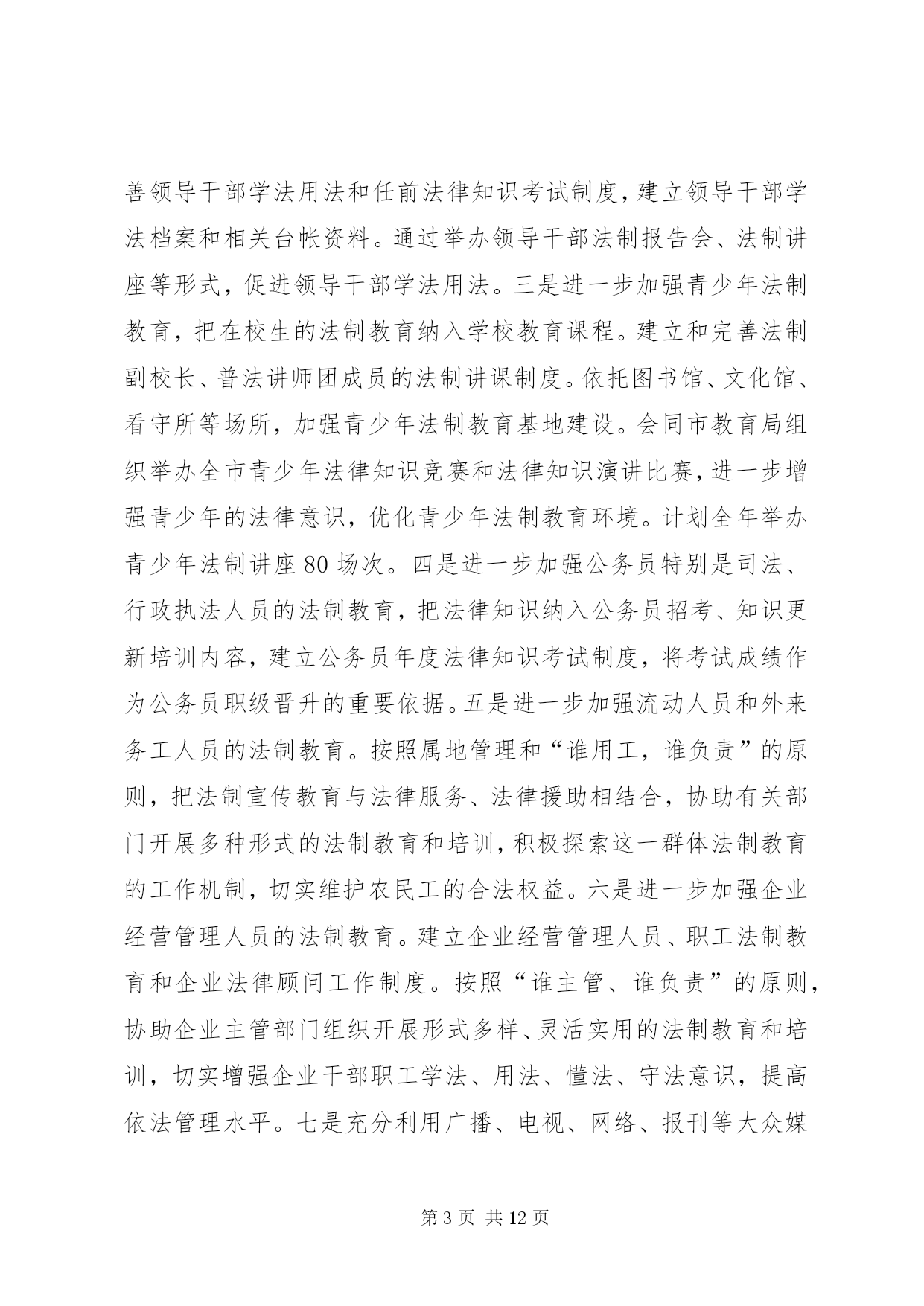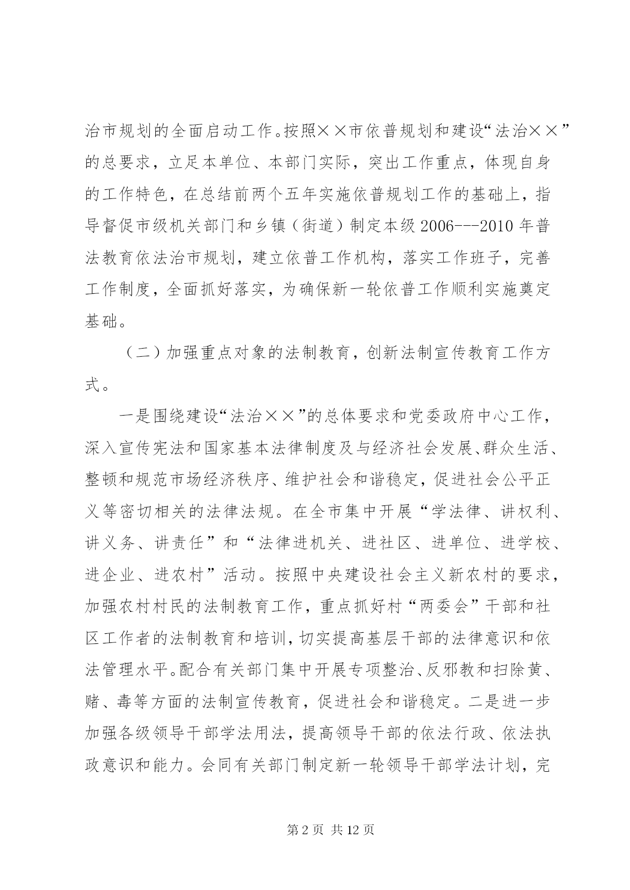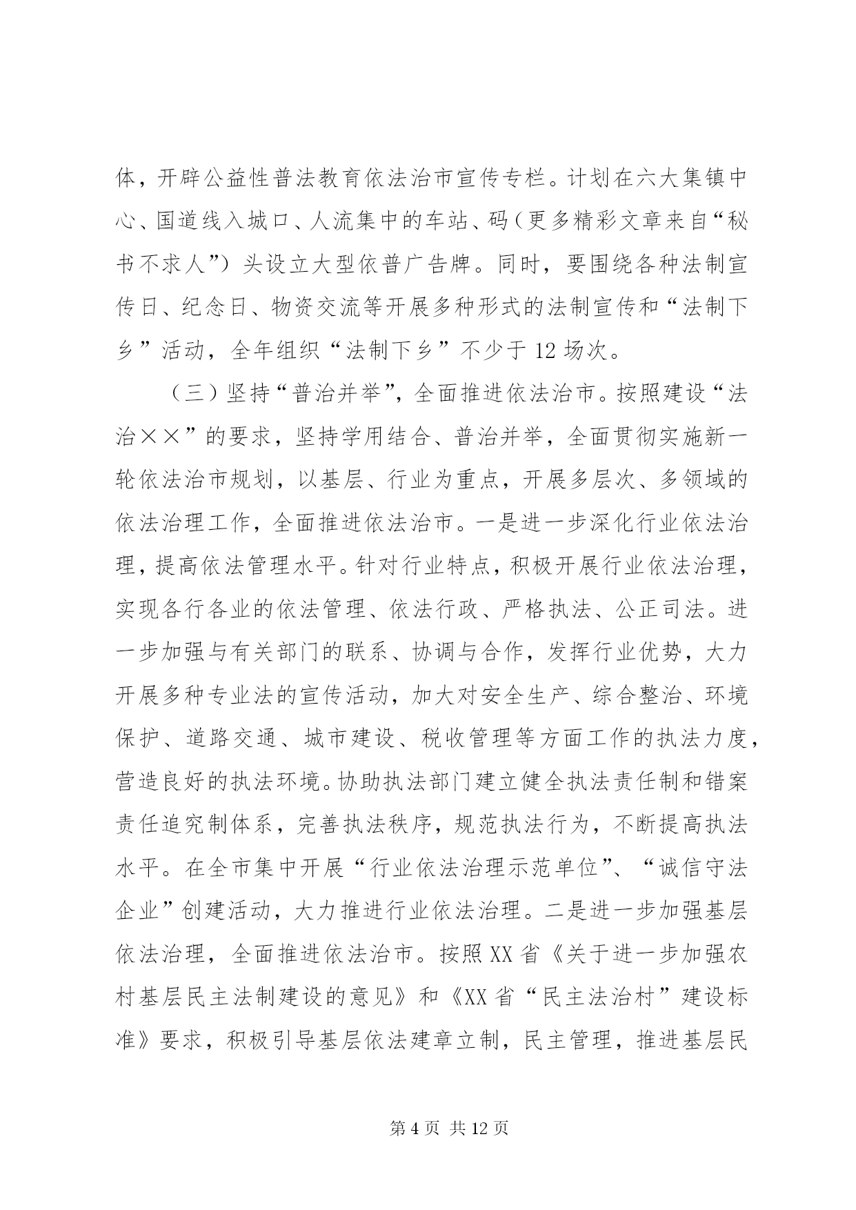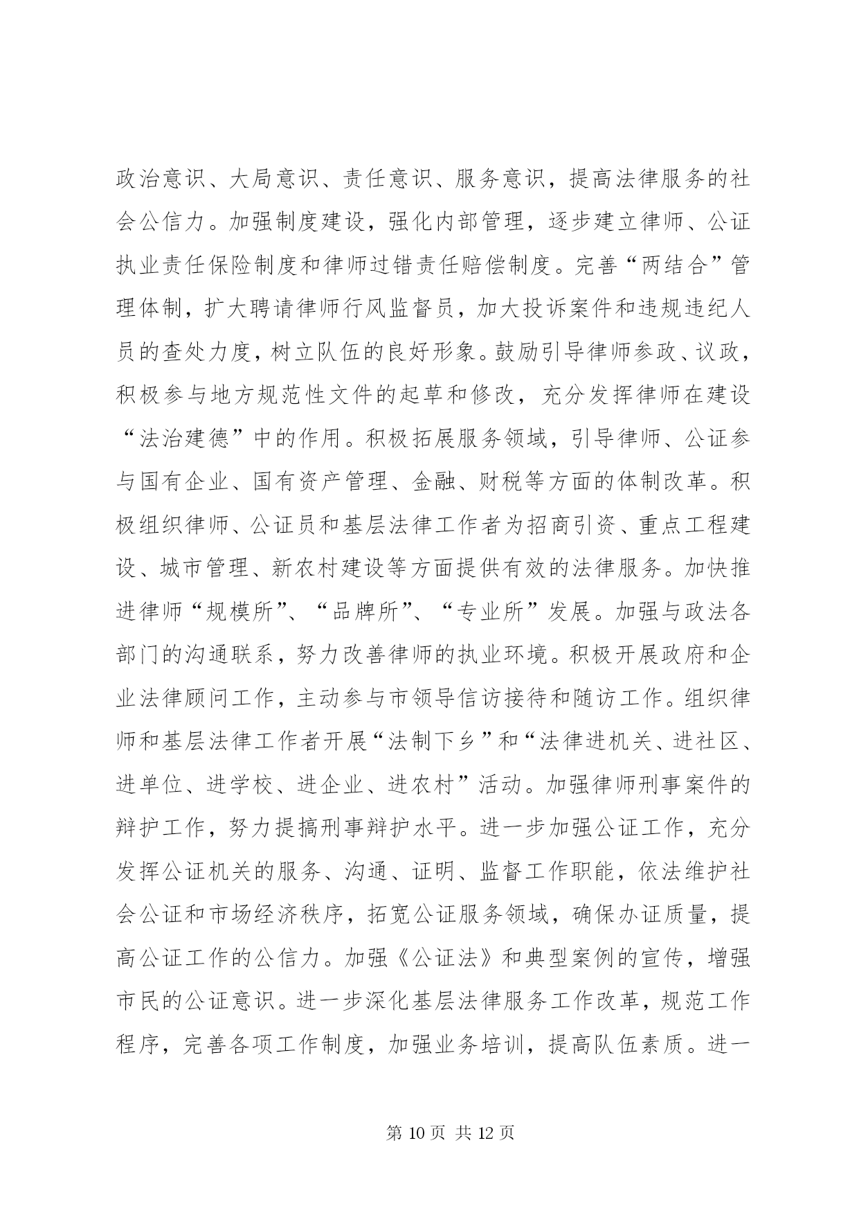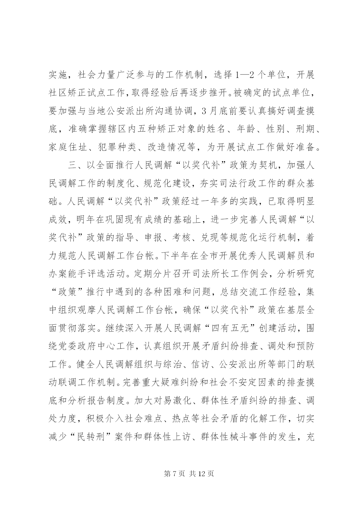第PAGE\*Arabic\*MERGEFORMAT12页共NUMPAGES\*MERGEFORMAT12页司法局二00七年工作思路××市司法局二00七年工作思路二00七年我市司法行政工作总的指导思想是。以“三个代表”重要思想、党的十六大和十六届六中全会精神为指导,坚持科学发展观,认真贯彻落实全国基层司法所建设会议、全省司法行政工作和省委政法工作会议精神,紧紧围绕党委、政府中心工作,服务经济建设大局,切实履行司法行政工作职能,充分发挥法制宣传、法律服务和法律保障职能优势,突出办案和服务两个重点,进一步理顺司法所管理体制,加大司法所规范化建设、法律援助工作和推行人民调解“以奖代补”政策的工作力度,积极开展社区矫正试点工作,为构建社会主义和谐社会,建设“法治建德”做出新的贡献。根据这一总体思路,明年我局将着重抓好以下几项工作:一、以建设“法治××”为契机,认真组织实施《××市2006—2010年普法教育依法治市规划》,夯实司法行政工作的法治基础。二00七年是启动新一轮普法教育依法治市规划的关键之年,要在市委市政府领导与市人大的监督下,按照省、XX市的统一部署和要求,认真抓好落实,确保我市依普规划有计划按步骤地实施,使我市依普工作有新的突破。(一)认真做好乡镇(街道)2006---2010年普法教育依法治市规划的全面启动工作。按照××市依普规划和建设“法治××”的总要求,立足本单位、本部门实际,突出工作重点,体现自身的工作特色,在总结前两个五年实施依普规划工作的基础上,指导督促市级机关部门和乡镇(街道)制定本级2006---2010年普法教育依法治市规划,建立依普工作机构,落实工作班子,完善工作制度,全面抓好落实,为确保新一轮依普工作顺利实施奠定基础。(二)加强重点对象的法制教育,创新法制宣传教育工作方式。一是围绕建设“法治××”的总体要求和党委政府中心工作,深入宣传宪法和国家基本法律制度及与经济社会发展、群众生活、整顿和规范市场经济秩序、维护社会和谐稳定,促进社会公平正义等密切相关的法律法规。在全市集中开展“学法律、讲权利、讲义务、讲责任”和“法律进机关、进社区、进单位、进学校、进企业、进农村”活动。按照中央建设社会主义新农村的要求,加强农村村民的法制教育工作,重点抓好村“两委会”干部和社区工作者的法制教育和培训,切实提高基层干部的法律意识和依法管理水平。配合有关部门集中开展专项整治、反邪教和扫除黄、赌、毒等方面的法制宣传教育,促进社会和谐稳定。二是进一步加强各级领导干部学法用法,提高领导干部的依法行政、依法执政意识和能力。会同有关部门制定新一轮领导干部学法计划,完善领导干部学法用法和任前法律知识考试制度,建立领导干部学法档案和相关台帐资料。通过举办领导干部法制报告会、法制讲座等形式,促进领导干部学法用法。三是进一步加强青少年法制教育,把在校生的法制教育纳入学校教育课程。建立和完善法制副校长、普法讲师团成员的法制讲课制度。依托图书馆、文化馆、看守所等场所,加强青少年法制教育基地建设。会同市教育局组织举办全市青少年法律知识竞赛和法律知识演讲比赛,进一步增强青少年的法律意识,优化青少年法制教育环境。计划全年举办青少年法制讲座80场次。四是进一步加强公务员特别是司法、行政执法人员的法制教育,把法律知识纳入公务员招考、知识更新培训内容,建立公务员年度法律知识考试制度,将考试成绩作为公务员职级晋升的重要依据。五是进一步加强流动人员和外来务工人员的法制教育。按照属地管理和“谁用工,谁负责”的原则,把法制宣传教育与法律服务、法律援助相结合,协助有关部门开展多种形式的法制教育和培训,积极探索这一群体法制教育的工作机制,切实维护农民工的合法权益。六是进一步加强企业经营管理人员的法制教育。建立企业经营管理人员、职工法制教育和企业法律顾问工作制度。按照“谁主管、谁负责”的原则,协助企业主管部门组织开展形式多样、灵活实用的法制教育和培训,切实增强企业干部职工学法、用法、懂法、守法意识,提高依法管理水平。七是充分利用广播、电视、网络、报刊等大众媒体,开辟公益性普法教育依法治市宣传专栏。计划在六大集镇中心、国道线入城口、人流集中的车站、码(更多精彩文章来自“秘书不求人”)头设立大型依普广告牌。同时,要围绕各种法制宣传日、纪念日、物资交流等开展多种形式的法制宣传和“法制下乡”活动,全年组织“法制下乡”不少于12场次。(三)坚持“普治并举”,全面推进依法治市。按照建设“法治××”的要求,坚持学用结合、普治并举,全面贯彻实施新一轮依法治市规划,以基层、行业为重点,开展多层次、多领域的依法治理工作,全面推进依法治市。一是进一步深化行业依法治理,提高依法管理水平。针对行业特点,积极开展行业依法治理,实现各行各业的依法管理、依法行政、严格执法、