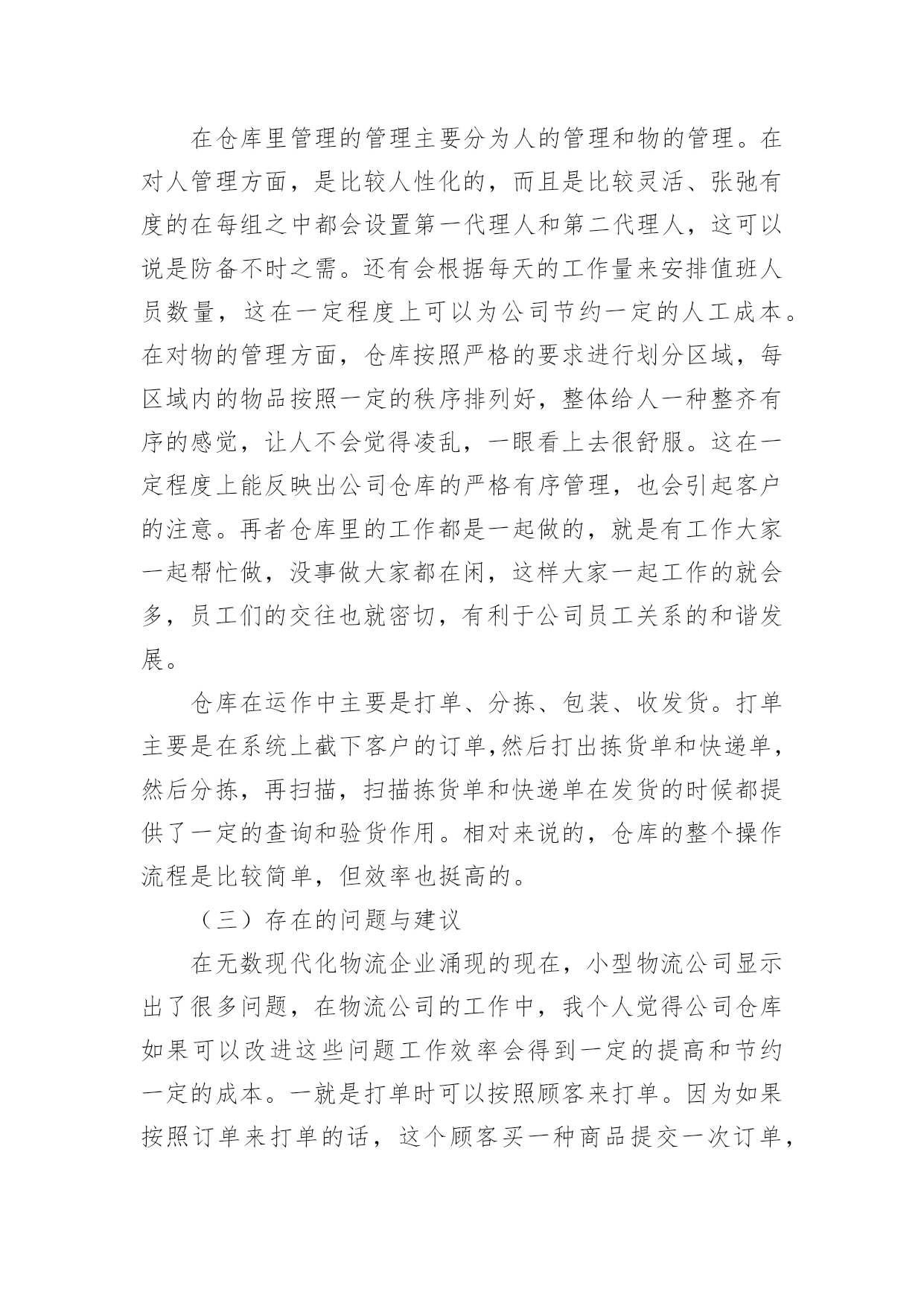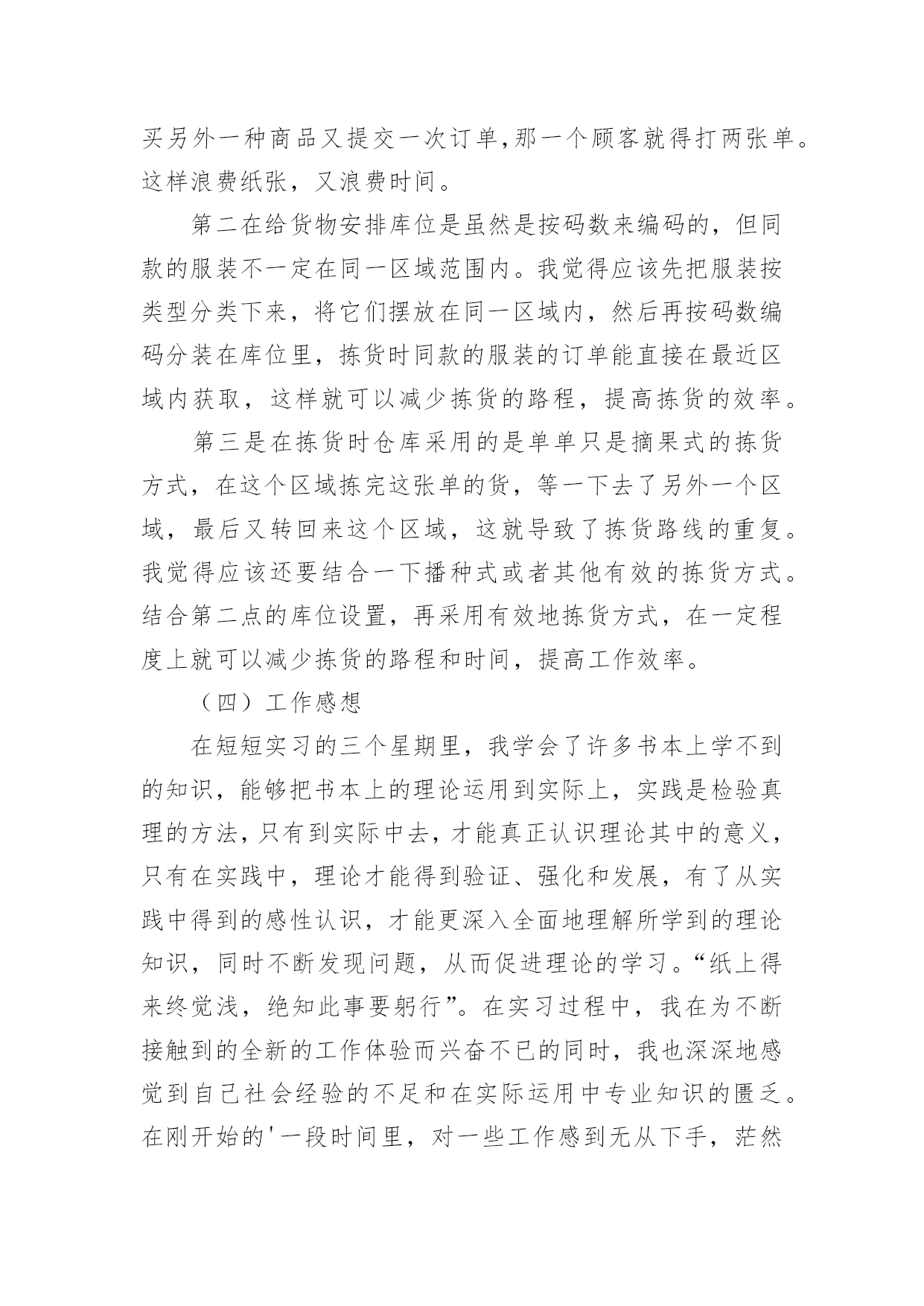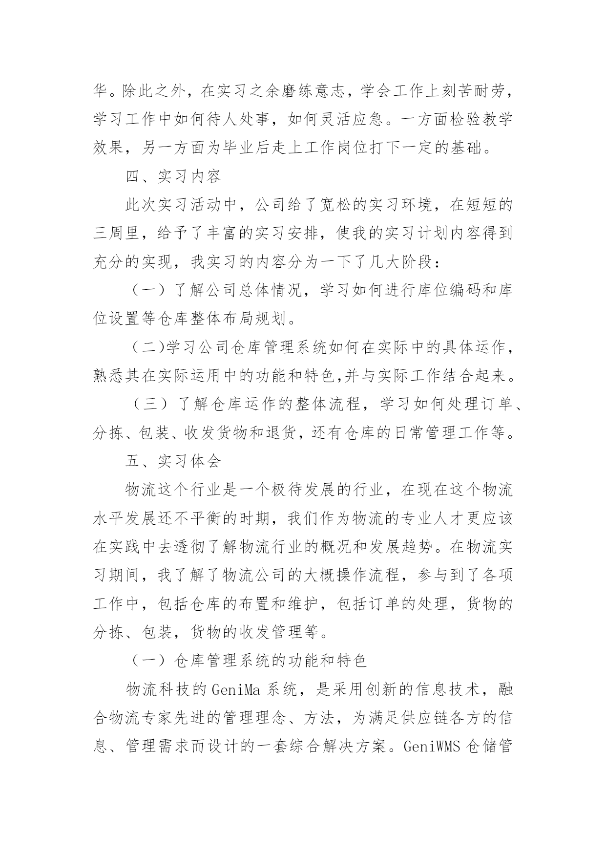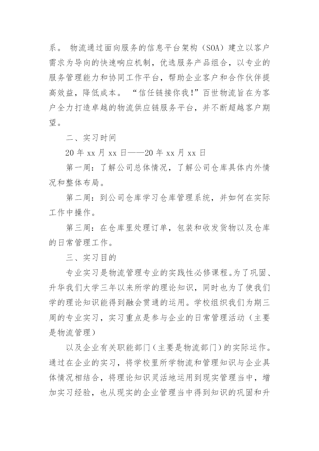 物流专业顶岗实习报告物流专业顶岗实习报告范文随着个人的素质不断提高,报告使用的次数愈发增长,我们在写报告的时候要注意逻辑的合理性。相信很多朋友都对写报告感到非常苦恼吧,下面是小编帮大家整理的物流专业顶岗实习报告范文,仅供参考,希望能够帮助到大家。物流专业顶岗实习报告范文1一、实习单位及地址名称:公司地址:仓库公司简介:物流科技(中国)有限公司是由信息技术和供应链资深专家联合组建的创新型综合物流供应链服务提供商。物流成立于20年,中国区总部扎根于,目前已在全国范围内建立多级营运中心,配送网络覆盖全国四、六级城市。通过完整、系统的合作伙伴认证管理体系,专业的供应链解决方案设计,先进的信息技术和公司自行研发的综合营运平台GeniMa系统为国内外企业提供综合供应链设计与优化,电子物流与网络化仓储管理、干线运输、区域和同城配送等一站式物流管理外包服务。目前已有超过200家企业通过与合作,有效改善了供应链管理并享受精准的物流服务,其中包括等多家合作伙伴将百世纳入年度战略合作伙伴体系。物流通过面向服务的信息平台架构(SOA)建立以客户需求为导向的快速响应机制,优选服务产品组合,以专业的服务管理能力和协同工作平台,帮助企业客户和合作伙伴提高效益,降低成本。“信任链接你我!”百世物流旨在为客户全力打造卓越的物流供应链服务平台,并不断超越客户期望。二、实习时间20年xx月xx日——20年xx月xx日第一周:了解公司总体情况,了解公司仓库具体内外情况和整体布局。第二周:到公司仓库学习仓库管理系统,并如何在实际工作中操作。第三周:在仓库里处理订单,包装和收发货物以及仓库的日常管理工作。三、实习目的专业实习是物流管理专业的实践性必修课程。为了巩固、升华我们大学三年以来所学的理论知识,同时也为了使我们学的理论知识能得到融会贯通的运用。学校组织我们为期三周的专业实习,实习重点是参与企业的日常管理活动(主要是物流管理)以及企业有关职能部门(主要是物流部门)的实际运作。通过在企业的实习,将学校里所学物流和管理知识与企业具体情况相结合,将理论知识灵活地运用到现实管理当中,增加实习经验,也从现实的企业管理当中得到知识的巩固和升华。除此之外,在实习之余磨练意志,学会工作上刻苦耐劳,学习工作中如何待人处事,如何灵活应急。一方面检验教学效果,另一方面为毕业后走上工作岗位打下一定的基础。四、实习内容此次实习活动中,公司给了宽松的实习环境,在短短的三周里,给予了丰富的实习安排,使我的实习计划内容得到充分的实现,我实习的内容分为一下了几大阶段:(一)了解公司总体情况,学习如何进行库位编码和库位设置等仓库整体布局规划。(二)学习公司仓库管理系统如何在实际中的具体运作,熟悉其在实际运用中的功能和特色,并与实际工作结合起来。(三)了解仓库运作的整体流程,学习如何处理订单、分拣、包装、收发货物和退货,还有仓库的日常管理工作等。五、实习体会物流这个行业是一个极待发展的行业,在现在这个物流水平发展还不平衡的时期,我们作为物流的专业人才更应该在实践中去透彻了解物流行业的概况和发展趋势。在物流实习期间,我了解了物流公司的大概操作流程,参与到了各项工作中,包括仓库的布置和维护,包括订单的处理,货物的分拣、包装,货物的收发管理等。(一)仓库管理系统的功能和特色物流科技的GeniMa系统,是采用创新的信息技术,融合物流专家先进的管理理念、方法,为满足供应链各方的信息、管理需求而设计的一套综合解决方案。GeniWMS仓储管理系统是一个按照各种业务规则,对仓库信息、资源、行为、库存和分销运作进行实时、优化管理的应用系统。实现分布式、网络化仓库集中管理的统一集成解决方案,化满足有效产出和精确性操作的要求。从原材料到成品,从人员到设备,与物流GeniTrans系统的无缝对接,保证客户对整条物流供应链掌控;全程地实时监控货物状态并保障货物无破损,降低客户库存成本;及时快速的订单执行,迅速解决客户物流需求。物流的仓储管理系统有以下功能:多组织管理、多仓业务处理,多客户、多仓多货物存储,多级包装自定义货物属性,精确的货物仓储管理,上架与拣货操作的推荐、指导,跨仓库的货物分拨与调拨,分销货主货物属性全方位转移,可配置的业务流程和业务规则设定,详尽的库存交易跟踪与多纬度的查询机制,货物包装设定能根据需要进行灵活的组合、分解,客户终端自定义人机界面,多级权限管理。有以下特色:“我的仓库”—客户人性化的透明管理(具体可实现:对货物存储用户全程透明的仓储管理、供存储货物客户直接在线库存查询与分析、提供存储货物客户实时管理仓库货物、货物客户通过下达分拨/调拨指令,能进行直接的作业指导,以及通过下达盘点指令以实时平衡库存、助客户有效的管理自己的资产,减少库存费用,提高分销渠道的管理效率)、强大而灵活的系统配置功能、无缝的
