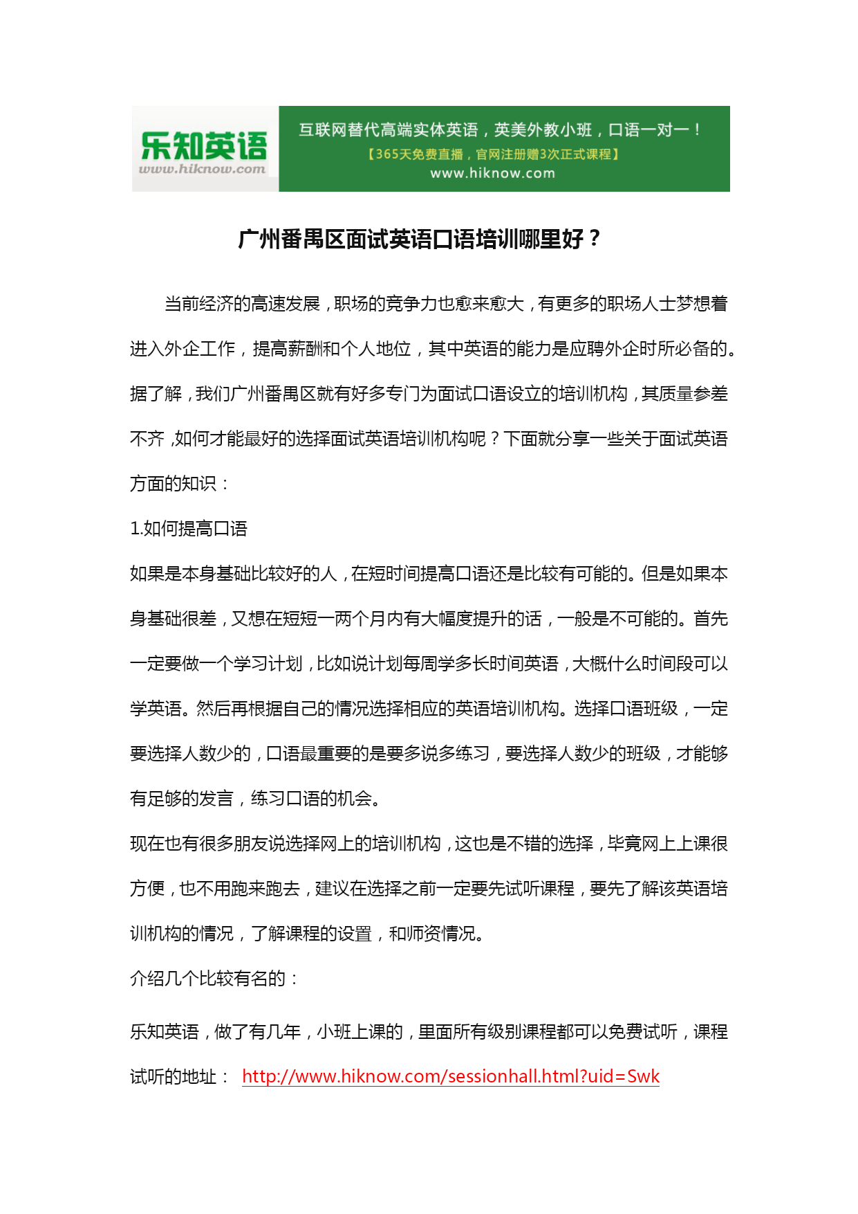 广州番禺区面试英语口语培训哪里好?当前经济的高速发展,职场的竞争力也愈来愈大,有更多的职场人士梦想着进入外企工作,提高薪酬和个人地位,其中英语的能力是应聘外企时所必备的。据了解,我们广州番禺区就有好多专门为面试口语设立的培训机构,其质量参差不齐,如何才能最好的选择面试英语培训机构呢?下面就分享一些关于面试英语方面的知识:1.如何提高口语如果是本身基础比较好的人,在短时间提高口语还是比较有可能的。但是如果本身基础很差,又想在短短一两个月内有大幅度提升的话,一般是不可能的。首先一定要做一个学习计划,比如说计划每周学多长时间英语,大概什么时间段可以学英语。然后再根据自己的情况选择相应的英语培训机构。选择口语班级,一定要选择人数少的,口语最重要的是要多说多练习,要选择人数少的班级,才能够有足够的发言,练习口语的机会。现在也有很多朋友说选择网上的培训机构,这也是不错的选择,毕竟网上上课很方便,也不用跑来跑去,建议在选择之前一定要先试听课程,要先了解该英语培训机构的情况,了解课程的设置,和师资情况。介绍几个比较有名的:乐知英语,做了有几年,小班上课的,里面所有级别课程都可以免费试听,课程试听的地址:HYPERLINK"http://www.hiknow.com/sessionhall.html?uid=Swk"http://www.hiknow.com/sessionhall.html?uid=Swk英孚英语,实体学校做的比较好,就是价格很贵。新东方,个人觉得更适合应试。2.面试自我介绍忌面面俱到尽管有人认为面试时做自我介绍不流行了,但是准备一份正常语速下3分钟长度的英文自我简介是必要的。简介尽量简单,同时要突出重点,这样才能吸引面试官的注意力。所以,前奏一般用一句话陈述自己的基本特征即可。然后迅速进入正题,或选择自己最引以为傲的经历叙述,或介绍自己的长处。面试官一般会承接你的自我介绍发问,所以在做自我介绍时最好不要提特别难于讲清楚的事情和比较抽象的概念,如果你的英文水平只够应付普通会话,在身处高度紧张的面试氛围中,哪里还能够应对自如。