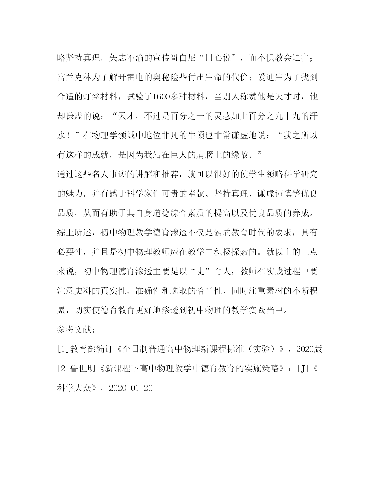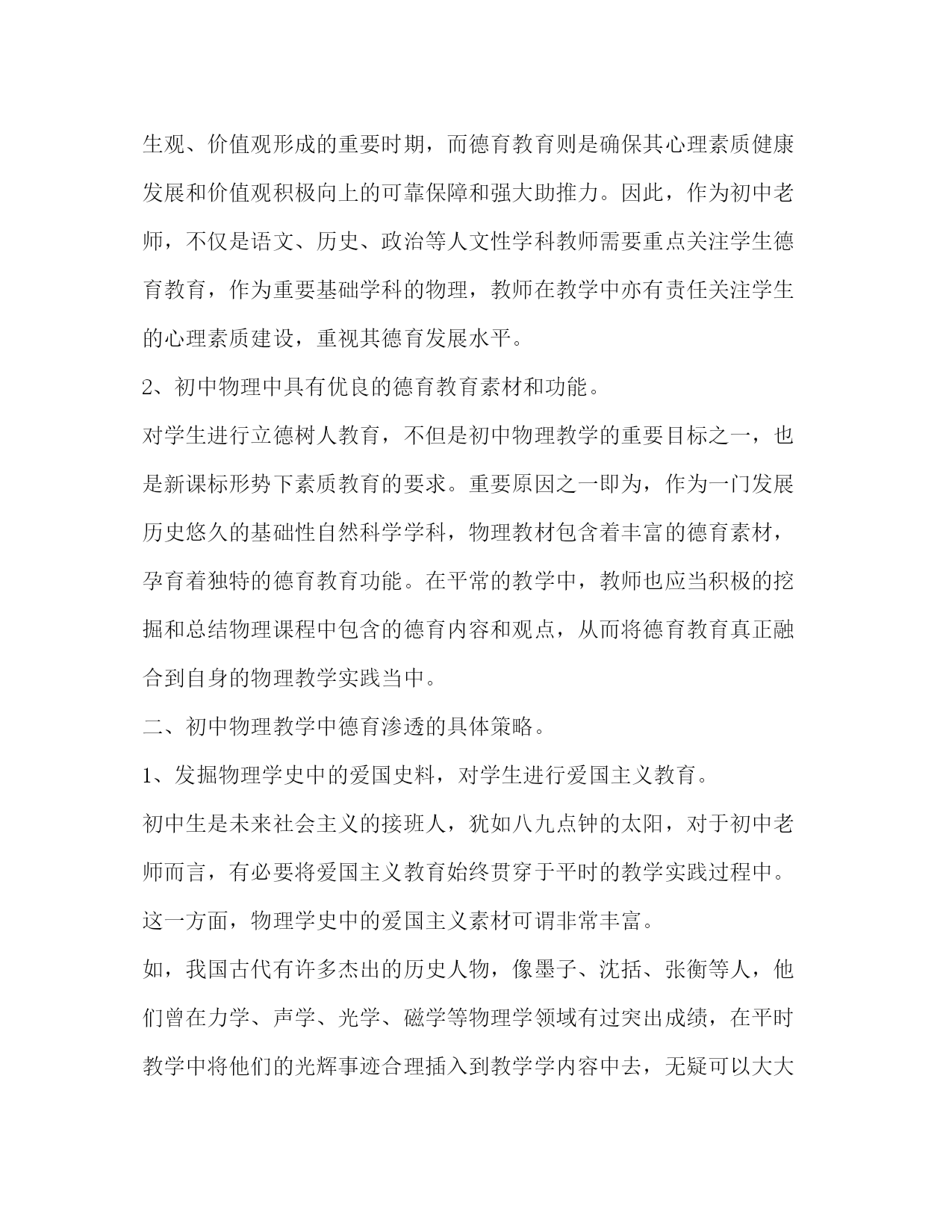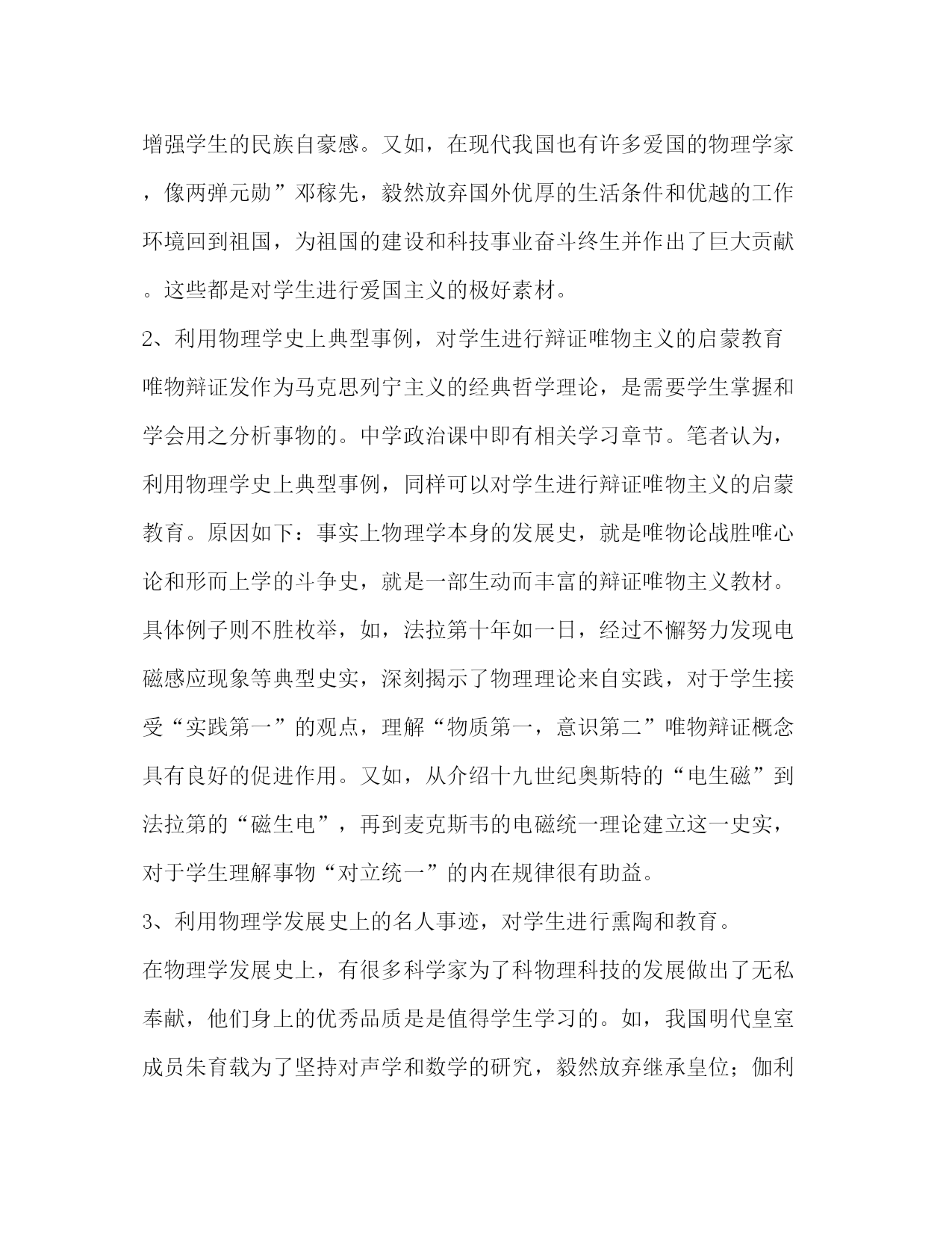 PAGE此资料由网络收集而来,如有侵权请告知上传者立即删除。资料共分享,我们负责传递知识。初中物理教学德育渗透理论浅析摘要:随着新课改进程不断开展深入,初中物理教学德育渗透理论日益引起教师队伍的重视。如何在教学实践中切实增进学生德育教育,已成为许多初中物理教师在教学实践中积极探索的课题。本文作者结合自身教学实践认为,初中物理德育渗透可以采取以“史”育人的方式,教师在实践过程中要注意史料的真实性、准确性和选取的恰当性,同时注重素材的不断积累,切实使德育教育更好地渗透到初中物理的教学实践当中。关键词:初中物理;德育渗透;物理教学隨着新课改进程不断开展深入,初中物理教学德育渗透理论日益引起教师队伍的重视。如何在教学实践中实增进学生德育教育,已成为许多初中物理教师在教学实践中积极探索的课题。在本文中,笔者拟结合自身教学实践,就初中物理教学德育渗透这一话题作一简单探讨,旨在抛砖引玉,引起广大同仁对此一领域的研究兴趣与积极探索。一、初中物理教学德育渗透的必要性。1、初中时代是学生接受德育教育的关键时期。学生进入初中后,生理上进入青春期的快速发育阶段,心理上也进入了由青涩向成熟转变的关键性建设阶段。这一时期是学生世界观、人生观、价值观形成的重要时期,而德育教育则是确保其心理素质健康发展和价值观积极向上的可靠保障和强大助推力。因此,作为初中老师,不仅是语文、历史、政治等人文性学科教师需要重点关注学生德育教育,作为重要基础学科的物理,教师在教学中亦有责任关注学生的心理素质建设,重视其德育发展水平。2、初中物理中具有优良的德育教育素材和功能。对学生进行立德树人教育,不但是初中物理教学的重要目标之一,也是新课标形势下素质教育的要求。重要原因之一即为,作为一门发展历史悠久的基础性自然科学学科,物理教材包含着丰富的德育素材,孕育着独特的德育教育功能。在平常的教学中,教师也应当积极的挖掘和总结物理课程中包含的德育内容和观点,从而将德育教育真正融合到自身的物理教学实践当中。二、初中物理教学中德育渗透的具体策略。1、发掘物理学史中的爱国史料,对学生进行爱国主义教育。初中生是未来社会主义的接班人,犹如八九点钟的太阳,对于初中老师而言,有必要将爱国主义教育始终贯穿于平时的教学实践过程中。这一方面,物理学史中的爱国主义素材可谓非常丰富。如,我国古代有许多杰出的历史人物,像墨子、沈括、张衡等人,他们曾在力学、声学、光学、磁学等物理学领域有过突出成绩,在平时教学中将他们的光辉事迹合理插入到教学学内容中去,无疑可以大大增强学生的民族自豪感。又如,在现代我国也有许多爱国的物理学家,像两弹元勋”邓稼先,毅然放弃国外优厚的生活条件和优越的工作环境回到祖国,为祖国的建设和科技事业奋斗终生并作出了巨大贡献。这些都是对学生进行爱国主义的极好素材。2、利用物理学史上典型事例,对学生进行辩证唯物主义的启蒙教育唯物辩证发作为马克思列宁主义的经典哲学理论,是需要学生掌握和学会用之分析事物的。中学政治课中即有相关学习章节。笔者认为,利用物理学史上典型事例,同样可以对学生进行辩证唯物主义的启蒙教育。原因如下:事实上物理学本身的发展史,就是唯物论战胜唯心论和形而上学的斗争史,就是一部生动而丰富的辩证唯物主义教材。具体例子则不胜枚举,如,法拉第十年如一日,经过不懈努力发现电磁感应现象等典型史实,深刻揭示了物理理论来自实践,对于学生接受“实践第一”的观点,理解“物质第一,意识第二”唯物辩证概念具有良好的促进作用。又如,从介绍十九世纪奥斯特的“电生磁”到法拉第的“磁生电”,再到麦克斯韦的电磁统一理论建立这一史实,对于学生理解事物“对立统一”的内在规律很有助益。3、利用物理学发展史上的名人事迹,对学生进行熏陶和教育。在物理学发展史上,有很多科学家为了科物理科技的发展做出了无私奉献,他们身上的优秀品质是是值得学生学习的。如,我国明代皇室成员朱育载为了坚持对声学和数学的研究,毅然放弃继承皇位;伽利略坚持真理,矢志不渝的宣传哥白尼“日心说”,而不惧教会迫害;富兰克林为了解开雷电的奥秘险些付出生命的代价;爱迪生为了找到合适的灯丝材料,试验了1600多种材料,当别人称赞他是天才时,他却谦虚的说:“天才,不过是百分之一的灵感加上百分之九十九的汗水!”在物理学领域中地位非凡的牛顿也非常谦虚地说:“我之所以有这样的成就,是因为我站在巨人的肩膀上的缘故。”通过这些名人事迹的讲解和推荐,就可以很好的使学生领略科学研究的魅力,并有感于科学家们可贵的奉献、坚持真理、谦虚谨慎等优良品质,从而有助于其自身道德综合素质的提高以及优良品质的养成。综上所述,初中物理教学德育渗透不仅是素质教育时代的要求,具有必要性,并且是初中物理教师应在教学中积极探索的。就以上的三点来说,初中物理德育渗透主要是以“史”育人,教师在实践过