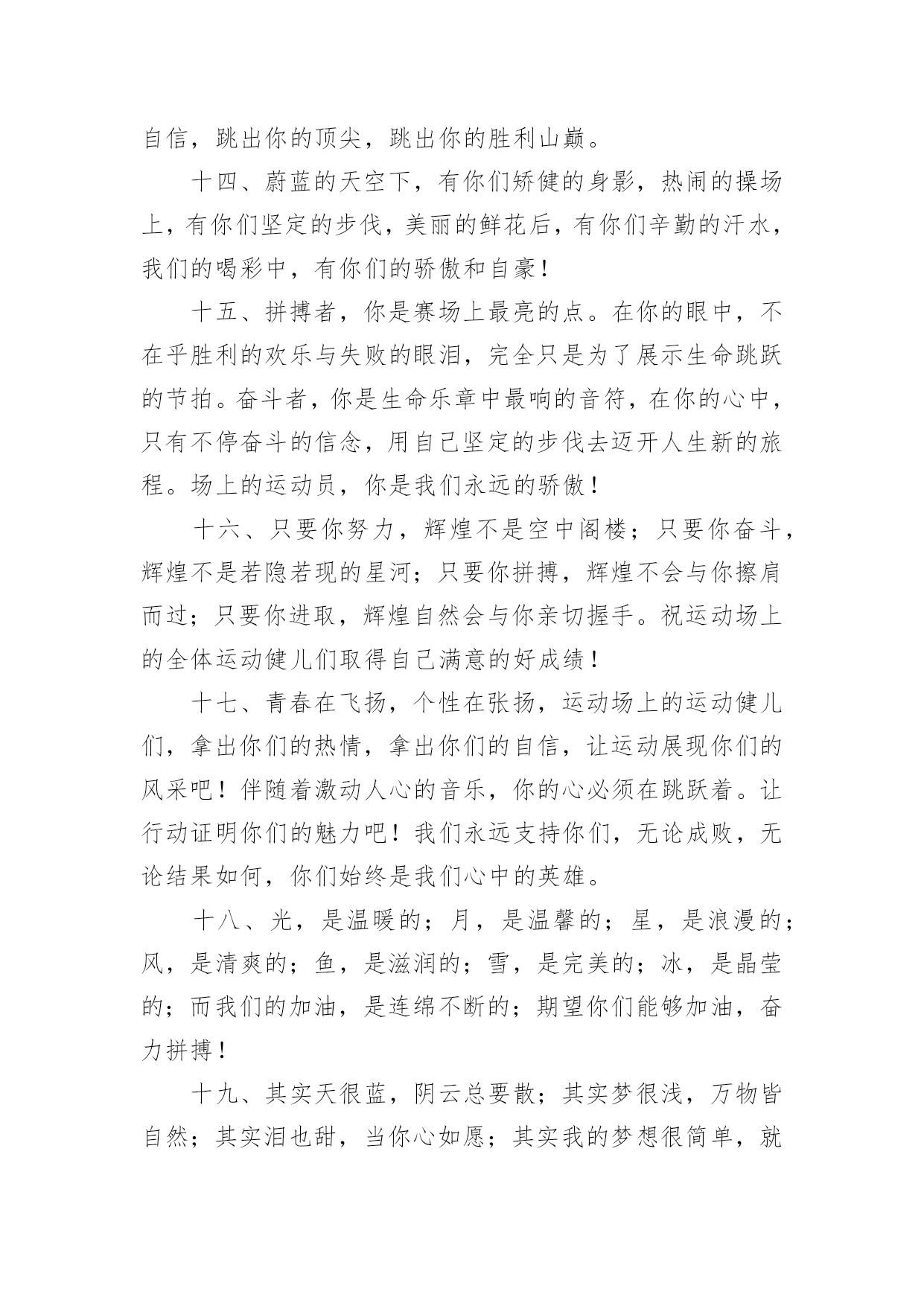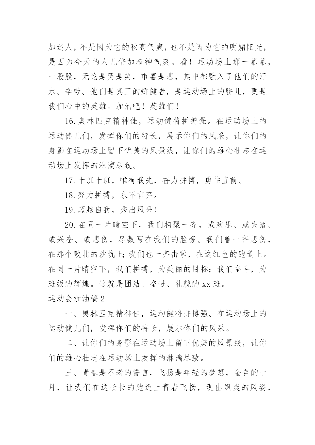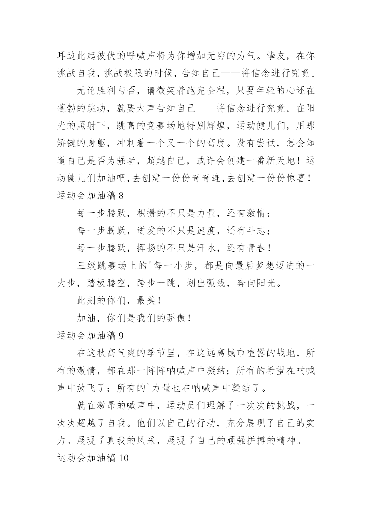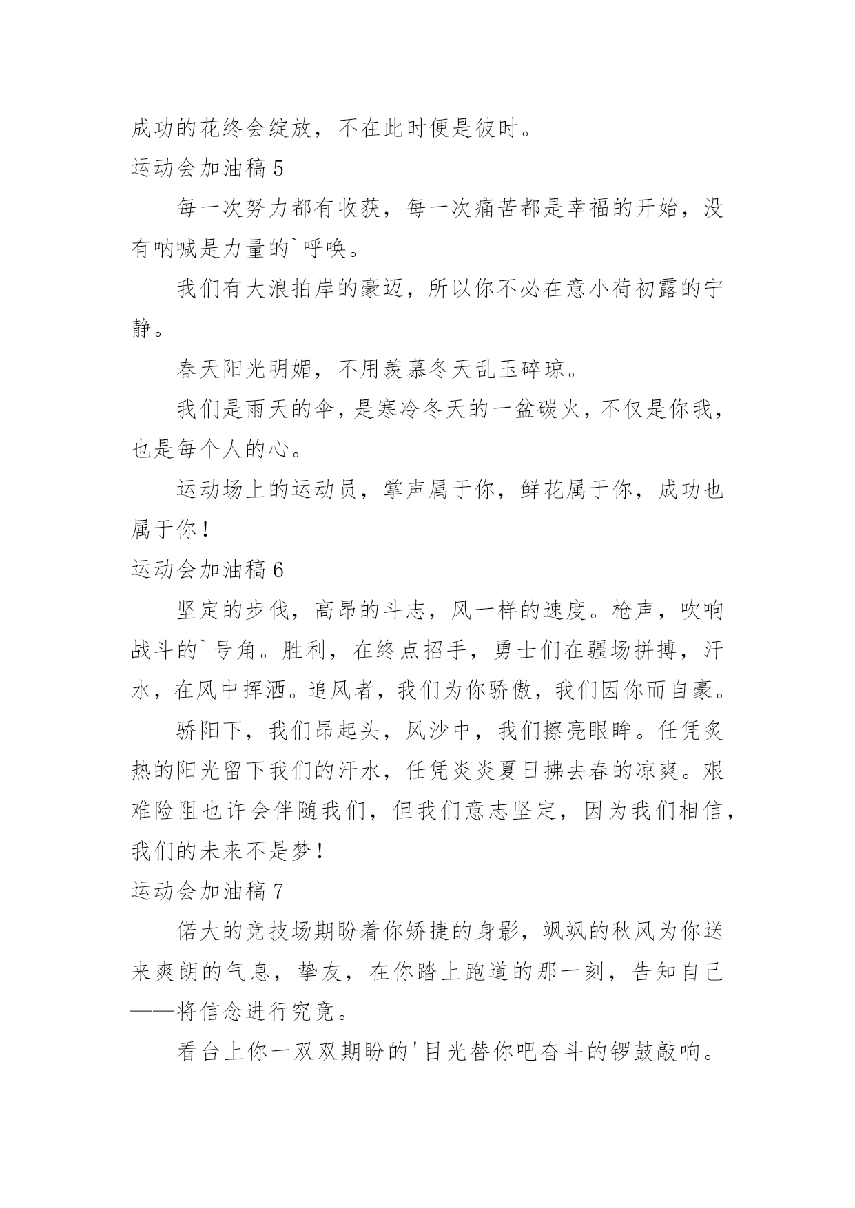 运动会加油稿运动会加油稿在现实社会中,越来越多地方需要用到加油稿,加油稿可以激励对方更好地参加活动。那要怎么写好加油稿呢?下面是小编为大家收集的运动会加油稿,供大家参考借鉴,希望可以帮助到有需要的朋友。运动会加油稿11.不卑不亢,奋发向上,生命辉煌,我们开创。2.龙腾虎跃,雷霆万钧,无与伦比,万众一心。3.青春无畏,逐梦扬威!4.沉甸甸的铅球,寄托着你的希望,奋力一抛的瞬间,一道闪亮的弧线划破美丽的长空,希望向前,再向前!你胜利了,望着远方红色的终点线,那是汗水铺成的路,泪水堆成的山,平时的努力与奋战,不就为这一瞬间,于是你们用尽全身力气,冲向那决定命运的红线,你胜利了,耳旁飘来了同学们的欢呼与赞叹。5.每一份辛劳都有一份收获,每一次的痛苦都是快乐的开始,没一声呐喊都是力量的呼唤。我们有着大浪拍岸的豪迈,所以你不必在乎小荷初露的恬静,我们有着春日的阳光明媚,所以不用去羡慕冬日乱玉碎琼,我们是雨天的一把伞,是寒冷冬日里的一盆碳火,温暖的不只是你我,而是大家的心。运动场上的健儿,掌声属于你们,鲜花属于你们,成功也是属于你们!6.龙腾虎跃,雷霆万钧,无与伦比,万众一心。7.“路上再多崎岖,我们有壮志雄心,就算跌倒也不放弃……”GO!GO!GO!拿出你们炽热的心,赛出崭新的自己,赢得最后的胜利!瞧,胜利的光环离你们越来越近,相信自己,坚持就是胜利!我们永远支持你们——运动员们!8.也许流星并不少见,但它燃烧的刹那,留给人间最美丽的回忆!也许笑脸并不少见,但胜利的喜悦,总会留给世界精彩的一瞬!是的`,那些曾经美妙的东西只有短短的一瞬间,但那却把最辉煌的一刻留给了人间。胜利,是每个人所追求的,胜利的喜悦,是胜利与重新开始的转折,胜利是新的开始!9.风起云涌,日出东方,唯有八班,再创辉煌。10.x班一出,谁与争锋,横扫赛场,唯我称雄。11.生命的意义在于奋斗,青春的意义在于拼搏,我们的激-情在燃烧,我们的活力在四射,在今天这激动人心的日子里,运动健儿们请发挥你们的风采本色吧。12.海燕在大海上翱翔,雄鹰在搏击长空,你奔驰在赛场上,电脑艺术06-1班的“xx”希望你可以勇往直前,向前胜利的彼岸,冲吧!我们一直都会支持你!13.拼搏,拼搏,再拼搏,奋斗,奋斗,再奋斗!14.命运全在拼击,奋斗就是希望。15.秋风羽,天气淡淡的转凉。然而这人的秋在今天更加迷人,不是因为它的秋高气爽,也不是因为它的明媚阳光,是因为今天的人儿倍加精神气爽。看!运动场上那一幕幕,一股股,无论是哭是笑,市喜是悲,其中都融入了他们的汗水、辛劳。他们是真正的矫健者,是运动场上的骄儿,更是我们心中的英雄。加油吧!英雄们!16.奥林匹克精神佳,运动健将拼搏强。在运动场上的运动健儿们,发挥你们的特长,展示你们的风采,让你们的身影在运动场上留下优美的风景线,让你们的雄心壮志在运动场上发挥的淋漓尽致。17.十班十班,唯有我先,奋力拼搏,勇往直前。18.努力拼搏,永不言弃。19.超越自我,秀出风采!20.在同一片晴空下,我们相聚一齐,或欢乐、或失落、或兴奋、或悲伤,尽数写在我们的脸旁。我们曾一齐悲伤,在那个败北的沙坑上;我们也一齐击掌,在这红色的跑道上。在同一片晴空下,我们拼搏,为美丽的目标;我们奋斗,为班级的辉煌。这就是团结、奋进、礼貌的xx班。运动会加油稿2一、奥林匹克精神佳,运动健将拼搏强。在运动场上的运动健儿们,发挥你们的特长,展示你们的风采。二、让你们的身影在运动场上留下优美的风景线,让你们的雄心壮志在运动场上发挥的淋漓尽致。三、青春是不老的誓言,飞扬是年轻的梦想,金色的十月,让我们在这长长的跑道上青春飞扬,现出飒爽的风姿,亮出真我的风采,带上同学们的热情,载着同伴们的期望,背负老师的嘱托,在这活力四射的校园里,放飞你的青春活力和运动激情。四、ibelieve,成功是一幅诱人的蓝图,滴滴汗珠,才能把它绘出;ibelieve,失败是一剂苦口良药,经历风雨,才能见到彩虹;ibelieve,命运不能将我们摆布,年轻的心永不服输,我们笑着应对挑战,笑着比赛,互相祝福!六、在同一片晴空下,我们相聚一齐,或欢乐、或失落、或兴奋、或悲伤,尽数写在我们的脸旁。我们曾一齐悲伤,在那个败北的沙坑上;我们也一齐击掌,在这红色的跑道上。在同一片晴空下,我们拼搏,为美丽的目标;我们奋斗,为班级的辉煌。这就是团结、奋进、礼貌的03企管班。七、运动员们,你们就像一只飞鸟一样,为自己的目标而不放下任何一点期望。在这么闷热的时候,在这么激动的时刻,我们为你们而欢呼,你们是最棒的,要相信自己,不管结果如何,只要你们努力拼搏,努力为自己的目标而奋斗,我们相信,胜利的结果永远属于你们,努力地向前冲吧!八、山不在高,有仙则名;水不在深,有龙则灵;人不在多,有你则行。运动员们,你们那英姿飒爽、豪迈的步履,深深地牵引着