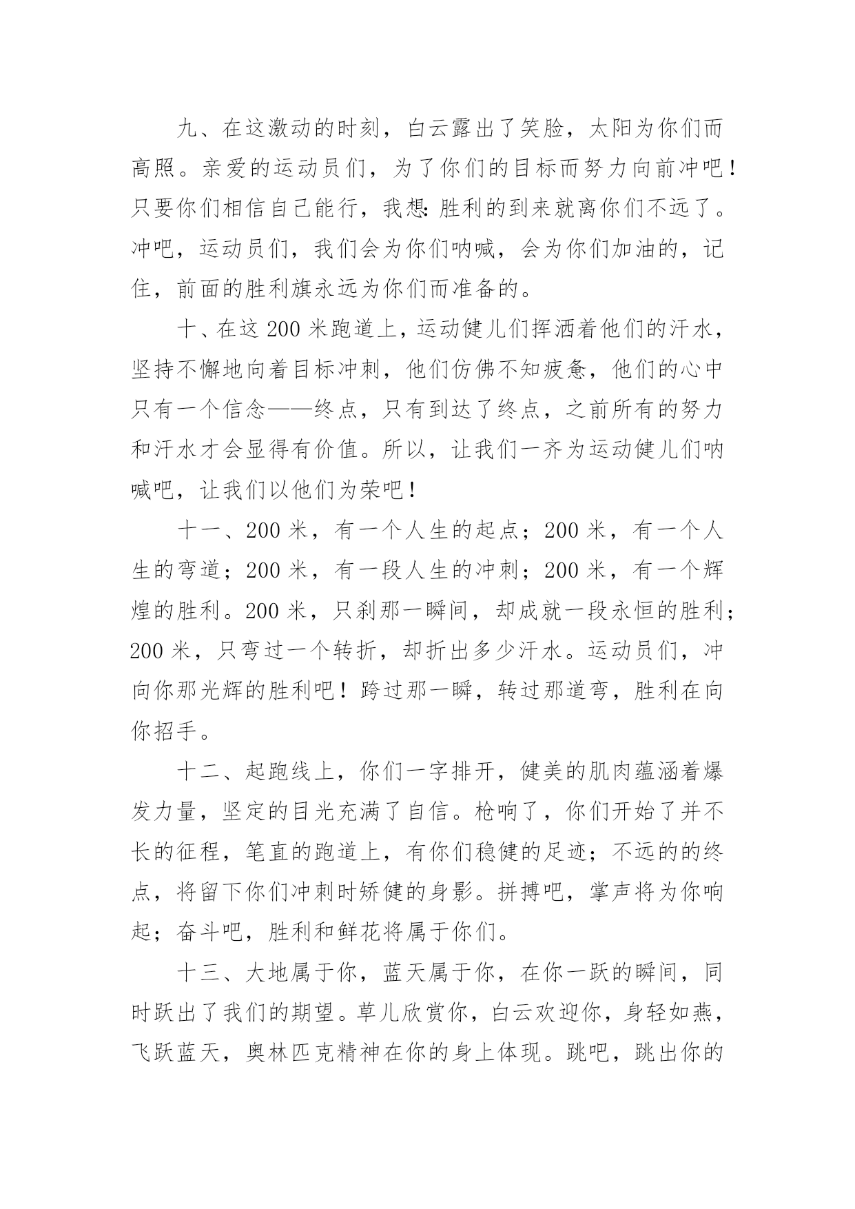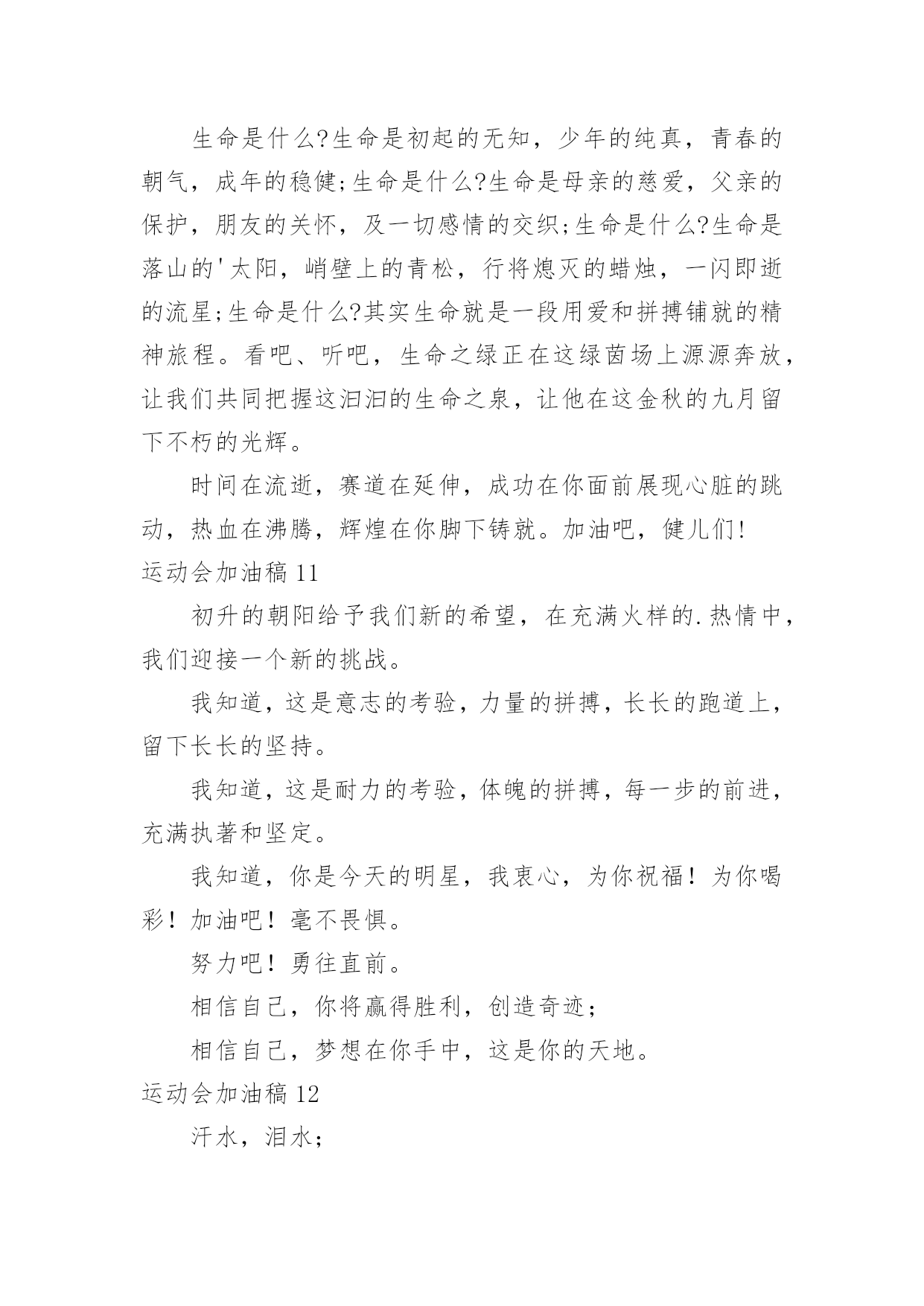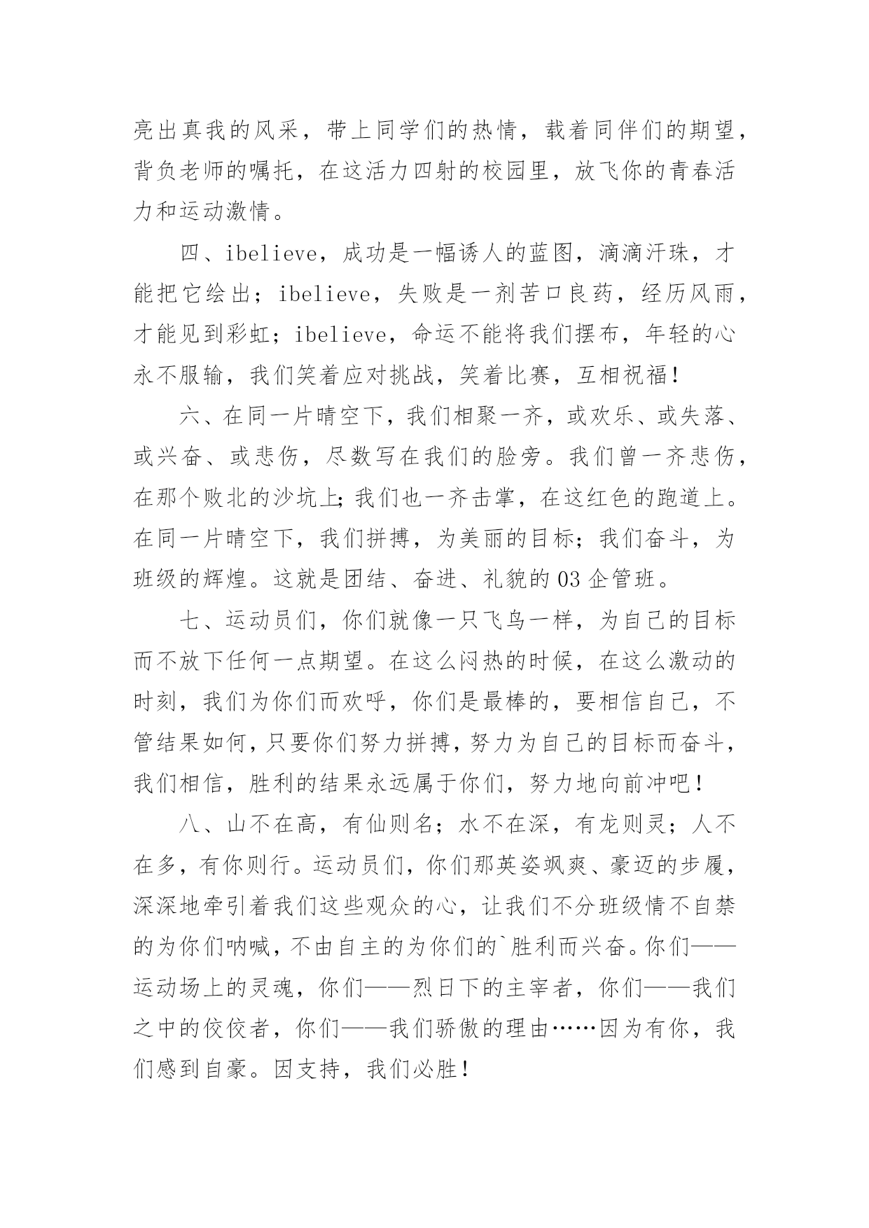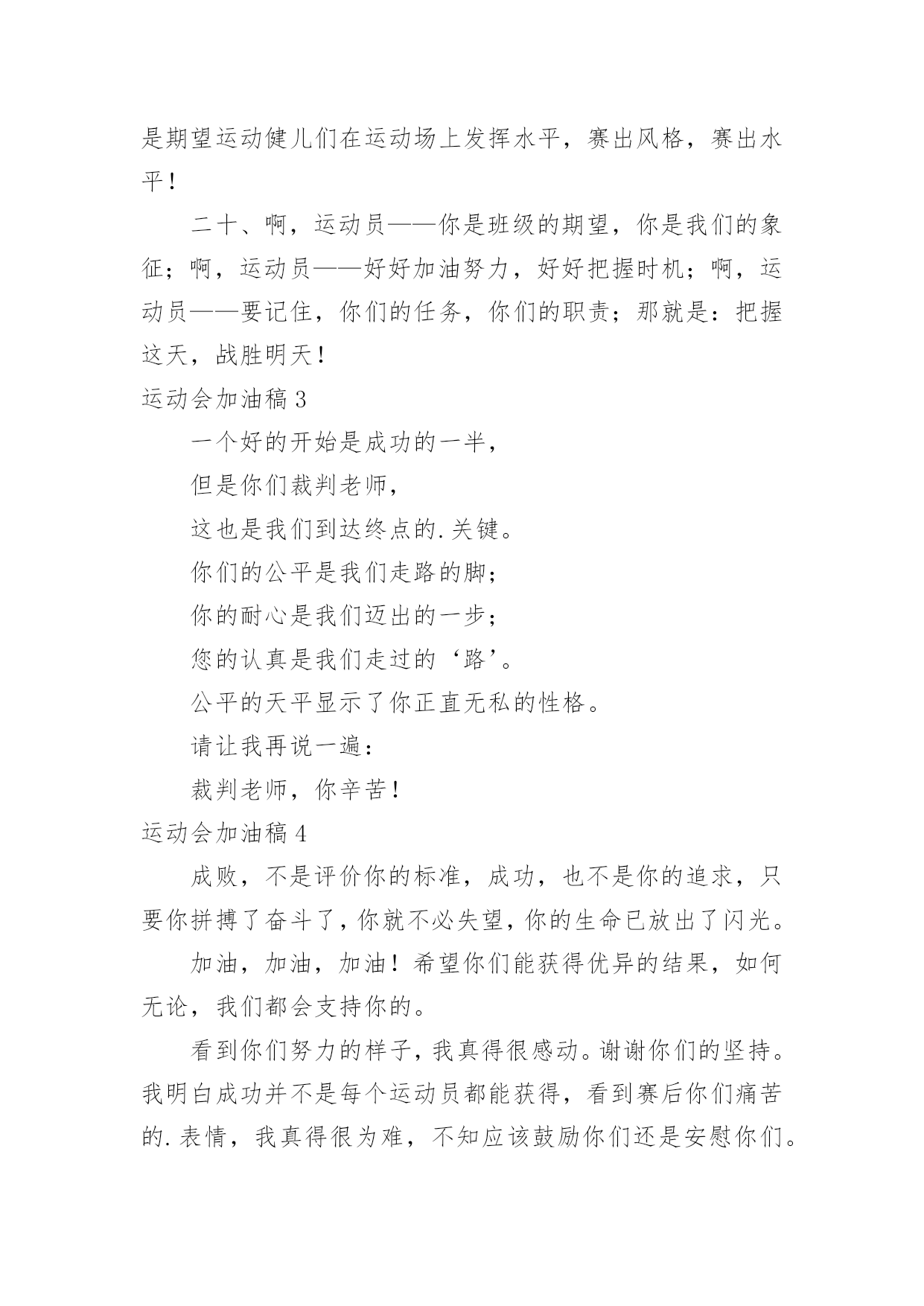 运动会加油稿运动会加油稿在现实社会中,越来越多地方需要用到加油稿,加油稿可以激励对方更好地参加活动。那要怎么写好加油稿呢?下面是小编为大家收集的运动会加油稿,供大家参考借鉴,希望可以帮助到有需要的朋友。运动会加油稿11.不卑不亢,奋发向上,生命辉煌,我们开创。2.龙腾虎跃,雷霆万钧,无与伦比,万众一心。3.青春无畏,逐梦扬威!4.沉甸甸的铅球,寄托着你的希望,奋力一抛的瞬间,一道闪亮的弧线划破美丽的长空,希望向前,再向前!你胜利了,望着远方红色的终点线,那是汗水铺成的路,泪水堆成的山,平时的努力与奋战,不就为这一瞬间,于是你们用尽全身力气,冲向那决定命运的红线,你胜利了,耳旁飘来了同学们的欢呼与赞叹。5.每一份辛劳都有一份收获,每一次的痛苦都是快乐的开始,没一声呐喊都是力量的呼唤。我们有着大浪拍岸的豪迈,所以你不必在乎小荷初露的恬静,我们有着春日的阳光明媚,所以不用去羡慕冬日乱玉碎琼,我们是雨天的一把伞,是寒冷冬日里的一盆碳火,温暖的不只是你我,而是大家的心。运动场上的健儿,掌声属于你们,鲜花属于你们,成功也是属于你们!6.龙腾虎跃,雷霆万钧,无与伦比,万众一心。7.“路上再多崎岖,我们有壮志雄心,就算跌倒也不放弃……”GO!GO!GO!拿出你们炽热的心,赛出崭新的自己,赢得最后的胜利!瞧,胜利的光环离你们越来越近,相信自己,坚持就是胜利!我们永远支持你们——运动员们!8.也许流星并不少见,但它燃烧的刹那,留给人间最美丽的回忆!也许笑脸并不少见,但胜利的喜悦,总会留给世界精彩的一瞬!是的`,那些曾经美妙的东西只有短短的一瞬间,但那却把最辉煌的一刻留给了人间。胜利,是每个人所追求的,胜利的喜悦,是胜利与重新开始的转折,胜利是新的开始!9.风起云涌,日出东方,唯有八班,再创辉煌。10.x班一出,谁与争锋,横扫赛场,唯我称雄。11.生命的意义在于奋斗,青春的意义在于拼搏,我们的激-情在燃烧,我们的活力在四射,在今天这激动人心的日子里,运动健儿们请发挥你们的风采本色吧。12.海燕在大海上翱翔,雄鹰在搏击长空,你奔驰在赛场上,电脑艺术06-1班的“xx”希望你可以勇往直前,向前胜利的彼岸,冲吧!我们一直都会支持你!13.拼搏,拼搏,再拼搏,奋斗,奋斗,再奋斗!14.命运全在拼击,奋斗就是希望。15.秋风羽,天气淡淡的转凉。然而这人的秋在今天更加迷人,不是因为它的秋高气爽,也不是因为它的明媚阳光,是因为今天的人儿倍加精神气爽。看!运动场上那一幕幕,一股股,无论是哭是笑,市喜是悲,其中都融入了他们的汗水、辛劳。他们是真正的矫健者,是运动场上的骄儿,更是我们心中的英雄。加油吧!英雄们!16.奥林匹克精神佳,运动健将拼搏强。在运动场上的运动健儿们,发挥你们的特长,展示你们的风采,让你们的身影在运动场上留下优美的风景线,让你们的雄心壮志在运动场上发挥的淋漓尽致。17.十班十班,唯有我先,奋力拼搏,勇往直前。18.努力拼搏,永不言弃。19.超越自我,秀出风采!20.在同一片晴空下,我们相聚一齐,或欢乐、或失落、或兴奋、或悲伤,尽数写在我们的脸旁。我们曾一齐悲伤,在那个败北的沙坑上;我们也一齐击掌,在这红色的跑道上。在同一片晴空下,我们拼搏,为美丽的目标;我们奋斗,为班级的辉煌。这就是团结、奋进、礼貌的xx班。运动会加油稿2一、奥林匹克精神佳,运动健将拼搏强。在运动场上的运动健儿们,发挥你们的特长,展示你们的风采。二、让你们的身影在运动场上留下优美的风景线,让你们的雄心壮志在运动场上发挥的淋漓尽致。三、青春是不老的誓言,飞扬是年轻的梦想,金色的十月,让我们在这长长的跑道上青春飞扬,现出飒爽的风姿,亮出真我的风采,带上同学们的热情,载着同伴们的期望,背负老师的嘱托,在这活力四射的校园里,放飞你的青春活力和运动激情。四、ibelieve,成功是一幅诱人的蓝图,滴滴汗珠,才能把它绘出;ibelieve,失败是一剂苦口良药,经历风雨,才能见到彩虹;ibelieve,命运不能将我们摆布,年轻的心永不服输,我们笑着应对挑战,笑着比赛,互相祝福!六、在同一片晴空下,我们相聚一齐,或欢乐、或失落、或兴奋、或悲伤,尽数写在我们的脸旁。我们曾一齐悲伤,在那个败北的沙坑上;我们也一齐击掌,在这红色的跑道上。在同一片晴空下,我们拼搏,为美丽的目标;我们奋斗,为班级的辉煌。这就是团结、奋进、礼貌的03企管班。七、运动员们,你们就像一只飞鸟一样,为自己的目标而不放下任何一点期望。在这么闷热的时候,在这么激动的时刻,我们为你们而欢呼,你们是最棒的,要相信自己,不管结果如何,只要你们努力拼搏,努力为自己的目标而奋斗,我们相信,胜利的结果永远属于你们,努力地向前冲吧!八、山不在高,有仙则名;水不在深,有龙则灵;人不在多,有你则行。运动员们,你们那英姿飒爽、豪迈的步履,深深地牵引着