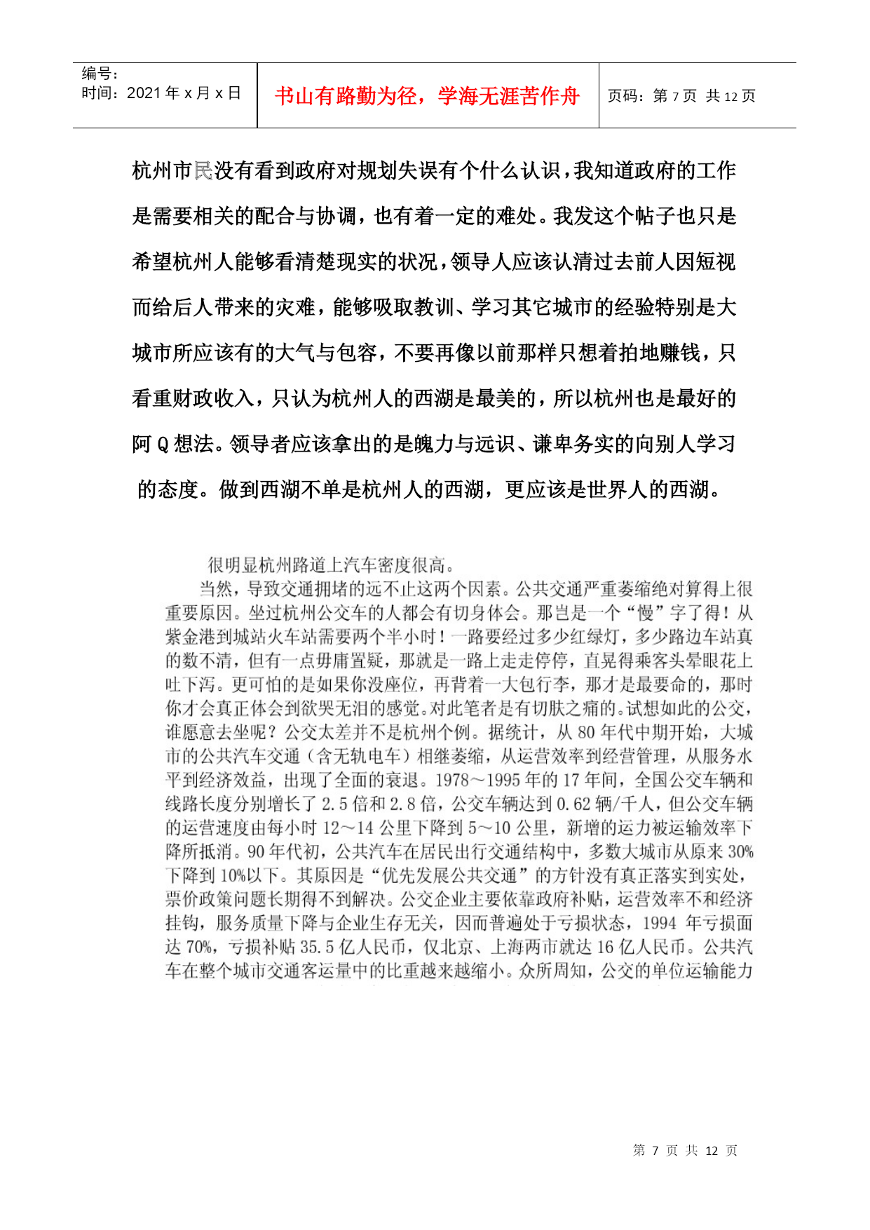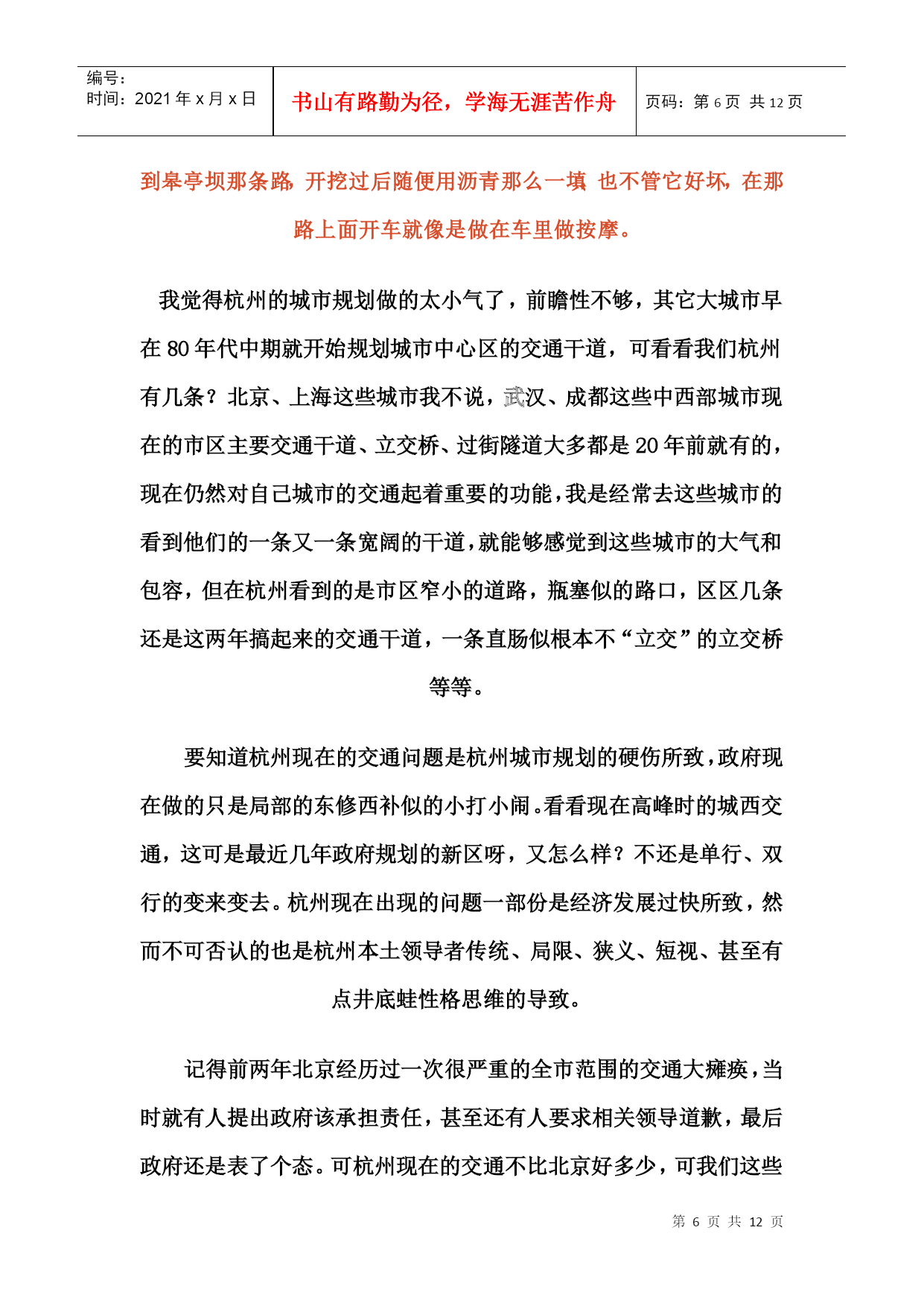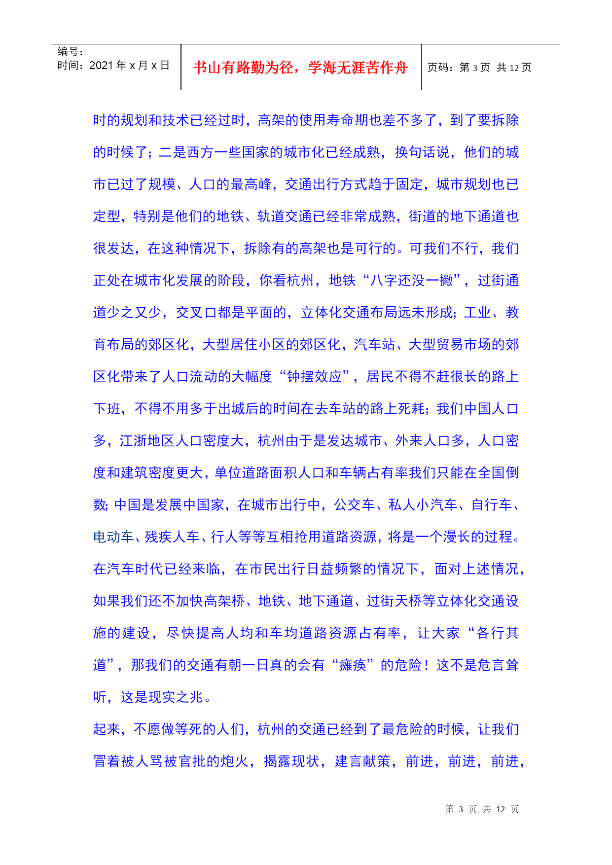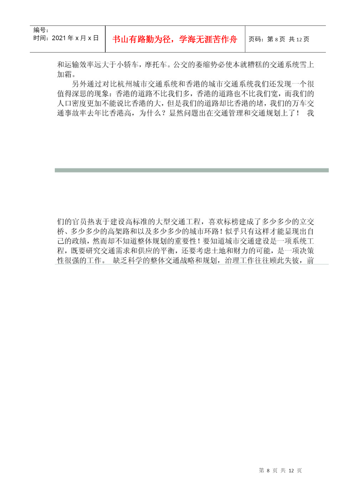 编号:时间:2021年x月x日书山有路勤为径,学海无涯苦作舟页码:第PAGE12页共NUMPAGES12页第PAGE\*MERGEFORMAT12页共NUMPAGES\*MERGEFORMAT12页杭州,你的交通还有救吗?周一从城西坐公交车到单位,8公里的路程,用了整整一个半小时!周六从丰潭路坐小车回老家,在天目山路上忙转了一个小时才到环城高速入口。杭州的火车站、汽车站离主城区越来越远了,可市内交通越来越堵了,200公里范围的行程,往往市内用去的时间比路上耗的时间还要多。杭州的交通,岂止是一个堵字,简直就是烂!十五年前,杭州就在规划东西向的高架了,那是天目山路高架,因各种原因流产了。十年前,杭州开始规划德胜到文一路高架(快速通道),因众所周知的原因,现在高架造了一半就停了。还有,现在的杭州红绿灯也实在太多了,不到几百米就一个红绿灯,还有好多“霸王灯”,权力单位旁边的灯,根本没必要;好多“空港灯”,城乡结合部的灯,车子少,也根本没必要。杭州的交通,还有数不清的问题:红绿灯间隔时间太长,交通瓶颈太多,缺少东西向、南北向的交叉快车道,过街地下通道或天桥太少,停车场少,道路规划落后,绕城高速出入口太少、车道太少,道路建建翻翻、翻翻建建反复不停等等。这些问题远远没有解决,杭州有的部门竟然提出了“太阳工程”的决策——化几百亿造绕城二线。去你吗的,有关部门,让我说你什么好呢?懂规划吗?不懂。道路建好不久就马上落后,落后一大截!会办事吗?不会,东西向的快速道和高架建了这么多年也没有建好。他们在实践科学发展观吗?更没有,造绕城二线远远没有解决市内交通拥堵来的迫切,而且路线离开主城区那么远,实际效果也没有论证。怎么就能拿这几百亿元去造一个所谓的“太阳工程”呢,是“形象工程”吧。杭州的交通,如果说十年前就科学规划,一些工程立马行动的话,那么现在和将来还是有救的。但是,现在没救了,为什么?政府的理念、市民的理念都落后了。可以这样说,平面化的交通是杭州交通拥堵的罪魁祸首!杭州交通不在立体化、路口交叉化上下文章,将会是死路一条。有的人反对建高架、反对建过街天桥,说这样影响杭州文化名城、国际旅游城市的形象。嗟,这是片面之词、无知之徒。杭州的文化古城遗址本来就已经荡然无存,你看看杭州的建筑,有几幢是古代建筑,大都是一些没有特色的火柴盒建筑。高架和天桥影响形象吗?只要把高架和天桥设计得美观一点,照样可以成为城市里的亮丽HYPERLINK"http://newcar.xcar.com.cn/360/"\t"_blank"风景!有的人还说,造高架不是HYPERLINK"http://newcar.xcar.com.cn/price/pb23/"\t"_blank"现代社会的趋势,西方有的发达国家现在都已经在拆除高架了。那我问你,你到过西方吗,你知道他们拆除高架的原因吗,你还知道中国城市化现在的真实情形吗?有的人见风是雨,有的人道听途说、有的人照抄照搬,不识庐山真面目。知道吗,西方有的国家拆除高架,原因有二:一是高架建的时间早,在二战后就建了,已经半个多世纪了,那时的规划和技术已经过时,高架的使用寿命期也差不多了,到了要拆除的时候了;二是西方一些国家的城市化已经成熟,换句话说,他们的城市已过了规模、人口的最高峰,交通出行方式趋于固定,城市规划也已定型,特别是他们的地铁、轨道交通已经非常成熟,街道的地下通道也很发达,在这种情况下,拆除有的高架也是可行的。可我们不行,我们正处在城市化发展的阶段,你看杭州,地铁“八字还没一撇”,过街通道少之又少,交叉口都是平面的,立体化交通布局远未形成;工业、教育布局的郊区化,大型居住小区的郊区化,汽车站、大型贸易市场的郊区化带来了人口流动的大幅度“钟摆效应”,居民不得不赶很长的路上下班,不得不用多于出城后的时间在去车站的路上死耗;我们中国人口多,江浙地区人口密度大,杭州由于是发达城市、外来人口多,人口密度和建筑密度更大,单位道路面积人口和车辆占有率我们只能在全国倒数;中国是发展中国家,在城市出行中,公交车、私人小汽车、自行车、HYPERLINK"http://newcar.xcar.com.cn/639/"\t"_blank"电动车、残疾人车、行人等等互相抢用道路资源,将是一个漫长的过程。在汽车时代已经来临,在市民出行日益频繁的情况下,面对上述情况,如果我们还不加快高架桥、地铁、地下通道、过街天桥等立体化交通设施的建设,尽快提高人均和车均道路资源占有率,让大家“各行其道”,那我们的交通有朝一日真的会有“瘫痪”的危险!这不是危言耸听,这是现实之兆。起来,不愿做等死的人们,杭州的交通已经到了最危险的时候,让我们冒着被人骂被官批的炮火,揭露现状,建言献策,前进,前进,前进,进!!!现在