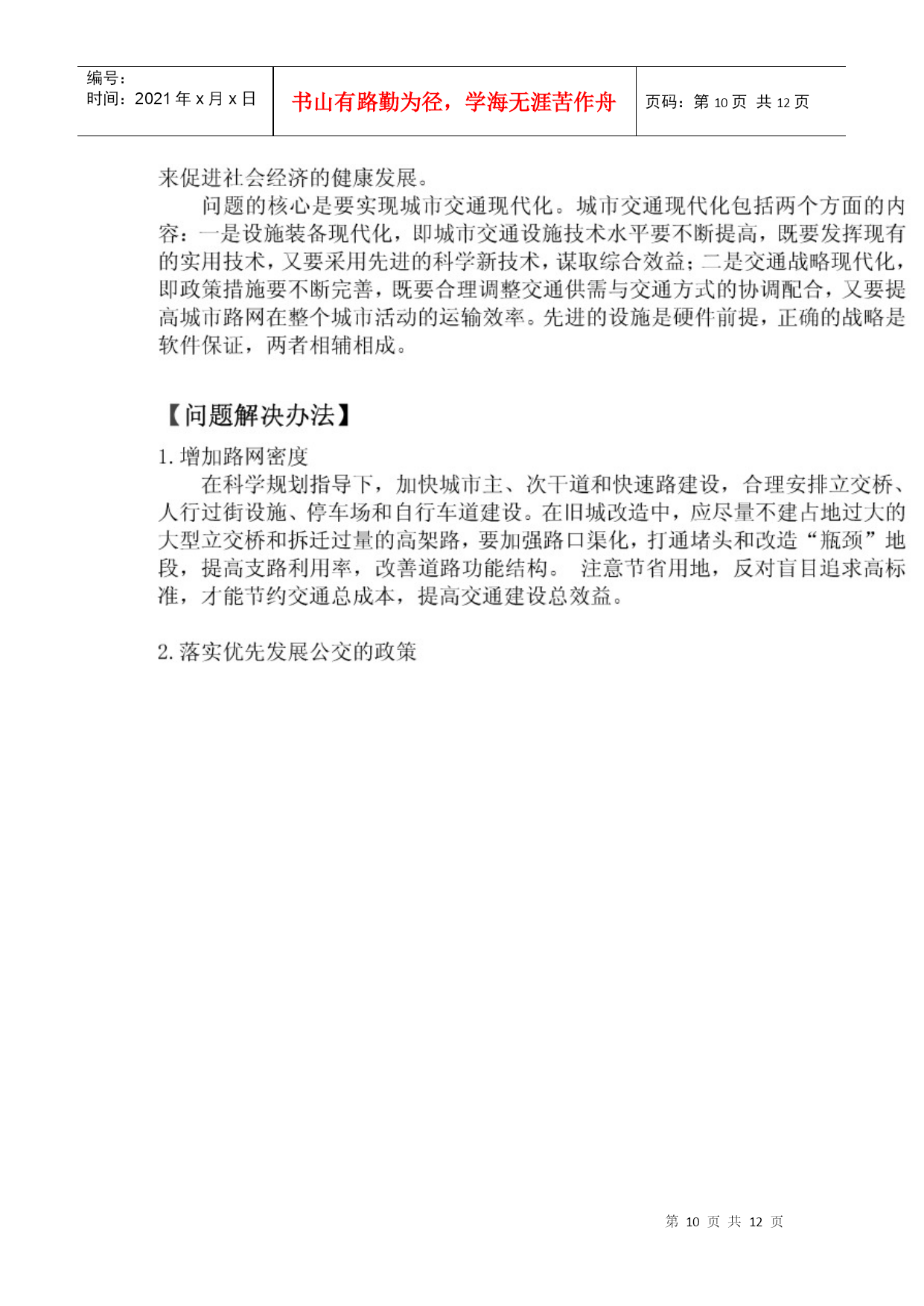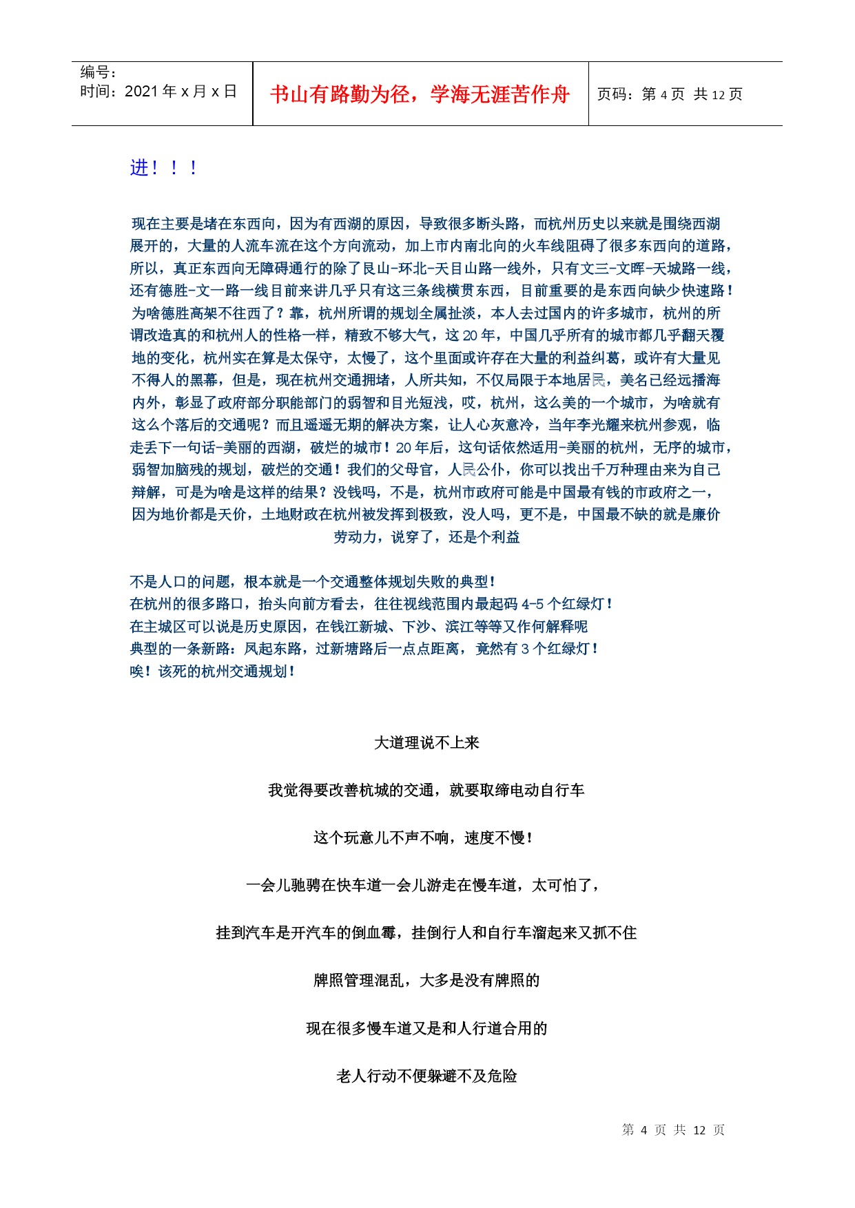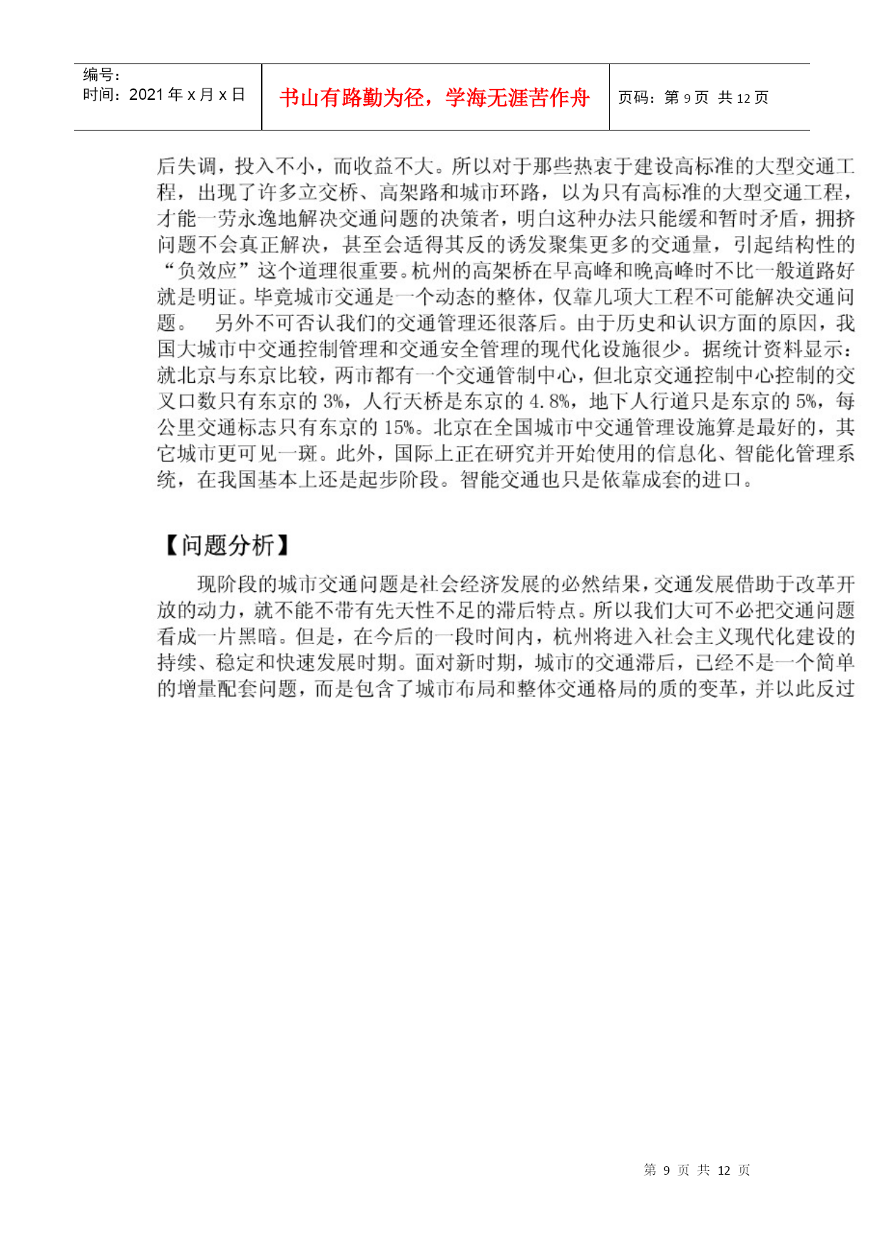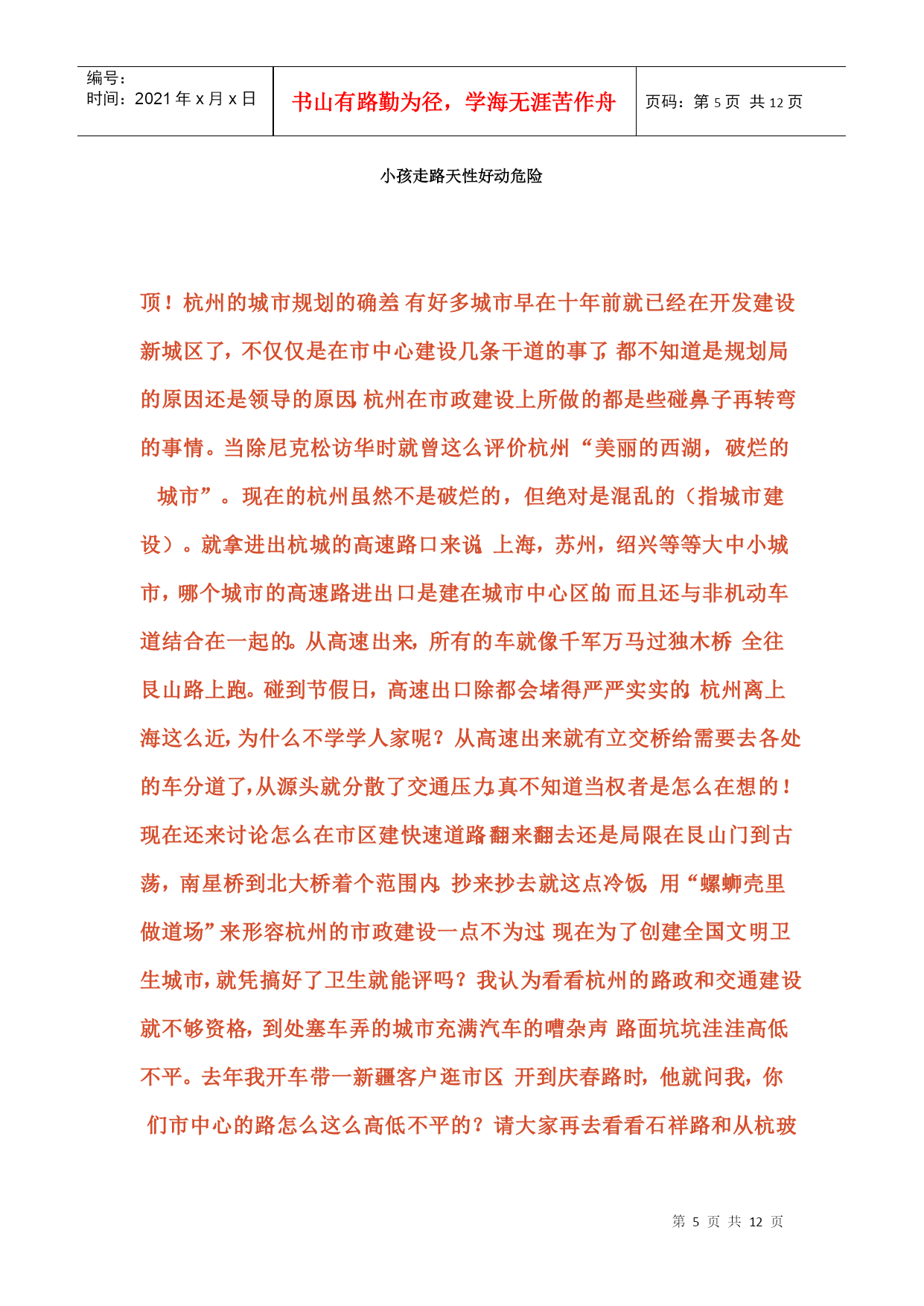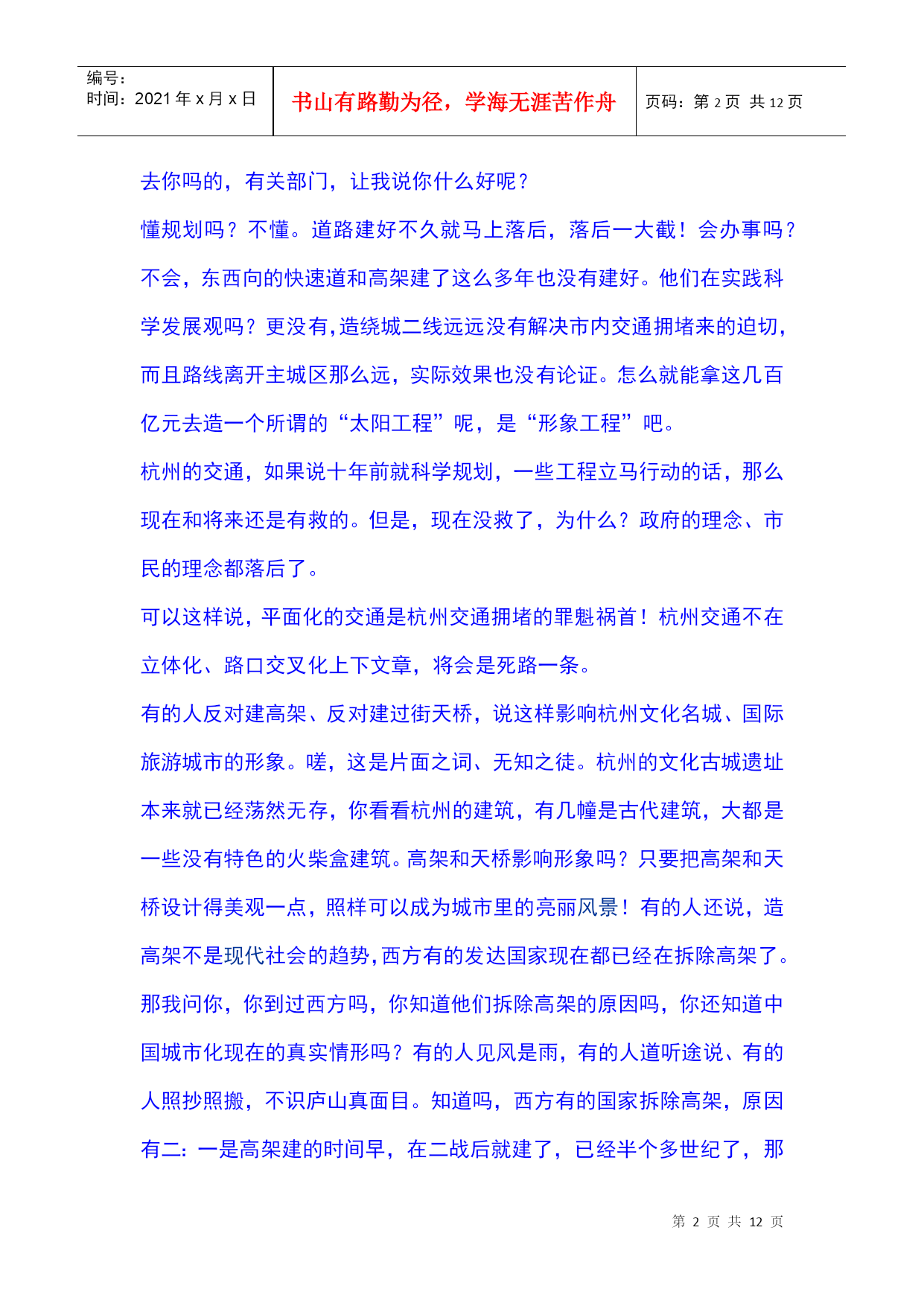 编号:时间:2021年x月x日书山有路勤为径,学海无涯苦作舟页码:第PAGE12页共NUMPAGES12页第PAGE\*MERGEFORMAT12页共NUMPAGES\*MERGEFORMAT12页杭州,你的交通还有救吗?周一从城西坐公交车到单位,8公里的路程,用了整整一个半小时!周六从丰潭路坐小车回老家,在天目山路上忙转了一个小时才到环城高速入口。杭州的火车站、汽车站离主城区越来越远了,可市内交通越来越堵了,200公里范围的行程,往往市内用去的时间比路上耗的时间还要多。杭州的交通,岂止是一个堵字,简直就是烂!十五年前,杭州就在规划东西向的高架了,那是天目山路高架,因各种原因流产了。十年前,杭州开始规划德胜到文一路高架(快速通道),因众所周知的原因,现在高架造了一半就停了。还有,现在的杭州红绿灯也实在太多了,不到几百米就一个红绿灯,还有好多“霸王灯”,权力单位旁边的灯,根本没必要;好多“空港灯”,城乡结合部的灯,车子少,也根本没必要。杭州的交通,还有数不清的问题:红绿灯间隔时间太长,交通瓶颈太多,缺少东西向、南北向的交叉快车道,过街地下通道或天桥太少,停车场少,道路规划落后,绕城高速出入口太少、车道太少,道路建建翻翻、翻翻建建反复不停等等。这些问题远远没有解决,杭州有的部门竟然提出了“太阳工程”的决策——化几百亿造绕城二线。去你吗的,有关部门,让我说你什么好呢?懂规划吗?不懂。道路建好不久就马上落后,落后一大截!会办事吗?不会,东西向的快速道和高架建了这么多年也没有建好。他们在实践科学发展观吗?更没有,造绕城二线远远没有解决市内交通拥堵来的迫切,而且路线离开主城区那么远,实际效果也没有论证。怎么就能拿这几百亿元去造一个所谓的“太阳工程”呢,是“形象工程”吧。杭州的交通,如果说十年前就科学规划,一些工程立马行动的话,那么现在和将来还是有救的。但是,现在没救了,为什么?政府的理念、市民的理念都落后了。可以这样说,平面化的交通是杭州交通拥堵的罪魁祸首!杭州交通不在立体化、路口交叉化上下文章,将会是死路一条。有的人反对建高架、反对建过街天桥,说这样影响杭州文化名城、国际旅游城市的形象。嗟,这是片面之词、无知之徒。杭州的文化古城遗址本来就已经荡然无存,你看看杭州的建筑,有几幢是古代建筑,大都是一些没有特色的火柴盒建筑。高架和天桥影响形象吗?只要把高架和天桥设计得美观一点,照样可以成为城市里的亮丽HYPERLINK"http://newcar.xcar.com.cn/360/"\t"_blank"风景!有的人还说,造高架不是HYPERLINK"http://newcar.xcar.com.cn/price/pb23/"\t"_blank"现代社会的趋势,西方有的发达国家现在都已经在拆除高架了。那我问你,你到过西方吗,你知道他们拆除高架的原因吗,你还知道中国城市化现在的真实情形吗?有的人见风是雨,有的人道听途说、有的人照抄照搬,不识庐山真面目。知道吗,西方有的国家拆除高架,原因有二:一是高架建的时间早,在二战后就建了,已经半个多世纪了,那时的规划和技术已经过时,高架的使用寿命期也差不多了,到了要拆除的时候了;二是西方一些国家的城市化已经成熟,换句话说,他们的城市已过了规模、人口的最高峰,交通出行方式趋于固定,城市规划也已定型,特别是他们的地铁、轨道交通已经非常成熟,街道的地下通道也很发达,在这种情况下,拆除有的高架也是可行的。可我们不行,我们正处在城市化发展的阶段,你看杭州,地铁“八字还没一撇”,过街通道少之又少,交叉口都是平面的,立体化交通布局远未形成;工业、教育布局的郊区化,大型居住小区的郊区化,汽车站、大型贸易市场的郊区化带来了人口流动的大幅度“钟摆效应”,居民不得不赶很长的路上下班,不得不用多于出城后的时间在去车站的路上死耗;我们中国人口多,江浙地区人口密度大,杭州由于是发达城市、外来人口多,人口密度和建筑密度更大,单位道路面积人口和车辆占有率我们只能在全国倒数;中国是发展中国家,在城市出行中,公交车、私人小汽车、自行车、HYPERLINK"http://newcar.xcar.com.cn/639/"\t"_blank"电动车、残疾人车、行人等等互相抢用道路资源,将是一个漫长的过程。在汽车时代已经来临,在市民出行日益频繁的情况下,面对上述情况,如果我们还不加快高架桥、地铁、地下通道、过街天桥等立体化交通设施的建设,尽快提高人均和车均道路资源占有率,让大家“各行其道”,那我们的交通有朝一日真的会有“瘫痪”的危险!这不是危言耸听,这是现实之兆。起来,不愿做等死的人们,杭州的交通已经到了最危险的时候,让我们冒着被人骂被官批的炮火,揭露现状,建言献策,前进,前进,前进,进!!!现在