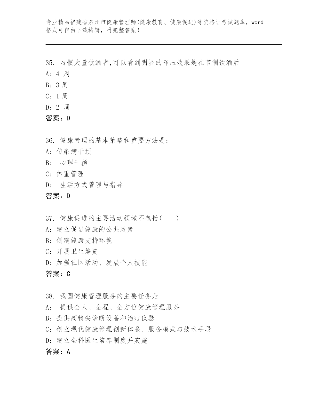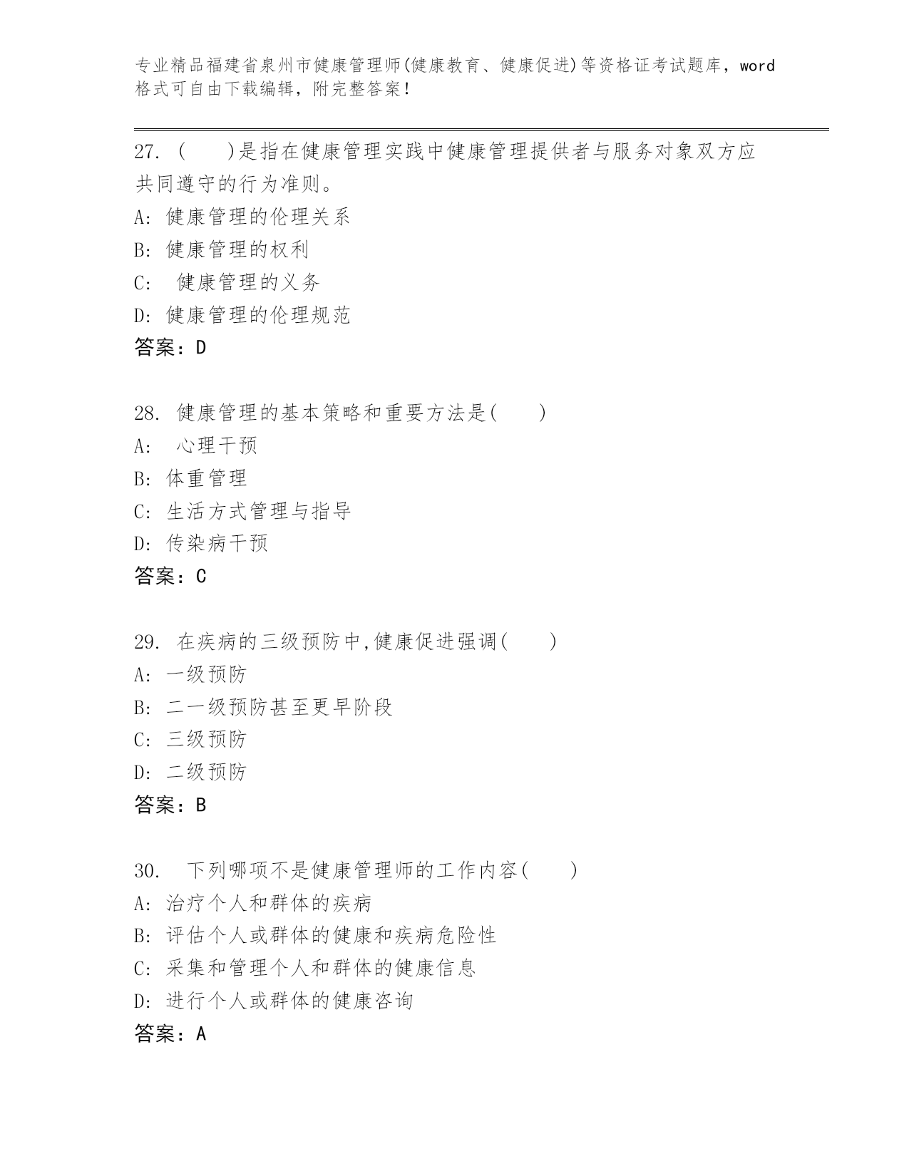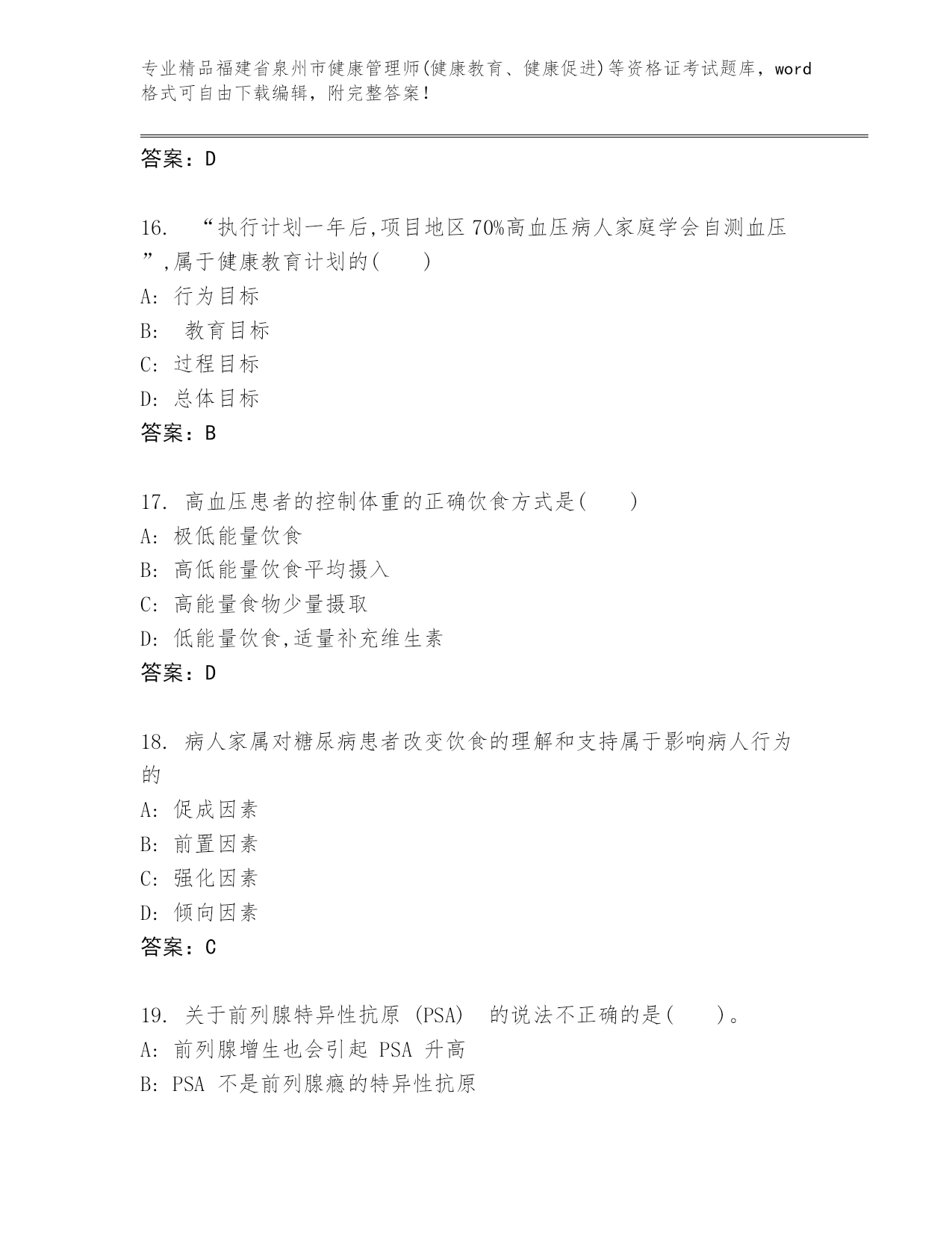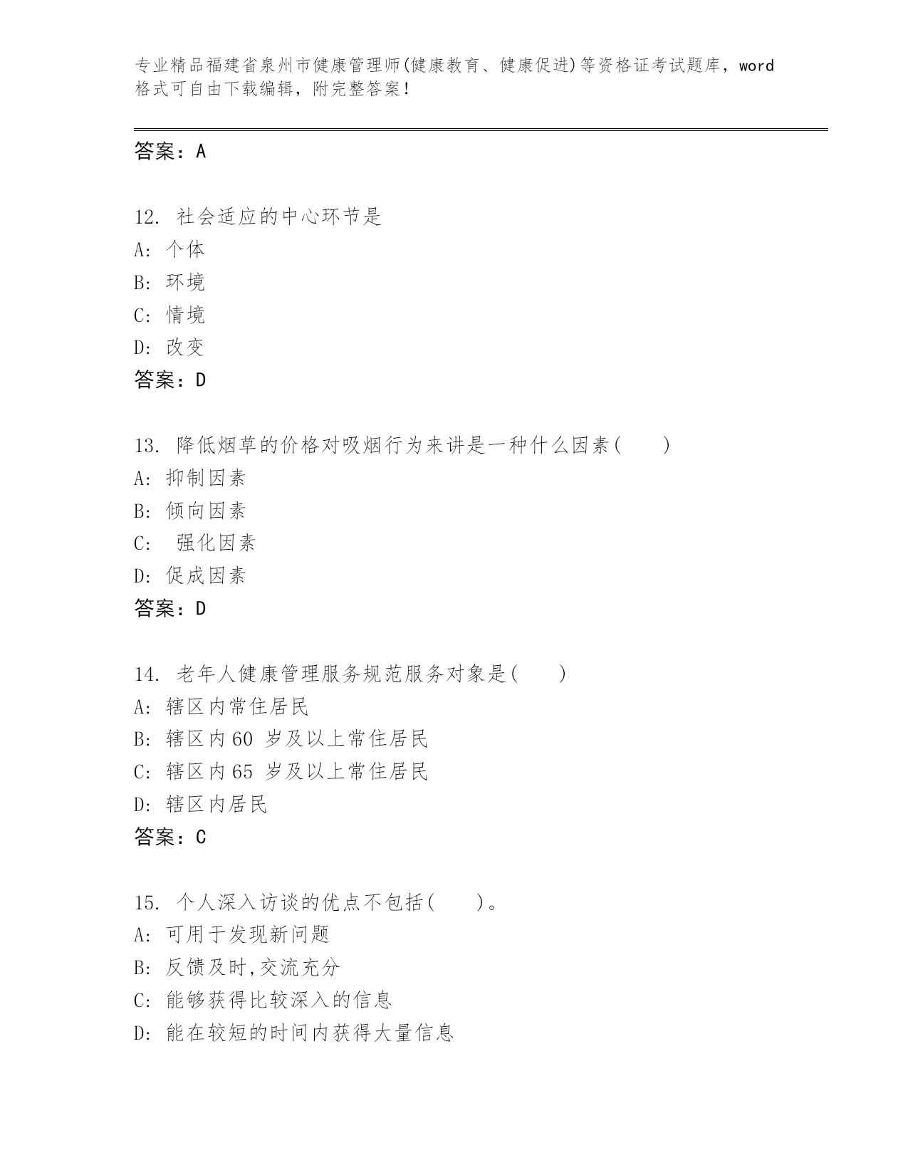 完整版福建省泉州市健康管理师(健康教育、健康促进)等资格证考试往年题考
