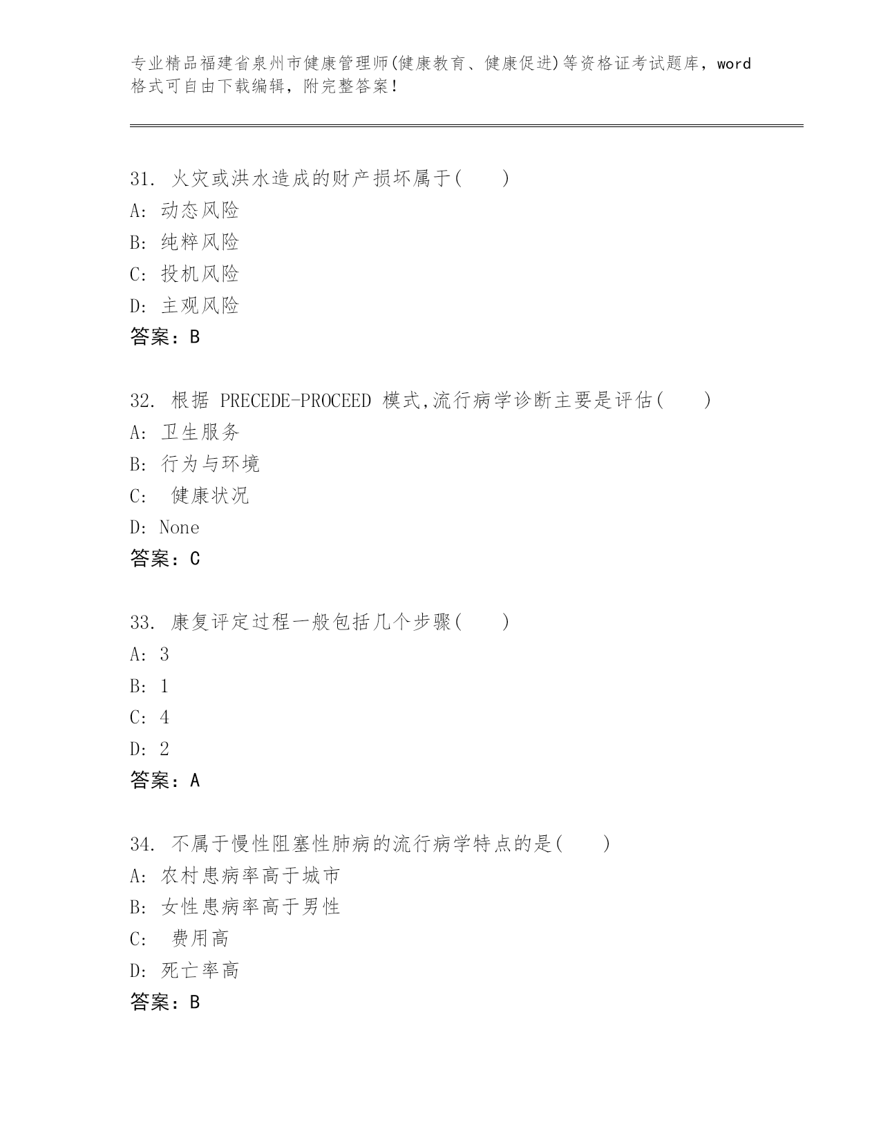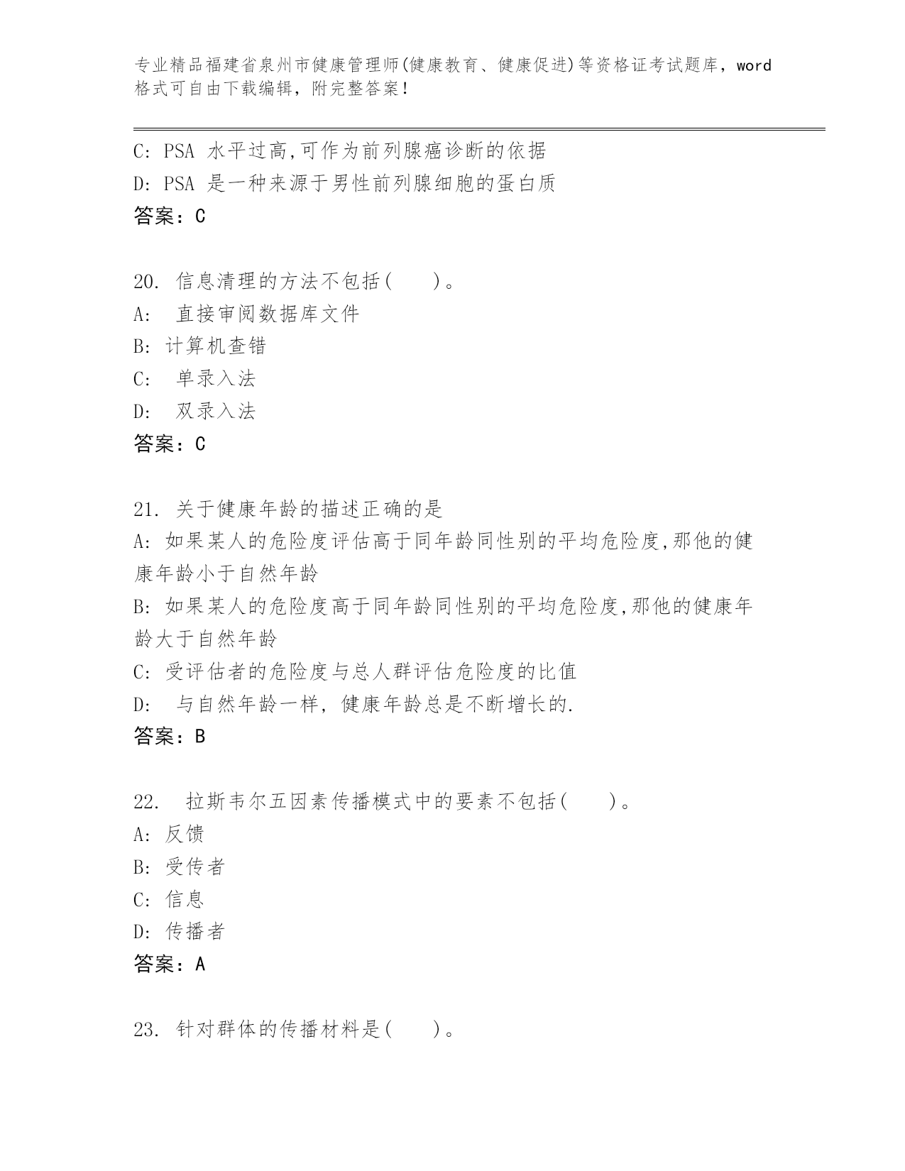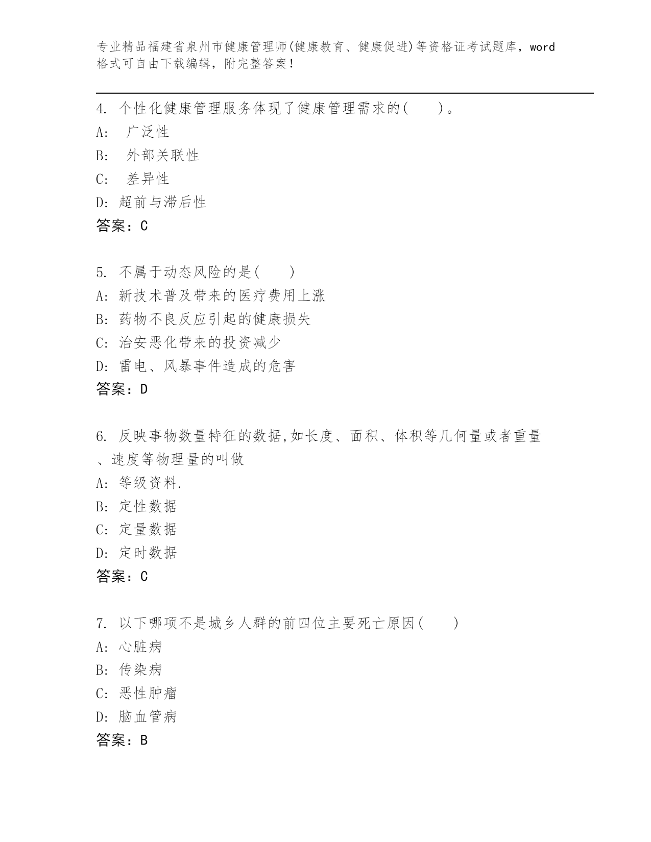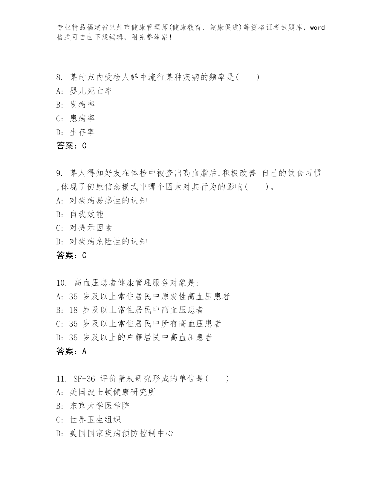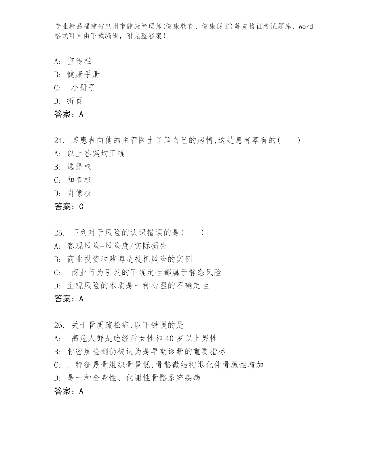 完整版福建省泉州市健康管理师(健康教育、健康促进)等资格证考试往年题考