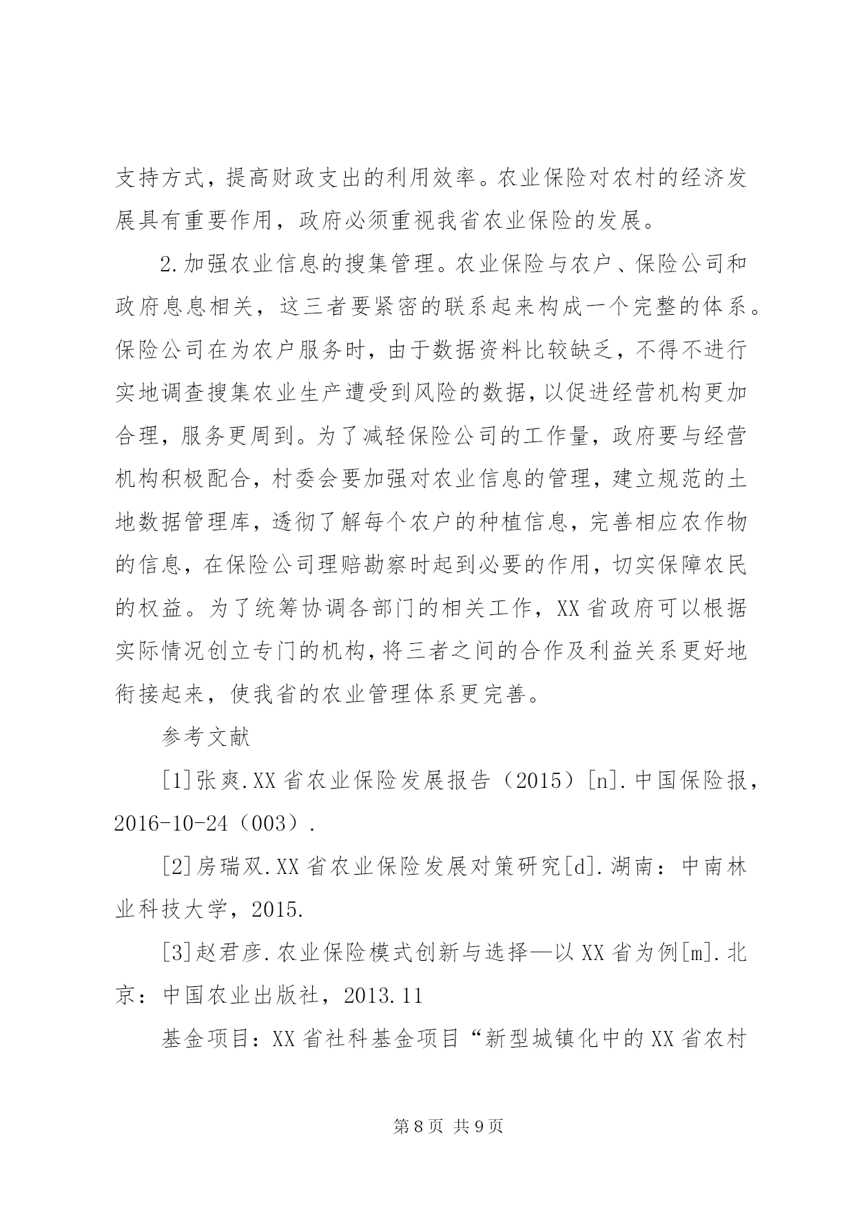 第PAGE\*Arabic\*MERGEFORMAT9页共NUMPAGES\*MERGEFORMAT9页XX省农业保险发展的对策研究范倩倩杨海芬程月【摘要】市场经济国家扶持农业发展的通行做法就是发展农业保险,农业保险是管理农业的有效手段。本文通过分析XX省农业保险的发展现状,从农业保险主体的供给方面、农户的需求方面以及政府行为三个方面提出存在的问题,并给出相应的对策建议,可以有效促进XX省自身农业保险的可持续发展。【关键词】XX省农业保险市场供给与需求政府行为XX省耕地面积较大,农业人口所占比重也比较高。近几年,XX省逐渐从传统农业大省向现代农业强省迈进,多种农产品产量在全国位居前列。但XX省在农业发展方面也存在着一些问题,农业生产的环境也较为薄弱,抵抗风险的能力很低。政府针对XX省目前的农业发展状况出台了相应的政策。农业保险就是XX省发展农业的一个“助推器”,XX省需要迫切的发展农业保险来应对恶劣的自然环境,需要用农业保险这样的赔偿机制来对转让和解决风险。一、农业保险的发展现状(一)农业保险保费收入大幅度增长自2007年试点以来,XX省农业保险的保费收入持续增长,保险规模逐渐扩大。根据中国保险统计年鉴显示,2007年农业保险保费收入为10351万元,同比增长2430.81%,2015年全年保费收入达到22.02亿元,同比增长23.01%,是2007年的22倍。2007年至2015年,XX省保费收入年均增长率为66.99%,居全国第六位。可以看出,XX省农业保险的保费收入规模不断扩大,农业保险在农业生产中发挥了更大的作用,为农户提供了更高的保障。(二)农业保险产品种类增多XX省2007年开始作为农业保险的试点,保险标的只有玉米和能繁母猪。到2008年,标的物又增加了花生、棉花、小麦和奶牛等品种。2010年,XX省的政策性农业保险险种增加到了9种,包括玉米、棉花、小麦、水稻、大豆、花生、油菜、奶牛和能繁母猪。到2017年,XX省的政策性农业保险增加到了14种,在原有品种的基础上,又增加了马铃薯、糖料作物、森林保险、设施农业和育肥猪等。农业保险种类的丰富,提高了农户投保的积极性,对开拓和发展农村保险市场具有重要意义。(三)特色农业保险的政策扶持力度增强近几年,特色农业逐渐发展起来,被各地政府作为新引擎拉动当地经济发展。XX市在几年前率先将马铃薯纳入政策性农业保险,大部分保费由政府财政补贴,农民减轻了负担,生产积极性提高。XX省财政厅、省保监局印发了《关于开展特色农业保险保费财政奖补试点实施办法的通知》。为了推动我省早日脱贫,支持全省自治县农业产业发展特点和农产品特色,省财政对62个全國、省级贫困县和全省民族自治县财政拨款,以高于其他县(市,区)10%的财政资金进行奖励,让农民享受更多的保障。二、XX省农业保险发展中存在的问题(一)农业保险供给相对短缺1.农业保险供给主体较少。我国的农业保险经营组织体系在不断完善,但农业保险的供给主体还是相对缺乏。专业的农业保险有限公司在我国不足十家,XX省目前只有7家。在XX省内,中国人民保险公司、中华联合财产保险公司和中国大地保险公司都是实力雄厚,资产规模较大的保险公司,经营风险可以在各险种之间分散,但与专业的农业保险公司相比,缺少专业化经营,经营主体较为单一。直到2015年四月底,XX省承包主体才打破由这三大保险公司对市场多年的垄断。低于一定的赔付率是保险公司长期存在的关键,因此,承包的主体越多,风险可以在各个保险公司之间分担,赔付率不高,保险公司就能得以继续生存下去,达到共赢的效果。2.保险公司专业的农业保险业务员较少。根据调查显示,XX省农业保险公司的农险业务员一般在2~3人,这对于广大的农村市场来说,人数相对较少。这些从业人员缺乏专业的知识,对保险业务和一些国家政策都不熟悉,很难根据农户的需求合理的解决各种问题,农业保险的发展受到影响。我省高校每年培养的农业保险专业人才大约有1200人,但在这些人中,毕业后从事保险工作的人却寥寥无几。农业保险的标的物比较分散,工作也比较辛苦,这也要求农业保险工作人员具有较高的素质,所以很少有毕业生愿意接受这份工作。专业农业保险业务员的培养是一个关键的因素,有更多的专业人员,才能更好地发展我省的农业保险。(二)农业保险的需求不足农户对农业保险的重视程度不够,农业保险的需求严重不足。目前农业保险的投保人群大多数是一些以种植业和养殖业为主的农户和企业。但是由于传统思想的束缚,农户的文化素质普遍较低,接受新鲜事物的能力较差,大多数人还是被“靠天吃饭”这样的想法制约着。因此,多数农户的风险意识淡薄,对于通过投保农业保险来规避风险这样的方式在认识上存在很大偏差,没有正确的理解农业保险的意义,意识不到投保农业保险是保障自己的利益,是在受到灾难