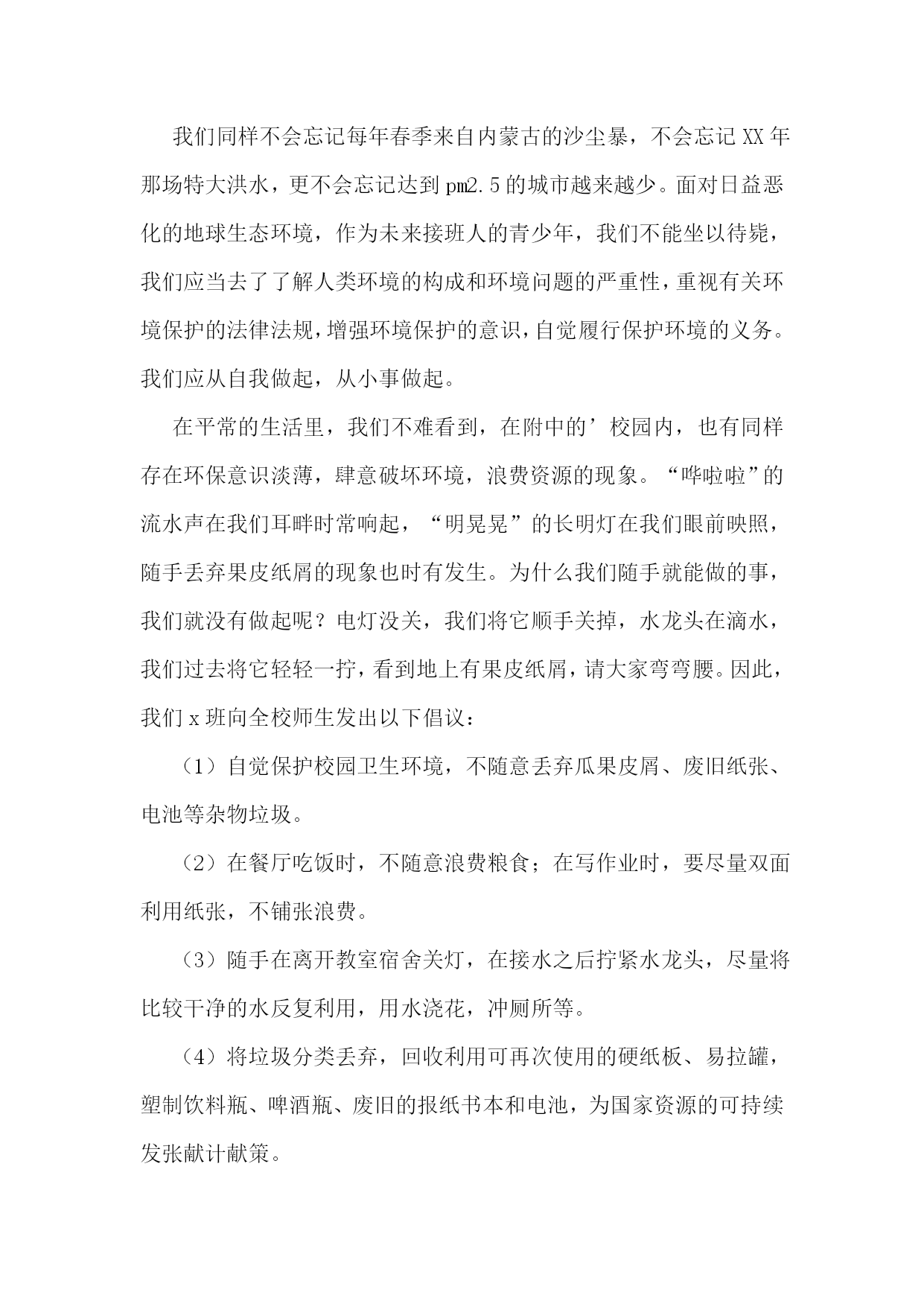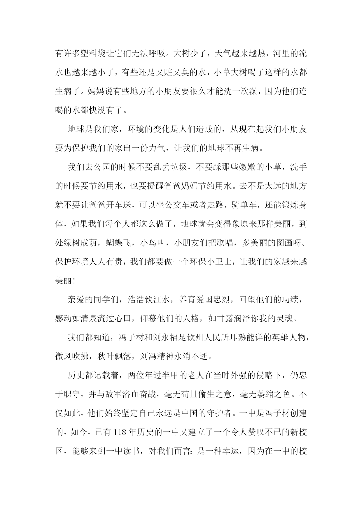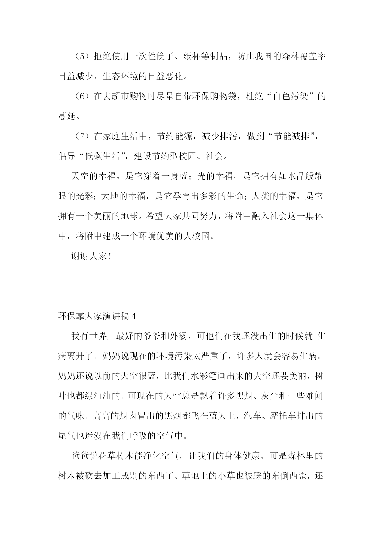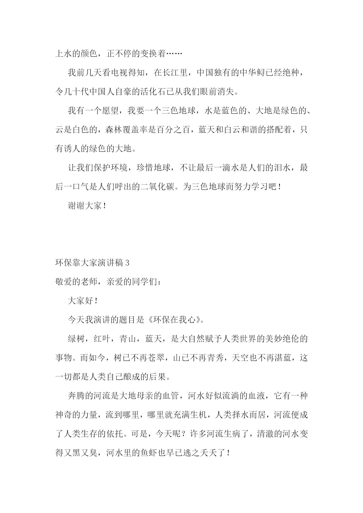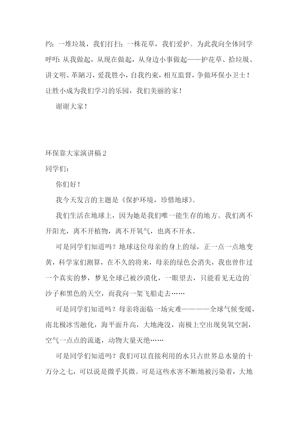 环保靠大家演讲稿环保靠大家演讲稿1尊敬的老师、亲爱的同学们:大家好!我是五(3)班的陈星颖,演讲的题目是:《胜小是我家,环保靠大家》。同学们,当你踏着晨光走进花园般的胜小校园时;当你坐在干净整洁的教室里学习时;当你在平整宽阔的操场上运动时;当你在绿荫如盖、鸟语花香的花坛边漫步时,你们可曾想到为了让我们能有一个优美、舒适的学习环境,学校花了多少心思?投入了多少力量?老师、同学们尽了多大努力?你们可曾知道我们学校执勤、值日的同学每天清晨、中午和下午放学后花了多少时间在做清洁工作吗?可是有些同学却不懂珍惜。请你们放眼校园仔细看看,是谁在墙壁上、桌椅上乱涂乱画?是谁开着水管,让水肆意流失?是谁把塑料袋、果皮纸屑扔得满地都是?又是谁把花坛当成嬉戏的乐园?甚至在校园的’角落里大小便呢?这些现象与优美的环境多么不协调啊!就是这少数几个人,让我们大多数同学的努力付诸东流!这种可怕的陋习,不仅会使美丽的校园遭到破坏,我们的文明和品德也随之丧失!亲爱的同学们,作为胜小的一名学子,我们谁不希望有一个干净、优美的校园?校园是我家,我们将在这里学习、生活、长大;环保靠大家,我们都有维护校园环境的义务和责任。同学们,立即行动起来吧,一片纸,我们捡起;一滴水,我们节约;一堆垃圾,我们打扫;一株花草,我们爱护。为此我向全体同学呼吁:从我做起,从现在做起,从身边小事做起——护花草、拾垃圾、讲文明、革陋习,爱我胜小,自我约束,相互监督,争做环保小卫士!让胜小成为我们学习的乐园,我们美丽的家!谢谢大家!环保靠大家演讲稿2同学们:你们好!我今天发言的主题是《保护环境,珍惜地球》。我们生活在地球上,因为她是我们唯一能生存的地方。我们离不开阳光,离不开植物,离不开氧气,也离不开水。可是同学们知道吗?地球这位母亲的身上的绿,正一点一点地变黄,科学家们测算,在不久的将来,母亲的绿色会消失,我也曾作过一个真实的梦,梦见全球已被沙漠化,一眼望去,只能看见无边的`沙子和黑色的天空,而我向一架飞船走去……可是同学们知道吗?母亲将面临一场灾难————全球气候变暖,南北极冰雪融化,海平面升高,大地淹没,南极上空出现臭氧空洞,空气一点点的流逝,动物大量灭绝……可是同学们知道吗?我们可以直接利用的水只占世界总水量的十万分之七,可以说是微乎其微。可是这些水害不断地被污染着,大地上水的颜色,正不停的变换着……我前几天看电视得知,在长江里,中国独有的中华鲟已经绝种,令几十代中国人自豪的活化石已从我们眼前消失。我有一个愿望,我要一个三色地球,水是蓝色的、大地是绿色的、云是白色的,森林覆盖率是百分之百,蓝天和白云和谐的搭配着,只有诱人的绿色的大地。让我们保护环境,珍惜地球,不让最后一滴水是人们的泪水,最后一口气是人们呼出的二氧化碳。为三色地球而努力学习吧!谢谢大家!环保靠大家演讲稿3敬爱的老师,亲爱的同学们:大家好!今天我演讲的题目是《环保在我心》。绿树,红叶,青山,蓝天,是大自然赋予人类世界的美妙绝伦的事物。而如今,树已不再苍翠,山已不再青秀,天空也不再湛蓝,这一切都是人类自己酿成的后果。奔腾的河流是大地母亲的血管,河水好似流淌的血液,它有一种神奇的力量,流到哪里,哪里就充满生机,人类择水而居,河流便成了人类生存的依托。可是,今天呢?许多河流生病了,清澈的河水变得又黑又臭,河水里的鱼虾也早已逃之夭夭了!我们同样不会忘记每年春季来自内蒙古的沙尘暴,不会忘记XX年那场特大洪水,更不会忘记达到pm2.5的城市越来越少。面对日益恶化的地球生态环境,作为未来接班人的青少年,我们不能坐以待毙,我们应当去了了解人类环境的构成和环境问题的严重性,重视有关环境保护的法律法规,增强环境保护的意识,自觉履行保护环境的义务。我们应从自我做起,从小事做起。在平常的生活里,我们不难看到,在附中的’校园内,也有同样存在环保意识淡薄,肆意破坏环境,浪费资源的现象。“哗啦啦”的流水声在我们耳畔时常响起,“明晃晃”的长明灯在我们眼前映照,随手丢弃果皮纸屑的现象也时有发生。为什么我们随手就能做的事,我们就没有做起呢?电灯没关,我们将它顺手关掉,水龙头在滴水,我们过去将它轻轻一拧,看到地上有果皮纸屑,请大家弯弯腰。因此,我们x班向全校师生发出以下倡议:(1)自觉保护校园卫生环境,不随意丢弃瓜果皮屑、废旧纸张、电池等杂物垃圾。(2)在餐厅吃饭时,不随意浪费粮食;在写作业时,要尽量双面利用纸张,不铺张浪费。(3)随手在离开教室宿舍关灯,在接水之后拧紧水龙头,尽量将比较干净的水反复利用,用水浇花,冲厕所等。(4)将垃圾分类丢弃,回收利用可再次使用的硬纸板、易拉罐,塑制饮料瓶、啤酒瓶、废旧的报纸书本和电池,为国家资源的可持续发张献计献策。(5)拒绝使用一次性筷子、纸杯等