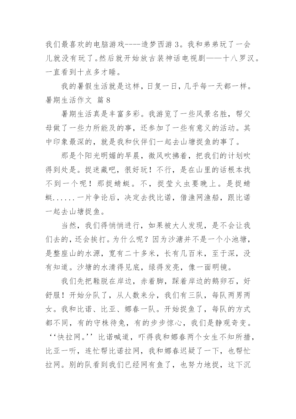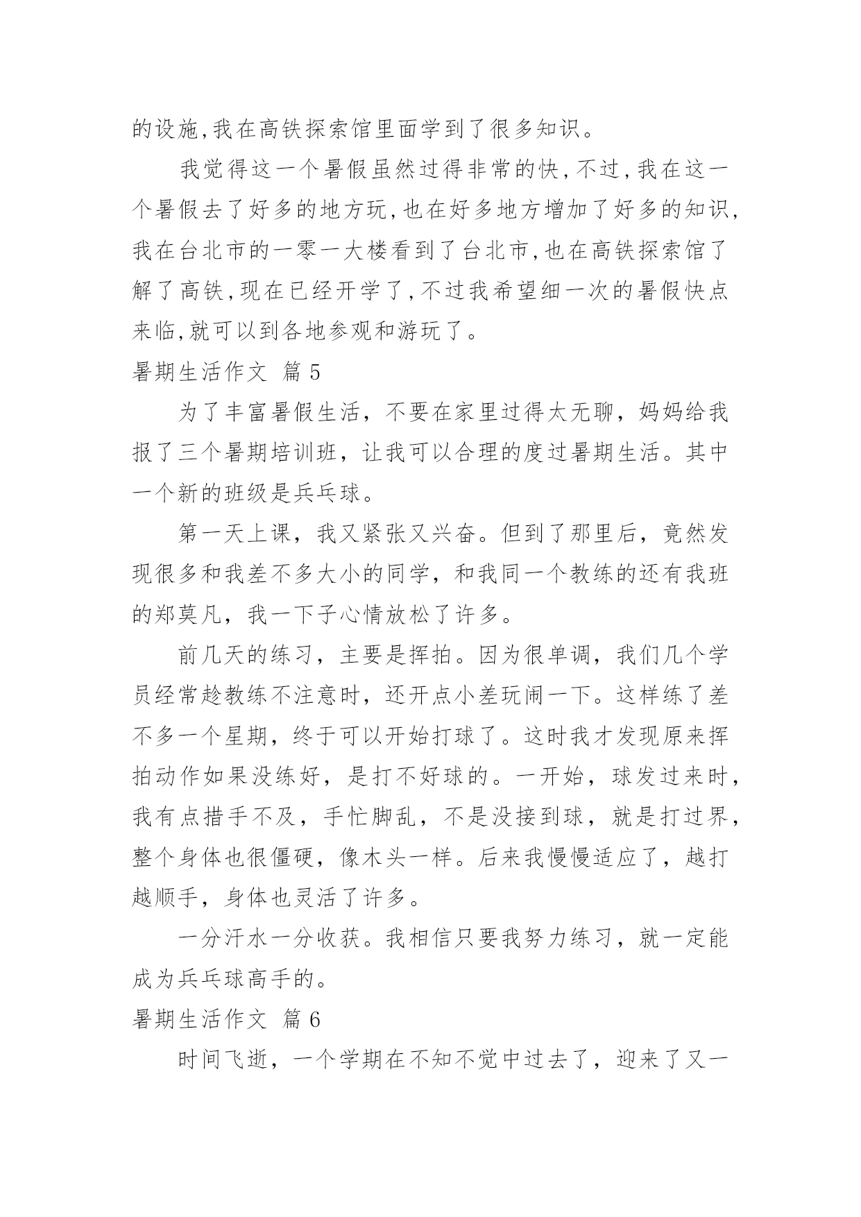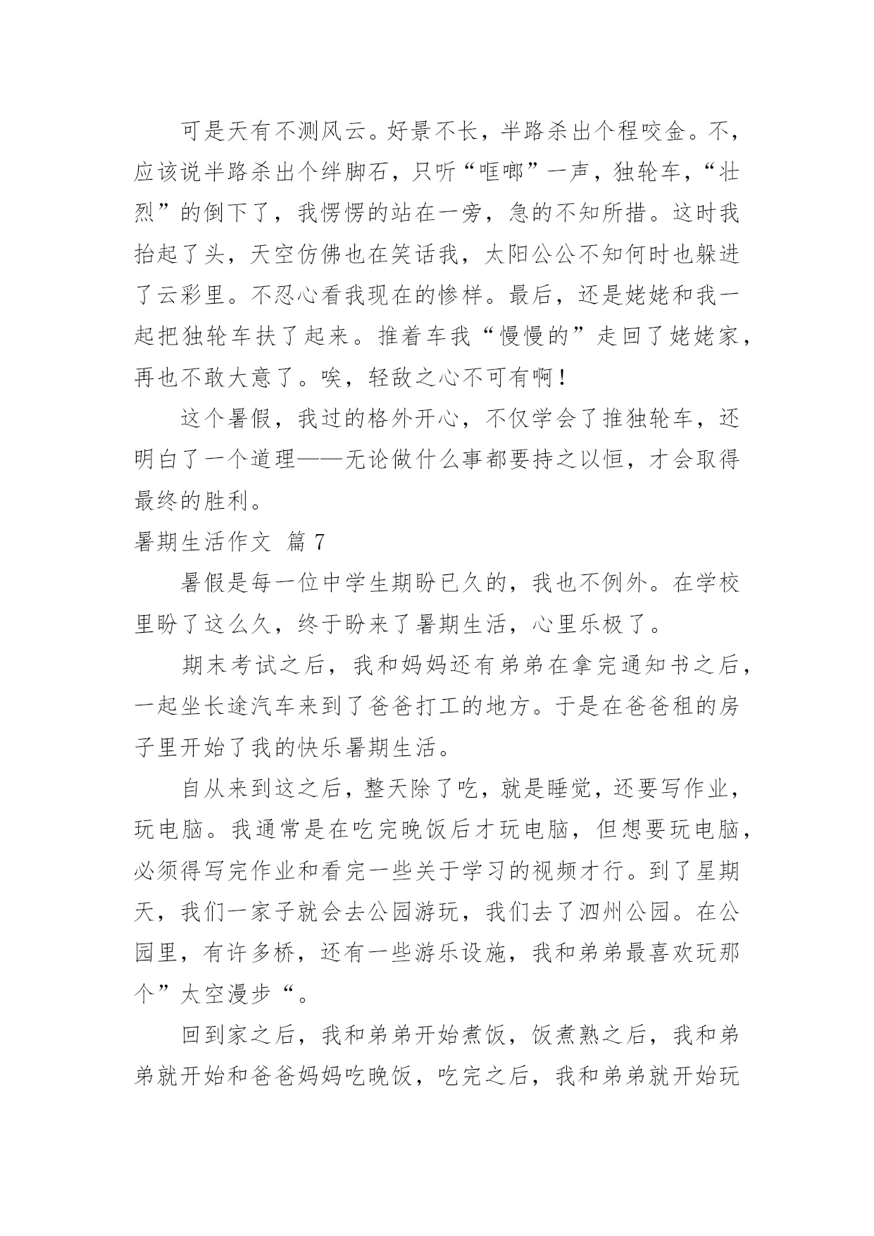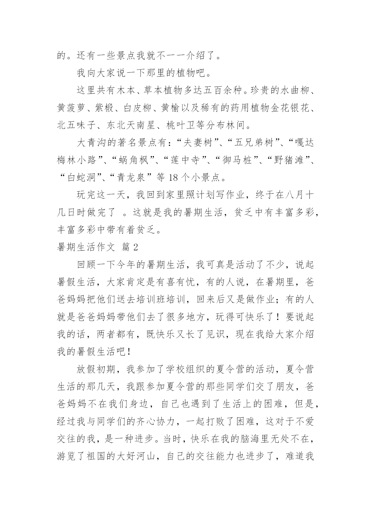 暑期生活作文暑期生活作文汇总9篇在学习、工作、生活中,大家都不可避免地会接触到作文吧,作文一定要做到主题集中,围绕同一主题作深入阐述,切忌东拉西扯,主题涣散甚至无主题。你知道作文怎样写才规范吗?下面是小编帮大家整理的暑期生活作文9篇,供大家参考借鉴,希望可以帮助到有需要的朋友。暑期生活作文篇1一谈起暑期生活,我就想起一些欢乐愉快的事情,今年暑假我去了大青沟等一些地方游玩。我去那玩了一整天呢,又学到了许许多多的知识。我是七月份去的大清沟,去那里后,使我回味了良久。到了那里,我和窦月晗抱着愉快的心情跳下了车,玩了整整一天,我还学会了很多很多的知识。在大青沟里走了一段时间后,我看见了“夫妻树”。这棵树有一个共同的树根,但上面长出了两棵树干,我仔细看了看,有一颗略壮一些,有一颗略细一些,这两棵树缠绕在一起,难怪名字叫“夫妻树”呢。我和窦月晗被强迫的照了一张相片。过了一会儿,我们又来到了“五兄弟树”的面前,这棵树和“夫妻树”差不多,只不过同一个树根上长出了五棵树,这棵树和“夫妻树”不一样的地方是:“夫妻树”的两棵树是缠绕在一起的,而“五兄弟树”的五棵树是紧紧挨在一起的。还有一些景点我就不一一介绍了。我向大家说一下那里的植物吧。这里共有木本、草本植物多达五百余种。珍贵的水曲柳、黄菠萝、紫椴、白皮柳、黄榆以及稀有的药用植物金花银花、北五味子、东北天南星、桃叶卫等分布林间。大青沟的著名景点有:“夫妻树”、“五兄弟树”、“嘎达梅林小路”、“蜗角枫”、“莲中寺”、“御马桩”、“野猪滩”、“白蛇洞”、“青龙泉”等18个小景点。玩完这一天,我回到家里照计划写作业,终于在八月十几日时做完了。这就是我的暑期生活,贫乏中有丰富多彩,丰富多彩中带有着贫乏。暑期生活作文篇2回顾一下今年的暑期生活,我可真是活动了不少,说起暑假生活,大家肯定是有喜有忧,有的人说,在暑期里,爸爸妈妈把他们送去培训班培训,回来后又是做作业;有的人就是爸爸妈妈带他们去了很多地方,玩得可快乐了!要说起我的话,两者都有,既快乐又长了见识,现在我给大家介绍我的暑假生活吧!放假初期,我参加了学校组织的夏令营的活动,夏令营生活的那几天,我跟参加夏令营的那些同学们交了朋友,爸爸妈妈不在我们身边,自己也遇到了生活上的困难,但是,经过我与同学们的齐心协力,一起打败了困难,这对于不爱交往的我,是一种进步。当时,快乐在我的脑海里无处不在,游览了祖国的大好河山,自己的交往能力也进步了,难道我不快乐吗?回来以后,我把在夏令营途中所发生的事情,都告诉了家人,爸爸妈妈连忙夸我长大了,我也觉得在夏令营中学会了自理,以前的那个“娇气妹子”一下子消失不见了,我可真高兴,我才不愿意当“娇气妹子”呢!自从在夏令营里天天都要运动,要早起床的要求后,每天在家里我也养成了早起锻炼的好习惯,制定了一个运动计划,天才蒙蒙亮,我早早地起了床,围绕院子跑六圈,做压腿三十下,以前我受不住这种运动,现在我感觉到运动才是最好的疗养方法,刚开始练练跑步,现在打打羽毛球,学羽毛球的过程中,我尝尽了酸甜苦辣,失利时,我就想起中国女排姑娘们拼搏奋斗的精神,有时摔倒了,也不埋怨谁,终于我的球技进步了,敢与爸爸妈妈挑战,比赛过程中,笑声、喊声,成了一片欢乐的海洋……假期里最值得一提的算是一次爱心捐款,我们湖南经济频道搞了一次爱心助学活动,帮助寒门学子的捐款活动,一次,我看到电视上有一名考上上海交通大学却交不起学费的时候,我当时很伤心,为什么这么优秀的学生却无钱上学呢?我立即拨通了助学电话,我对工作人员说,我要捐助一名考取大学的寒门学子,工作人员很感动,对我说要好好读书,将来要象他们那样考上一所好大学,报效祖国……这是我今年的暑期生活,一个又有意义有快乐的假日,我有期待明年的假日更美好!暑期生活作文篇3古有孔夫子搬家,今有孙夫子打工。假期的一天,我到学校参加篮球训练后,来到学校办公室,发现爸爸正在打印、复印资料。于是我灵机一动,想挣挣表现:“老爸,我来帮你吧!给我开多少工资?”“好朋友还要工资吗?不过,我可以考虑考虑,武都红糖冰粉两碗!”“君子一言!”我迫不及待地说。“驷马难追。”我发现爸爸诡异地笑了。打工正式开始了,我学着爸爸的样子一本正经地干了起来。我先将爸爸需要复印的《教学常规检查表》放在了复印机的扫描区里,在操作键盘区输入了“1”,随着机器奏出的美妙音乐,我的第一份作品就大功告成了!咦,怎么这幅模样——这张表怎么只印了一半呢?我的脸火辣辣的,心里像十五只吊桶打水——七上八下。“老板,我的产品不合格,请您指导!”“指导可以,不过要扣工资喔!”爸爸笑着说。在“老板”的指导下,我终于掌握了复印资料的“武功秘籍”,那简直胜过《降龙十八掌》和《葵花宝典》。只见一张张资料像列队的卫兵整齐地排列在出纸盘上。随后《听课记录表》《教研活动记录表》《班班通使用记录