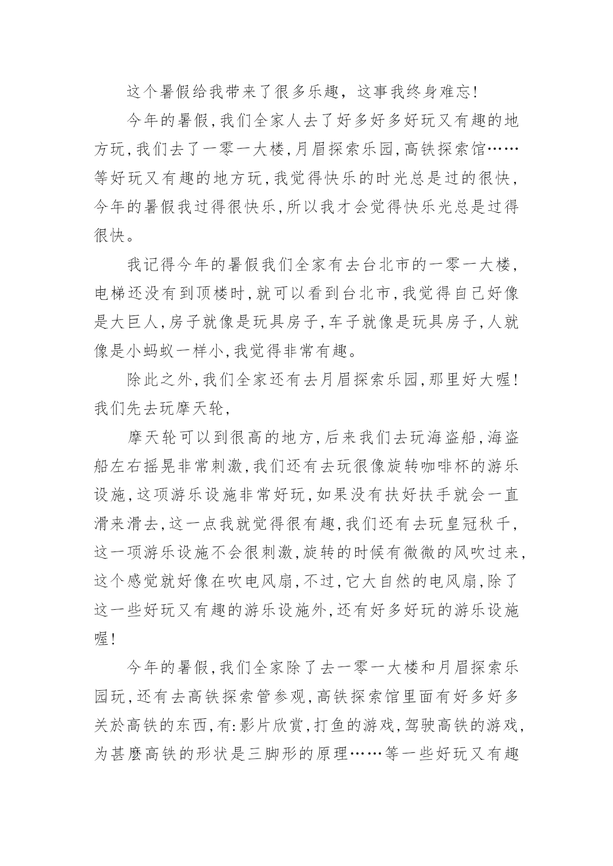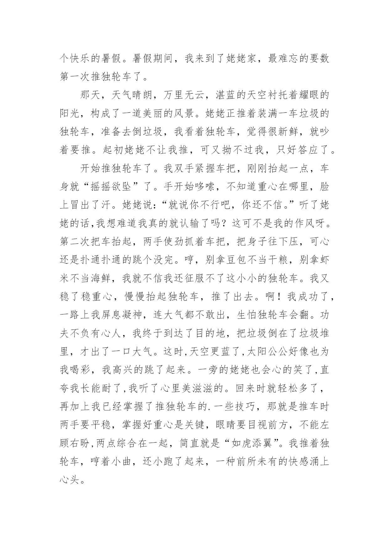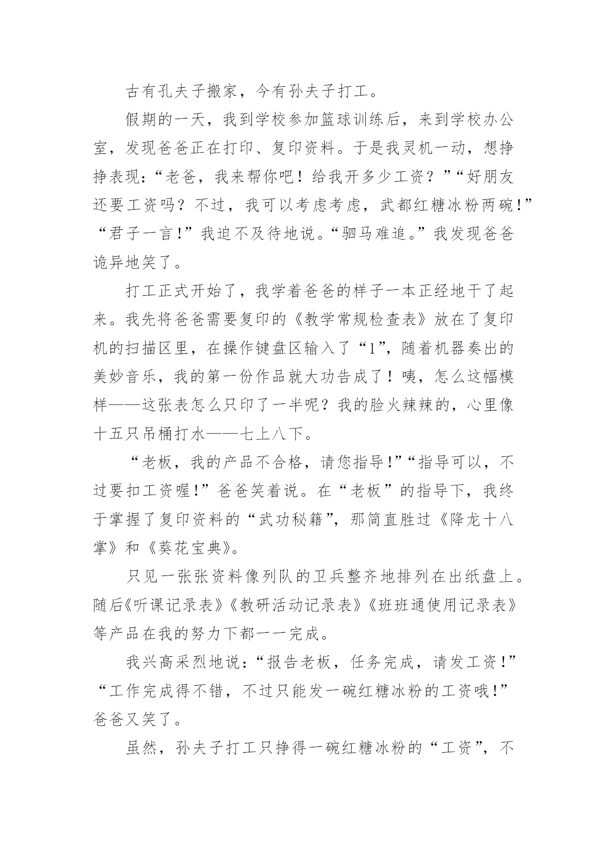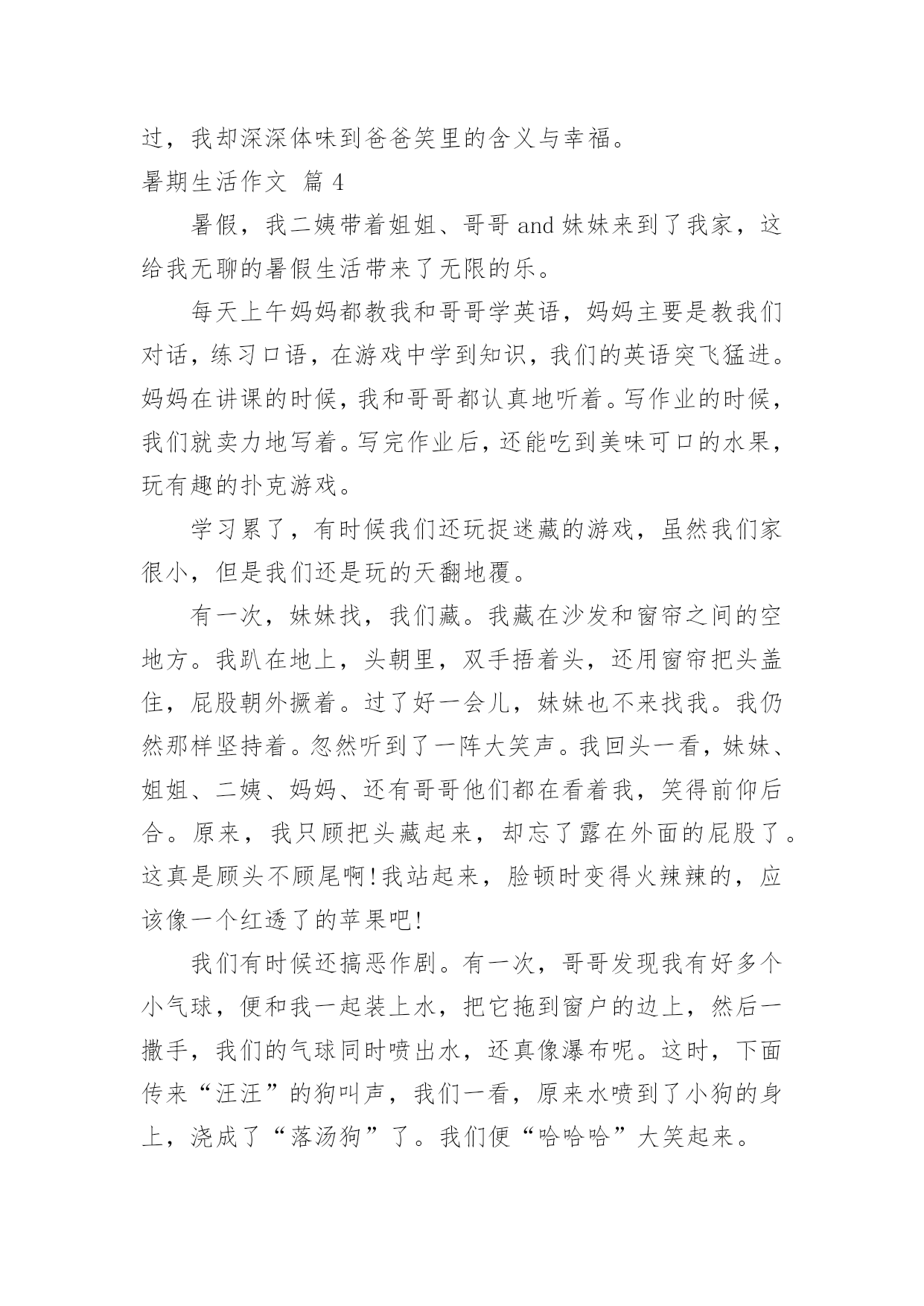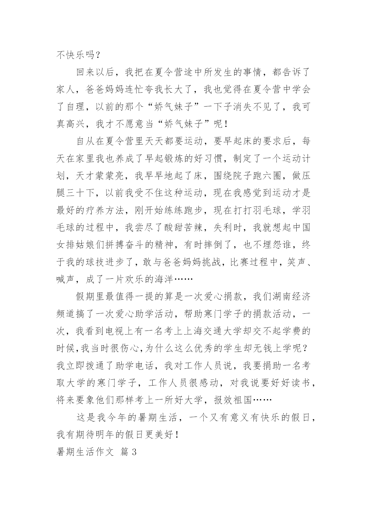 暑期生活作文暑期生活作文汇总9篇在学习、工作、生活中,大家都不可避免地会接触到作文吧,作文一定要做到主题集中,围绕同一主题作深入阐述,切忌东拉西扯,主题涣散甚至无主题。你知道作文怎样写才规范吗?下面是小编帮大家整理的暑期生活作文9篇,供大家参考借鉴,希望可以帮助到有需要的朋友。暑期生活作文篇1一谈起暑期生活,我就想起一些欢乐愉快的事情,今年暑假我去了大青沟等一些地方游玩。我去那玩了一整天呢,又学到了许许多多的知识。我是七月份去的大清沟,去那里后,使我回味了良久。到了那里,我和窦月晗抱着愉快的心情跳下了车,玩了整整一天,我还学会了很多很多的知识。在大青沟里走了一段时间后,我看见了“夫妻树”。这棵树有一个共同的树根,但上面长出了两棵树干,我仔细看了看,有一颗略壮一些,有一颗略细一些,这两棵树缠绕在一起,难怪名字叫“夫妻树”呢。我和窦月晗被强迫的照了一张相片。过了一会儿,我们又来到了“五兄弟树”的面前,这棵树和“夫妻树”差不多,只不过同一个树根上长出了五棵树,这棵树和“夫妻树”不一样的地方是:“夫妻树”的两棵树是缠绕在一起的,而“五兄弟树”的五棵树是紧紧挨在一起的。还有一些景点我就不一一介绍了。我向大家说一下那里的植物吧。这里共有木本、草本植物多达五百余种。珍贵的水曲柳、黄菠萝、紫椴、白皮柳、黄榆以及稀有的药用植物金花银花、北五味子、东北天南星、桃叶卫等分布林间。大青沟的著名景点有:“夫妻树”、“五兄弟树”、“嘎达梅林小路”、“蜗角枫”、“莲中寺”、“御马桩”、“野猪滩”、“白蛇洞”、“青龙泉”等18个小景点。玩完这一天,我回到家里照计划写作业,终于在八月十几日时做完了。这就是我的暑期生活,贫乏中有丰富多彩,丰富多彩中带有着贫乏。暑期生活作文篇2回顾一下今年的暑期生活,我可真是活动了不少,说起暑假生活,大家肯定是有喜有忧,有的人说,在暑期里,爸爸妈妈把他们送去培训班培训,回来后又是做作业;有的人就是爸爸妈妈带他们去了很多地方,玩得可快乐了!要说起我的话,两者都有,既快乐又长了见识,现在我给大家介绍我的暑假生活吧!放假初期,我参加了学校组织的夏令营的活动,夏令营生活的那几天,我跟参加夏令营的那些同学们交了朋友,爸爸妈妈不在我们身边,自己也遇到了生活上的困难,但是,经过我与同学们的齐心协力,一起打败了困难,这对于不爱交往的我,是一种进步。当时,快乐在我的脑海里无处不在,游览了祖国的大好河山,自己的交往能力也进步了,难道我不快乐吗?回来以后,我把在夏令营途中所发生的事情,都告诉了家人,爸爸妈妈连忙夸我长大了,我也觉得在夏令营中学会了自理,以前的那个“娇气妹子”一下子消失不见了,我可真高兴,我才不愿意当“娇气妹子”呢!自从在夏令营里天天都要运动,要早起床的要求后,每天在家里我也养成了早起锻炼的好习惯,制定了一个运动计划,天才蒙蒙亮,我早早地起了床,围绕院子跑六圈,做压腿三十下,以前我受不住这种运动,现在我感觉到运动才是最好的疗养方法,刚开始练练跑步,现在打打羽毛球,学羽毛球的过程中,我尝尽了酸甜苦辣,失利时,我就想起中国女排姑娘们拼搏奋斗的精神,有时摔倒了,也不埋怨谁,终于我的球技进步了,敢与爸爸妈妈挑战,比赛过程中,笑声、喊声,成了一片欢乐的海洋……假期里最值得一提的算是一次爱心捐款,我们湖南经济频道搞了一次爱心助学活动,帮助寒门学子的捐款活动,一次,我看到电视上有一名考上上海交通大学却交不起学费的时候,我当时很伤心,为什么这么优秀的学生却无钱上学呢?我立即拨通了助学电话,我对工作人员说,我要捐助一名考取大学的寒门学子,工作人员很感动,对我说要好好读书,将来要象他们那样考上一所好大学,报效祖国……这是我今年的暑期生活,一个又有意义有快乐的假日,我有期待明年的假日更美好!暑期生活作文篇3古有孔夫子搬家,今有孙夫子打工。假期的一天,我到学校参加篮球训练后,来到学校办公室,发现爸爸正在打印、复印资料。于是我灵机一动,想挣挣表现:“老爸,我来帮你吧!给我开多少工资?”“好朋友还要工资吗?不过,我可以考虑考虑,武都红糖冰粉两碗!”“君子一言!”我迫不及待地说。“驷马难追。”我发现爸爸诡异地笑了。打工正式开始了,我学着爸爸的样子一本正经地干了起来。我先将爸爸需要复印的《教学常规检查表》放在了复印机的扫描区里,在操作键盘区输入了“1”,随着机器奏出的美妙音乐,我的第一份作品就大功告成了!咦,怎么这幅模样——这张表怎么只印了一半呢?我的脸火辣辣的,心里像十五只吊桶打水——七上八下。“老板,我的产品不合格,请您指导!”“指导可以,不过要扣工资喔!”爸爸笑着说。在“老板”的指导下,我终于掌握了复印资料的“武功秘籍”,那简直胜过《降龙十八掌》和《葵花宝典》。只见一张张资料像列队的卫兵整齐地排列在出纸盘上。随后《听课记录表》《教研活动记录表》《班班通使用记录