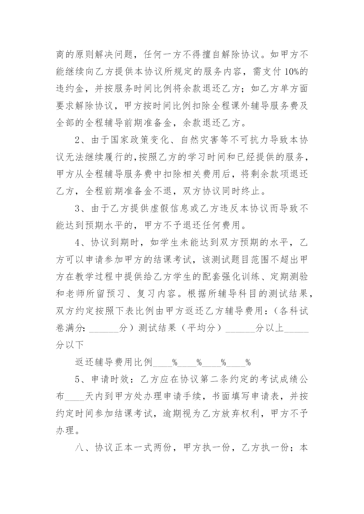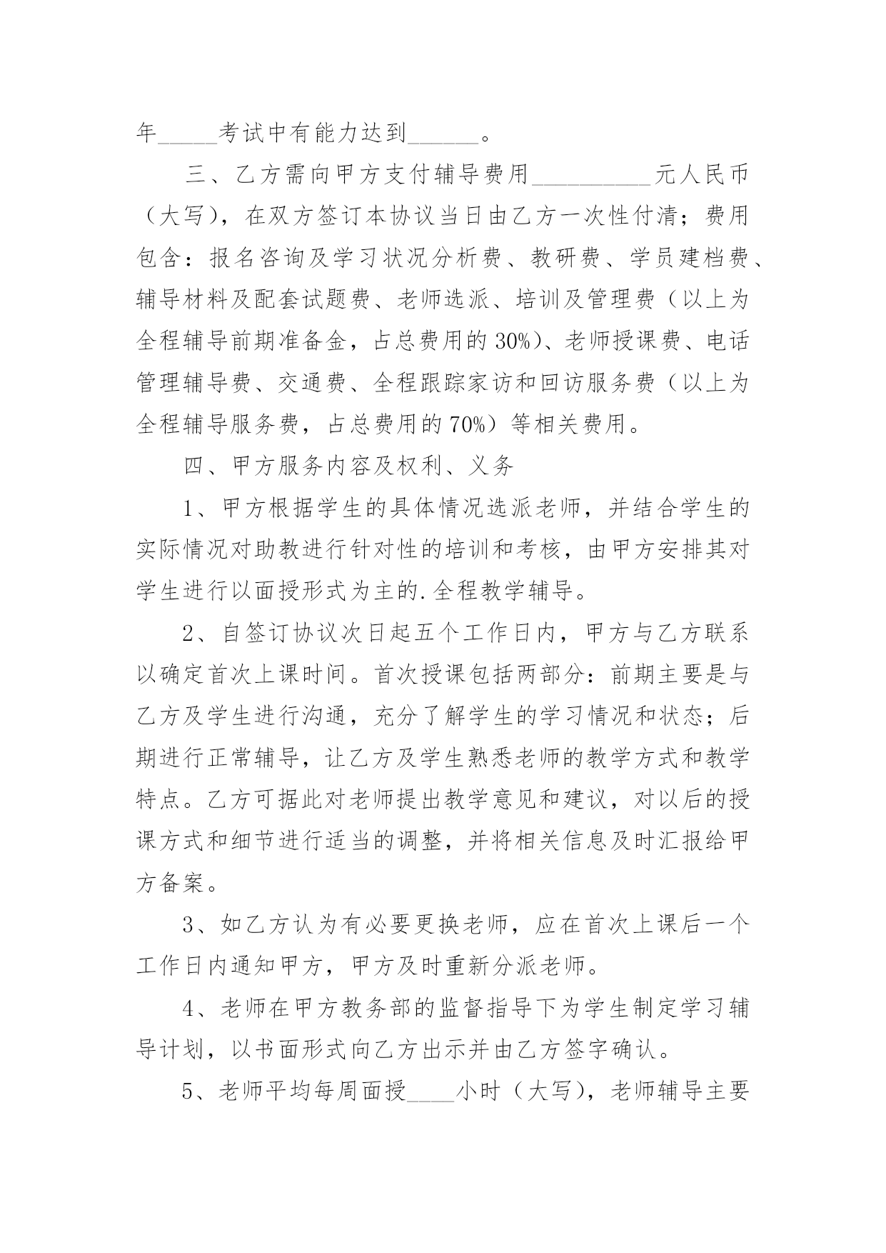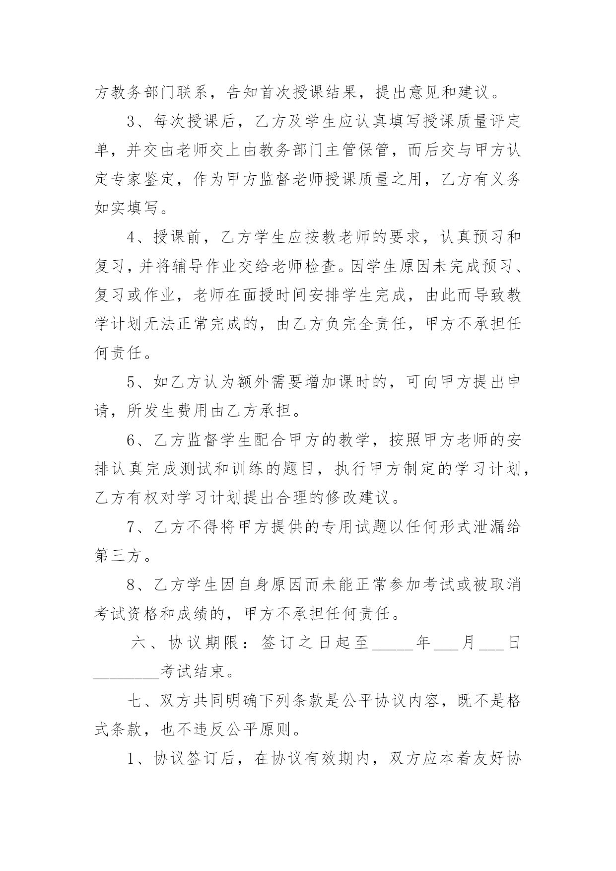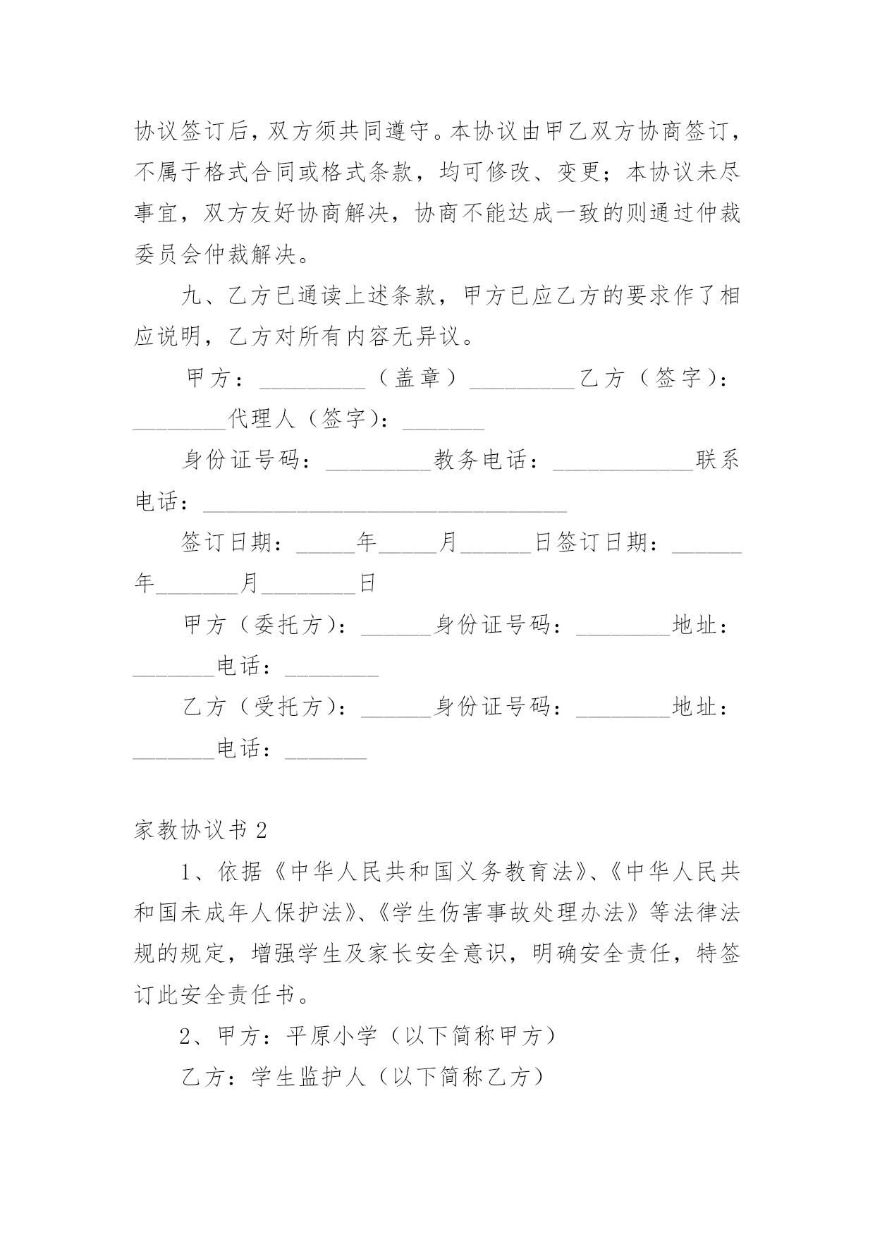 家教协议书家教协议书(汇编15篇)在快速变化和不断变革的今天,人们运用到协议的场合不断增多,签订了协议就有了法律依靠。协议的注意事项有许多,你确定会写吗?以下是小编整理的家教协议书,希望能够帮助到大家。家教协议书1甲方(受托方):_______________乙方(委托方):________________为使乙方学生_________得到切实有效的课外辅导,提高学习成绩,甲乙双方在平等自愿的情况下,本着公平诚信原则,就乙方委托甲方对其子/女进行课外辅导事宜达成如下协议:一、目前学生学习成绩状况:学生最近一次在学校的考试为_______学校______年级的考试,在此次考试中_____科总成绩______分,平均分数为______,班级排名为_____,需要辅导的科目具体分数为:语文___分,数学___分,英语___分,物理____分,化学____分,生物____分,政治____分,历史____分,地理___分。(以上学生资料由乙方提供)二、辅导目标:甲乙双方均认为,经过乙方及学生在学习方面的努力并积极配合甲方的课外辅导,该学生在_____年_____考试中有能力达到______。三、乙方需向甲方支付辅导费用__________元人民币(大写),在双方签订本协议当日由乙方一次性付清;费用包含:报名咨询及学习状况分析费、教研费、学员建档费、辅导材料及配套试题费、老师选派、培训及管理费(以上为全程辅导前期准备金,占总费用的30%)、老师授课费、电话管理辅导费、交通费、全程跟踪家访和回访服务费(以上为全程辅导服务费,占总费用的70%)等相关费用。四、甲方服务内容及权利、义务1、甲方根据学生的具体情况选派老师,并结合学生的实际情况对助教进行针对性的培训和考核,由甲方安排其对学生进行以面授形式为主的.全程教学辅导。2、自签订协议次日起五个工作日内,甲方与乙方联系以确定首次上课时间。首次授课包括两部分:前期主要是与乙方及学生进行沟通,充分了解学生的学习情况和状态;后期进行正常辅导,让乙方及学生熟悉老师的教学方式和教学特点。乙方可据此对老师提出教学意见和建议,对以后的授课方式和细节进行适当的调整,并将相关信息及时汇报给甲方备案。3、如乙方认为有必要更换老师,应在首次上课后一个工作日内通知甲方,甲方及时重新分派老师。4、老师在甲方教务部的监督指导下为学生制定学习辅导计划,以书面形式向乙方出示并由乙方签字确认。5、老师平均每周面授____小时(大写),老师辅导主要有以下几种形式:(1)指定学习内容,由学生自主学习。包括课前的预习、测试、以及课后复习。老师将给出预习和复习的思路和目标,并给以测试时间,在对测试进行评定后予以讲解。(2)面授:老师将根据学生预习的内容以及授课计划,确定本次授课内容,并向乙方或学生出示本次备课笔记,乙方或学生必须签字确认。(3)电话助学:在非授课时间(周一至周五),学生以电话形式按照当周计划规定时间主动向老师汇报当天学习情况、作业完成情况和周计划执行情况(当无法联系老师时,应向班主任汇报),以利于甲方对学生进行监督和指导,督促学生学习,培养良好的学习习惯,及时解决学习过程中出现的问题。电话助学情况由老师进行记录,并由乙方签字确认。6、甲方根据学生学习情况和考试重点为学生提供配套试题,定期对学生进行适量的强化训练和测验;甲方教务部为乙方学生指派专职班主任一名,对学生进行电话回访,监督学生的学习状况,跟踪辅导过程和效果,及时对教学计划进行调整,并在必要时对乙方进行家访。五、乙方权利和义务1、乙方向甲方提供学生真实有效的详细资料,为甲方的后续服务提供依据。2、老师首次授课时乙方及学生都应在场,积极主动与老师进行沟通,全面了解老师的授课特点及质量,及时与甲方教务部门联系,告知首次授课结果,提出意见和建议。3、每次授课后,乙方及学生应认真填写授课质量评定单,并交由老师交上由教务部门主管保管,而后交与甲方认定专家鉴定,作为甲方监督老师授课质量之用,乙方有义务如实填写。4、授课前,乙方学生应按教老师的要求,认真预习和复习,并将辅导作业交给老师检查。因学生原因未完成预习、复习或作业,老师在面授时间安排学生完成,由此而导致教学计划无法正常完成的,由乙方负完全责任,甲方不承担任何责任。5、如乙方认为额外需要增加课时的,可向甲方提出申请,所发生费用由乙方承担。6、乙方监督学生配合甲方的教学,按照甲方老师的安排认真完成测试和训练的题目,执行甲方制定的学习计划,乙方有权对学习计划提出合理的修改建议。7、乙方不得将甲方提供的专用试题以任何形式泄漏给第三方。8、乙方学生因自身原因而未能正常参加考试或被取消考试资格和成绩的,甲方不承担任何责任。六、协议期限:签订之日起至_____年___月___日________考试结束。七、双方共同明确下列条款