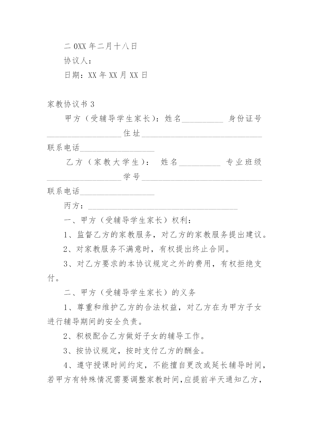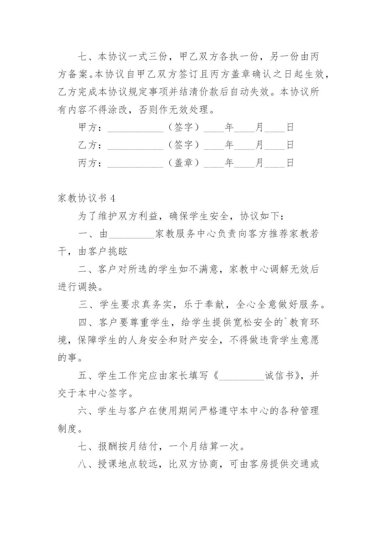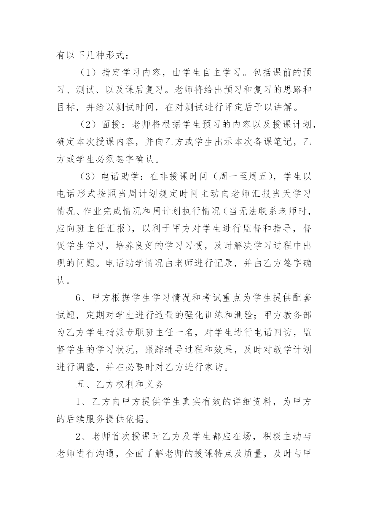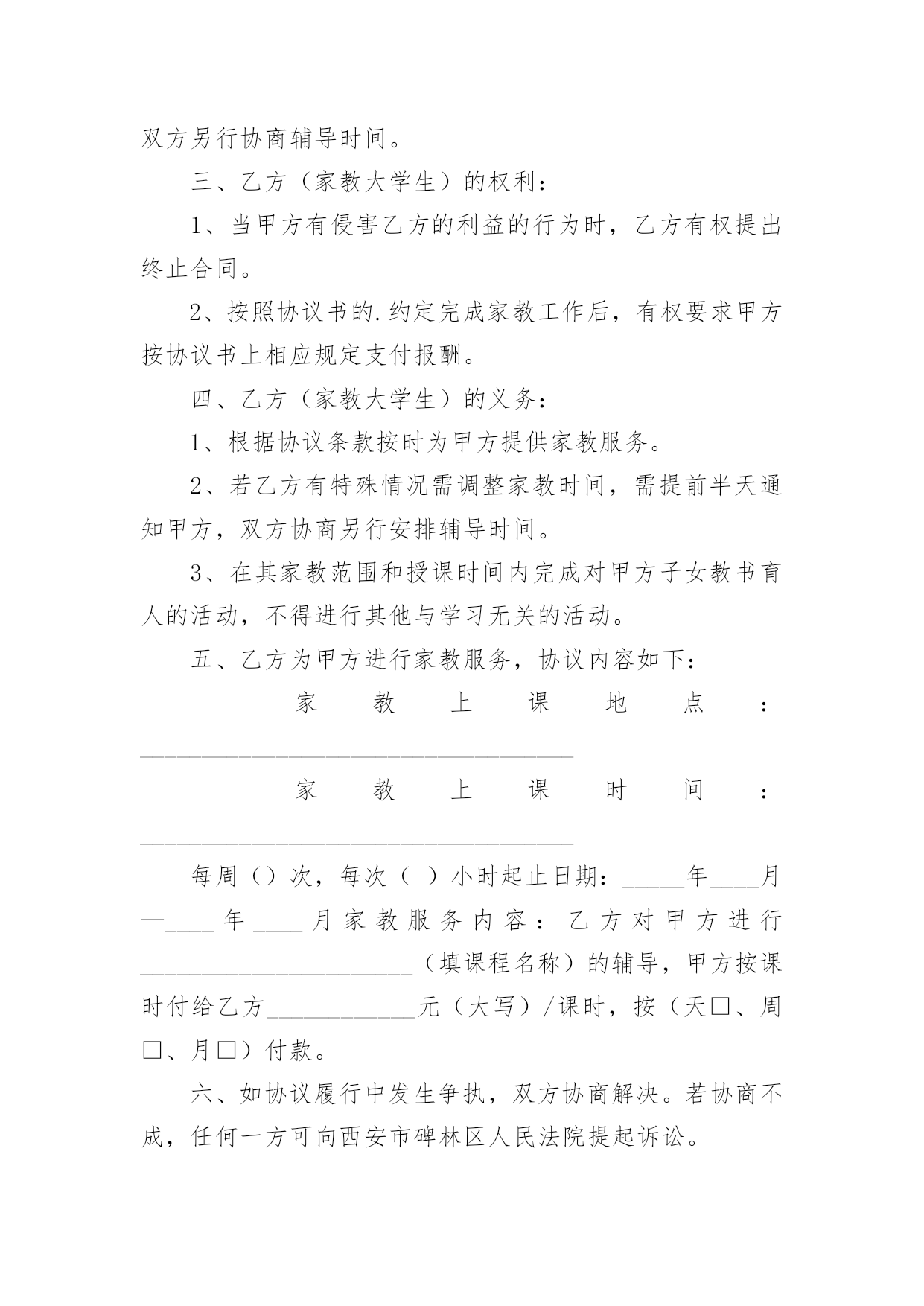 家教协议书家教协议书(汇编15篇)在快速变化和不断变革的今天,人们运用到协议的场合不断增多,签订了协议就有了法律依靠。协议的注意事项有许多,你确定会写吗?以下是小编整理的家教协议书,希望能够帮助到大家。家教协议书1甲方(受托方):_______________乙方(委托方):________________为使乙方学生_________得到切实有效的课外辅导,提高学习成绩,甲乙双方在平等自愿的情况下,本着公平诚信原则,就乙方委托甲方对其子/女进行课外辅导事宜达成如下协议:一、目前学生学习成绩状况:学生最近一次在学校的考试为_______学校______年级的考试,在此次考试中_____科总成绩______分,平均分数为______,班级排名为_____,需要辅导的科目具体分数为:语文___分,数学___分,英语___分,物理____分,化学____分,生物____分,政治____分,历史____分,地理___分。(以上学生资料由乙方提供)二、辅导目标:甲乙双方均认为,经过乙方及学生在学习方面的努力并积极配合甲方的课外辅导,该学生在_____年_____考试中有能力达到______。三、乙方需向甲方支付辅导费用__________元人民币(大写),在双方签订本协议当日由乙方一次性付清;费用包含:报名咨询及学习状况分析费、教研费、学员建档费、辅导材料及配套试题费、老师选派、培训及管理费(以上为全程辅导前期准备金,占总费用的30%)、老师授课费、电话管理辅导费、交通费、全程跟踪家访和回访服务费(以上为全程辅导服务费,占总费用的70%)等相关费用。四、甲方服务内容及权利、义务1、甲方根据学生的具体情况选派老师,并结合学生的实际情况对助教进行针对性的培训和考核,由甲方安排其对学生进行以面授形式为主的.全程教学辅导。2、自签订协议次日起五个工作日内,甲方与乙方联系以确定首次上课时间。首次授课包括两部分:前期主要是与乙方及学生进行沟通,充分了解学生的学习情况和状态;后期进行正常辅导,让乙方及学生熟悉老师的教学方式和教学特点。乙方可据此对老师提出教学意见和建议,对以后的授课方式和细节进行适当的调整,并将相关信息及时汇报给甲方备案。3、如乙方认为有必要更换老师,应在首次上课后一个工作日内通知甲方,甲方及时重新分派老师。4、老师在甲方教务部的监督指导下为学生制定学习辅导计划,以书面形式向乙方出示并由乙方签字确认。5、老师平均每周面授____小时(大写),老师辅导主要有以下几种形式:(1)指定学习内容,由学生自主学习。包括课前的预习、测试、以及课后复习。老师将给出预习和复习的思路和目标,并给以测试时间,在对测试进行评定后予以讲解。(2)面授:老师将根据学生预习的内容以及授课计划,确定本次授课内容,并向乙方或学生出示本次备课笔记,乙方或学生必须签字确认。(3)电话助学:在非授课时间(周一至周五),学生以电话形式按照当周计划规定时间主动向老师汇报当天学习情况、作业完成情况和周计划执行情况(当无法联系老师时,应向班主任汇报),以利于甲方对学生进行监督和指导,督促学生学习,培养良好的学习习惯,及时解决学习过程中出现的问题。电话助学情况由老师进行记录,并由乙方签字确认。6、甲方根据学生学习情况和考试重点为学生提供配套试题,定期对学生进行适量的强化训练和测验;甲方教务部为乙方学生指派专职班主任一名,对学生进行电话回访,监督学生的学习状况,跟踪辅导过程和效果,及时对教学计划进行调整,并在必要时对乙方进行家访。五、乙方权利和义务1、乙方向甲方提供学生真实有效的详细资料,为甲方的后续服务提供依据。2、老师首次授课时乙方及学生都应在场,积极主动与老师进行沟通,全面了解老师的授课特点及质量,及时与甲方教务部门联系,告知首次授课结果,提出意见和建议。3、每次授课后,乙方及学生应认真填写授课质量评定单,并交由老师交上由教务部门主管保管,而后交与甲方认定专家鉴定,作为甲方监督老师授课质量之用,乙方有义务如实填写。4、授课前,乙方学生应按教老师的要求,认真预习和复习,并将辅导作业交给老师检查。因学生原因未完成预习、复习或作业,老师在面授时间安排学生完成,由此而导致教学计划无法正常完成的,由乙方负完全责任,甲方不承担任何责任。5、如乙方认为额外需要增加课时的,可向甲方提出申请,所发生费用由乙方承担。6、乙方监督学生配合甲方的教学,按照甲方老师的安排认真完成测试和训练的题目,执行甲方制定的学习计划,乙方有权对学习计划提出合理的修改建议。7、乙方不得将甲方提供的专用试题以任何形式泄漏给第三方。8、乙方学生因自身原因而未能正常参加考试或被取消考试资格和成绩的,甲方不承担任何责任。六、协议期限:签订之日起至_____年___月___日________考试结束。七、双方共同明确下列条款