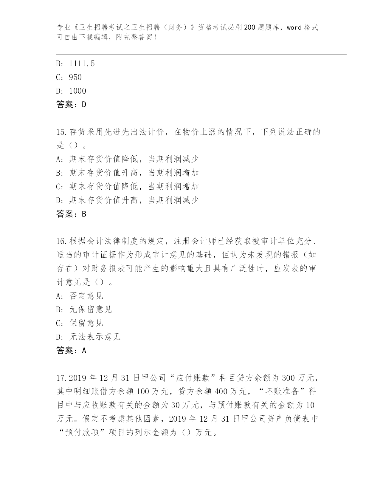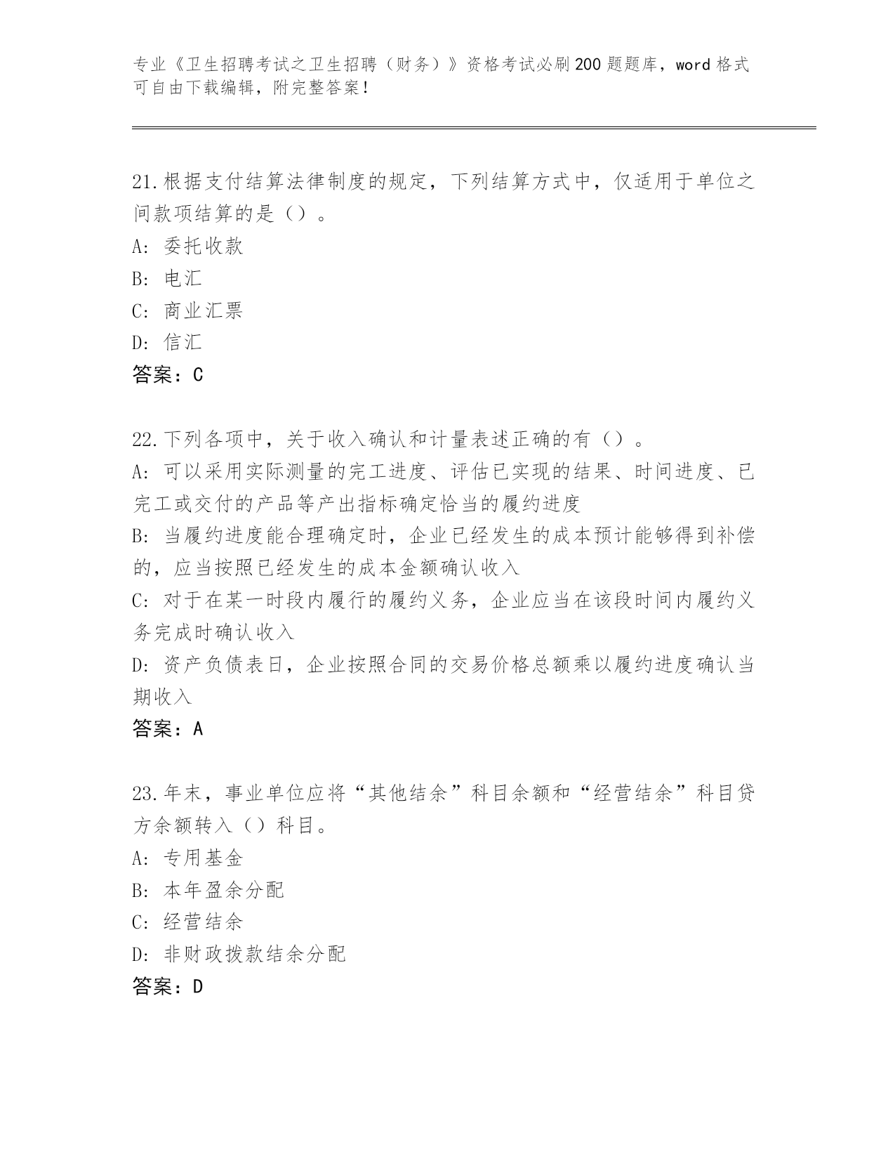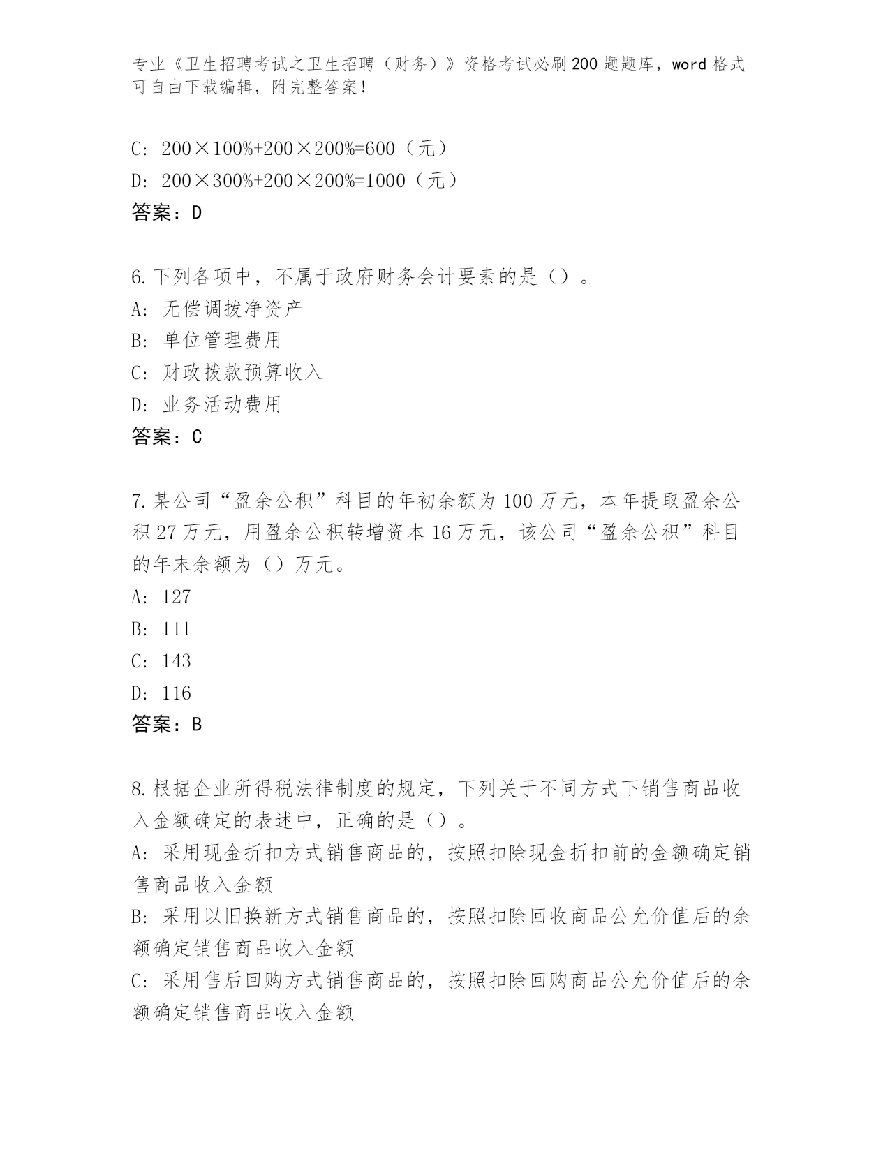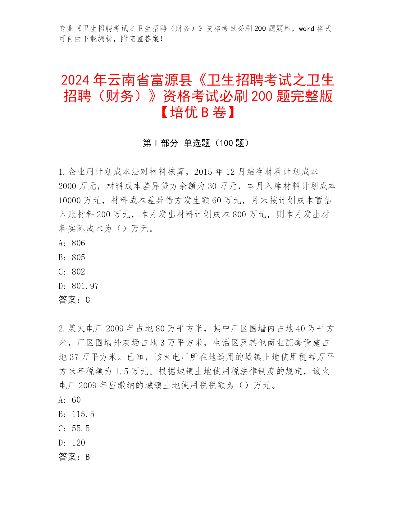 云南省富源县2024年《卫生招聘考试之卫生招聘(财务)》资格考试必刷200题真题题库带答案(培优B卷)