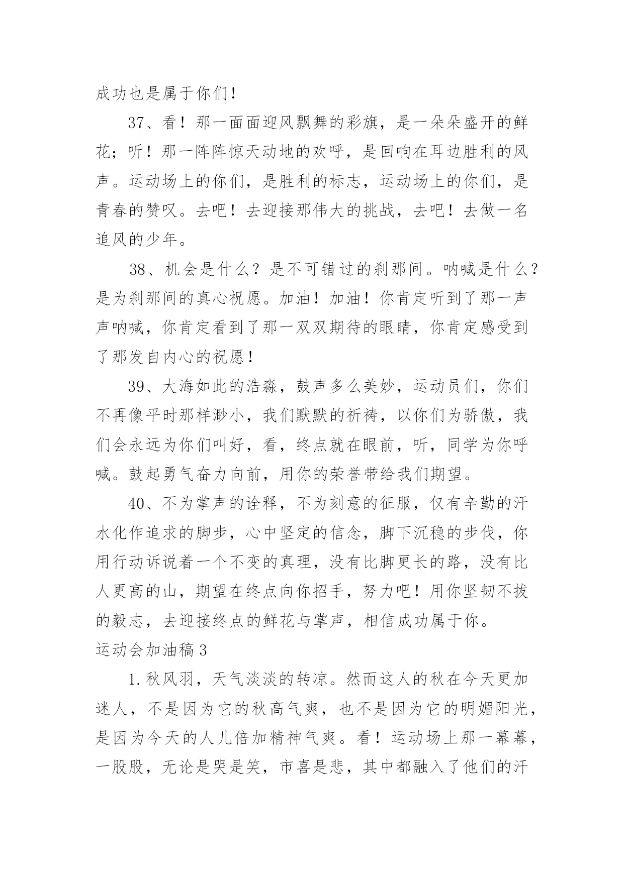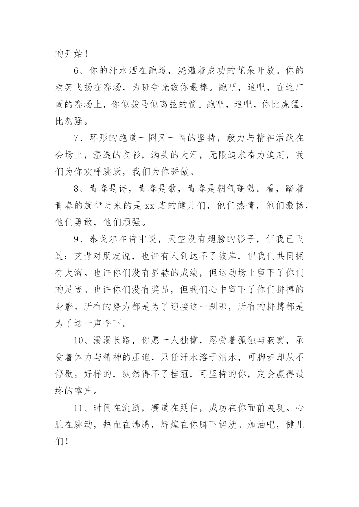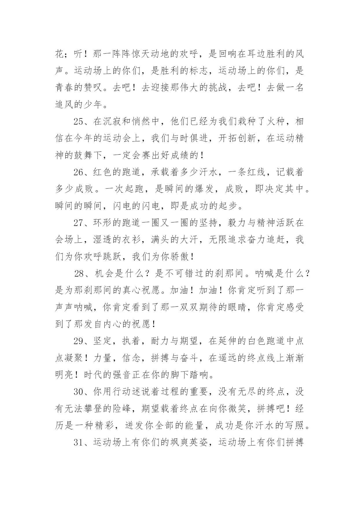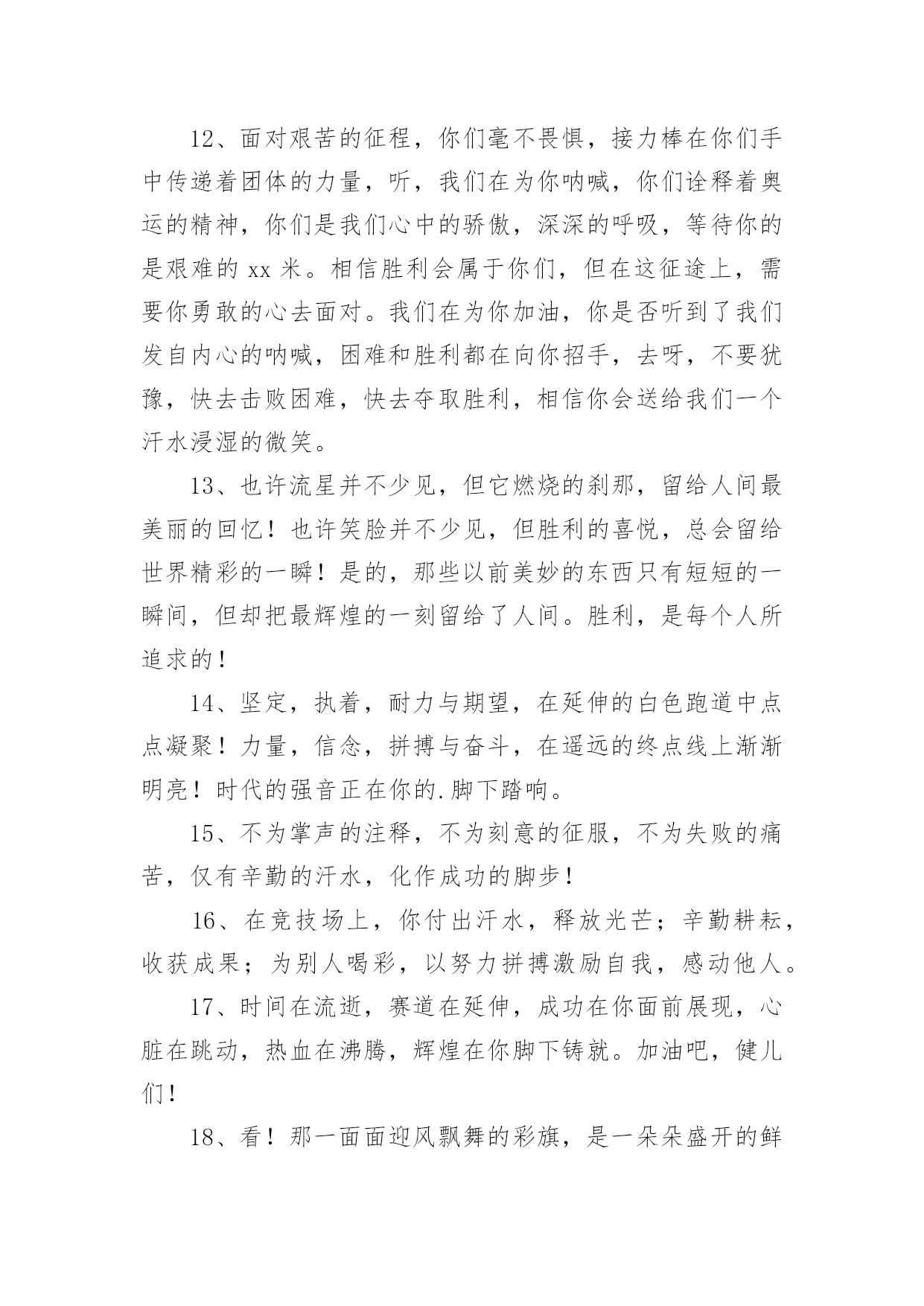 运动会加油稿运动会加油稿汇编[15篇]在不断进步的社会中,我们都可能会用到加油稿,加油稿是用于给别人加油鼓气,提升别人气势的文稿。写起加油稿来就毫无头绪?下面是小编精心整理的运动会加油稿,仅供参考,大家一起来看看吧。运动会加油稿1在起跑线上胡华港连续支付歌曲,攻击和铆钉你健美肌肉蕴含爆发力自信的眼神充满自信枪走火了你开始了一段短暂的旅程在笔直的跑道上有你稳定的.脚印离终点不远冲刺时会给你留下一个锋利的背部开始掌声将为你响起开始胜利和鲜花终将属于你运动会加油稿21、你们挥舞着充满力量的双臂,看着实心球化成美丽的弧线,我着实在心里佩服你们,你们抛出了自己的水平。2、你是运动场的心脏,跳动梦想;你是漫长路的精神,激励辉煌;你们是将上下求索的人!风为你加油,云为你助兴,坚定,执着,耐力与期望,在延伸的白色跑道中点点凝聚!力量,信念,拼搏与奋斗,在遥远的终点线上渐渐明亮!时代的强音正在你的脚下踏响。3、看!那一面面迎风飘舞的彩旗,是一朵朵盛开的鲜花;听!那一阵阵惊天动地的欢呼,是回响在耳边胜利的风声。运动场上的你们,是胜利的标志,运动场上的你们,是青春的赞叹。去吧!去迎接那伟大的挑战,去吧!去做一名追风的少年。4、秋风羽,天气淡淡的转凉。然而这秋在今日更加迷人,不是因为它的秋高气爽,也不是因为它的明媚阳光,是因为今日的人儿倍加精神气爽。看!运动场上那一幕幕,无论是哭是笑,是喜是悲,其中都融入了他们的汗水辛劳。他们是真正的矫健者,是运动场上的骄儿,更是我们心中的英雄。加油吧!英雄们!5、也许流星并不少见,但它燃烧的刹那,留给人间最美丽的回忆!也许笑脸并不少见,但胜利的喜悦,总会留给世界精彩的一瞬!是的,那些以往美妙的东西仅有短短的一瞬间,但那却把最辉煌的一刻留给人间。胜利,是每个人所追求的,胜利的喜悦,是胜利与重新开始的转折,胜利是新的开始!6、你的汗水洒在跑道,浇灌着成功的花朵开放。你的欢笑飞扬在赛场,为班争光数你最棒。跑吧,追吧,在这广阔的赛场上,你似骏马似离弦的箭。跑吧,追吧,你比虎猛,比豹强。7、环形的跑道一圈又一圈的坚持,毅力与精神活跃在会场上,湿透的衣衫,满头的大汗,无限追求奋力追赶,我们为你欢呼跳跃,我们为你骄傲。8、青春是诗,青春是歌,青春是朝气蓬勃。看,踏着青春的旋律走来的是xx班的健儿们,他们热情,他们激扬,他们勇敢,他们顽强。9、泰戈尔在诗中说,天空没有翅膀的影子,但我已飞过;艾青对朋友说,也许有人到达不了彼岸,但我们共同拥有大海。也许你们没有显赫的成绩,但运动场上留下了你们的足迹。也许你们没有奖品,但我们心中留下了你们拼搏的身影。所有的努力都是为了迎接这一刹那,所有的拼搏都是为了这一声令下。10、漫漫长路,你愿一人独撑,忍受着孤独与寂寞,承受着体力与精神的压迫,只任汗水溶于泪水,可脚步却从不停歇。好样的,纵然得不了桂冠,可坚持的你,定会赢得最终的掌声。11、时间在流逝,赛道在延伸,成功在你面前展现。心脏在跳动,热血在沸腾,辉煌在你脚下铸就。加油吧,健儿们!12、面对艰苦的征程,你们毫不畏惧,接力棒在你们手中传递着团体的力量,听,我们在为你呐喊,你们诠释着奥运的精神,你们是我们心中的骄傲,深深的呼吸,等待你的是艰难的xx米。相信胜利会属于你们,但在这征途上,需要你勇敢的心去面对。我们在为你加油,你是否听到了我们发自内心的呐喊,困难和胜利都在向你招手,去呀,不要犹豫,快去击败困难,快去夺取胜利,相信你会送给我们一个汗水浸湿的微笑。13、也许流星并不少见,但它燃烧的刹那,留给人间最美丽的回忆!也许笑脸并不少见,但胜利的喜悦,总会留给世界精彩的一瞬!是的,那些以前美妙的东西只有短短的一瞬间,但却把最辉煌的一刻留给了人间。胜利,是每个人所追求的!14、坚定,执着,耐力与期望,在延伸的白色跑道中点点凝聚!力量,信念,拼搏与奋斗,在遥远的终点线上渐渐明亮!时代的强音正在你的.脚下踏响。15、不为掌声的注释,不为刻意的征服,不为失败的痛苦,仅有辛勤的汗水,化作成功的脚步!16、在竞技场上,你付出汗水,释放光芒;辛勤耕耘,收获成果;为别人喝彩,以努力拼搏激励自我,感动他人。17、时间在流逝,赛道在延伸,成功在你面前展现,心脏在跳动,热血在沸腾,辉煌在你脚下铸就。加油吧,健儿们!18、看!那一面面迎风飘舞的彩旗,是一朵朵盛开的鲜花;听!那一阵阵惊天动地的欢呼,是回响在耳边胜利的风声。运动场上的你们,是胜利的标志,运动场上的你们,是青春的赞叹。去吧!去迎接那伟大的挑战,去吧!去做一名追风的少年。19、汗水,泪水,笑声,歌声,我们尽情挥洒。开幕式上,运动场上,我们尽情展现,多少艰辛,多少困苦,我们勇敢承担。因为年轻,因为张扬,因为我们知道:用今日的汗水换来明天的微笑。20、短暂的一瞬间,显示出你惊人的速度,铿锵有力的一声吼叫,把你全身