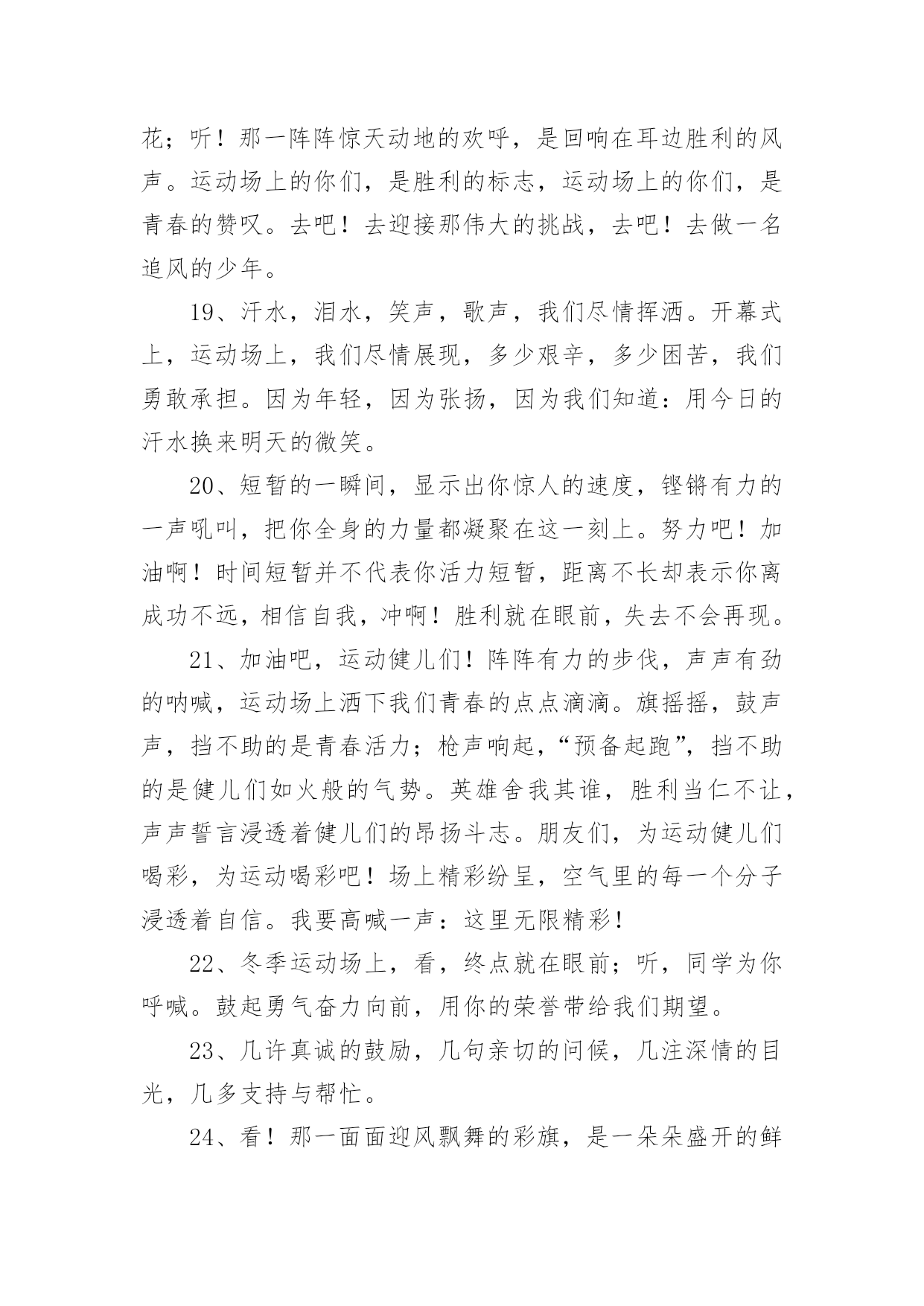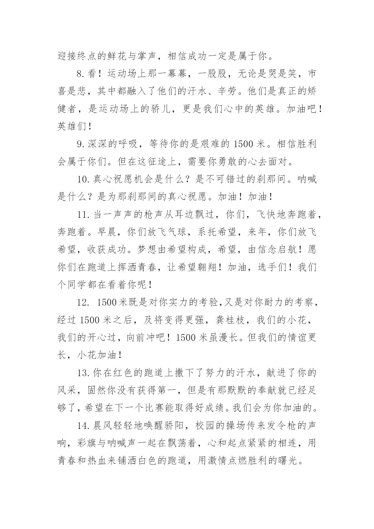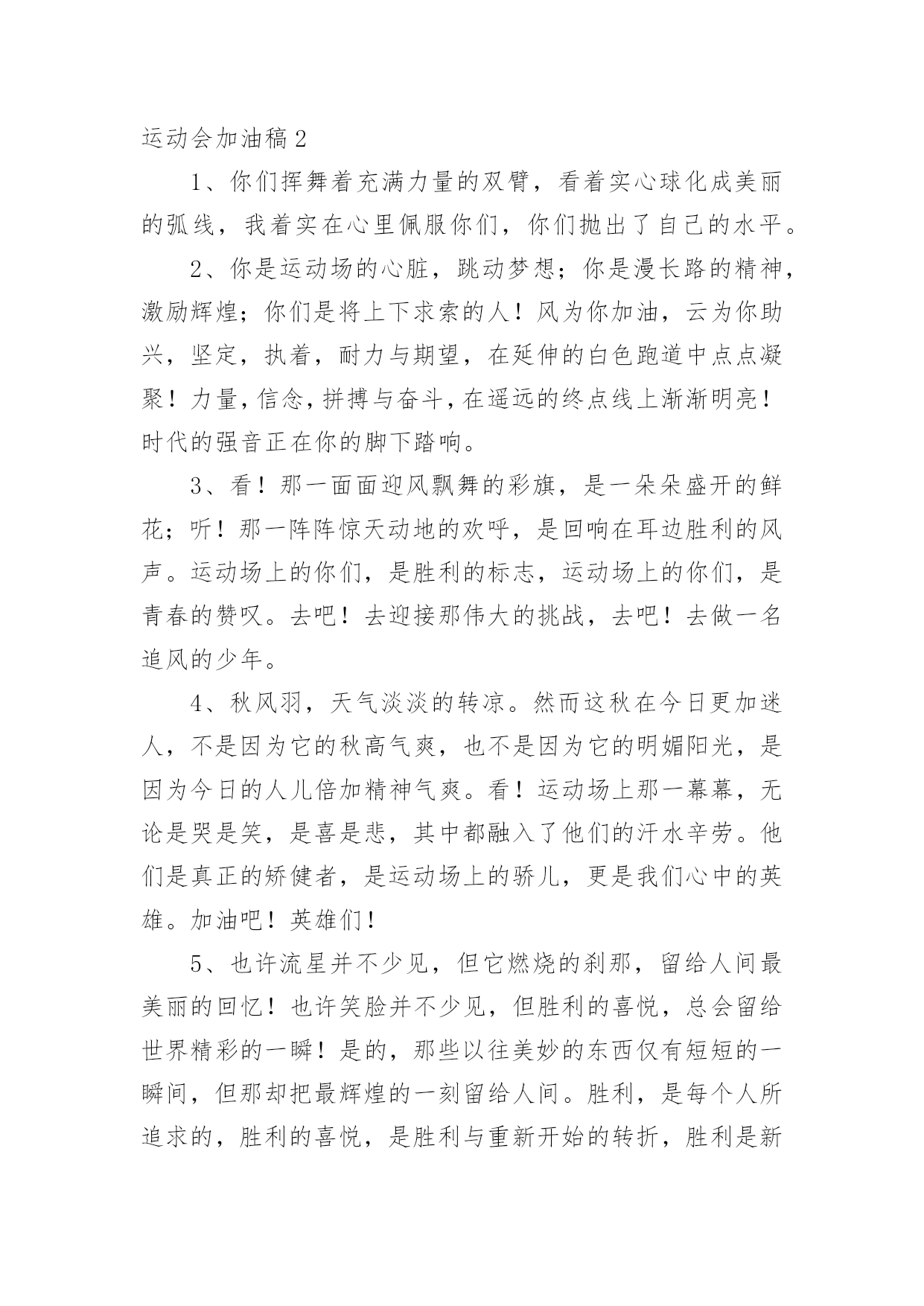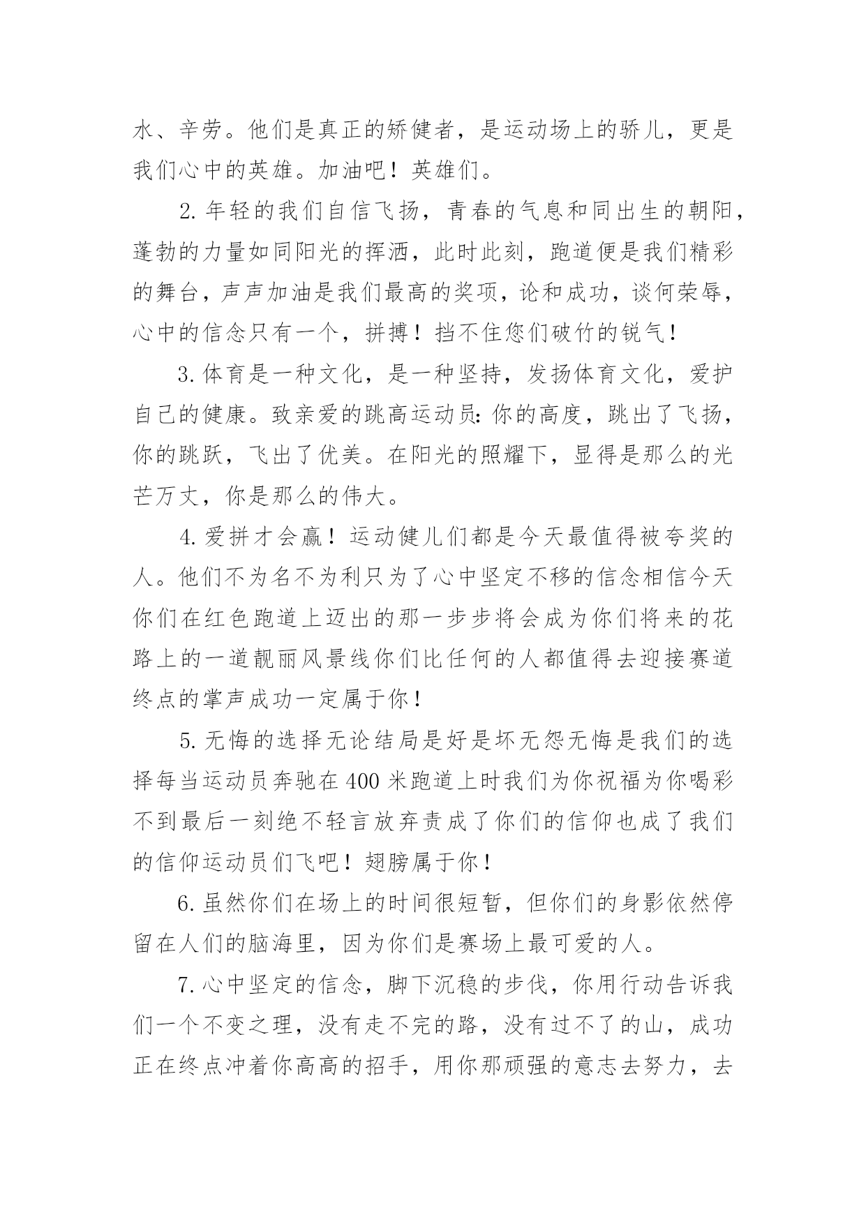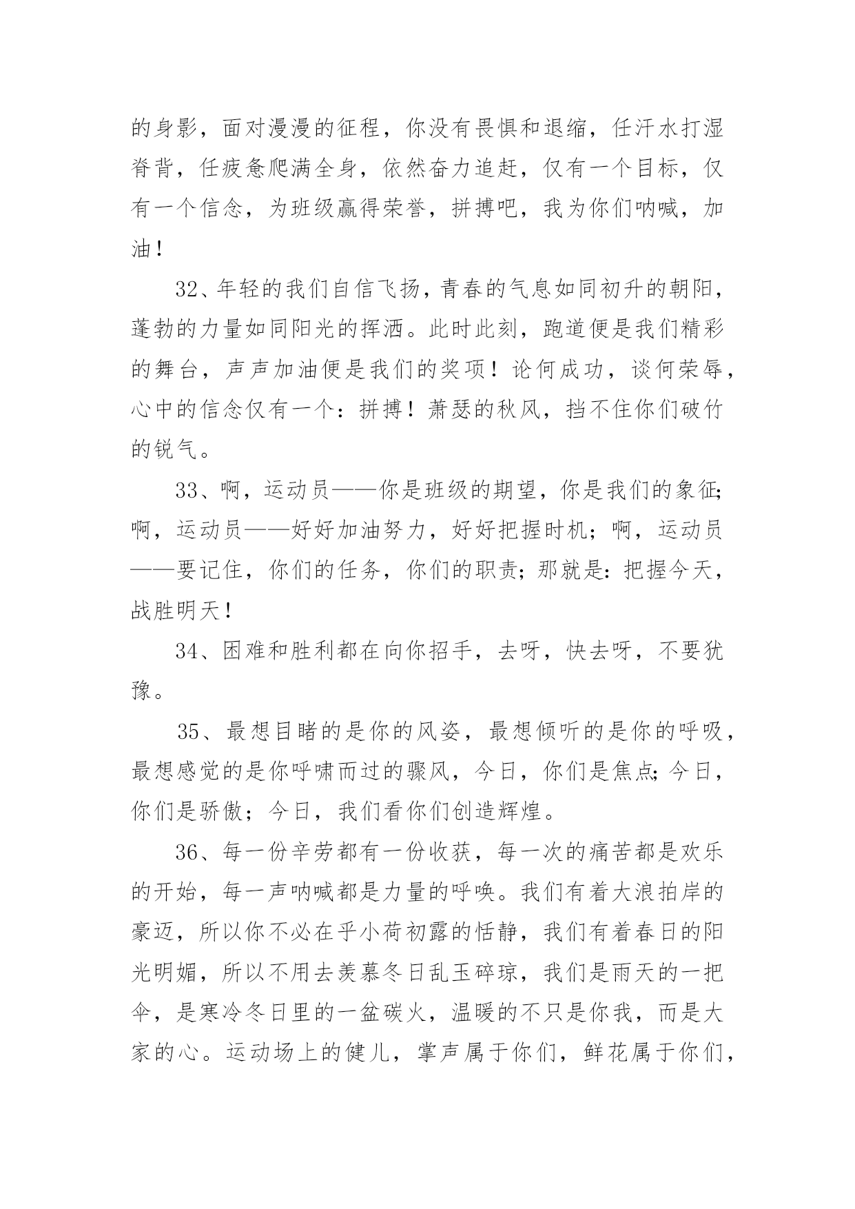 运动会加油稿运动会加油稿汇编[15篇]在不断进步的社会中,我们都可能会用到加油稿,加油稿是用于给别人加油鼓气,提升别人气势的文稿。写起加油稿来就毫无头绪?下面是小编精心整理的运动会加油稿,仅供参考,大家一起来看看吧。运动会加油稿1在起跑线上胡华港连续支付歌曲,攻击和铆钉你健美肌肉蕴含爆发力自信的眼神充满自信枪走火了你开始了一段短暂的旅程在笔直的跑道上有你稳定的.脚印离终点不远冲刺时会给你留下一个锋利的背部开始掌声将为你响起开始胜利和鲜花终将属于你运动会加油稿21、你们挥舞着充满力量的双臂,看着实心球化成美丽的弧线,我着实在心里佩服你们,你们抛出了自己的水平。2、你是运动场的心脏,跳动梦想;你是漫长路的精神,激励辉煌;你们是将上下求索的人!风为你加油,云为你助兴,坚定,执着,耐力与期望,在延伸的白色跑道中点点凝聚!力量,信念,拼搏与奋斗,在遥远的终点线上渐渐明亮!时代的强音正在你的脚下踏响。3、看!那一面面迎风飘舞的彩旗,是一朵朵盛开的鲜花;听!那一阵阵惊天动地的欢呼,是回响在耳边胜利的风声。运动场上的你们,是胜利的标志,运动场上的你们,是青春的赞叹。去吧!去迎接那伟大的挑战,去吧!去做一名追风的少年。4、秋风羽,天气淡淡的转凉。然而这秋在今日更加迷人,不是因为它的秋高气爽,也不是因为它的明媚阳光,是因为今日的人儿倍加精神气爽。看!运动场上那一幕幕,无论是哭是笑,是喜是悲,其中都融入了他们的汗水辛劳。他们是真正的矫健者,是运动场上的骄儿,更是我们心中的英雄。加油吧!英雄们!5、也许流星并不少见,但它燃烧的刹那,留给人间最美丽的回忆!也许笑脸并不少见,但胜利的喜悦,总会留给世界精彩的一瞬!是的,那些以往美妙的东西仅有短短的一瞬间,但那却把最辉煌的一刻留给人间。胜利,是每个人所追求的,胜利的喜悦,是胜利与重新开始的转折,胜利是新的开始!6、你的汗水洒在跑道,浇灌着成功的花朵开放。你的欢笑飞扬在赛场,为班争光数你最棒。跑吧,追吧,在这广阔的赛场上,你似骏马似离弦的箭。跑吧,追吧,你比虎猛,比豹强。7、环形的跑道一圈又一圈的坚持,毅力与精神活跃在会场上,湿透的衣衫,满头的大汗,无限追求奋力追赶,我们为你欢呼跳跃,我们为你骄傲。8、青春是诗,青春是歌,青春是朝气蓬勃。看,踏着青春的旋律走来的是xx班的健儿们,他们热情,他们激扬,他们勇敢,他们顽强。9、泰戈尔在诗中说,天空没有翅膀的影子,但我已飞过;艾青对朋友说,也许有人到达不了彼岸,但我们共同拥有大海。也许你们没有显赫的成绩,但运动场上留下了你们的足迹。也许你们没有奖品,但我们心中留下了你们拼搏的身影。所有的努力都是为了迎接这一刹那,所有的拼搏都是为了这一声令下。10、漫漫长路,你愿一人独撑,忍受着孤独与寂寞,承受着体力与精神的压迫,只任汗水溶于泪水,可脚步却从不停歇。好样的,纵然得不了桂冠,可坚持的你,定会赢得最终的掌声。11、时间在流逝,赛道在延伸,成功在你面前展现。心脏在跳动,热血在沸腾,辉煌在你脚下铸就。加油吧,健儿们!12、面对艰苦的征程,你们毫不畏惧,接力棒在你们手中传递着团体的力量,听,我们在为你呐喊,你们诠释着奥运的精神,你们是我们心中的骄傲,深深的呼吸,等待你的是艰难的xx米。相信胜利会属于你们,但在这征途上,需要你勇敢的心去面对。我们在为你加油,你是否听到了我们发自内心的呐喊,困难和胜利都在向你招手,去呀,不要犹豫,快去击败困难,快去夺取胜利,相信你会送给我们一个汗水浸湿的微笑。13、也许流星并不少见,但它燃烧的刹那,留给人间最美丽的回忆!也许笑脸并不少见,但胜利的喜悦,总会留给世界精彩的一瞬!是的,那些以前美妙的东西只有短短的一瞬间,但却把最辉煌的一刻留给了人间。胜利,是每个人所追求的!14、坚定,执着,耐力与期望,在延伸的白色跑道中点点凝聚!力量,信念,拼搏与奋斗,在遥远的终点线上渐渐明亮!时代的强音正在你的.脚下踏响。15、不为掌声的注释,不为刻意的征服,不为失败的痛苦,仅有辛勤的汗水,化作成功的脚步!16、在竞技场上,你付出汗水,释放光芒;辛勤耕耘,收获成果;为别人喝彩,以努力拼搏激励自我,感动他人。17、时间在流逝,赛道在延伸,成功在你面前展现,心脏在跳动,热血在沸腾,辉煌在你脚下铸就。加油吧,健儿们!18、看!那一面面迎风飘舞的彩旗,是一朵朵盛开的鲜花;听!那一阵阵惊天动地的欢呼,是回响在耳边胜利的风声。运动场上的你们,是胜利的标志,运动场上的你们,是青春的赞叹。去吧!去迎接那伟大的挑战,去吧!去做一名追风的少年。19、汗水,泪水,笑声,歌声,我们尽情挥洒。开幕式上,运动场上,我们尽情展现,多少艰辛,多少困苦,我们勇敢承担。因为年轻,因为张扬,因为我们知道:用今日的汗水换来明天的微笑。20、短暂的一瞬间,显示出你惊人的速度,铿锵有力的一声吼叫,把你全身