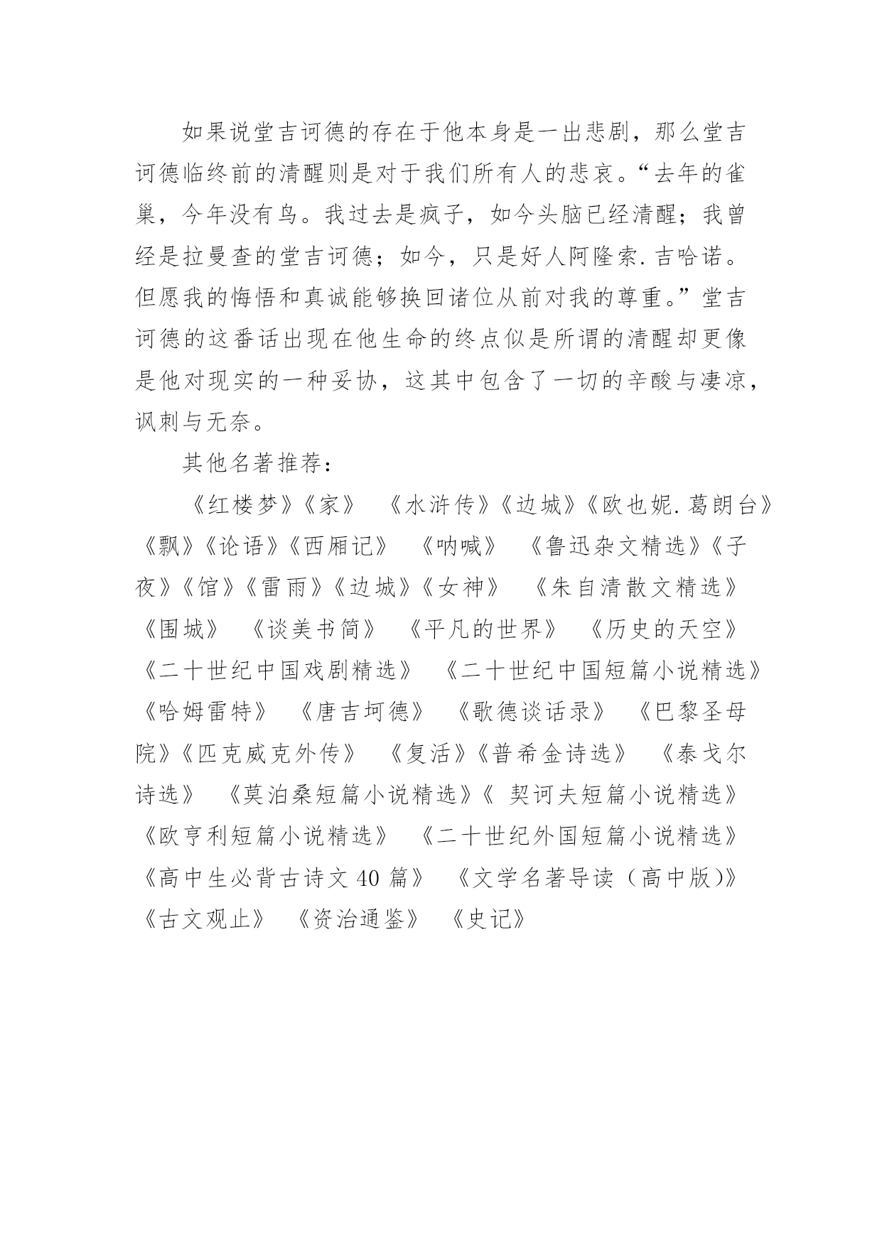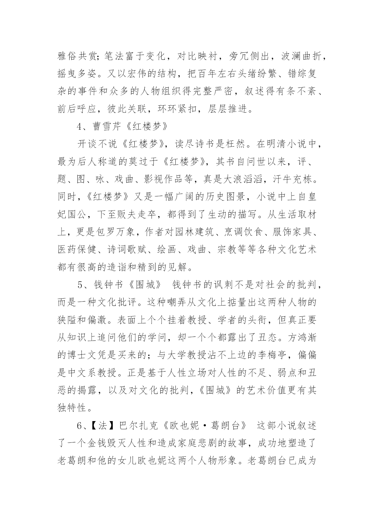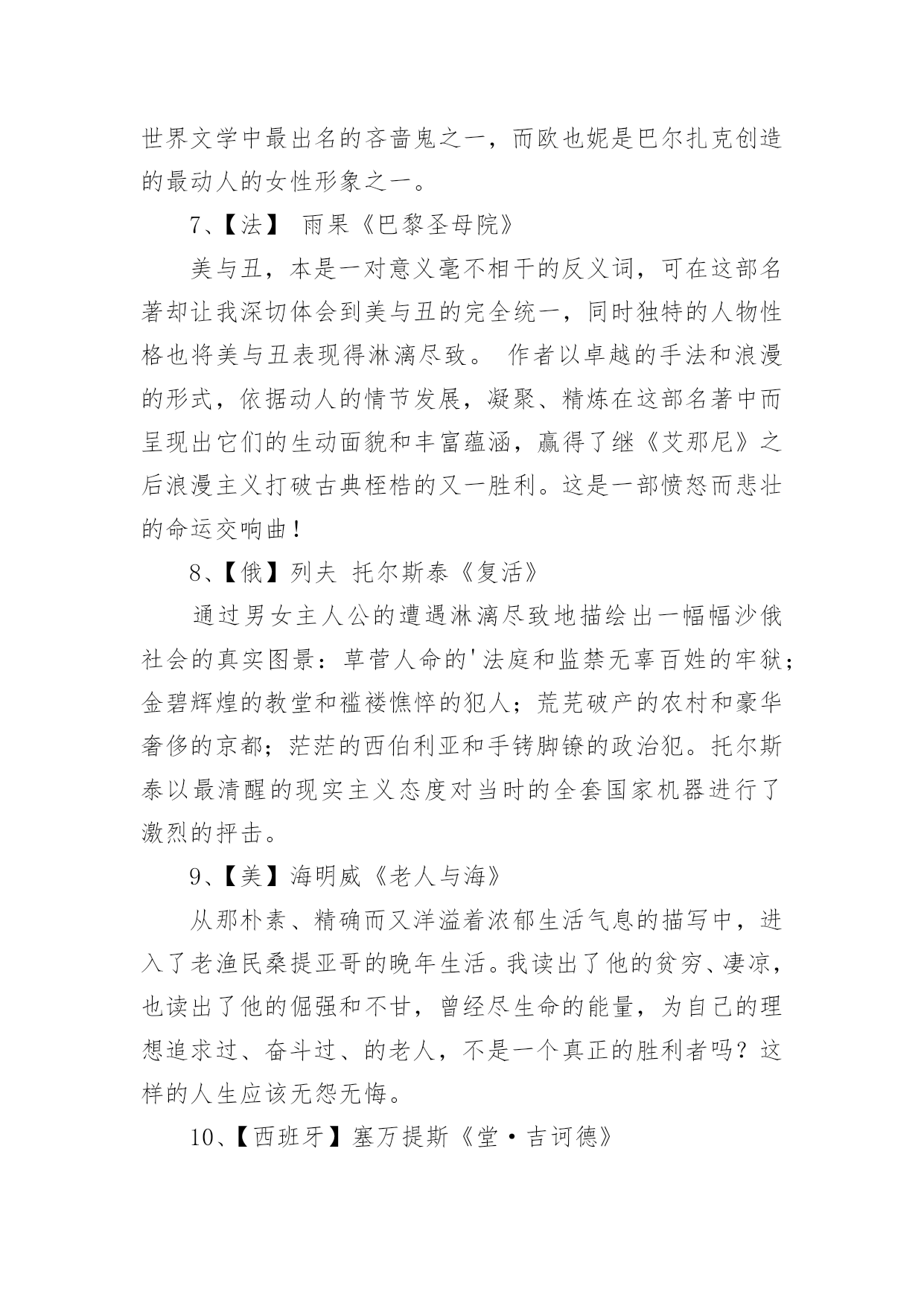 高考必读名著书目高考必读名著书目高考有哪些适合阅读的名著书呢?下面是小编为大家整理的相关内容,希望对你有所帮助!高考必读名著书目1、巴金《家》我始终记住:青春是美丽的东西,而且这一直是鼓舞我的源泉。在巴金一切的作品中都满溢着纯洁的青春气息。《家》尤其浓厚。这种气息反映一颗单纯的心灵,读他的小说,你毫不感到是在绞汁写出来的,是唱出来的,呻吟出来的,是自然的天吁。这不是艺术,而是天赋。如他所说:“永生在青春的原野”。2、茅盾《子夜》《子夜》是一部社会分析小说,小说中十分注意人物活动的社会背景,把一人、一家、一店、一厂的矛盾同社会的阶级矛盾相联系,不仅以巨大的画卷展现了冒险家乐园的大上海的面貌,而且还以广阔的画面把工人罢工、农民、反动当局镇压、地主阶级的行径、资本家之间的兼并等等突出的社会现实展现在读者眼前。其中所蕴含着的文化思想深度就不能不让人感到咋舌不已了。3、罗贯中《三国演义》《三国演义》不仅是较早的一部历史小说,而且代表着古代历史小说的最高成就。小说采用浅近的文言,明快流畅,雅俗共赏;笔法富于变化,对比映衬,旁冗侧出,波澜曲折,摇曳多姿。又以宏伟的结构,把百年左右头绪纷繁、错综复杂的事件和众多的人物组织得完整严密,叙述得有条不紊、前后呼应,彼此关联,环环紧扣,层层推进。4、曹雪芹《红楼梦》开谈不说《红楼梦》,读尽诗书是枉然。在明清小说中,最为后人称道的莫过于《红楼梦》,其书自问世以来,评、题、图、咏、戏曲、影视作品等,真是大浪滔滔,汗牛充栋。同时,《红楼梦》又是一幅广阔的历史图景,小说中上自皇妃国公,下至贩夫走卒,都得到了生动的描写。从生活取材上,更是包罗万象,作者对园林建筑、烹调饮食、服饰家具、医药保健、诗词歌赋、绘画、戏曲、宗教等等各种文化艺术都有很高的造诣和精到的见解。5、钱钟书《围城》钱钟书的讽刺不是对社会的批判,而是一种文化批评。这种嘲弄从文化上掂量出这两种人物的狭隘和偏激。表面上个个挂着教授、学者的头衔,但真正要从知识上追问他们的学问,却一个个都露出了丑态。方鸿渐的博士文凭是买来的;与大学教授沾不上边的李梅亭,偏偏是中文系教授。正是基于人性立场对人性的不足、弱点和丑恶的揭露,以及对文化的批判,《围城》的艺术价值更有其独特性。6、【法】巴尔扎克《欧也妮·葛朗台》这部小说叙述了一个金钱毁灭人性和造成家庭悲剧的故事,成功地塑造了老葛朗和他的女儿欧也妮这两个人物形象。老葛朗台已成为世界文学中最出名的吝啬鬼之一,而欧也妮是巴尔扎克创造的最动人的女性形象之一。7、【法】雨果《巴黎圣母院》美与丑,本是一对意义毫不相干的反义词,可在这部名著却让我深切体会到美与丑的完全统一,同时独特的人物性格也将美与丑表现得淋漓尽致。作者以卓越的手法和浪漫的形式,依据动人的情节发展,凝聚、精炼在这部名著中而呈现出它们的生动面貌和丰富蕴涵,赢得了继《艾那尼》之后浪漫主义打破古典桎梏的又一胜利。这是一部愤怒而悲壮的命运交响曲!8、【俄】列夫托尔斯泰《复活》通过男女主人公的遭遇淋漓尽致地描绘出一幅幅沙俄社会的真实图景:草菅人命的'法庭和监禁无辜百姓的牢狱;金碧辉煌的教堂和褴褛憔悴的犯人;荒芫破产的农村和豪华奢侈的京都;茫茫的西伯利亚和手铐脚镣的政治犯。托尔斯泰以最清醒的现实主义态度对当时的全套国家机器进行了激烈的抨击。9、【美】海明威《老人与海》从那朴素、精确而又洋溢着浓郁生活气息的描写中,进入了老渔民桑提亚哥的晚年生活。我读出了他的贫穷、凄凉,也读出了他的倔强和不甘,曾经尽生命的能量,为自己的理想追求过、奋斗过、的老人,不是一个真正的胜利者吗?这样的人生应该无怨无悔。10、【西班牙】塞万提斯《堂·吉诃德》如果说堂吉诃德的存在于他本身是一出悲剧,那么堂吉诃德临终前的清醒则是对于我们所有人的悲哀。“去年的雀巢,今年没有鸟。我过去是疯子,如今头脑已经清醒;我曾经是拉曼查的堂吉诃德;如今,只是好人阿隆索.吉哈诺。但愿我的悔悟和真诚能够换回诸位从前对我的尊重。”堂吉诃德的这番话出现在他生命的终点似是所谓的清醒却更像是他对现实的一种妥协,这其中包含了一切的辛酸与凄凉,讽刺与无奈。其他名著推荐:《红楼梦》《家》《水浒传》《边城》《欧也妮.葛朗台》《飘》《论语》《西厢记》《呐喊》《鲁迅杂文精选》《子夜》《馆》《雷雨》《边城》《女神》《朱自清散文精选》《围城》《谈美书简》《平凡的世界》《历史的天空》《二十世纪中国戏剧精选》《二十世纪中国短篇小说精选》《哈姆雷特》《唐吉坷德》《歌德谈话录》《巴黎圣母院》《匹克威克外传》《复活》《普希金诗选》《泰戈尔诗选》《莫泊桑短篇小说精选》《契诃夫短篇小说精选》《欧亨利短篇小说精选》《二十世纪外国短篇小说精选》《高中生必背古诗文40篇》《文学名著导读(高中版)》《古文观止》《资治通鉴》《史记》
